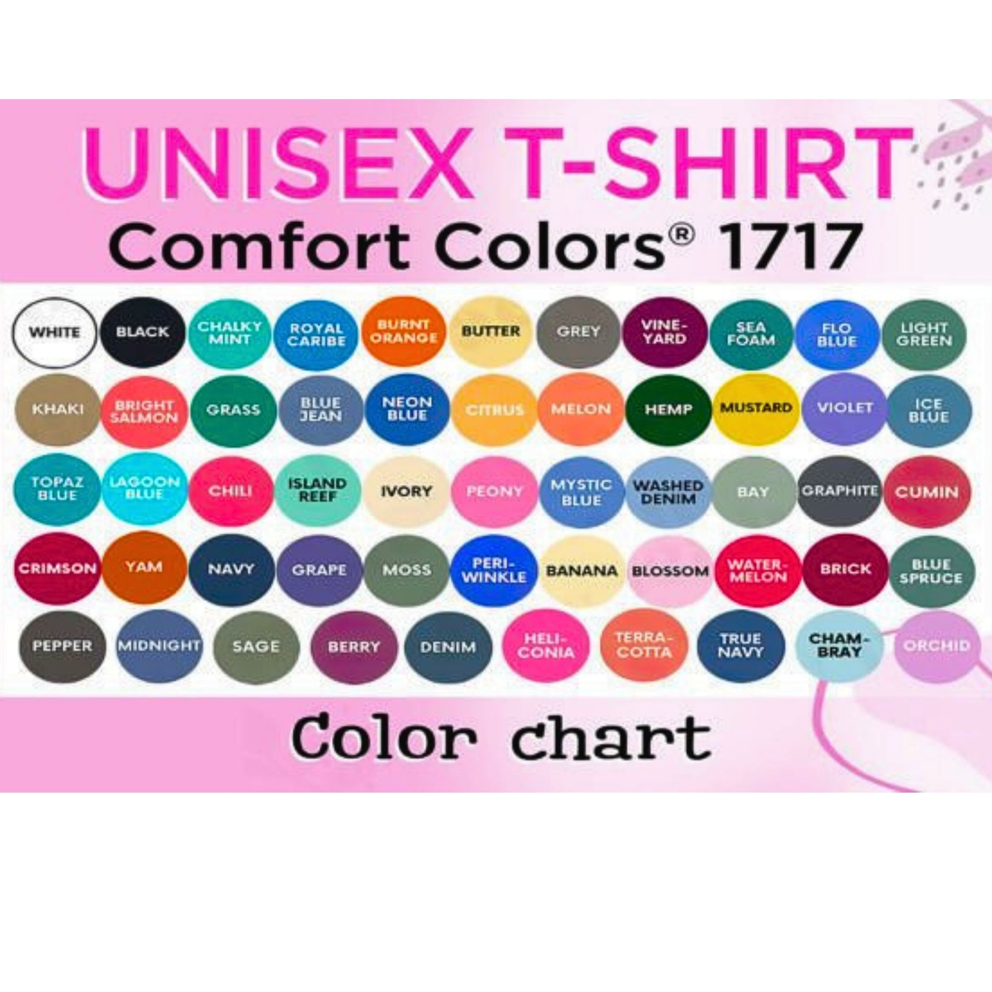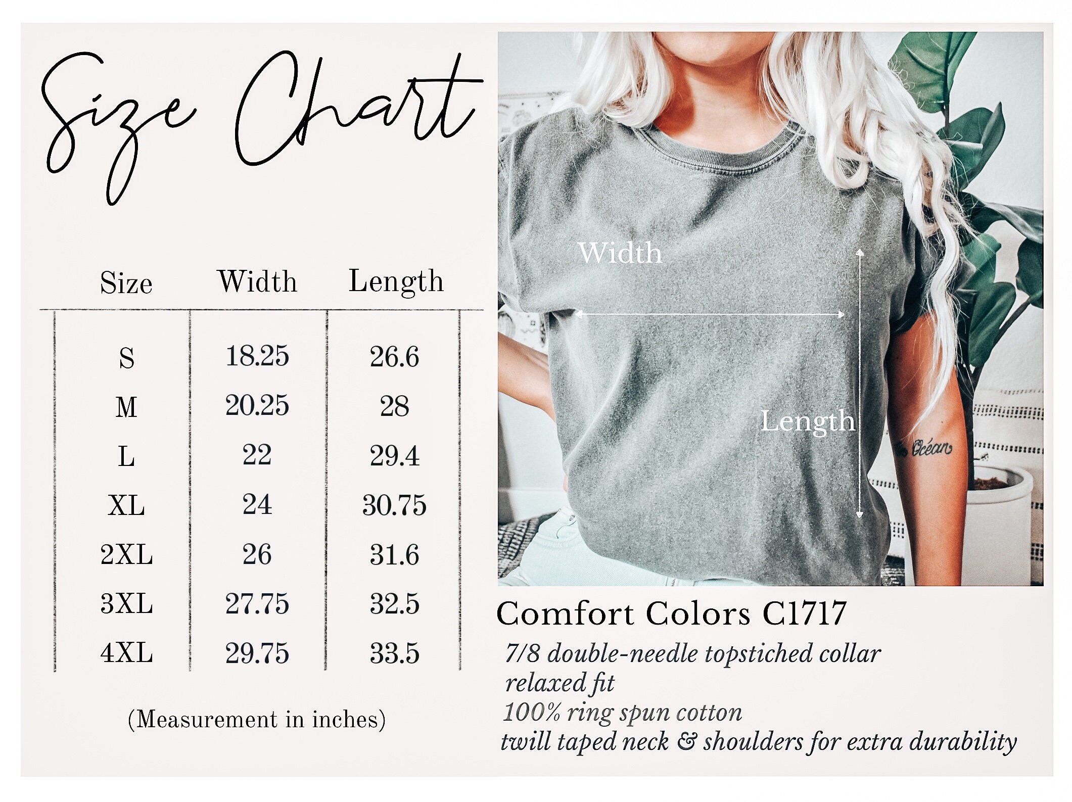 1. Take a look at the sizing chart for this shirt style (comfort colors 1717)!
