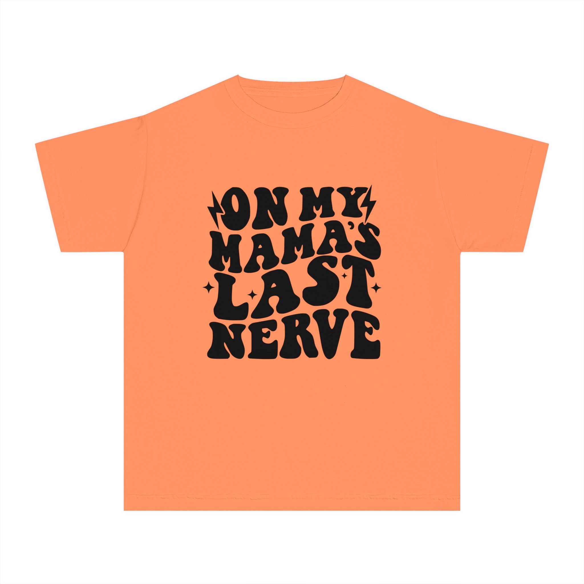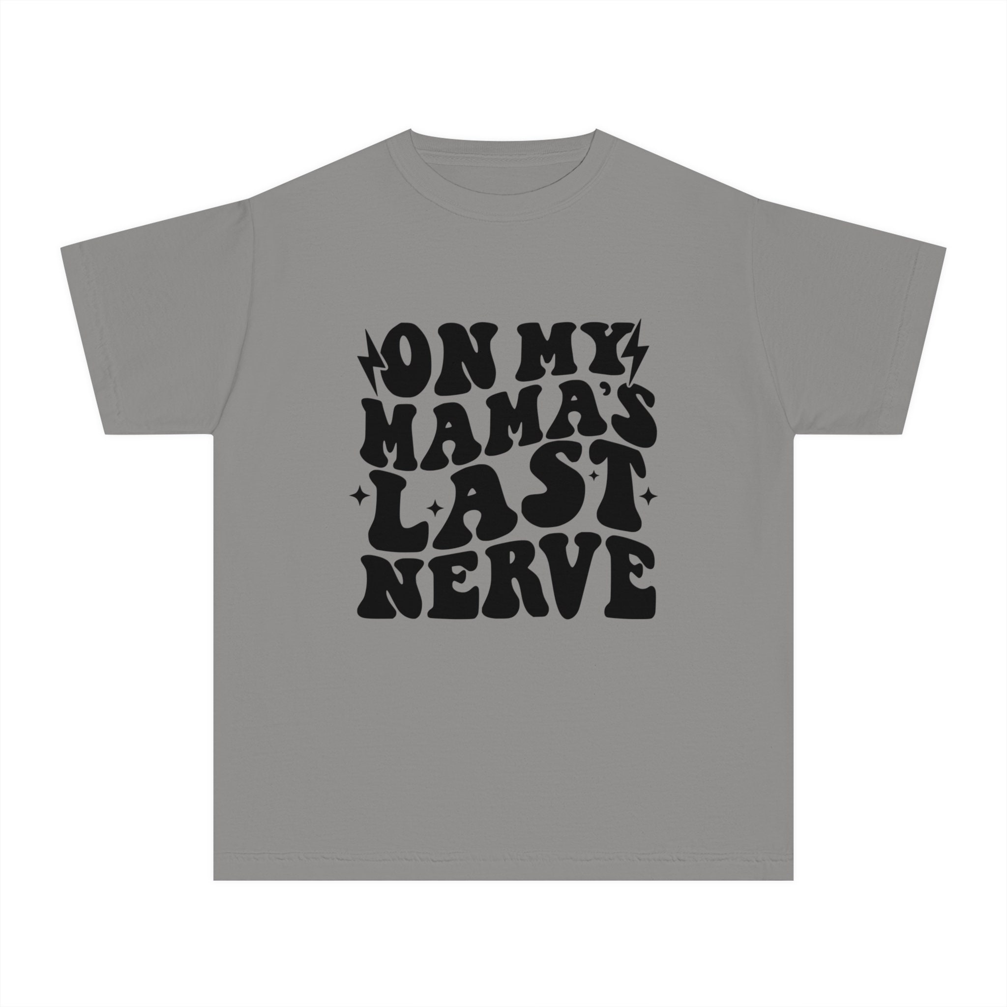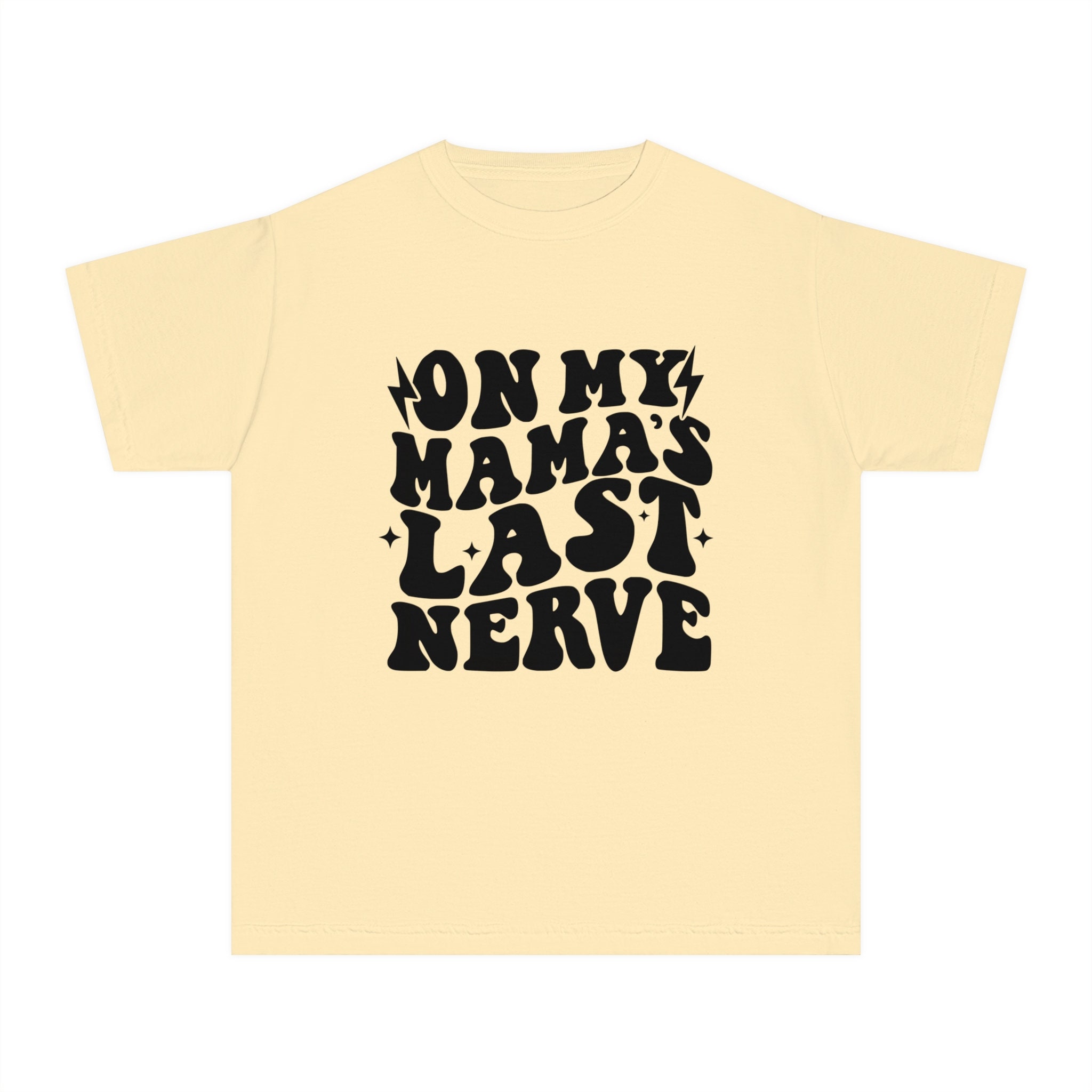 Retro On My Mamas Last Nerve Youth Tee, Retro Youth Shirt, Retro On Mamas Last Nerve Comfort Colors tee, This design is on the Front the shirt. Funny Shirt for Cute Family Pictures, Back to school shirts, Vacay shirt, Spring Break Kids Shirt, Cute Gift for Mother's Day. (retro wavy text on the front of the shirt)