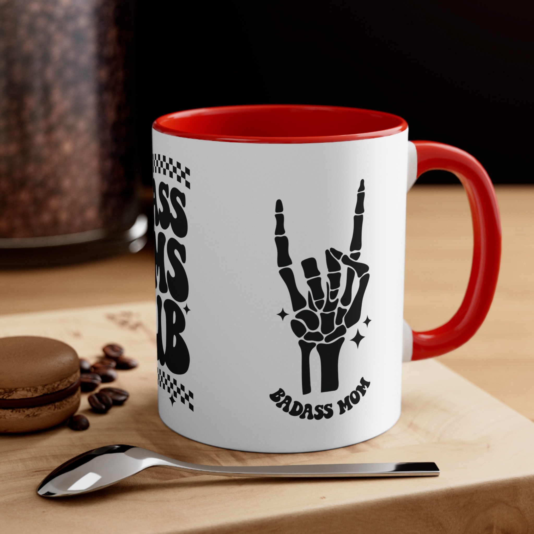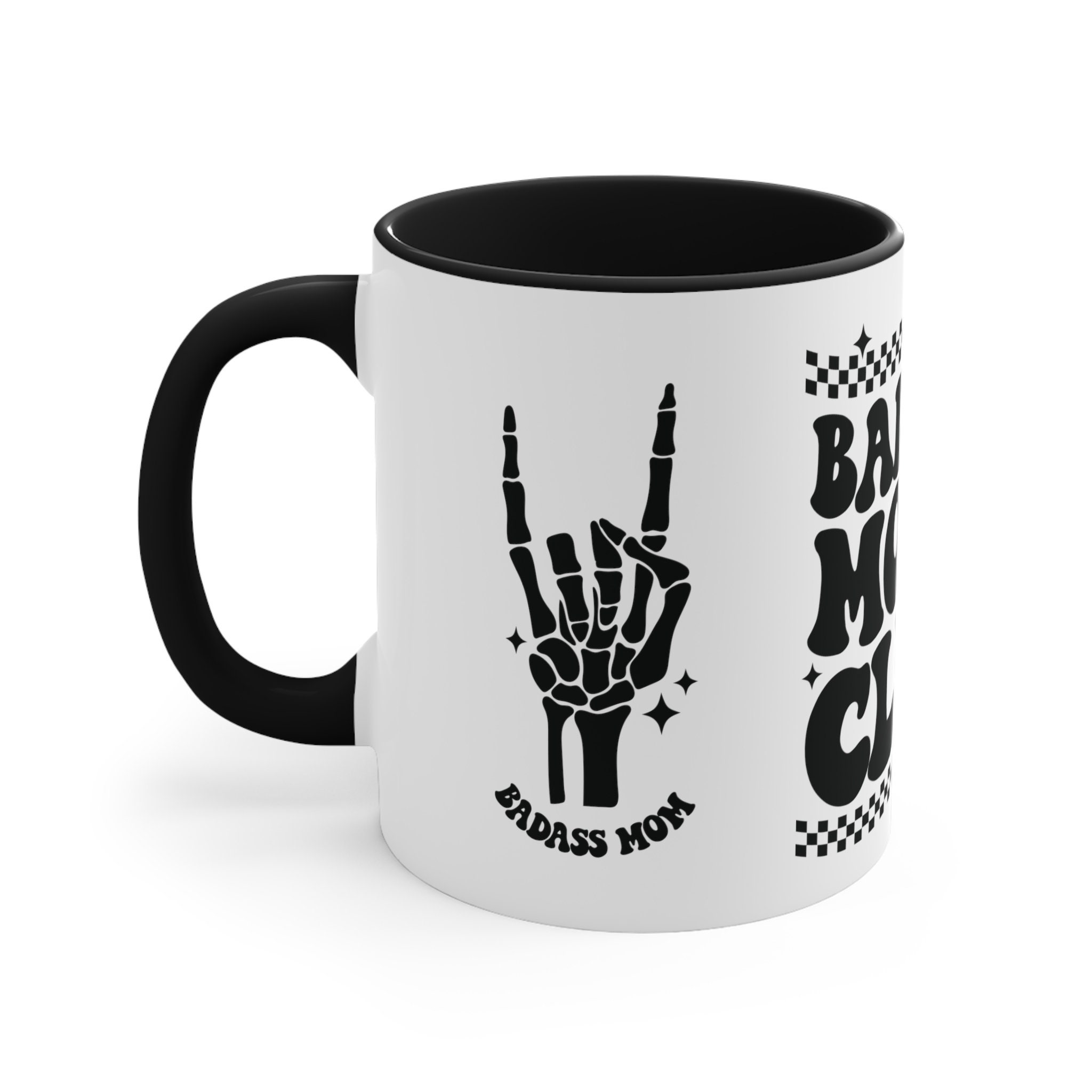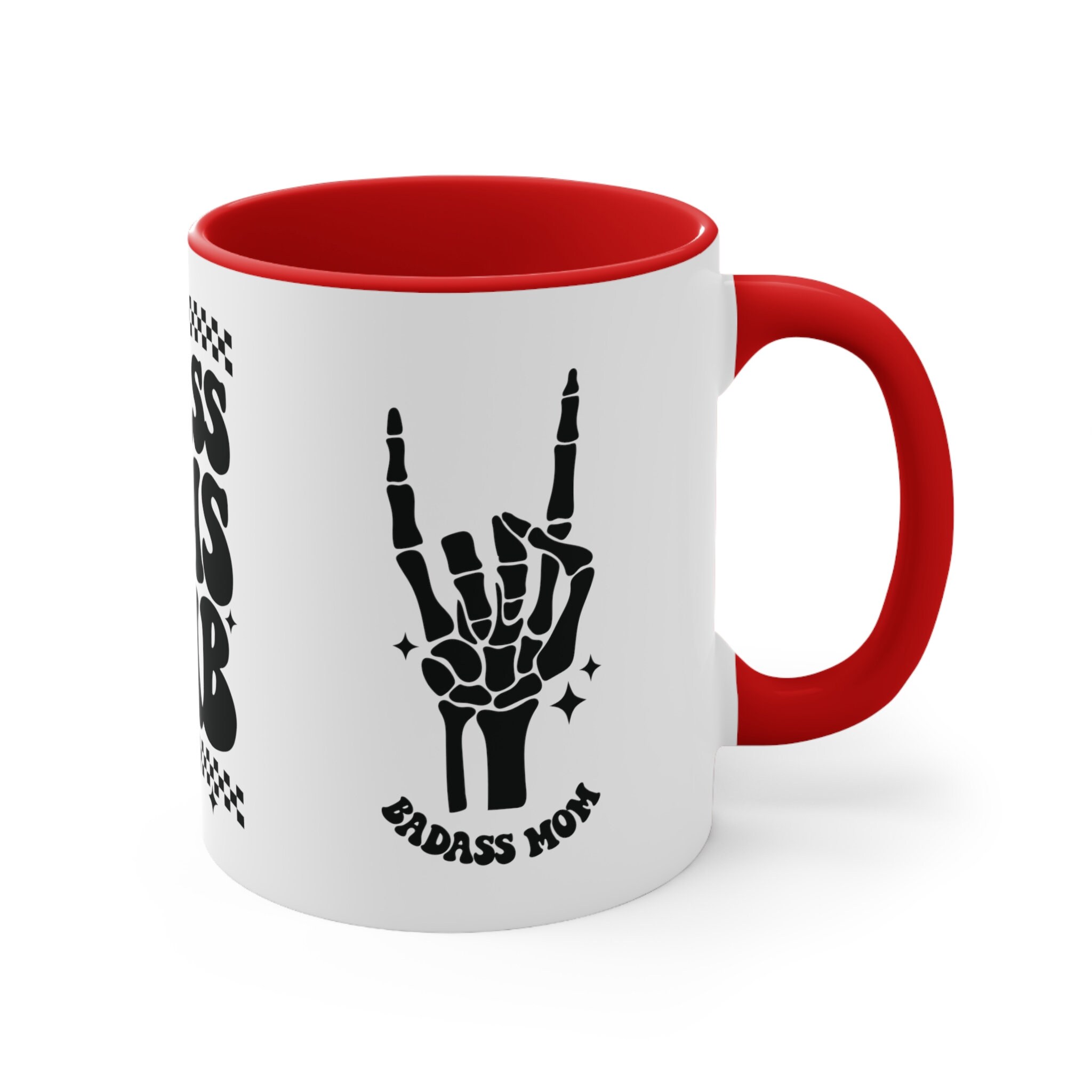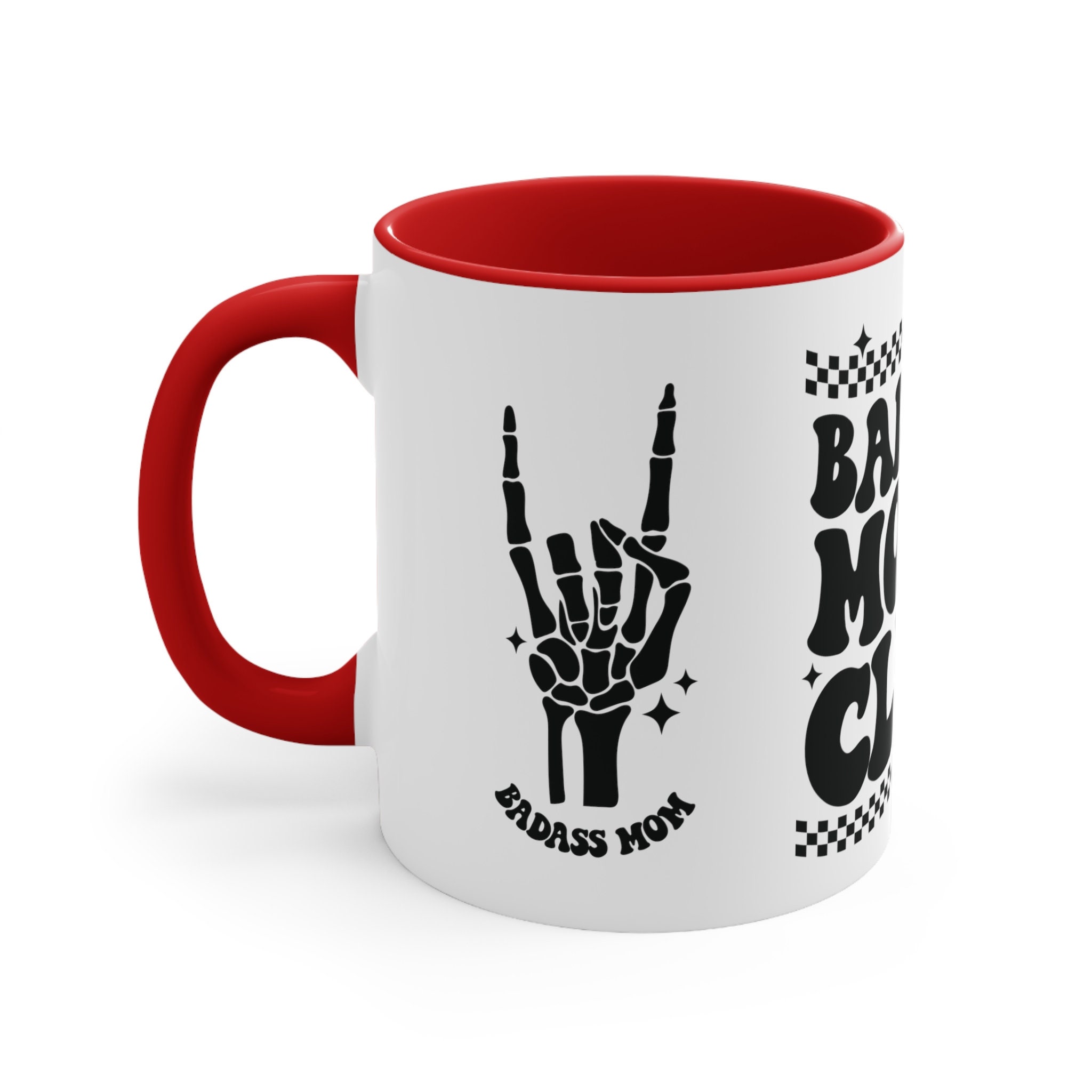 Badass Moms club Skelton Hand Accent Coffee Mug, Coffee Mug, Add some color to your routine with this two-tone, custom accent coffee mug. This 11oz mug features an accented C-Handle that is comfortable to use, as well as an accented interior to add more contrast and character. With your design on this mug, you get an instant winner of a product.