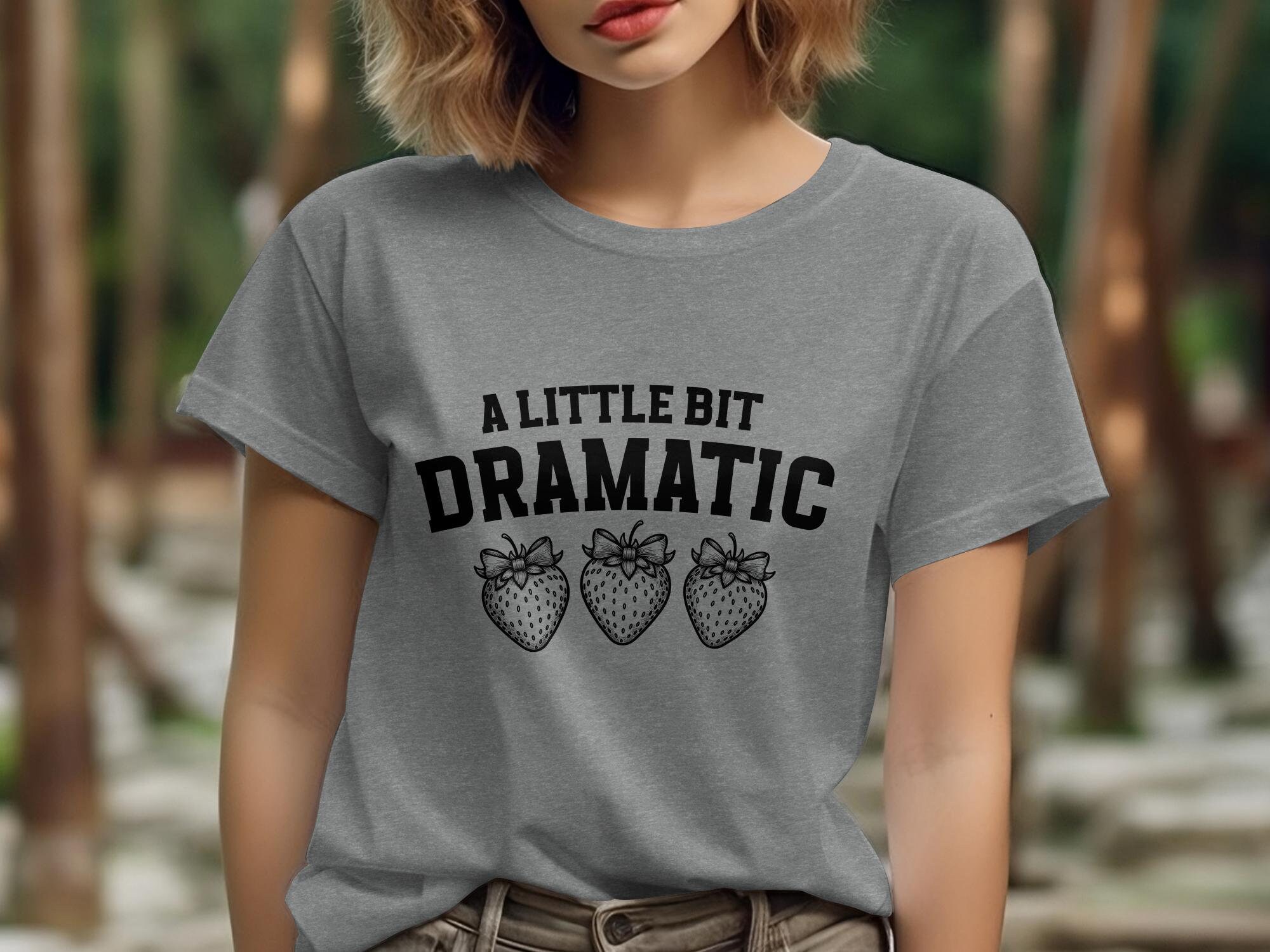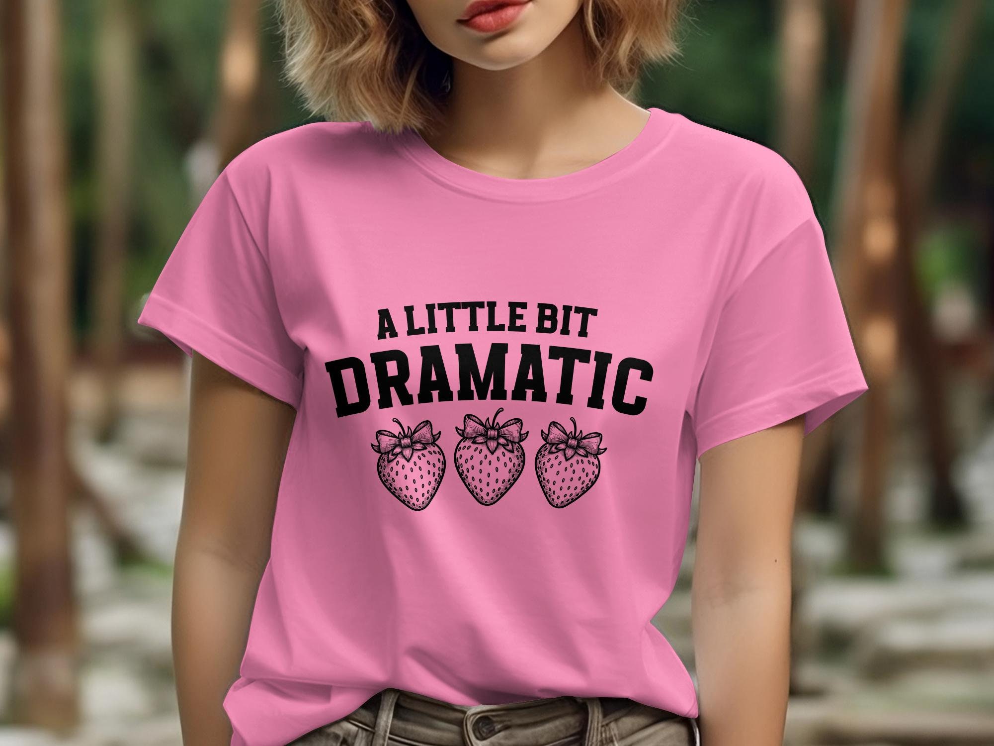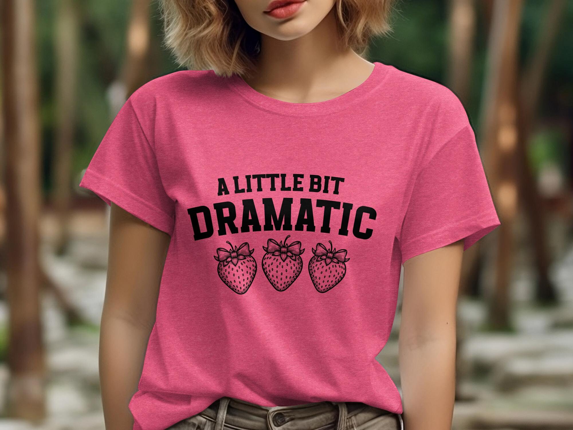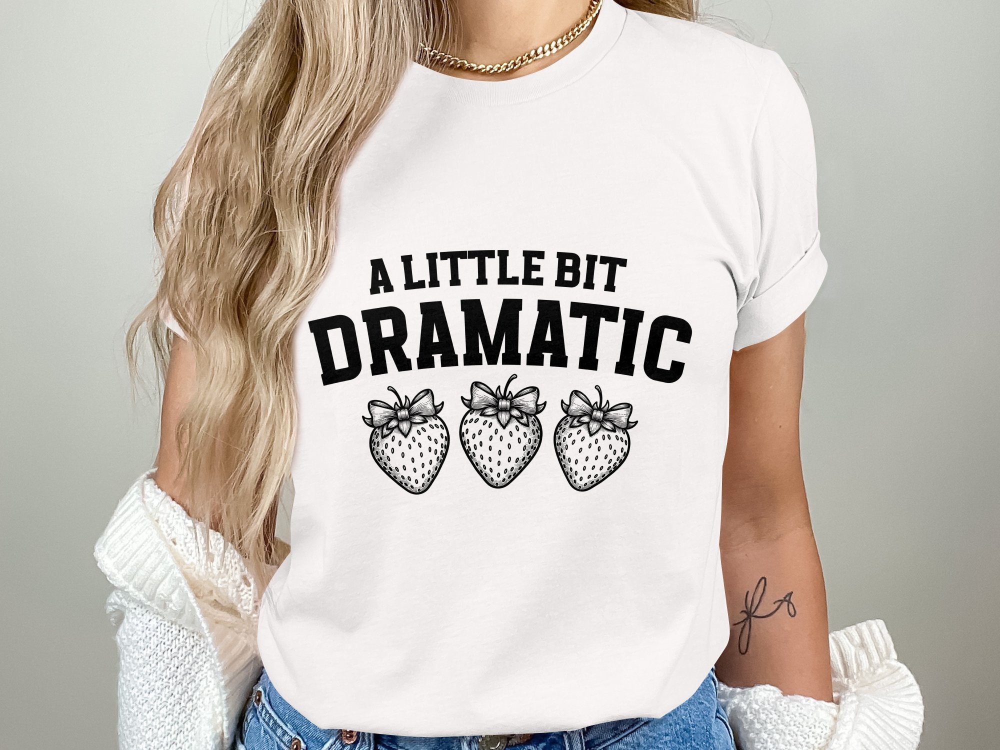 Add a touch of drama to your wardrobe with this charming t-shirt featuring the quote "A Little Bit Dramatic" accented by three beautifully illustrated strawberries with bows. Perfect for casual summer outings, this cotton tee combines comfort with a playful, chic design. Easy to pair with jeans or shorts, it makes a great gift for friends who love a bit of flair in their style.