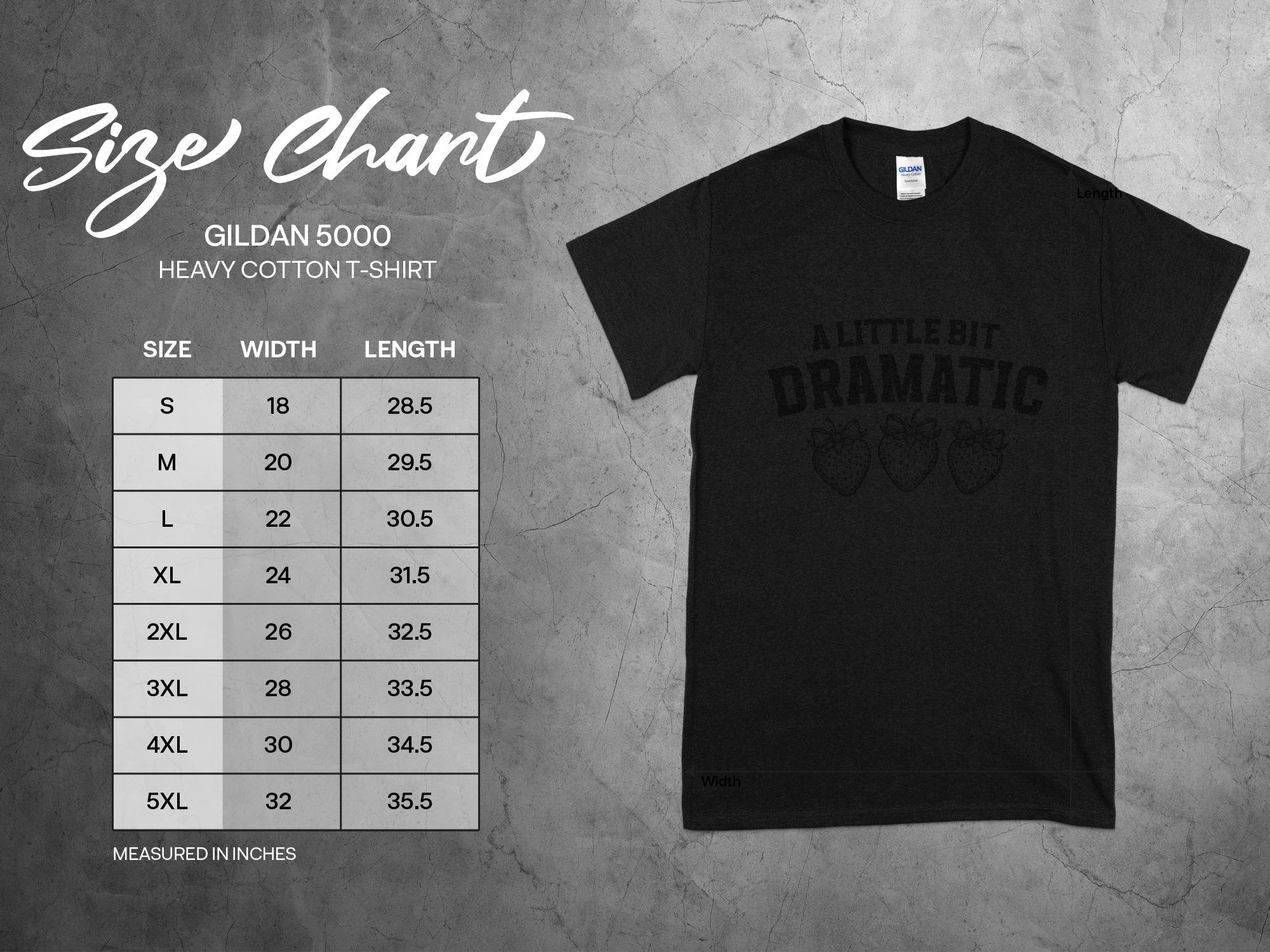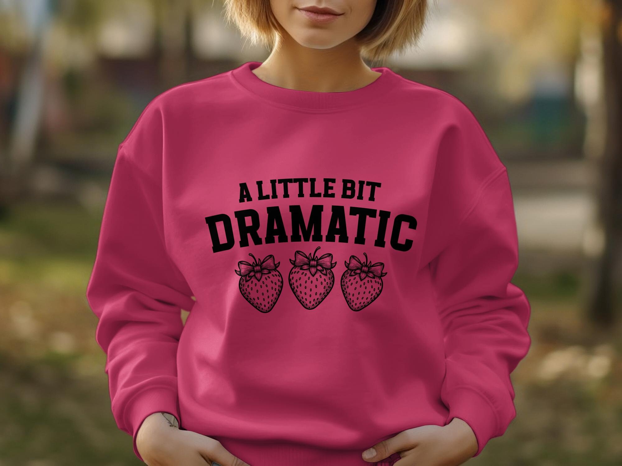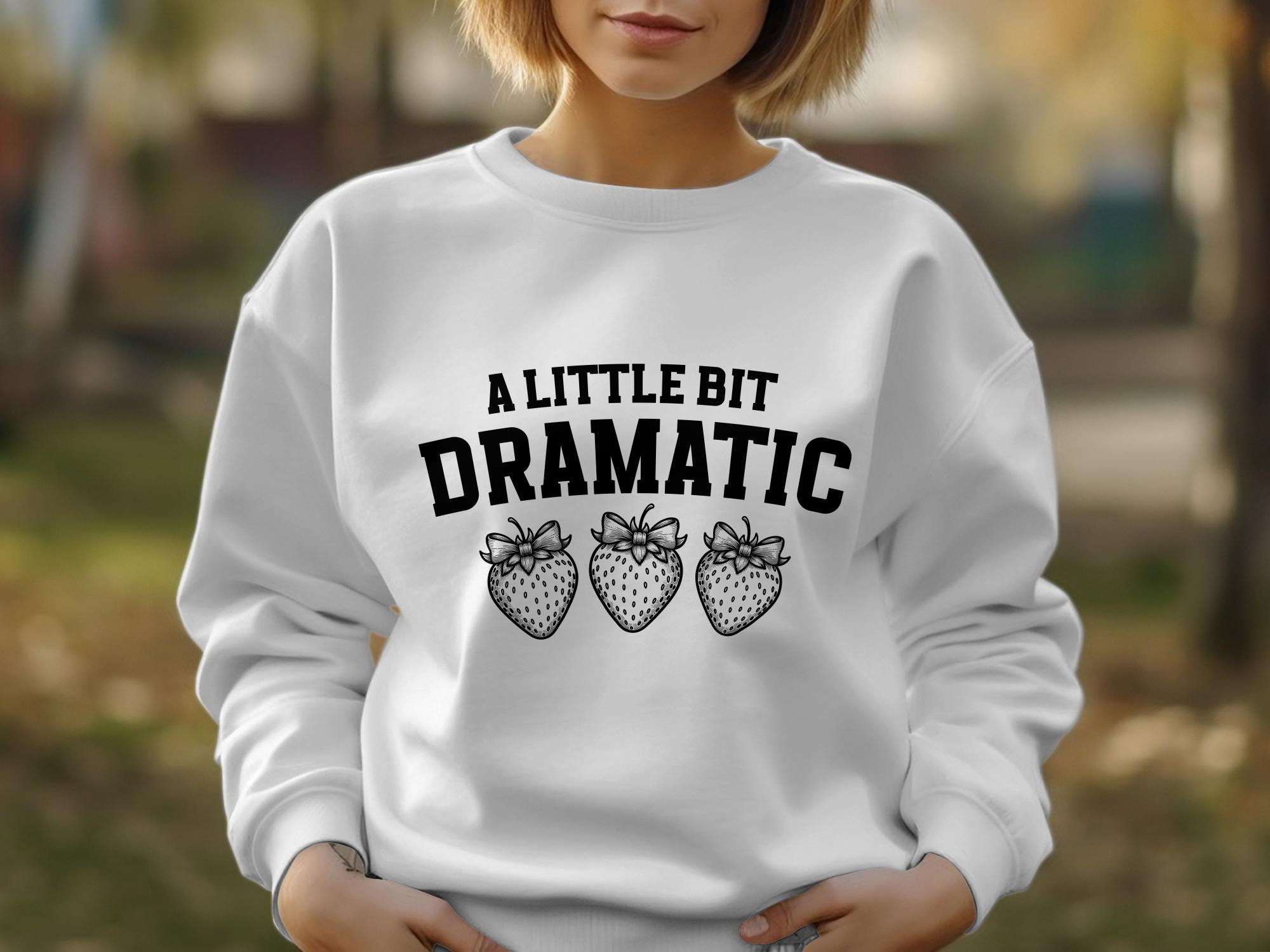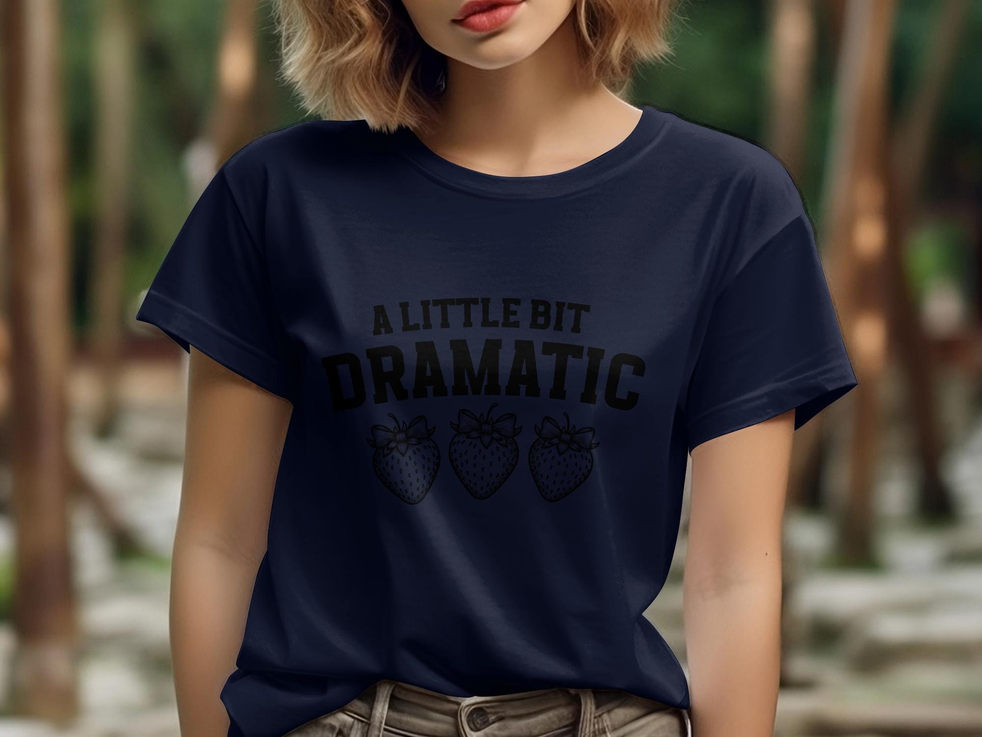 Add a touch of drama to your wardrobe with this charming t-shirt featuring the quote "A Little Bit Dramatic" accented by three beautifully illustrated strawberries with bows. Perfect for casual summer outings, this cotton tee combines comfort with a playful, chic design. Easy to pair with jeans or shorts, it makes a great gift for friends who love a bit of flair in their style.