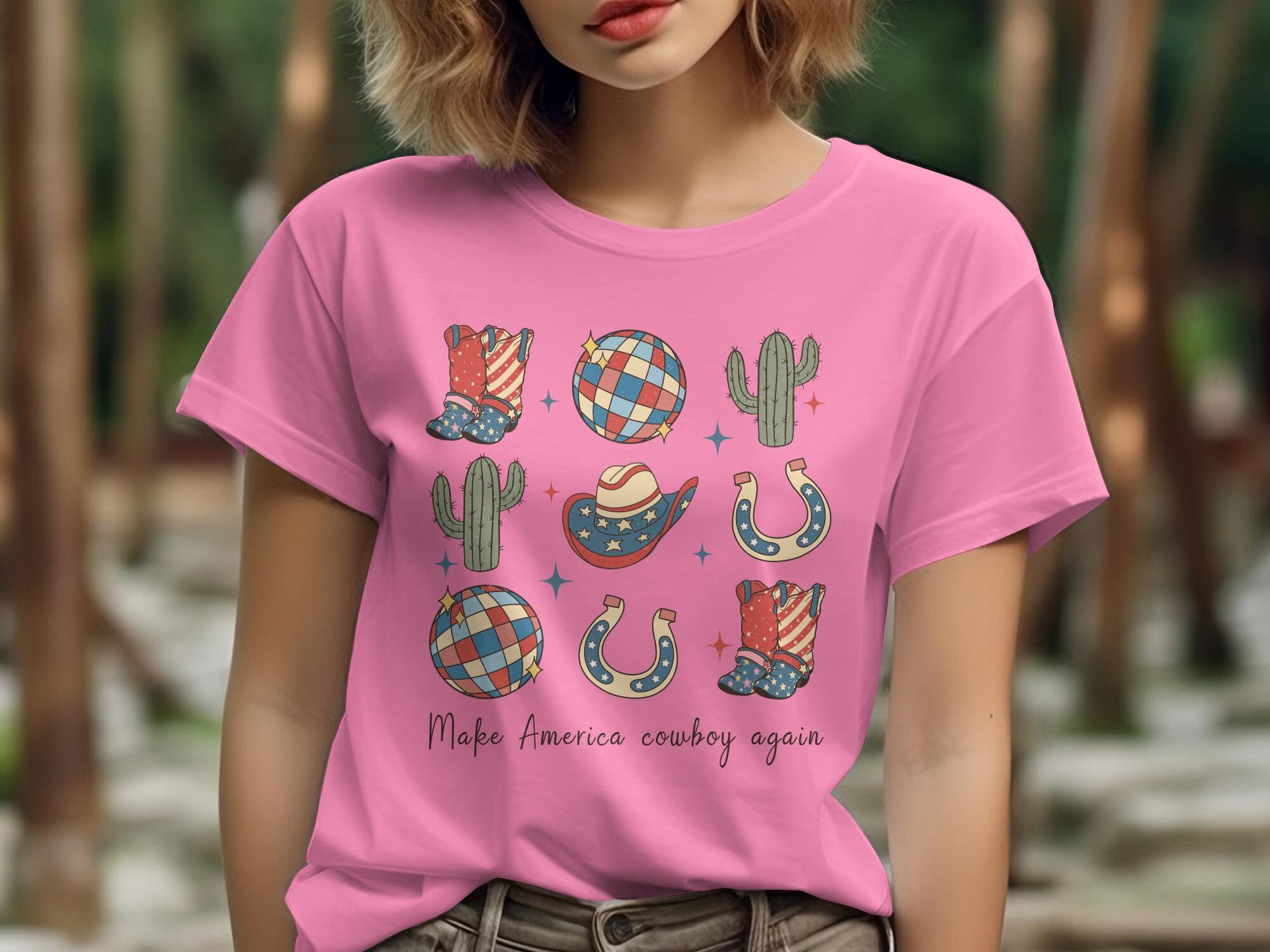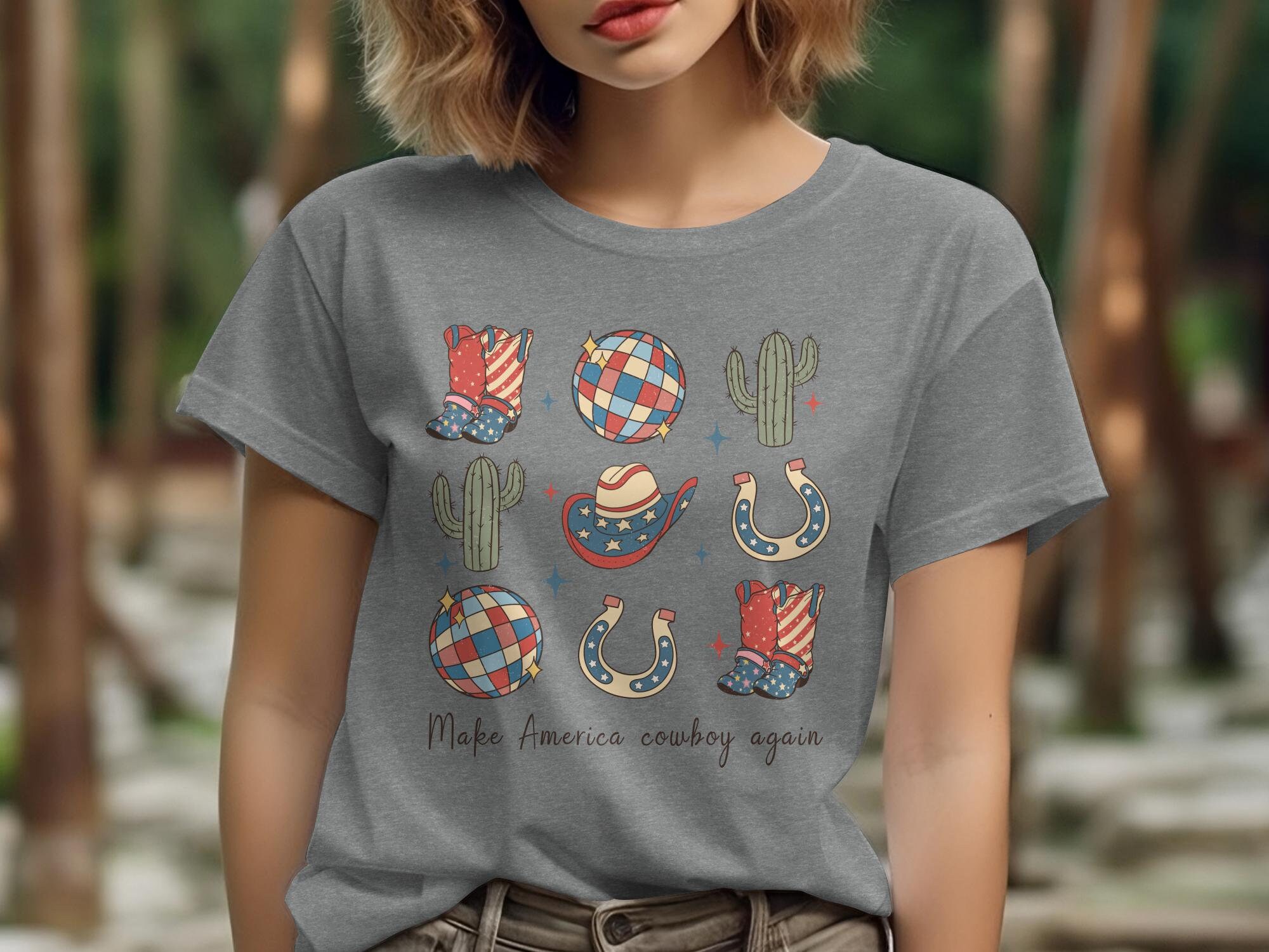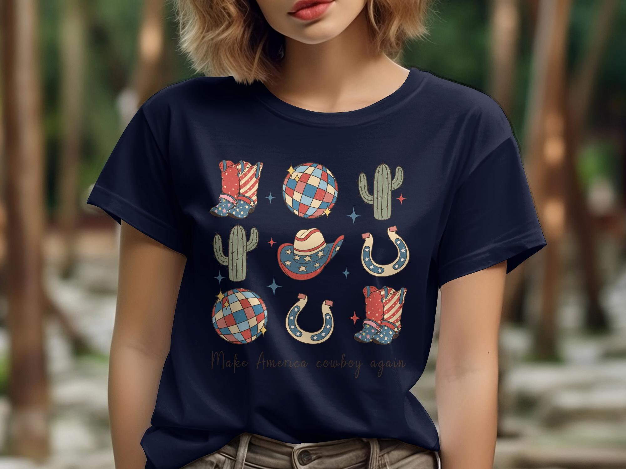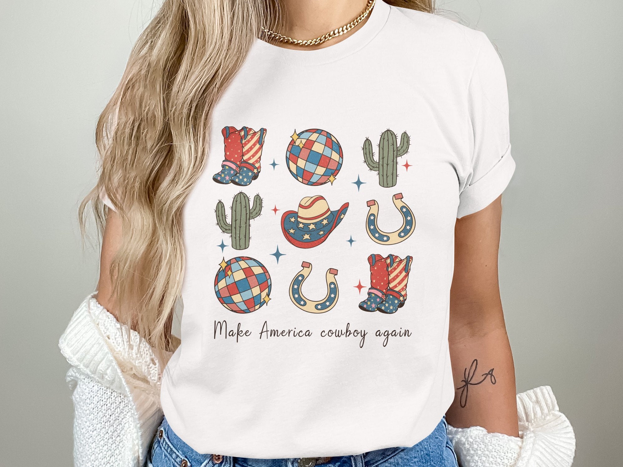 Embrace the spirit of the Wild West with this uniquely designed t-shirt featuring a patriotic "Make America Cowboy Again" theme. The shirt showcases charming illustrations of cowboy boots, hats, cacti, horseshoes, and stars, all adorned in classic American colors of red, blue, and white. This vintage-inspired design captures the essence of cowboy culture meshed with American patriotism, making it a perfect fit for rodeos, country music concerts, or everyday wear. Crafted for comfort and style, it makes a thoughtful gift for anyone who loves the cowboy lifestyle.