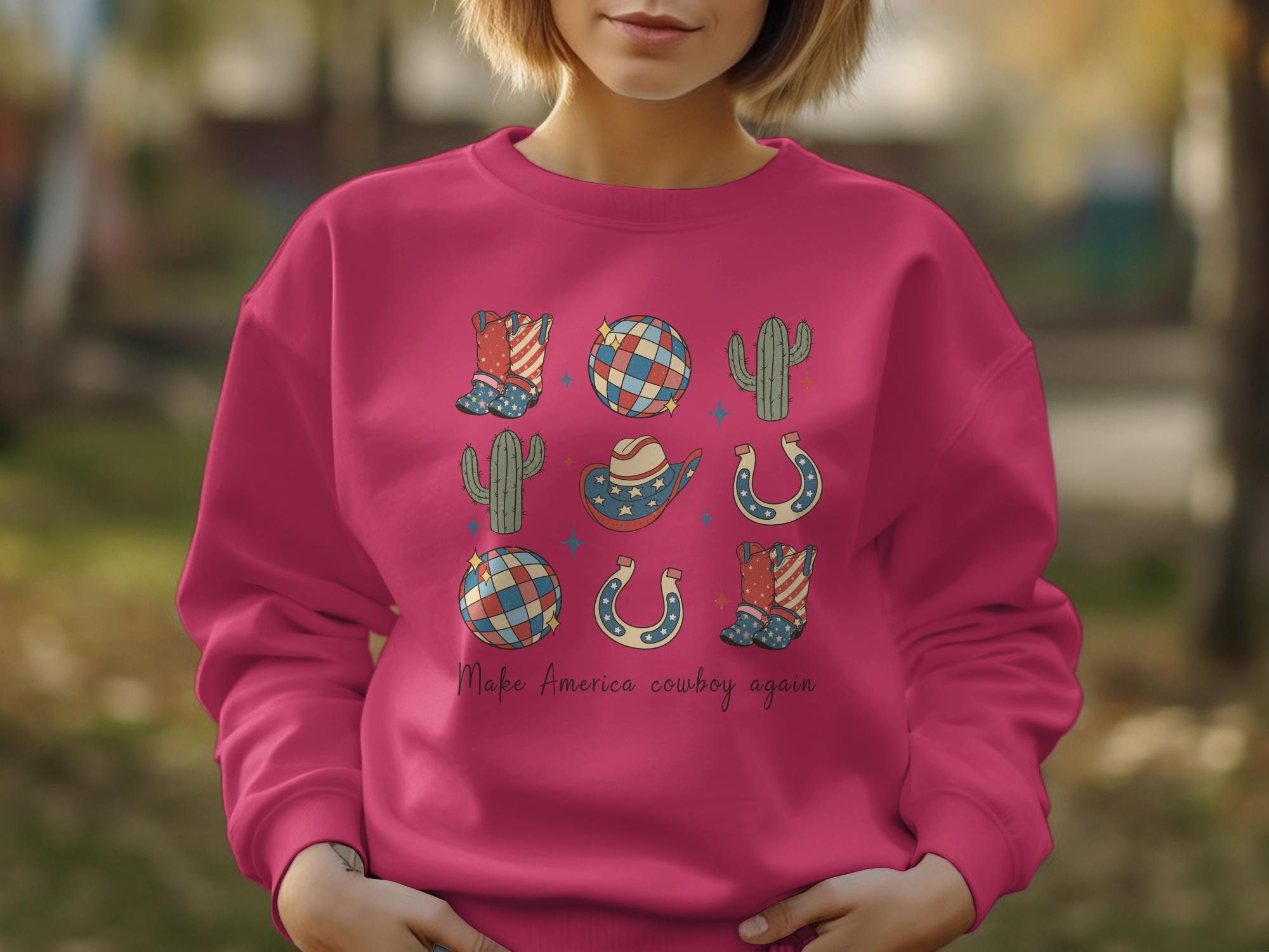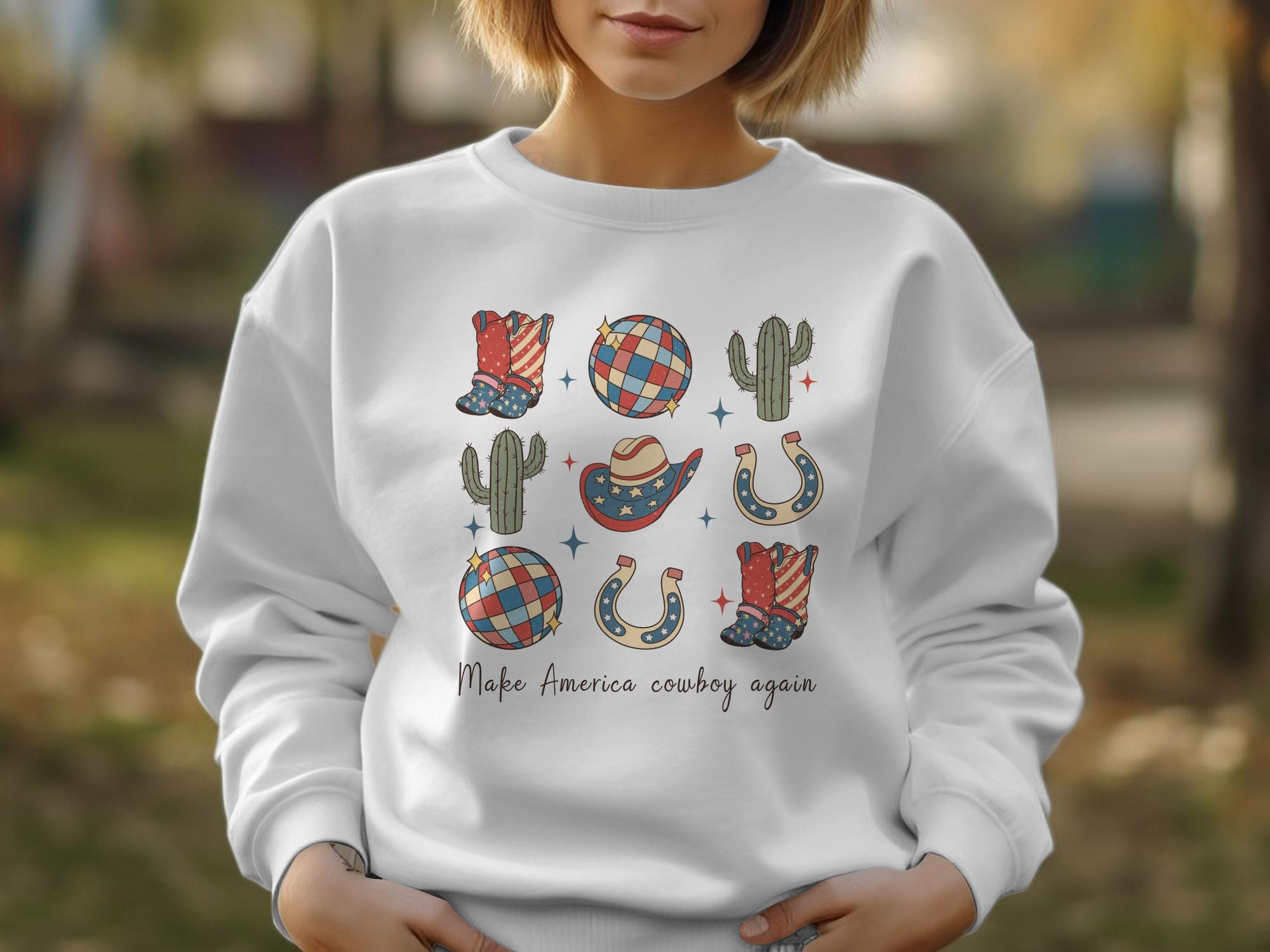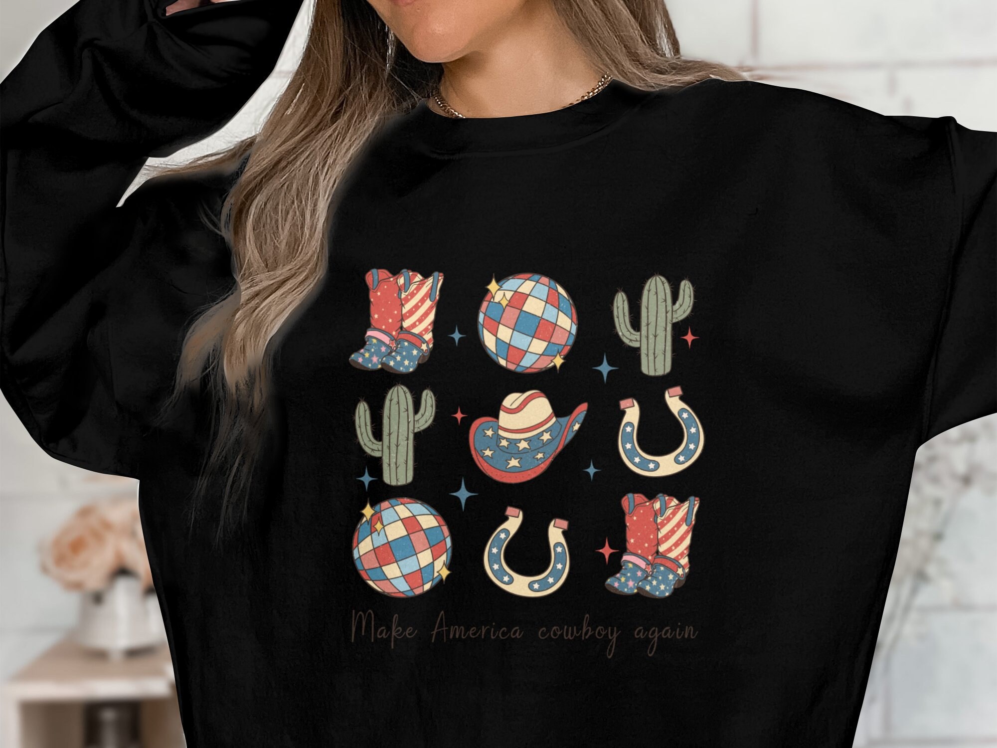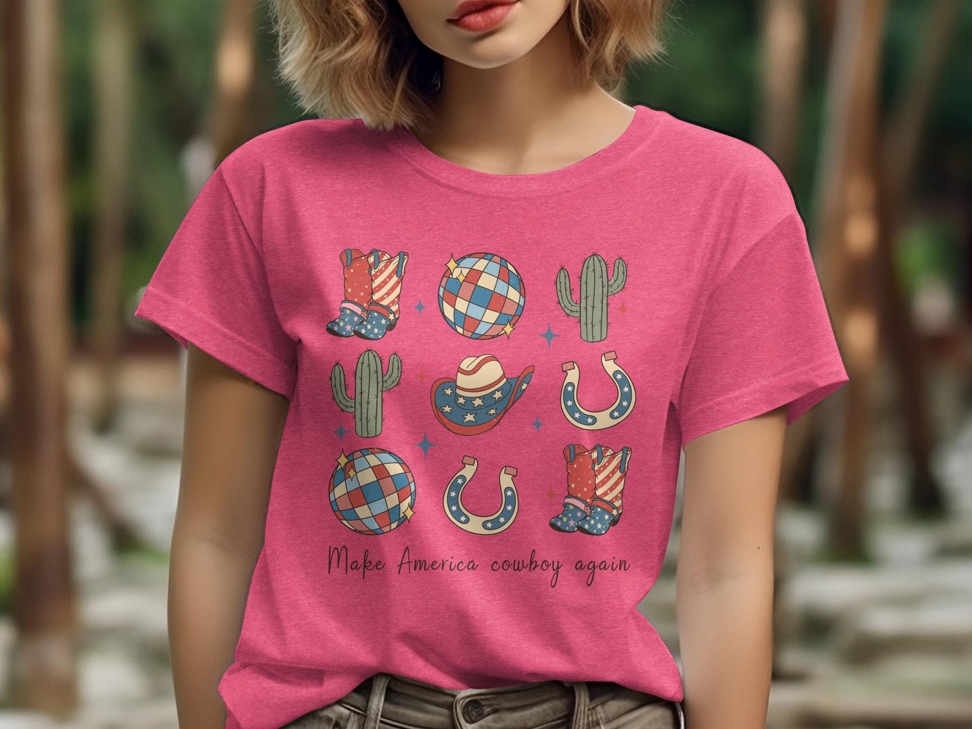 Embrace the spirit of the Wild West with this uniquely designed t-shirt featuring a patriotic "Make America Cowboy Again" theme. The shirt showcases charming illustrations of cowboy boots, hats, cacti, horseshoes, and stars, all adorned in classic American colors of red, blue, and white. This vintage-inspired design captures the essence of cowboy culture meshed with American patriotism, making it a perfect fit for rodeos, country music concerts, or everyday wear. Crafted for comfort and style, it makes a thoughtful gift for anyone who loves the cowboy lifestyle.