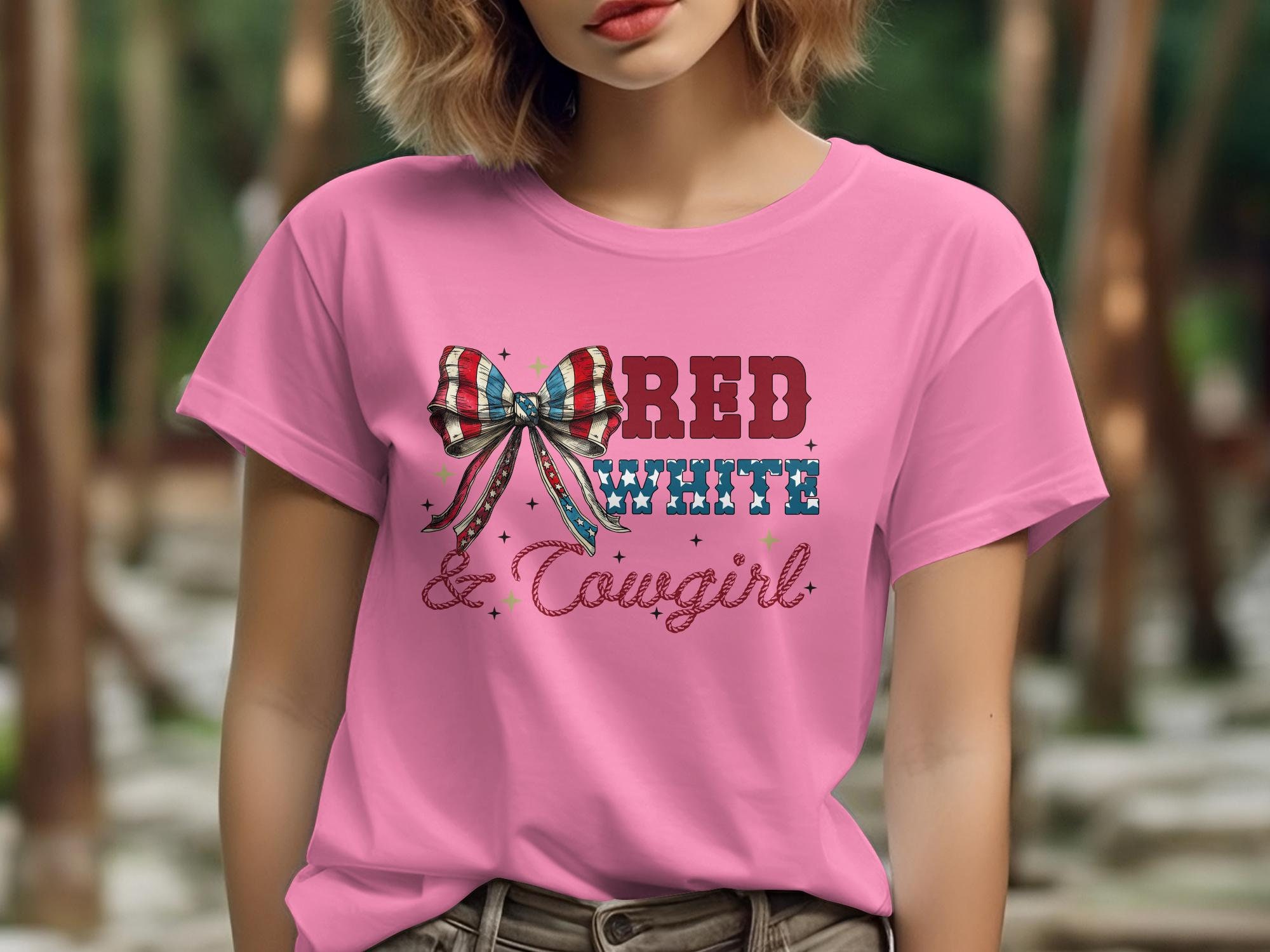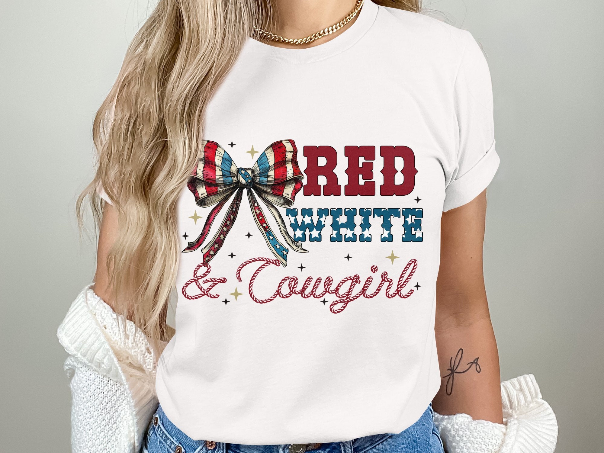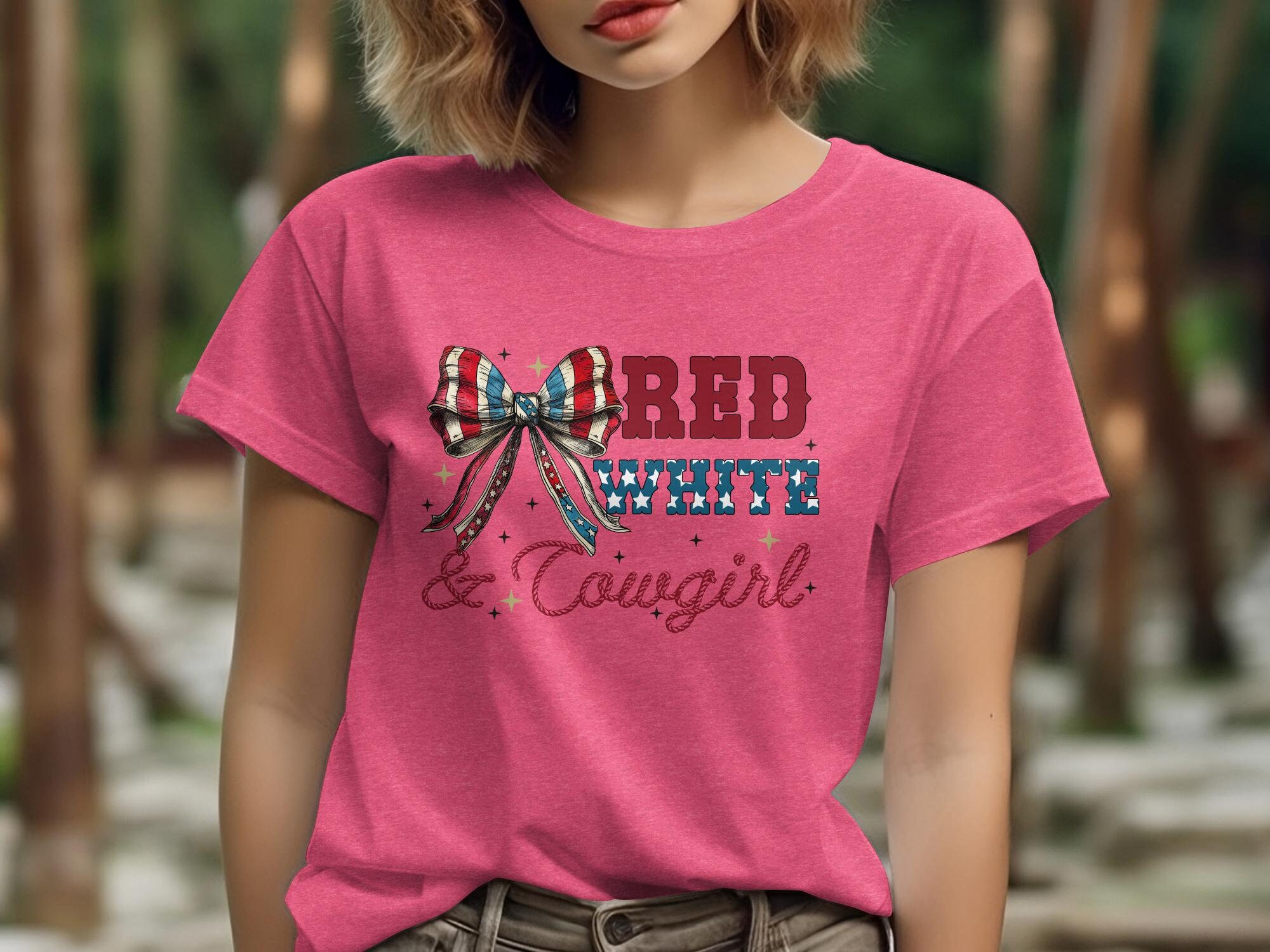 Red White and Cowgirl T-Shirt, Patriotic Bow Graphic, Women's Fashion Tee, Stylish Summer Top eye-catching "Red White and Cowgirl" T-shirt features a bold, colorful bow graphic with patriotic flair. Perfect for summer events or as a casual stylish top, this tee is a great way to show your cowgirl spirit and love for the country. Made from soft, breathable fabric, it offers both comfort and durability. Ideal for Fourth of July celebrations, rodeos, or everyday wear, this shirt is sure to make a statement wherever you go!