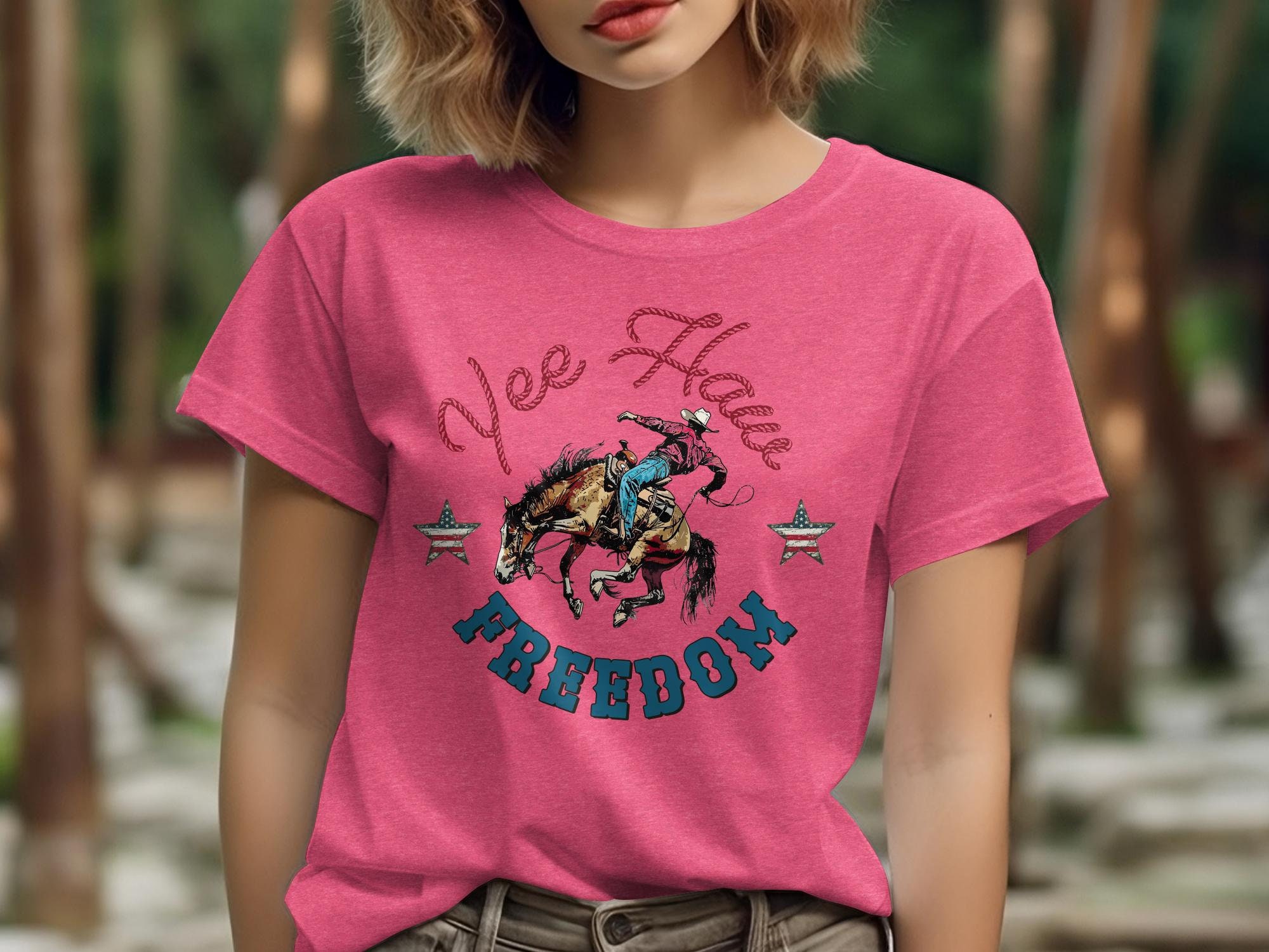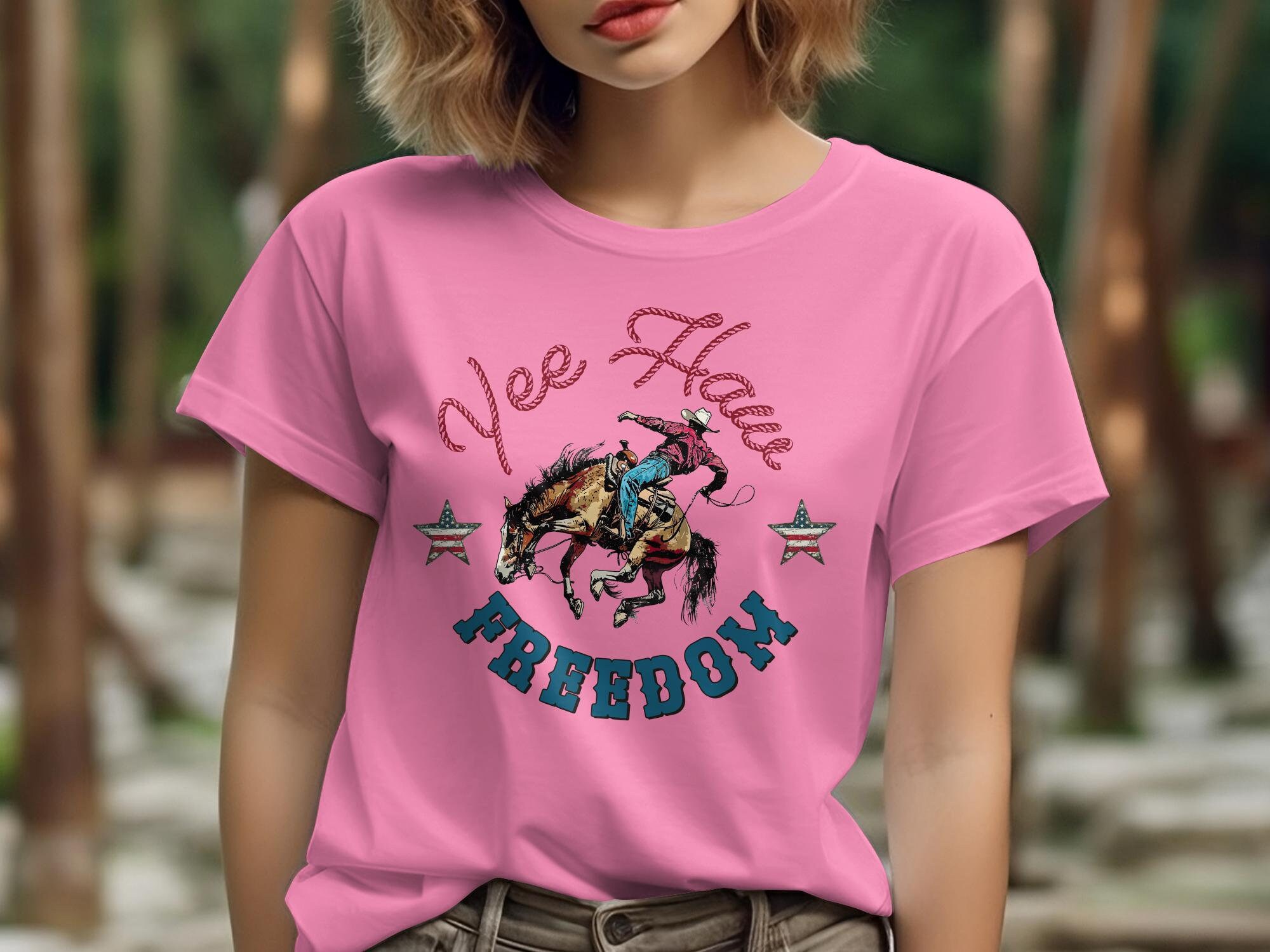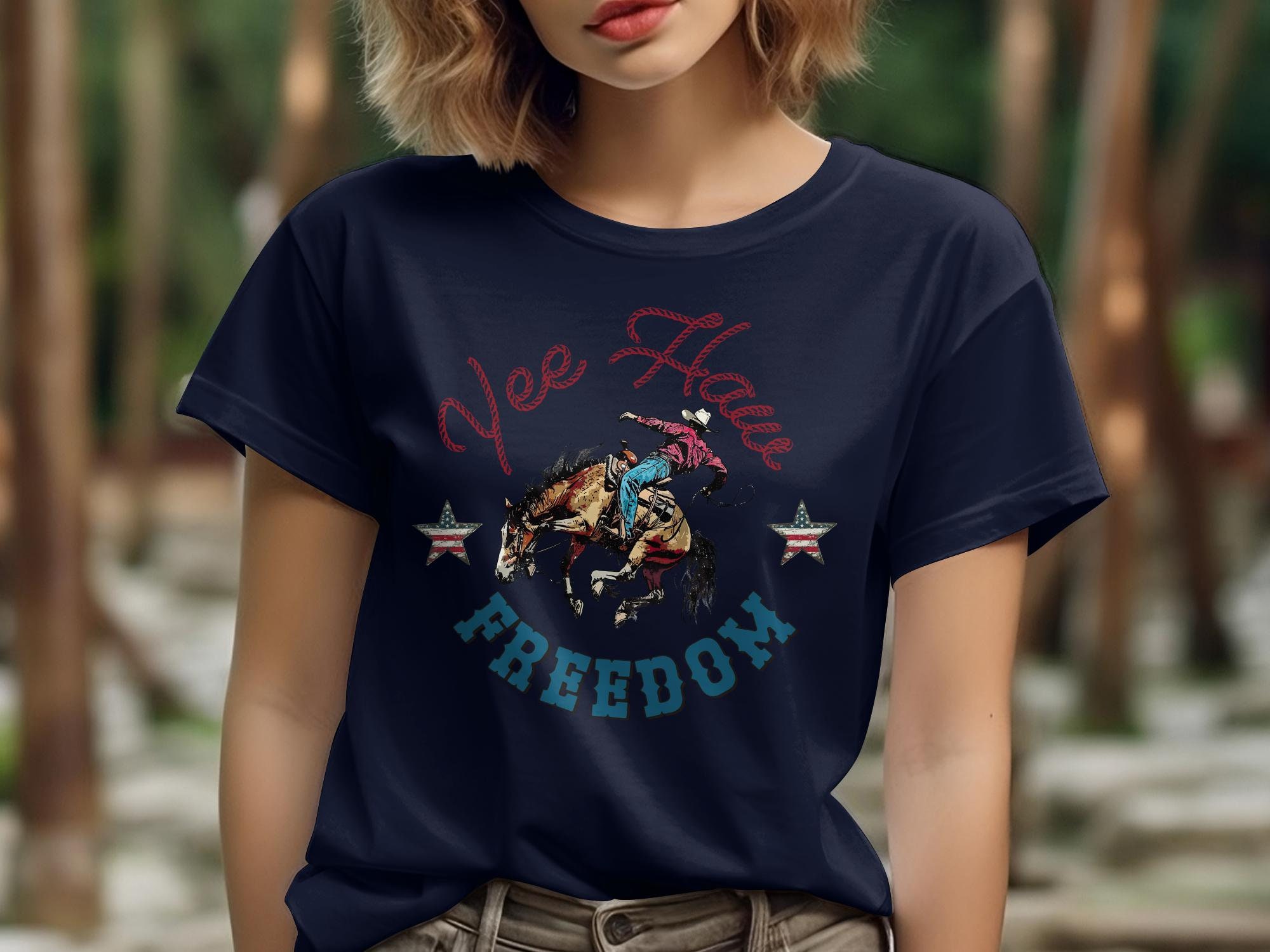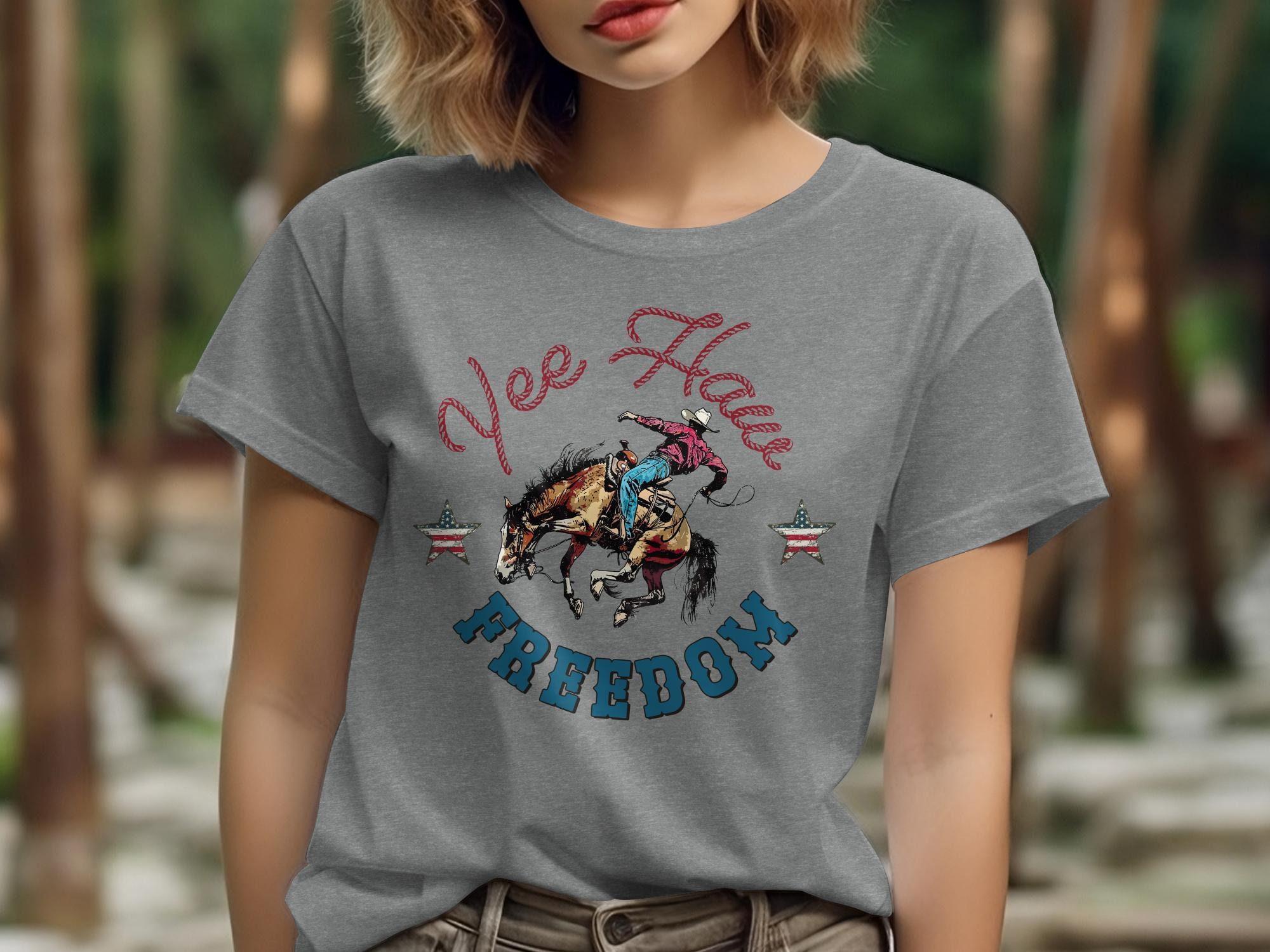 Embrace the spirit of the Wild West with this striking T-shirt featuring a cowboy expertly riding a bucking horse, intertwined with the bold words "We Have Freedom" and flanked by patriotic stars. Perfect for rodeo enthusiasts, history buffs, or anyone who values freedom and adventure, this shirt is made with high-quality material ensuring comfort and durability. Wear it to make a statement, to a casual outing, or a thematic event to flaunt your rugged American spirit.