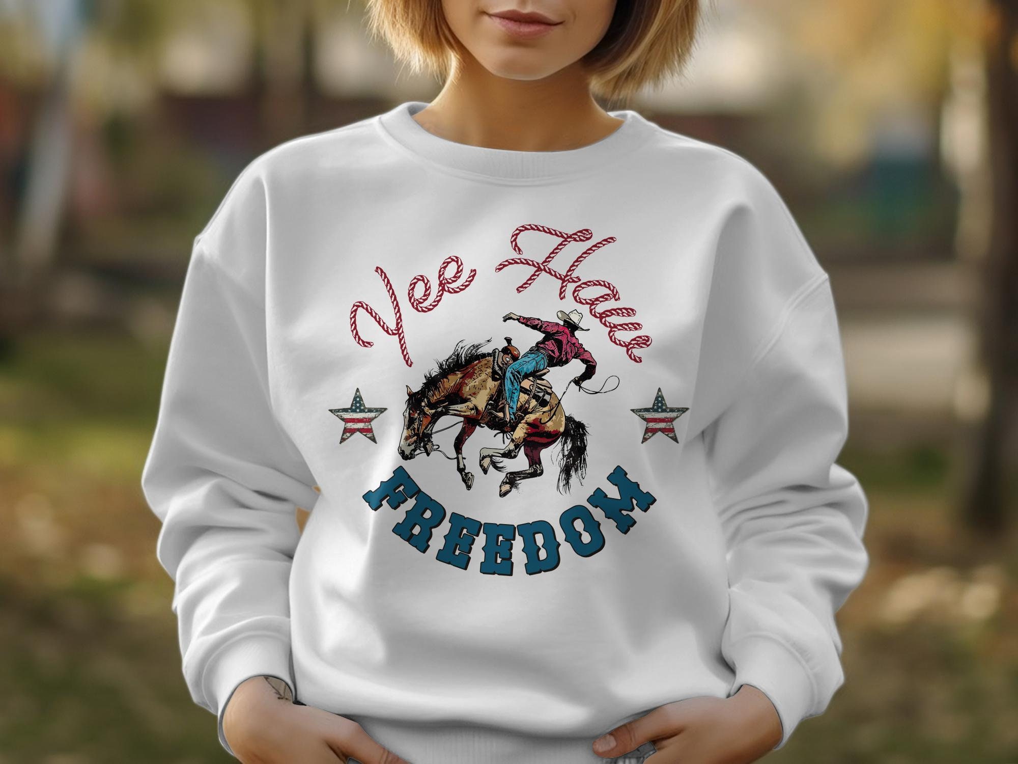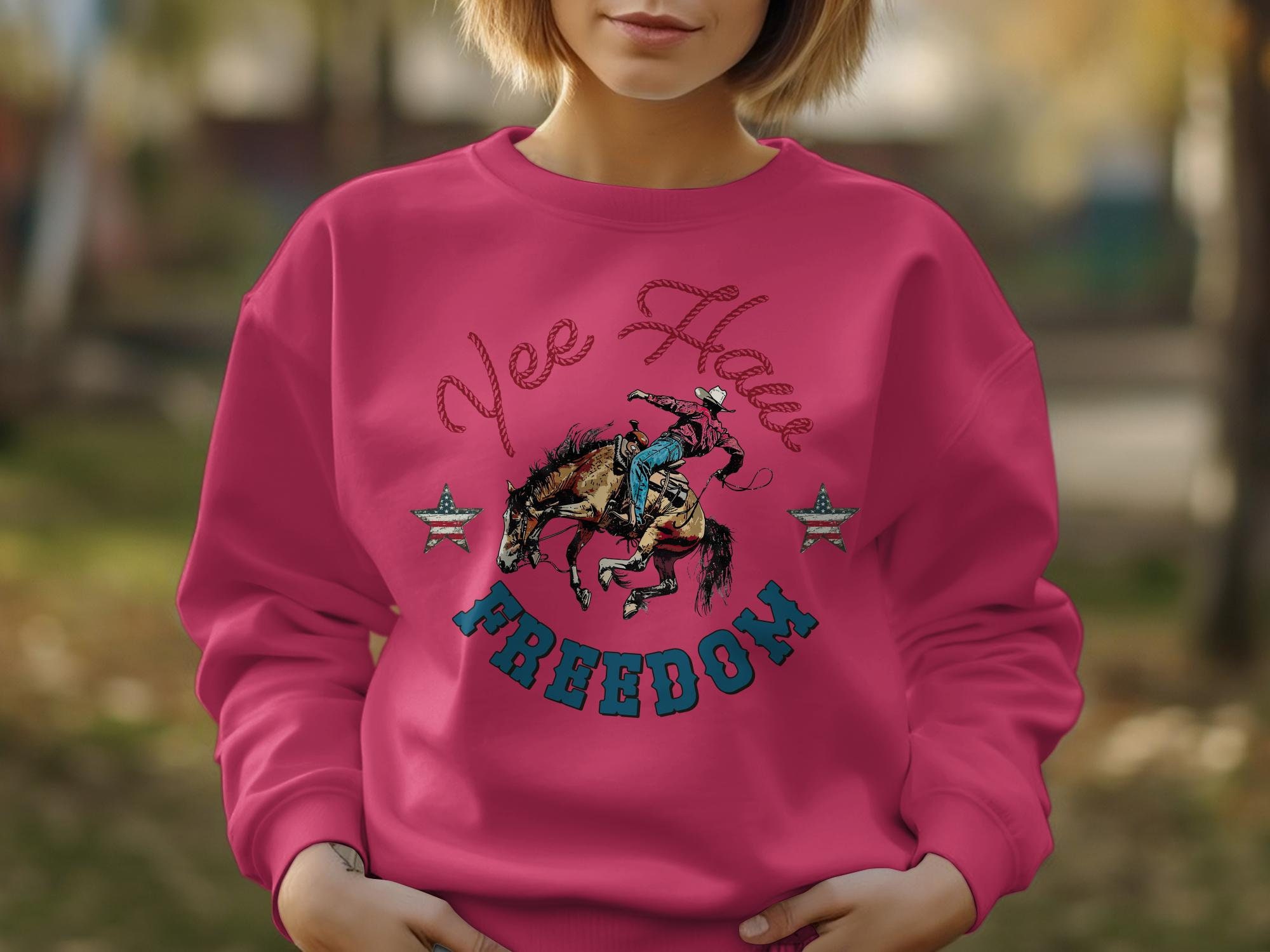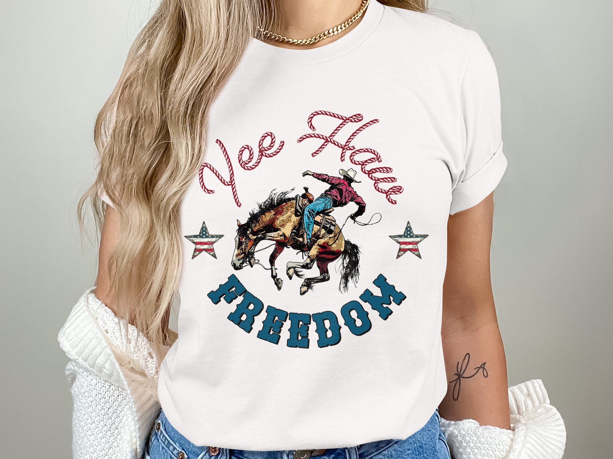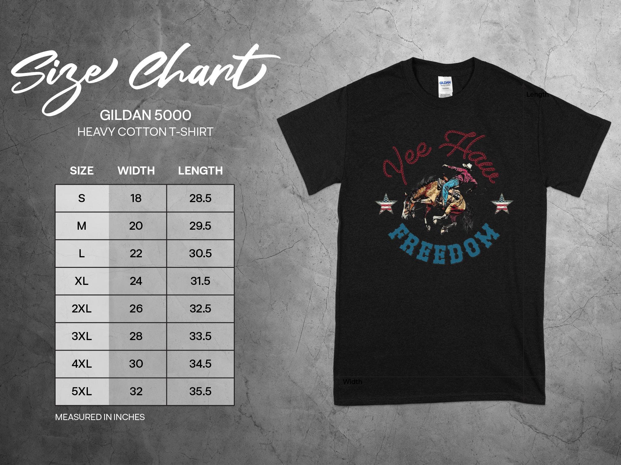 Embrace the spirit of the Wild West with this striking T-shirt featuring a cowboy expertly riding a bucking horse, intertwined with the bold words "We Have Freedom" and flanked by patriotic stars. Perfect for rodeo enthusiasts, history buffs, or anyone who values freedom and adventure, this shirt is made with high-quality material ensuring comfort and durability. Wear it to make a statement, to a casual outing, or a thematic event to flaunt your rugged American spirit.