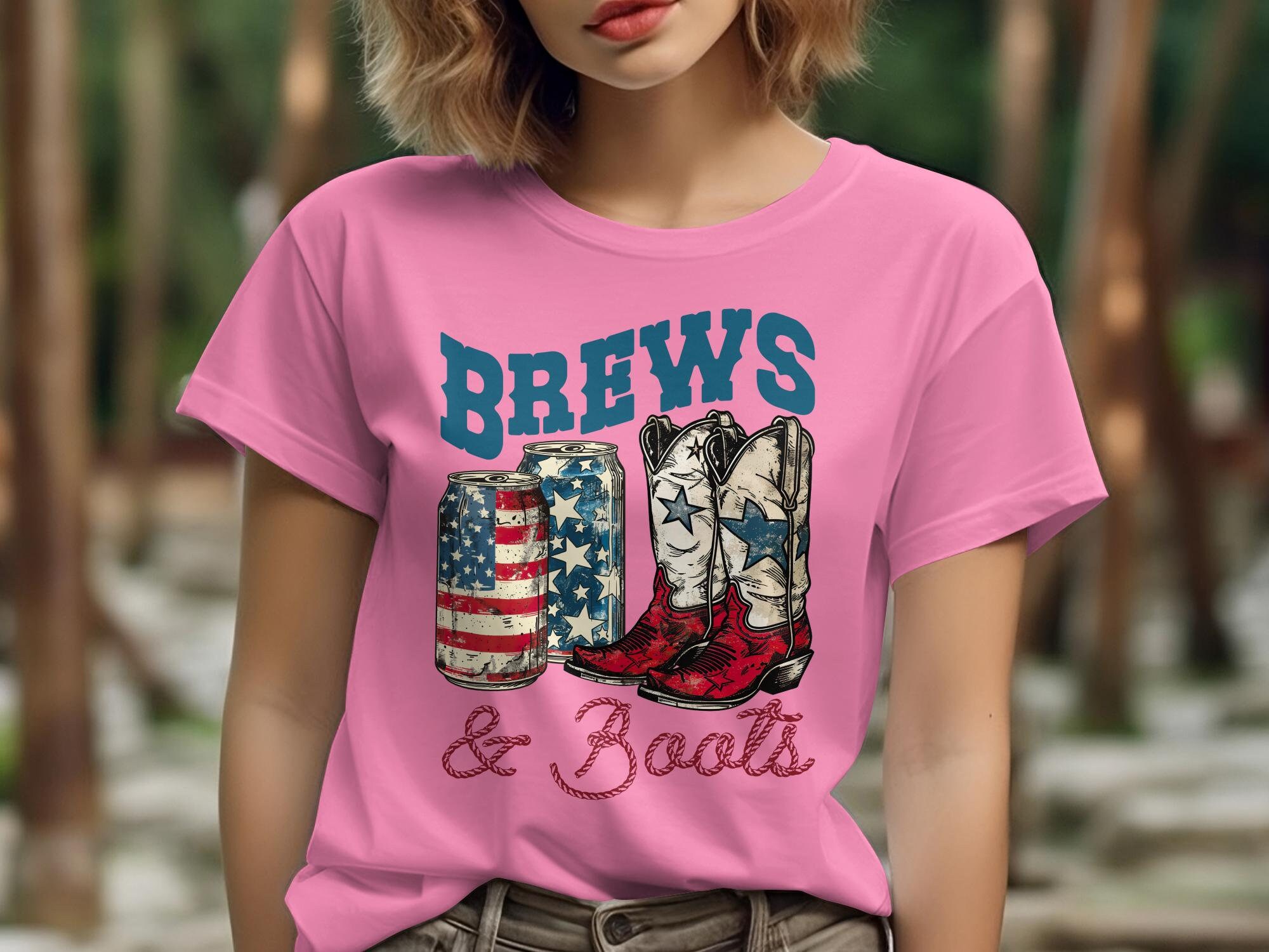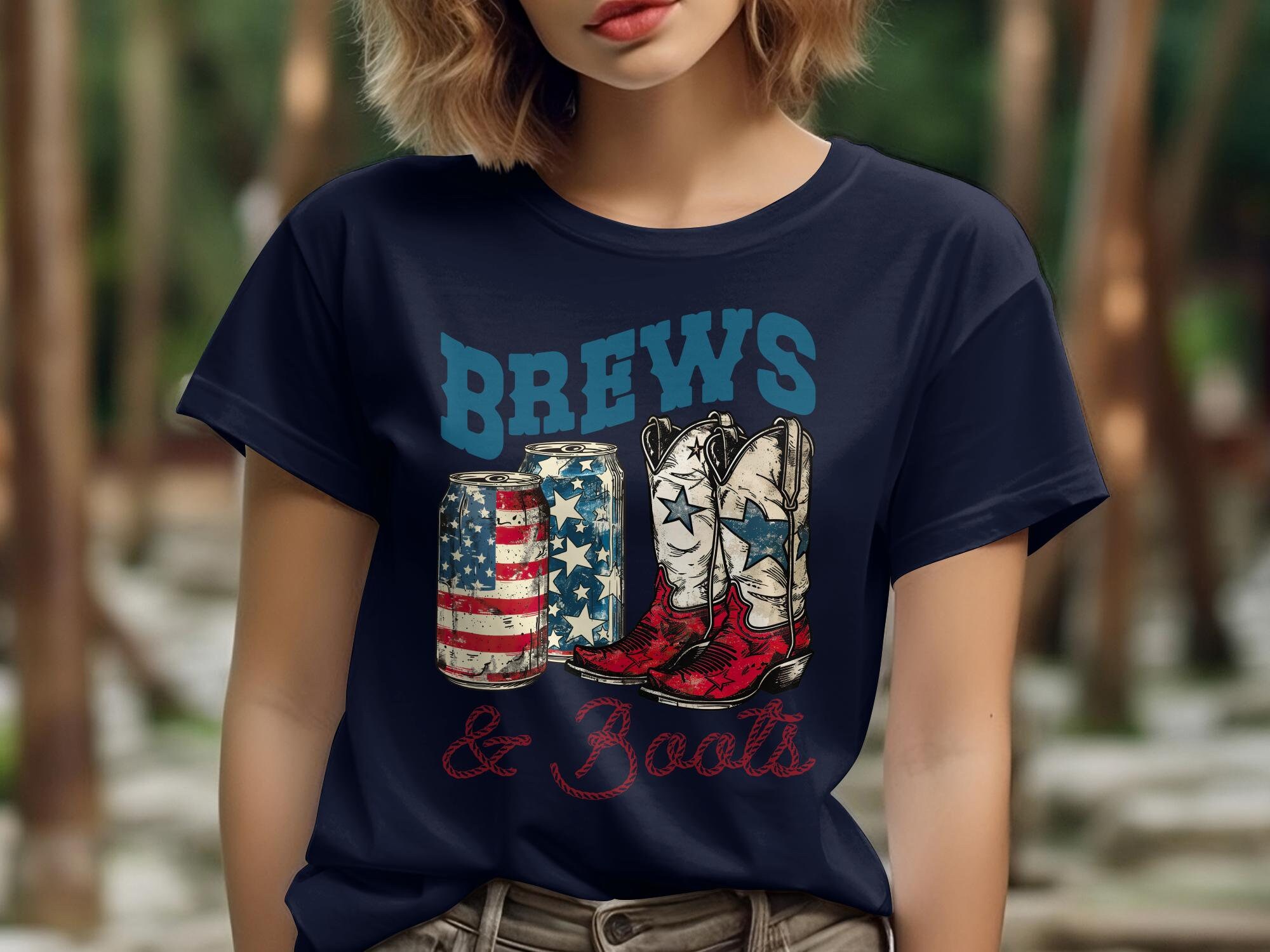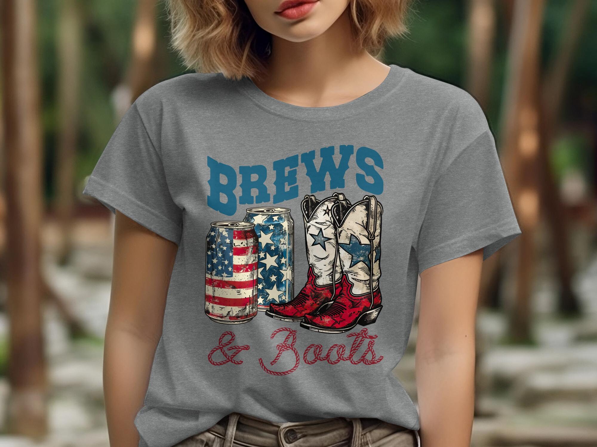 Show off your country pride with this unique Brews and Boots t-shirt! Featuring an eye-catching graphic of cowboy boots and beer cans adorned with the American flag, this tee is perfect for BBQs, country music concerts, and Fourth of July celebrations. Made from soft, durable material, it's comfortable enough for all-day wear and sure to be a hit at any patriotic event.