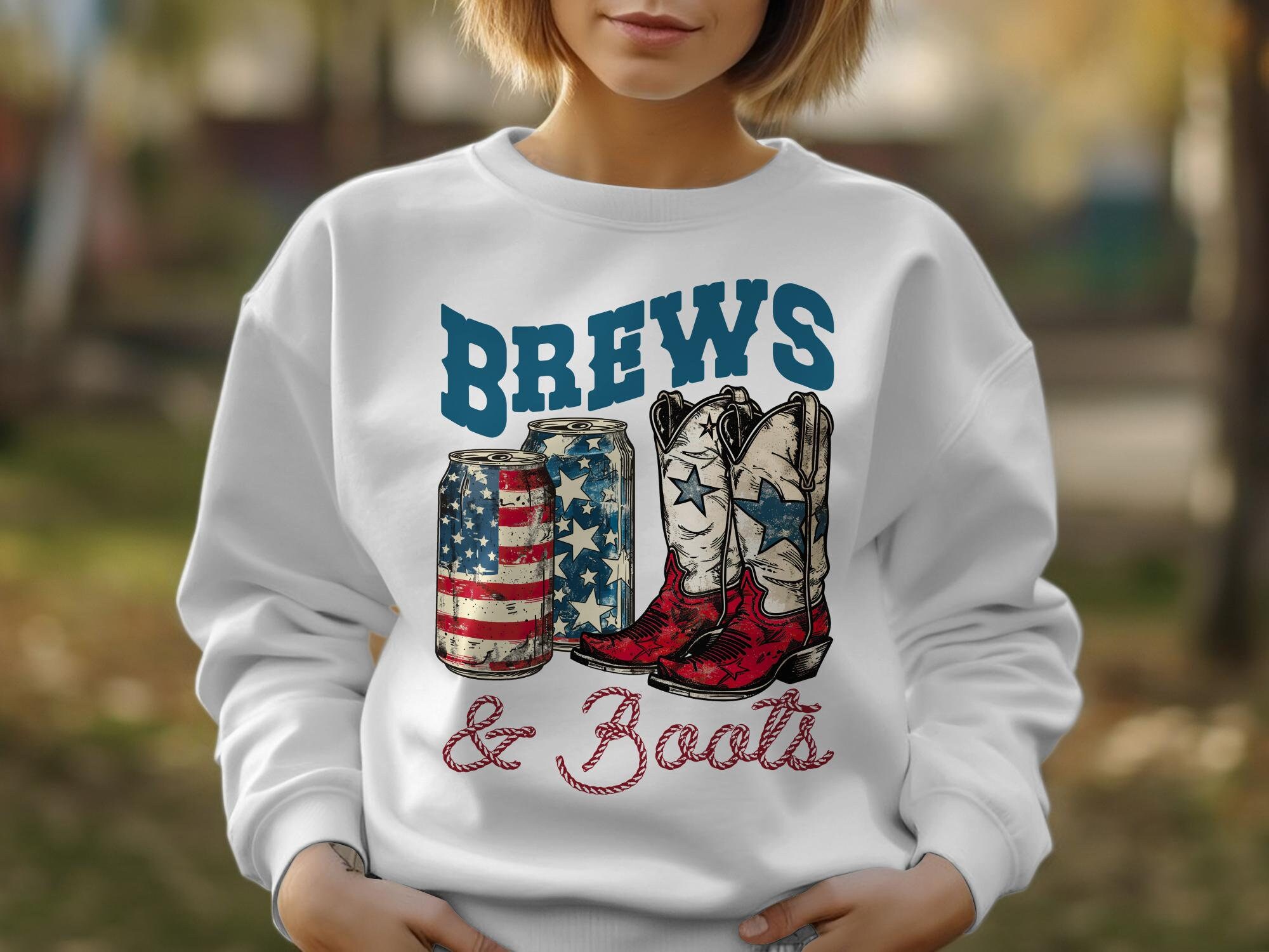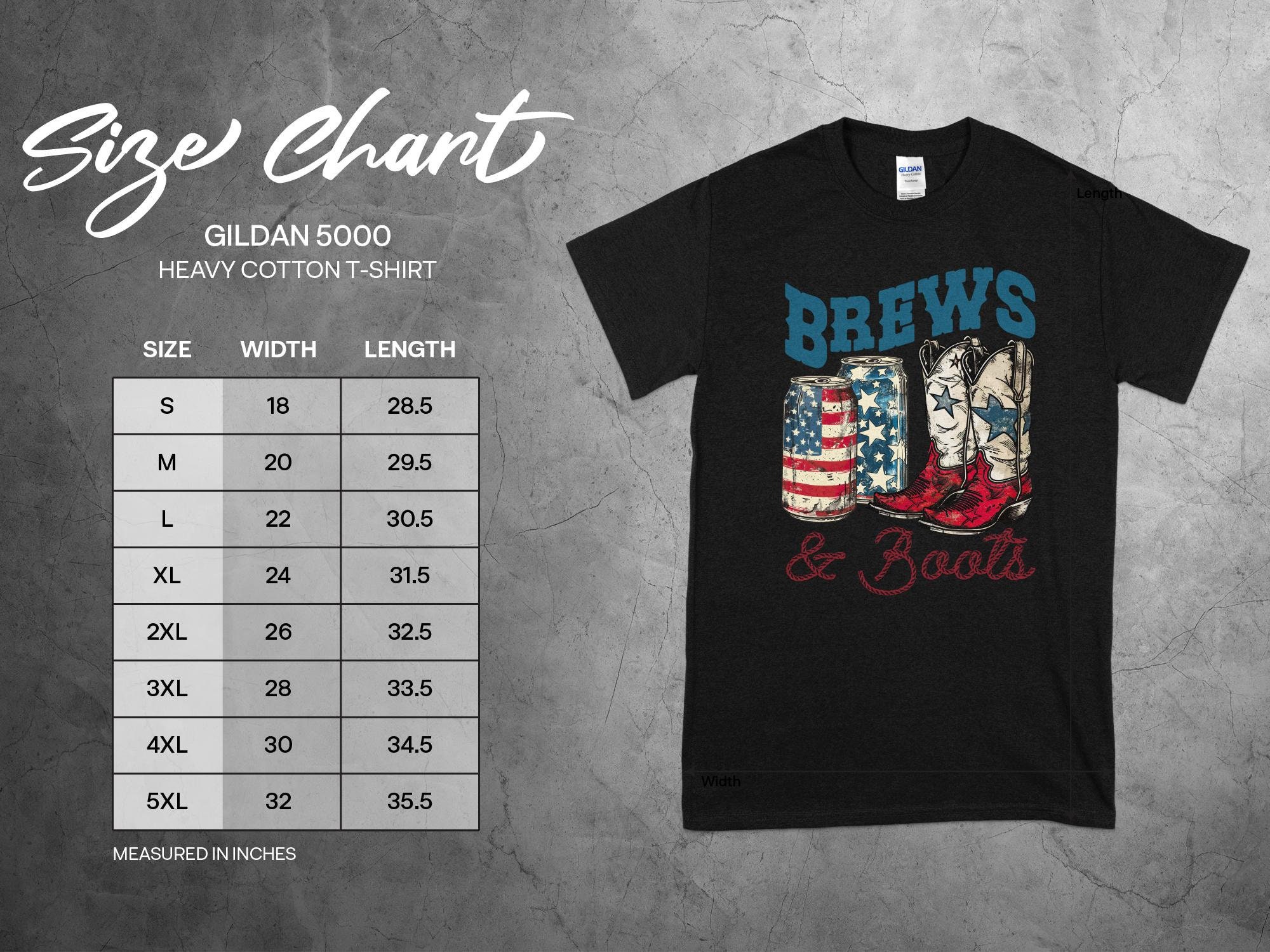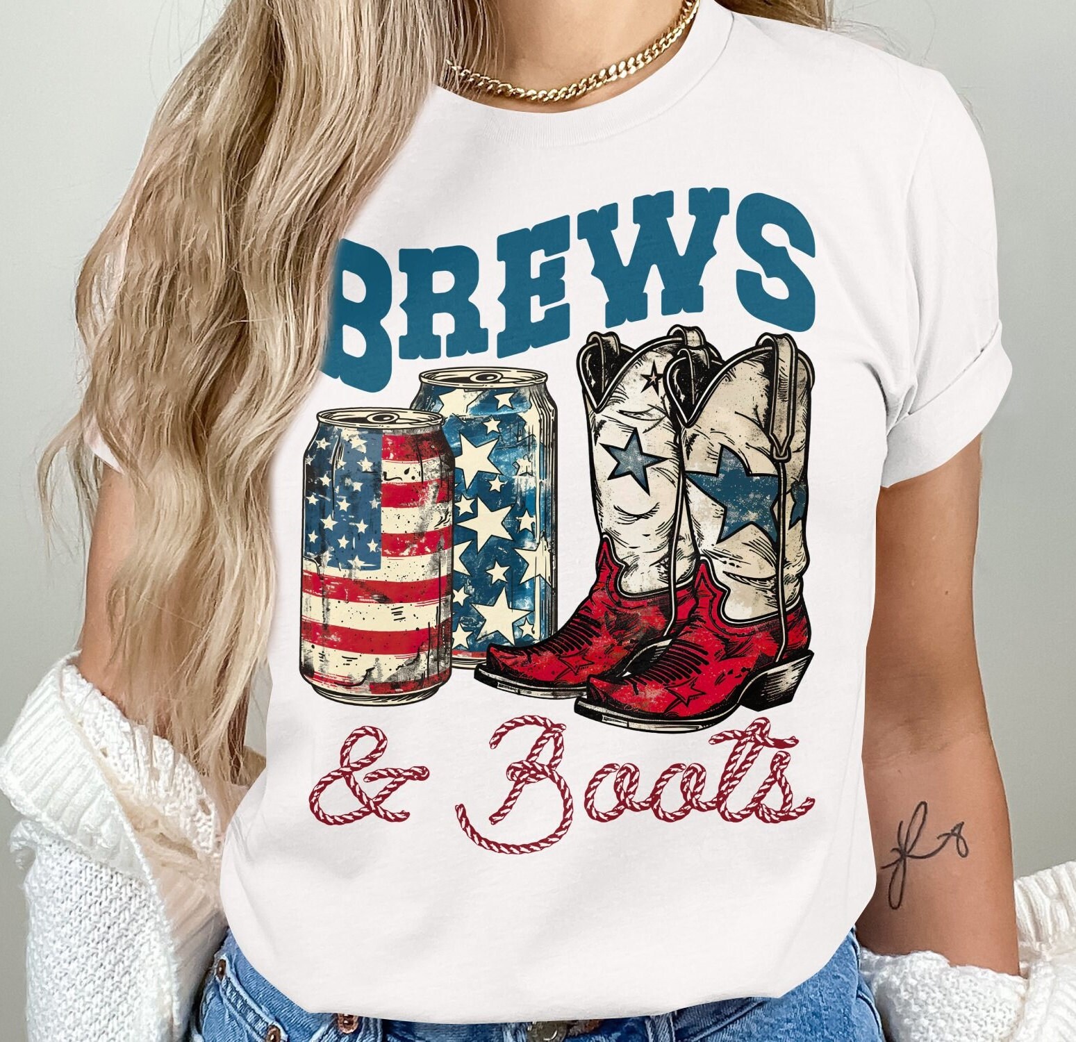 Show off your country pride with this unique Brews and Boots t-shirt! Featuring an eye-catching graphic of cowboy boots and beer cans adorned with the American flag, this tee is perfect for BBQs, country music concerts, and Fourth of July celebrations. Made from soft, durable material, it's comfortable enough for all-day wear and sure to be a hit at any patriotic event.