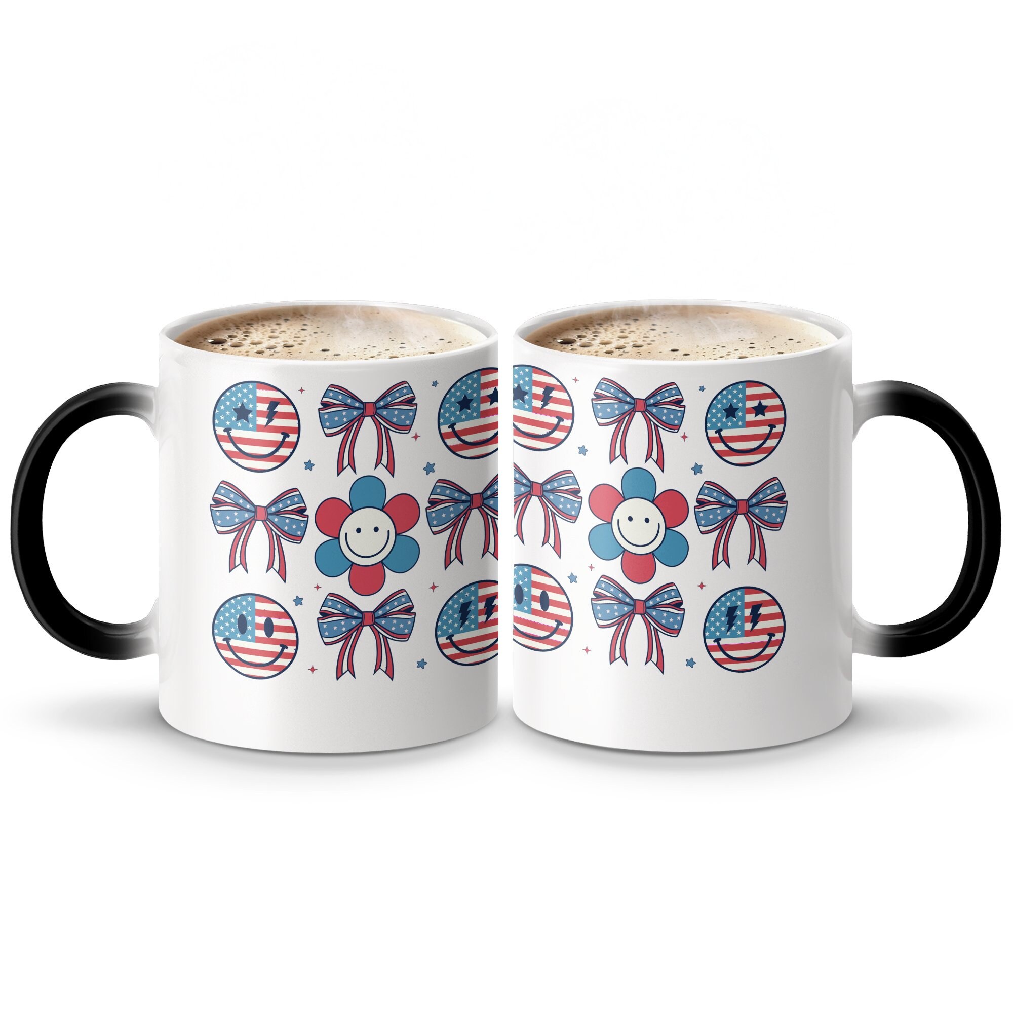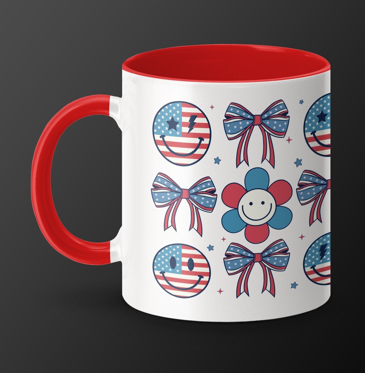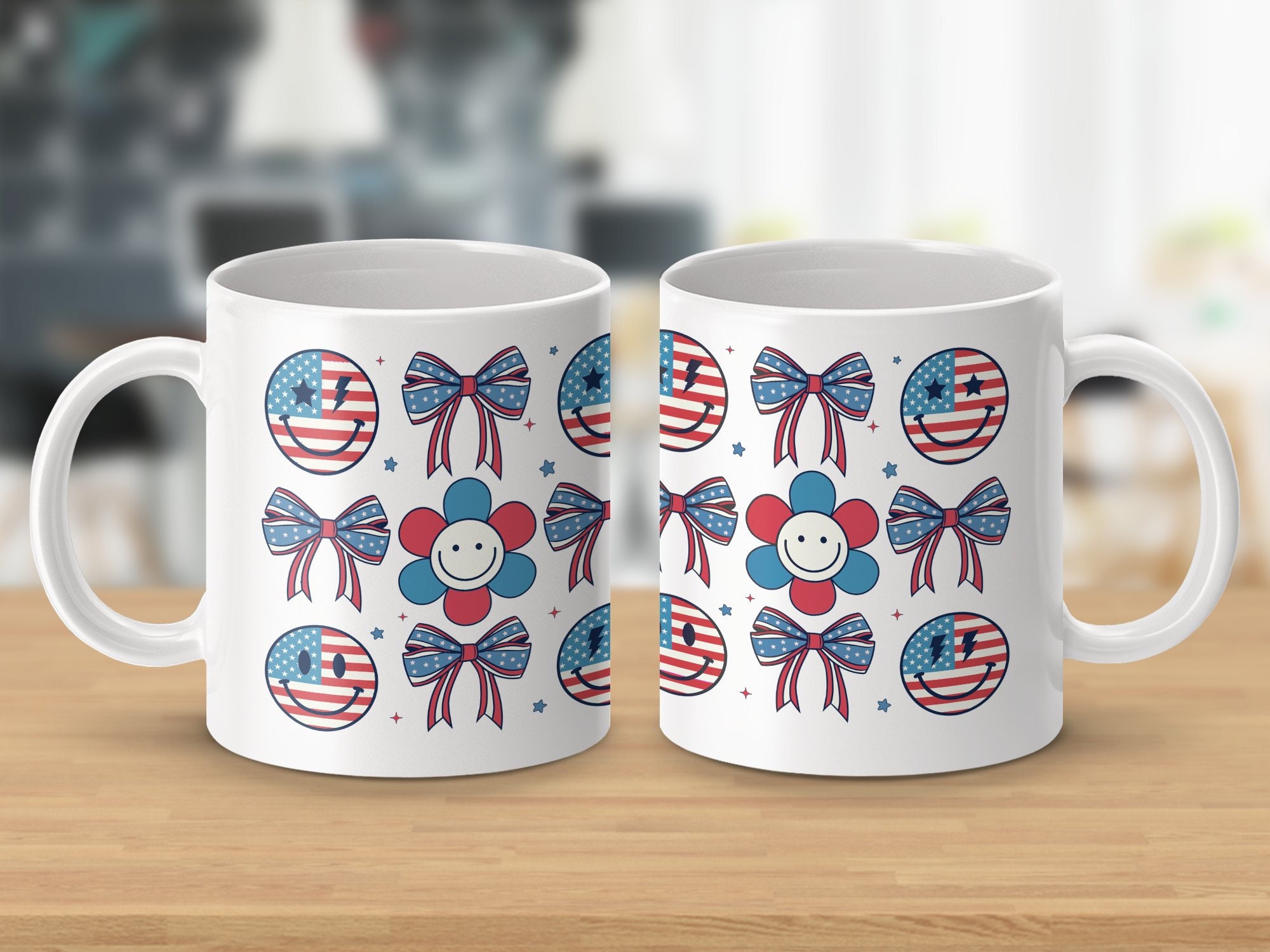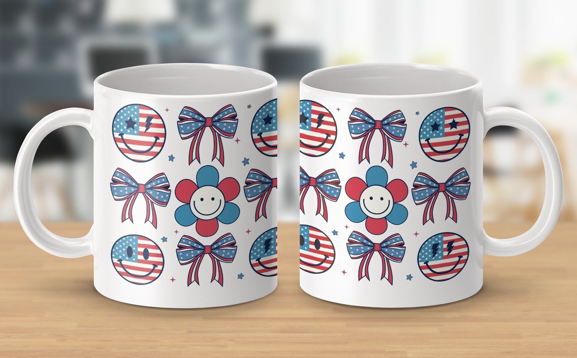 Celebrate Independence Day in style with this unique patriotic mug! Featuring fun American flag-themed designs with smiley faces and beautiful bows, this mug is perfect for enjoying your morning coffee or as a decorative item for your 4th of July celebrations. Made from high-quality materials, it's durable and ideal for daily use or as a thoughtful gift for anyone who loves America's colors! Cute Gift for your July 4th guests, to use on patriotic holidays, and everyday use.
