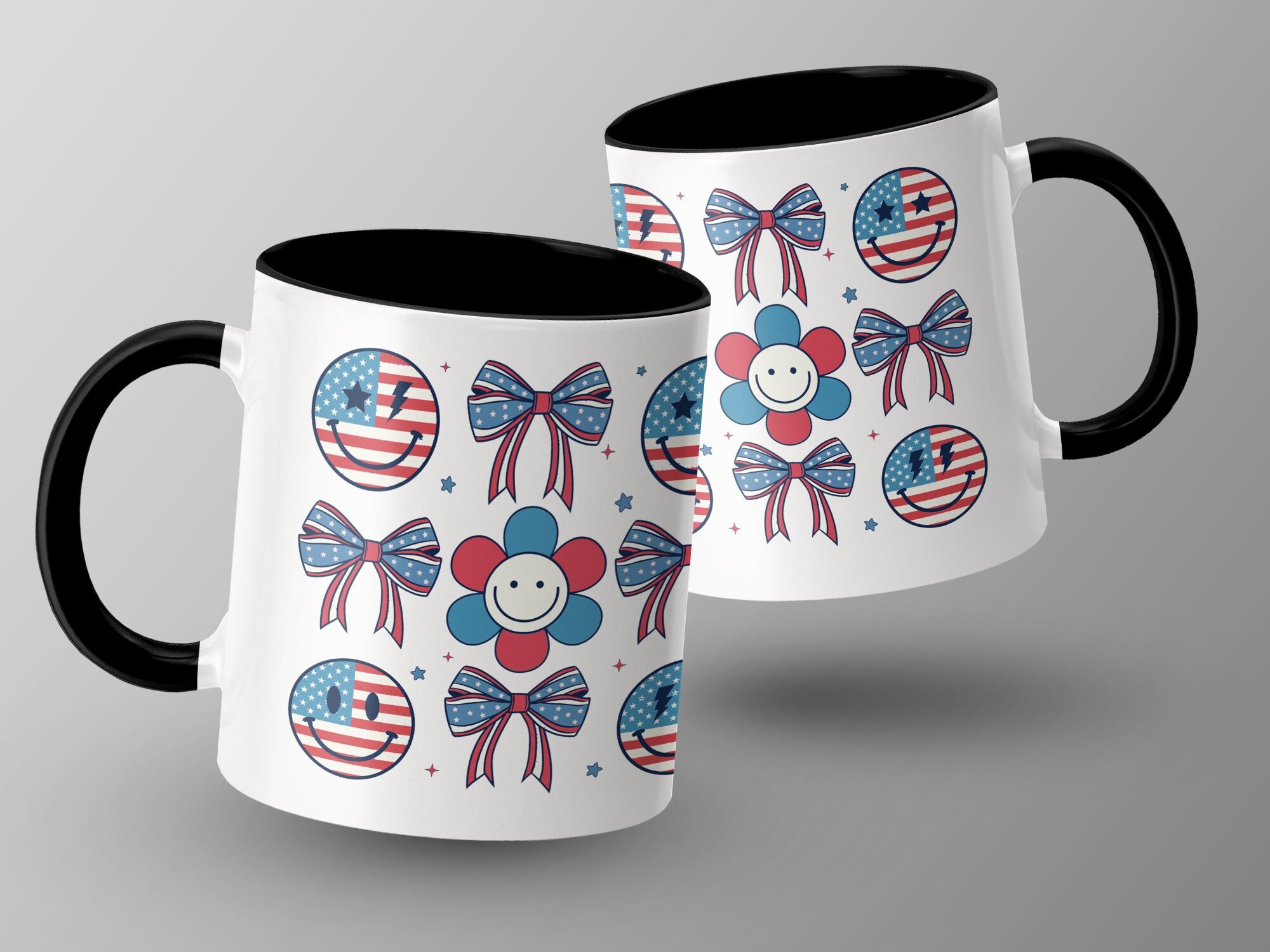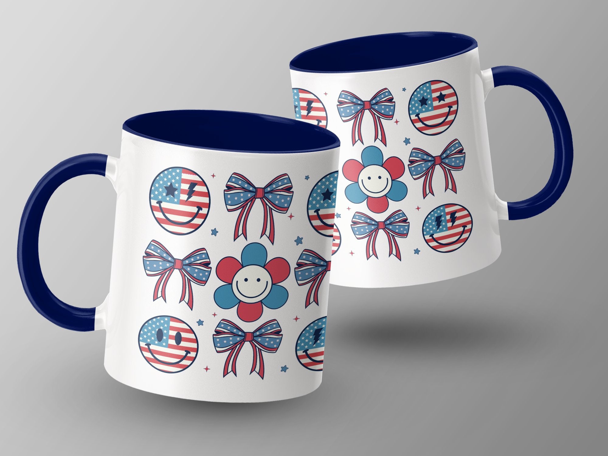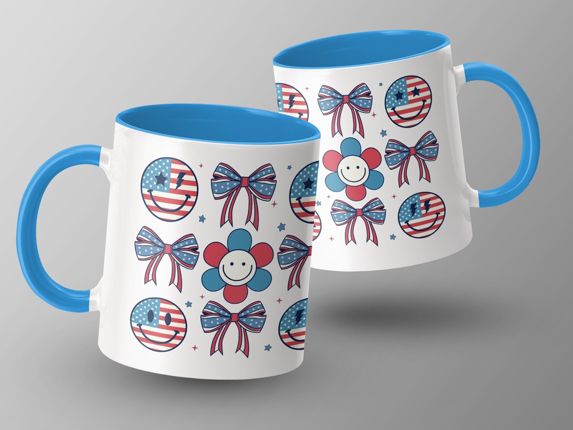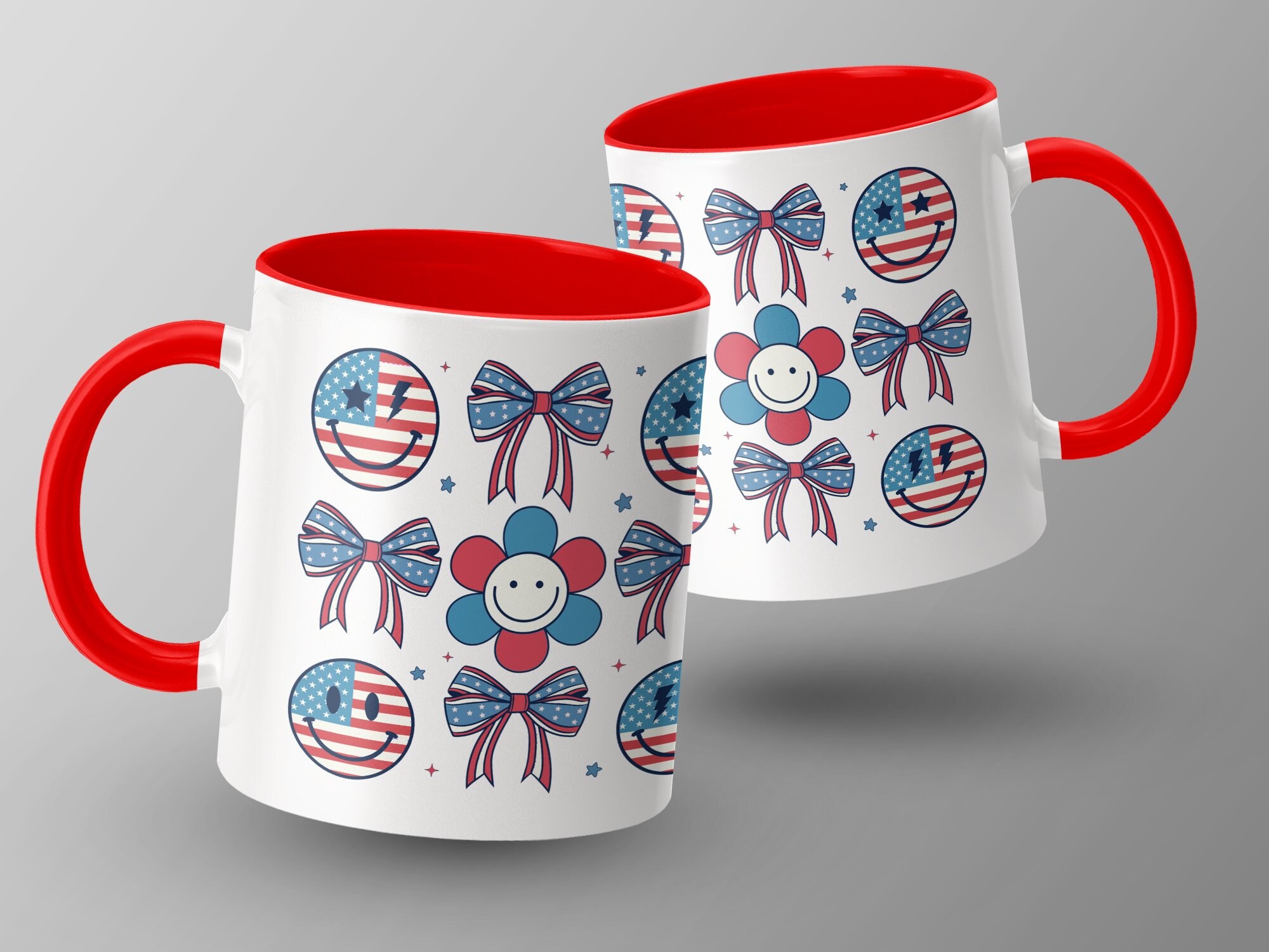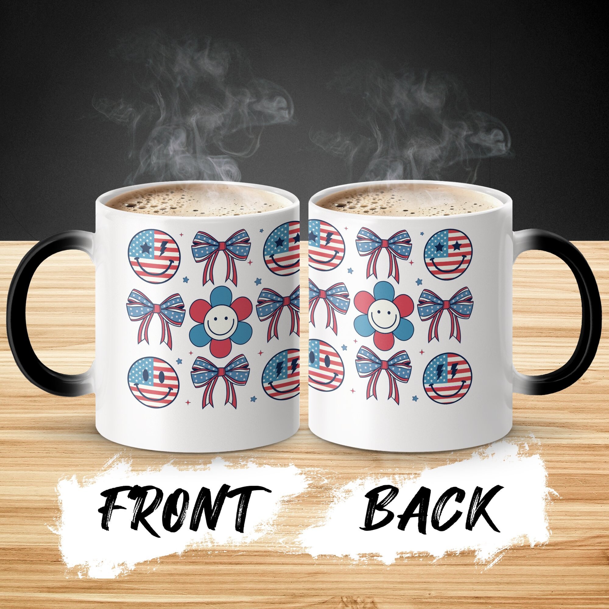 Celebrate Independence Day in style with this unique patriotic mug! Featuring fun American flag-themed designs with smiley faces and beautiful bows, this mug is perfect for enjoying your morning coffee or as a decorative item for your 4th of July celebrations. Made from high-quality materials, it's durable and ideal for daily use or as a thoughtful gift for anyone who loves America's colors! Cute Gift for your July 4th guests, to use on patriotic holidays, and everyday use.