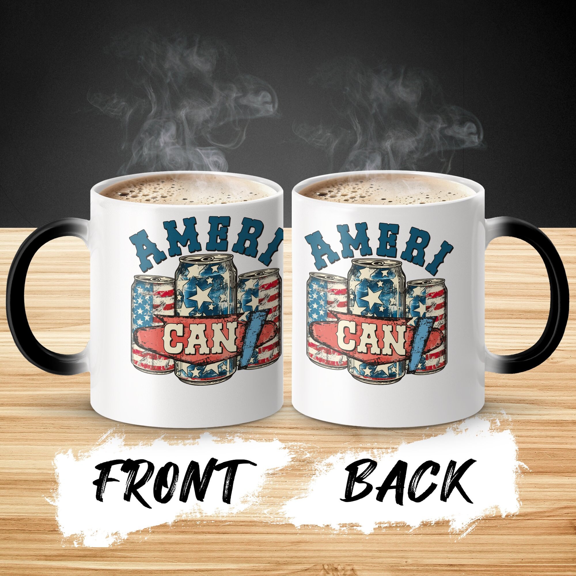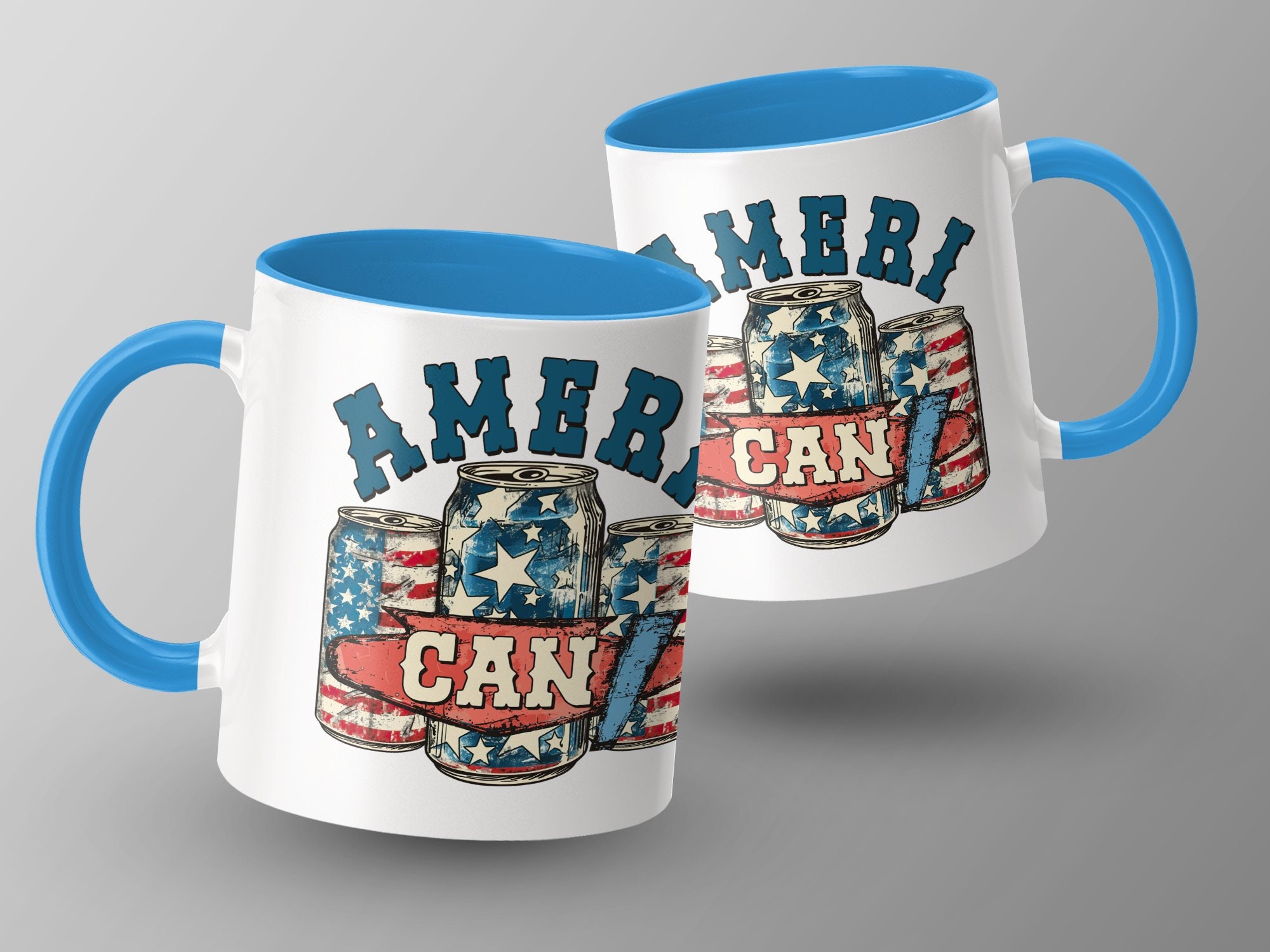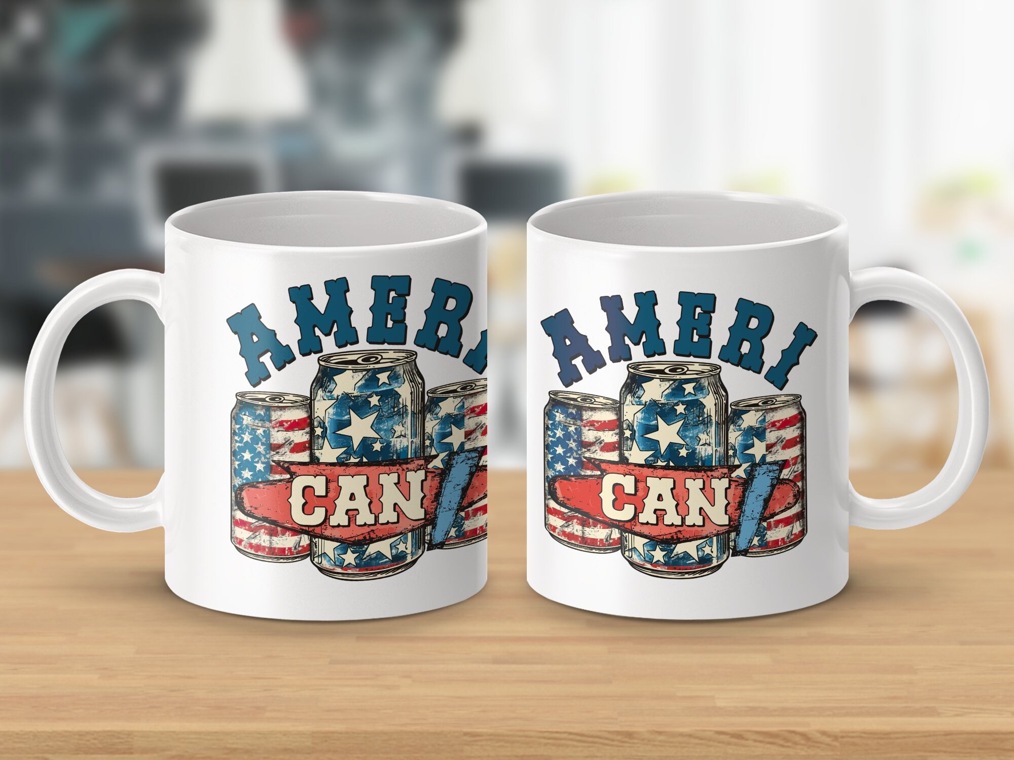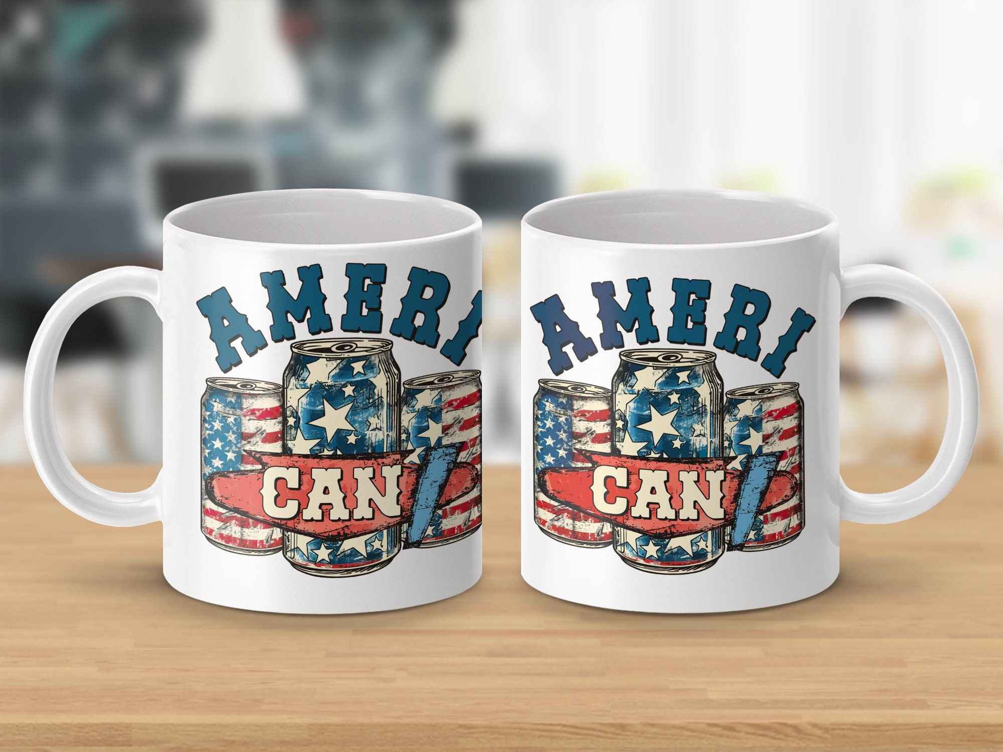 Celebrate your love for the country with this unique American can design mug. The design replicates vintage beverage cans adorned with the American flag colors and star patterns, making it a perfect patriotic addition to your mug collection. Ideal for sipping your favorite beverages, this mug also makes a great gift for friends and family who appreciate vintage American aesthetics and patriotism.