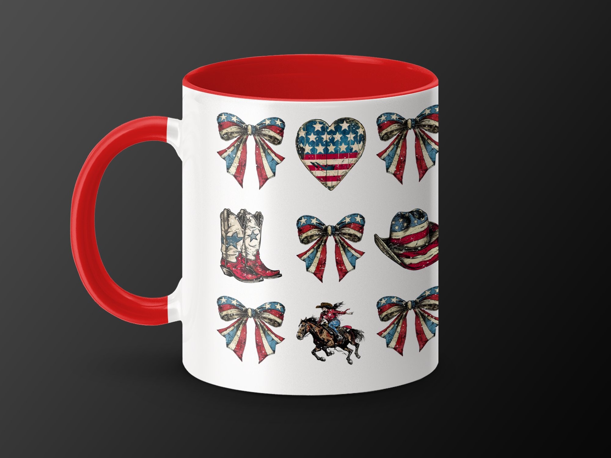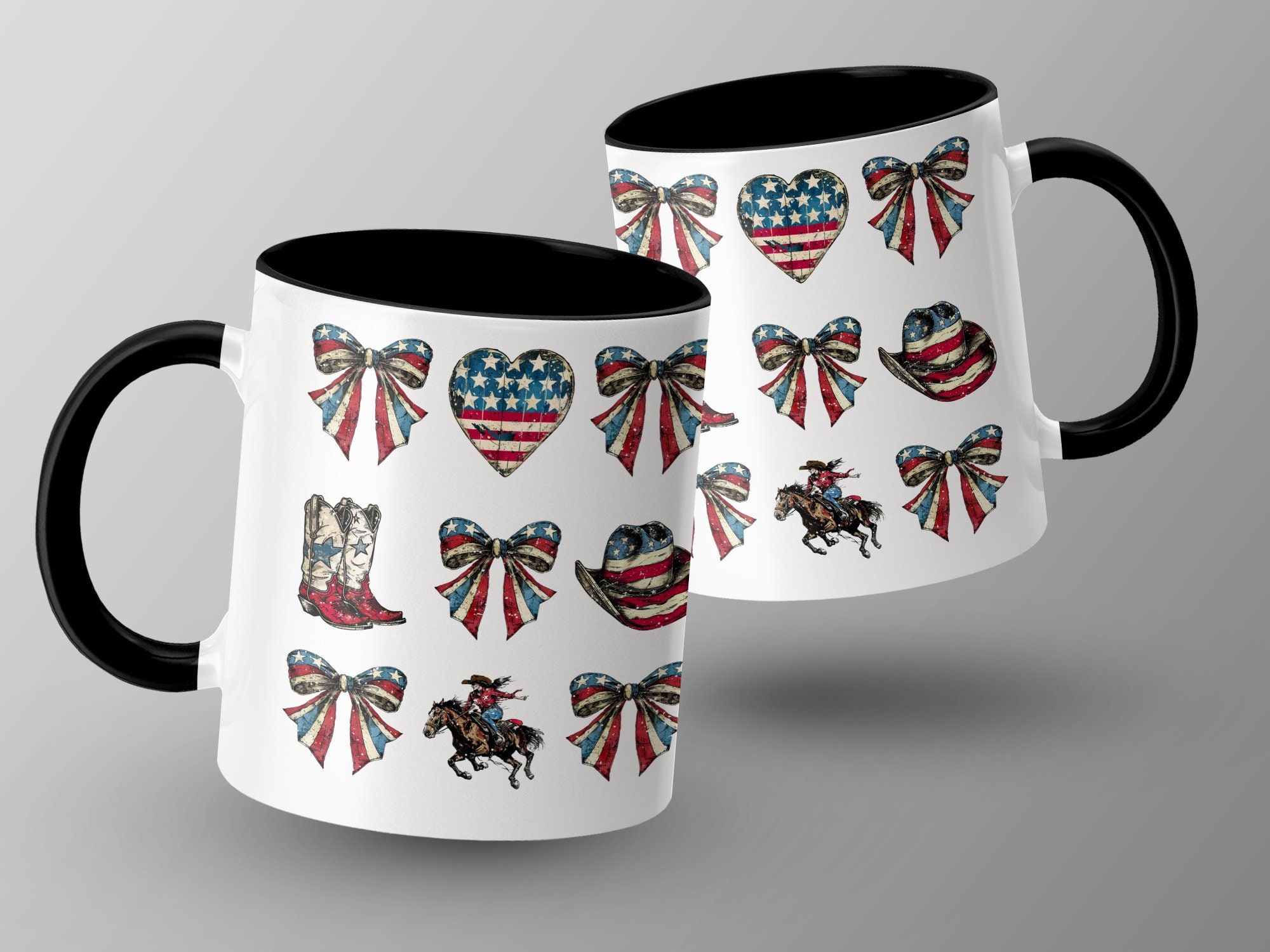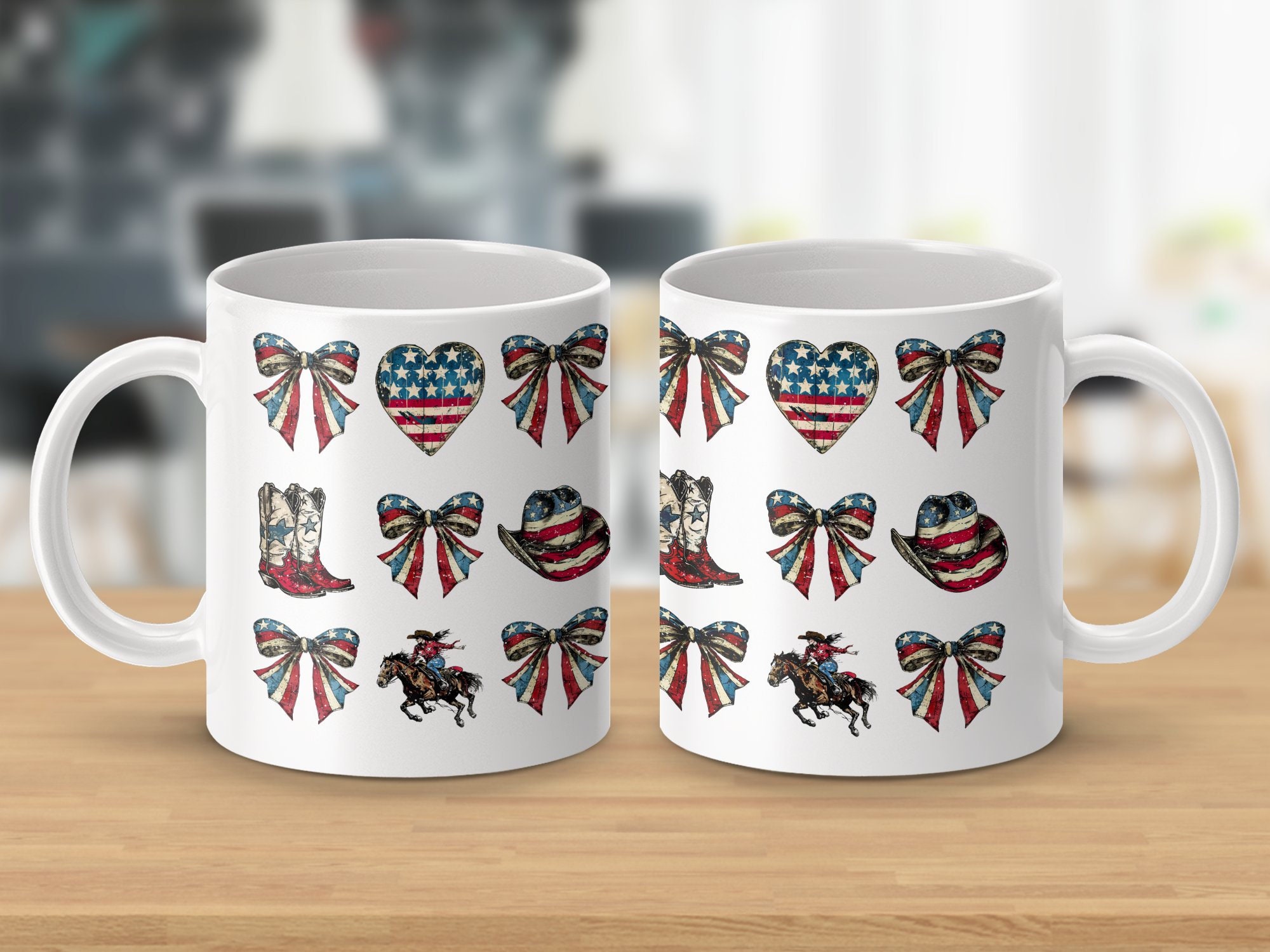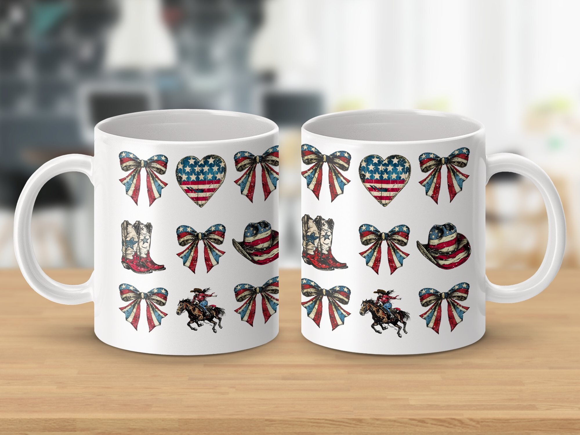 Coquette Patriotic Bow Mug, Patriotic American Flag Theme Mug, Cowboy Boots and Hat Mug, Heart, Bows, & Horse Rider Coffee Cup