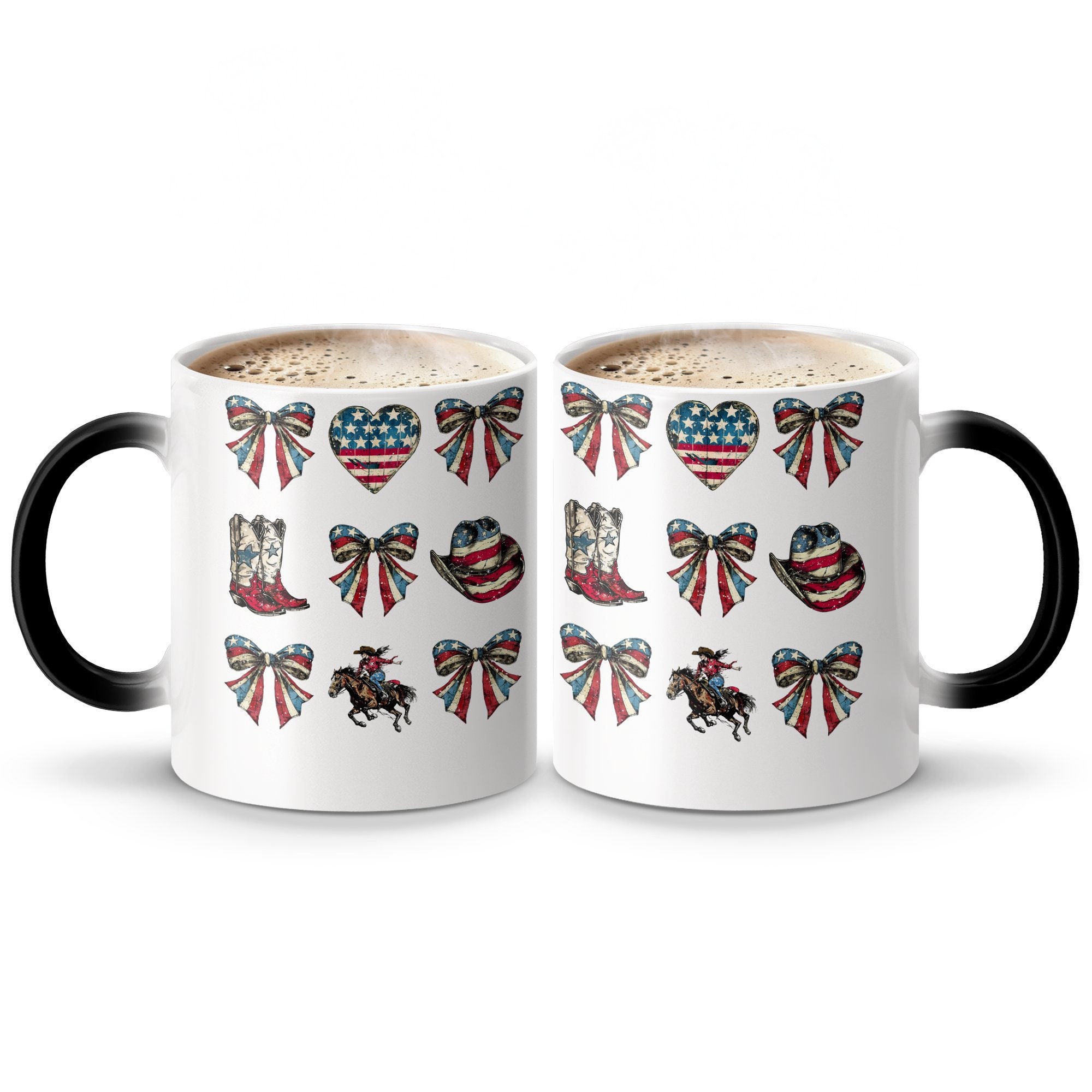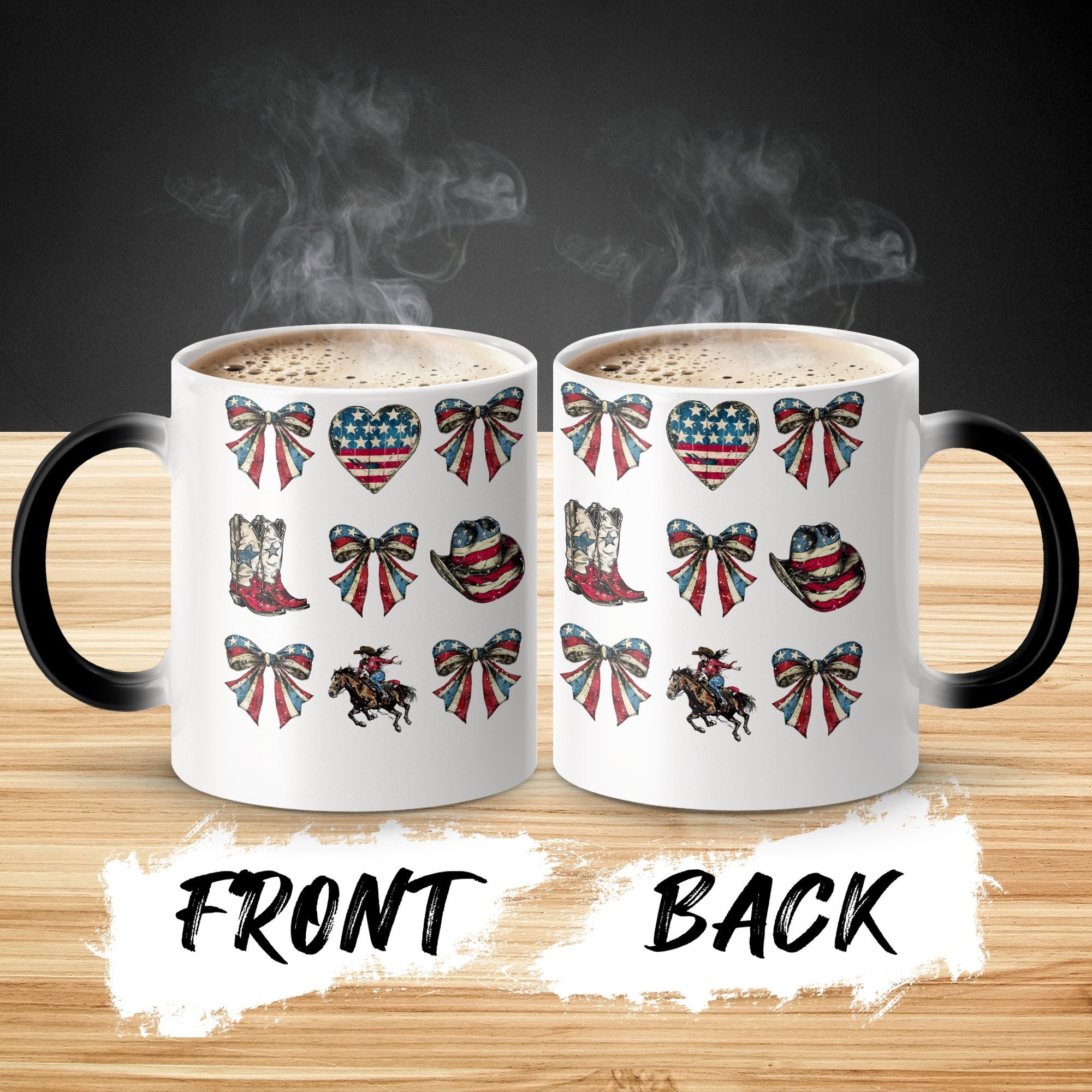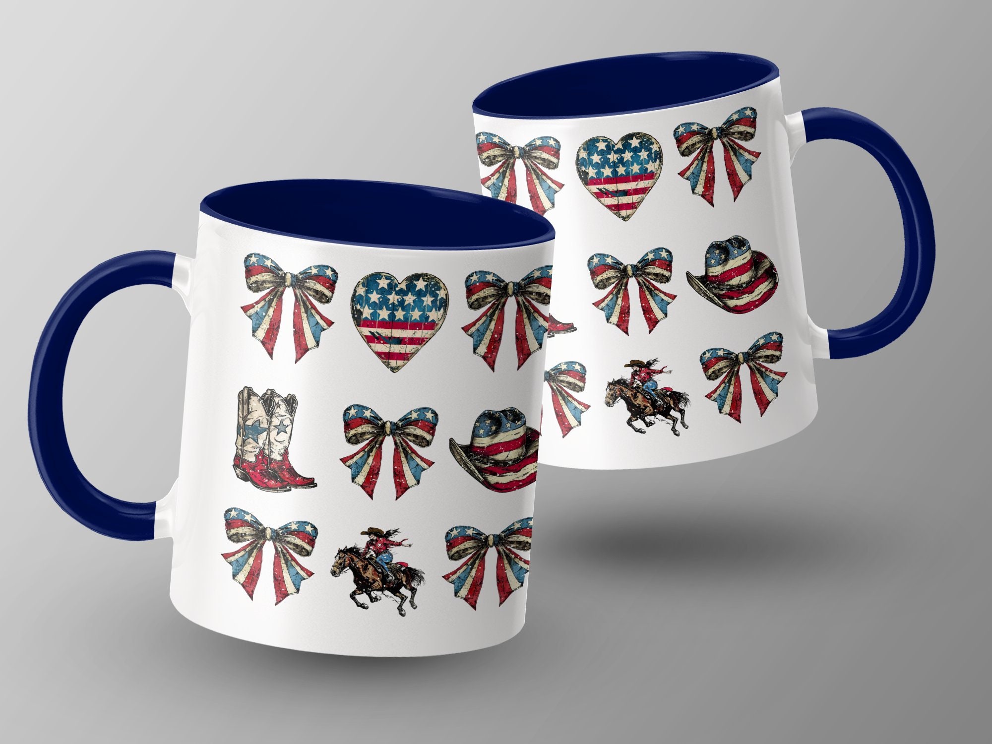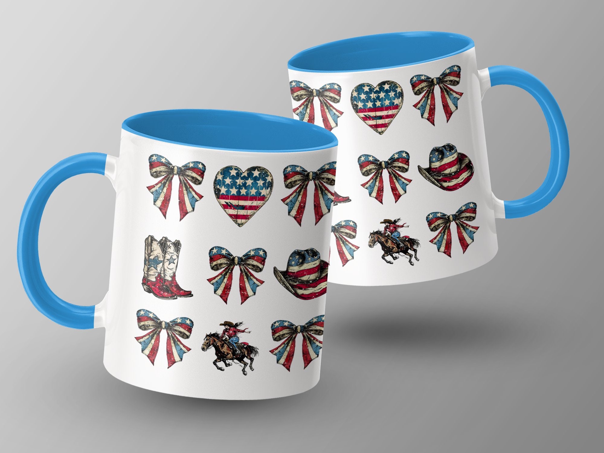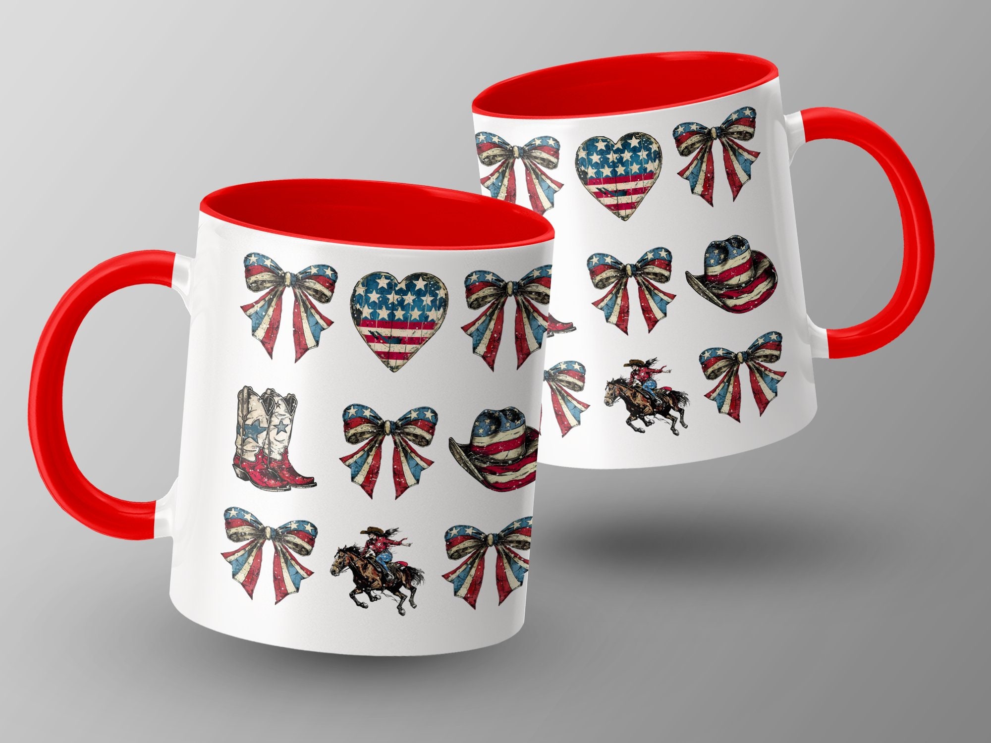 Coquette Patriotic Bow Mug, Patriotic American Flag Theme Mug, Cowboy Boots and Hat Mug, Heart, Bows, & Horse Rider Coffee Cup