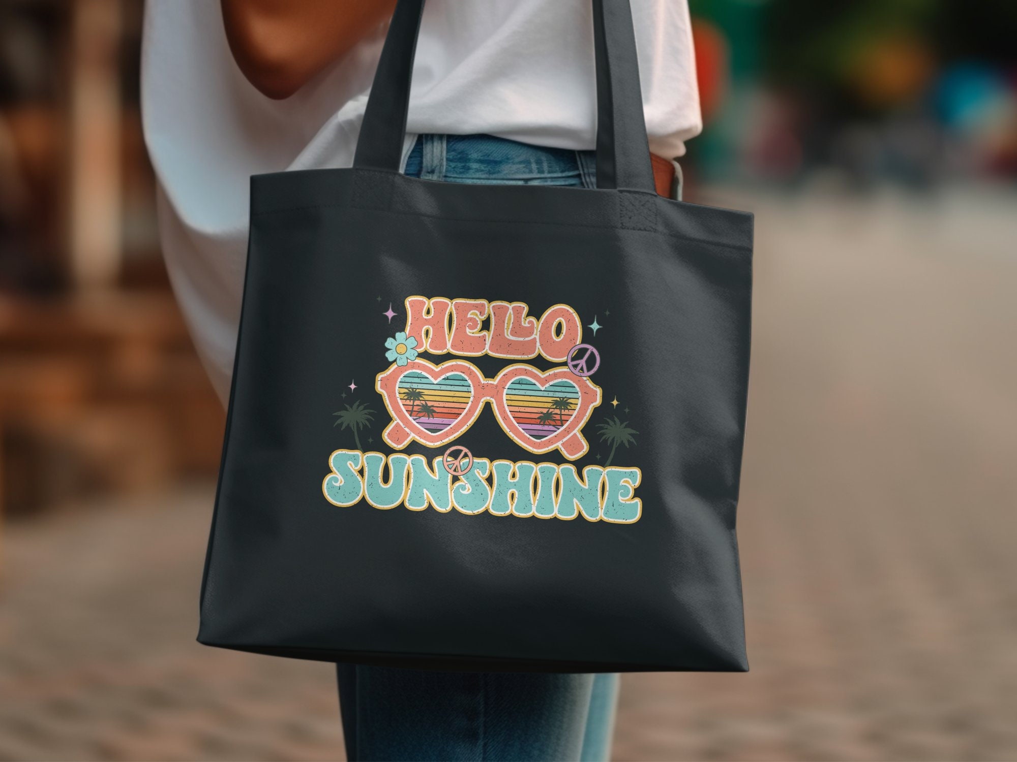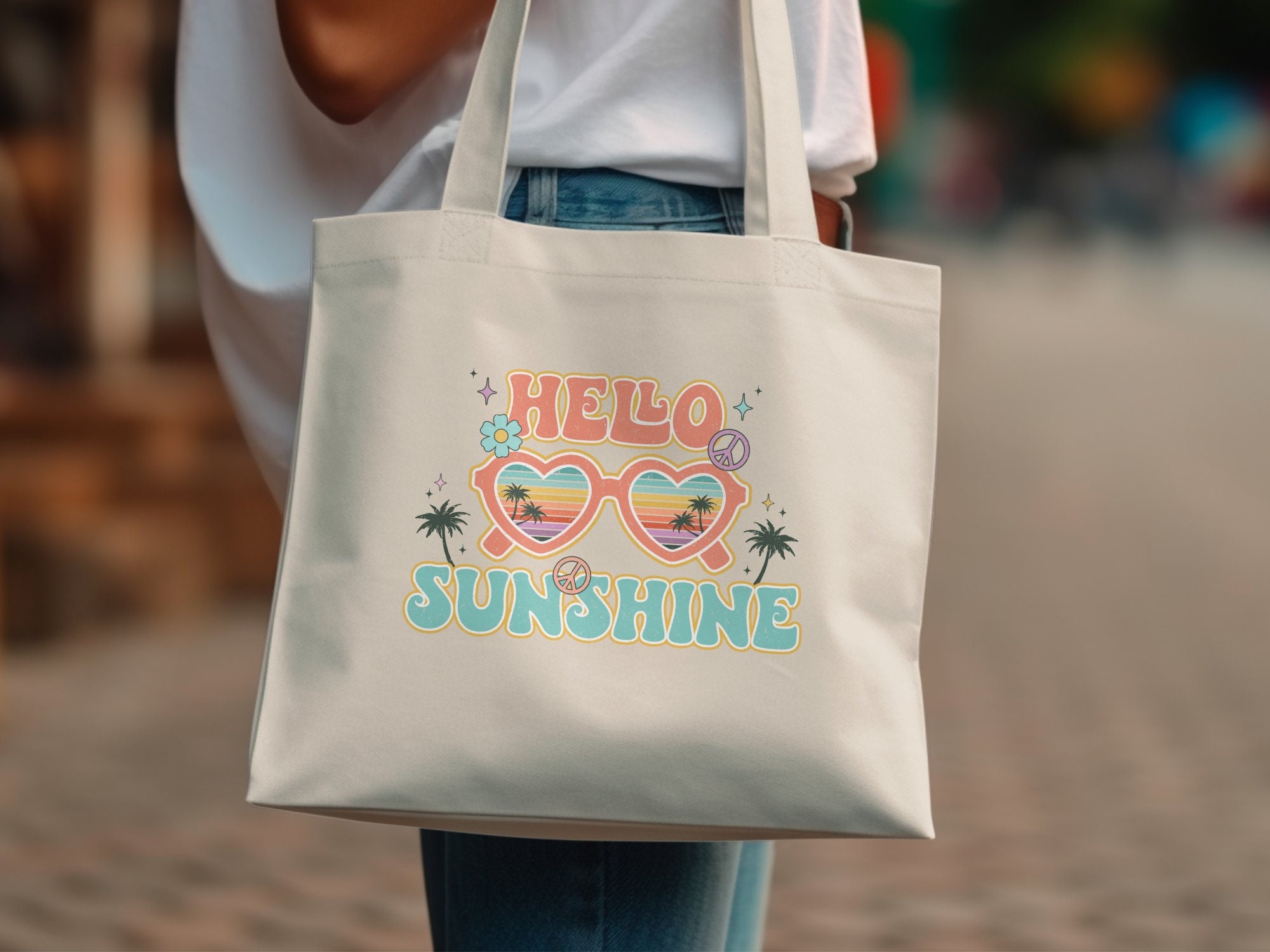 Embrace the sun-drenched days of summer with our "Hello Sunshine" retro-style graphic tote...Featuring a vibrant beach sunset encapsulated in stylish sunglass letters, this tote projects a laid-back vibe perfect for any casual outing. Ideal for beach trips, daily wear, or as a thoughtful gift for the sunshine lover in your life! Cute gift for anyone; fill with sunscreen, hair ties, water bottle, bathing suit. cute bag for daycare, vacation, pool days, shopping, going to the park, or to store your summer essentials.