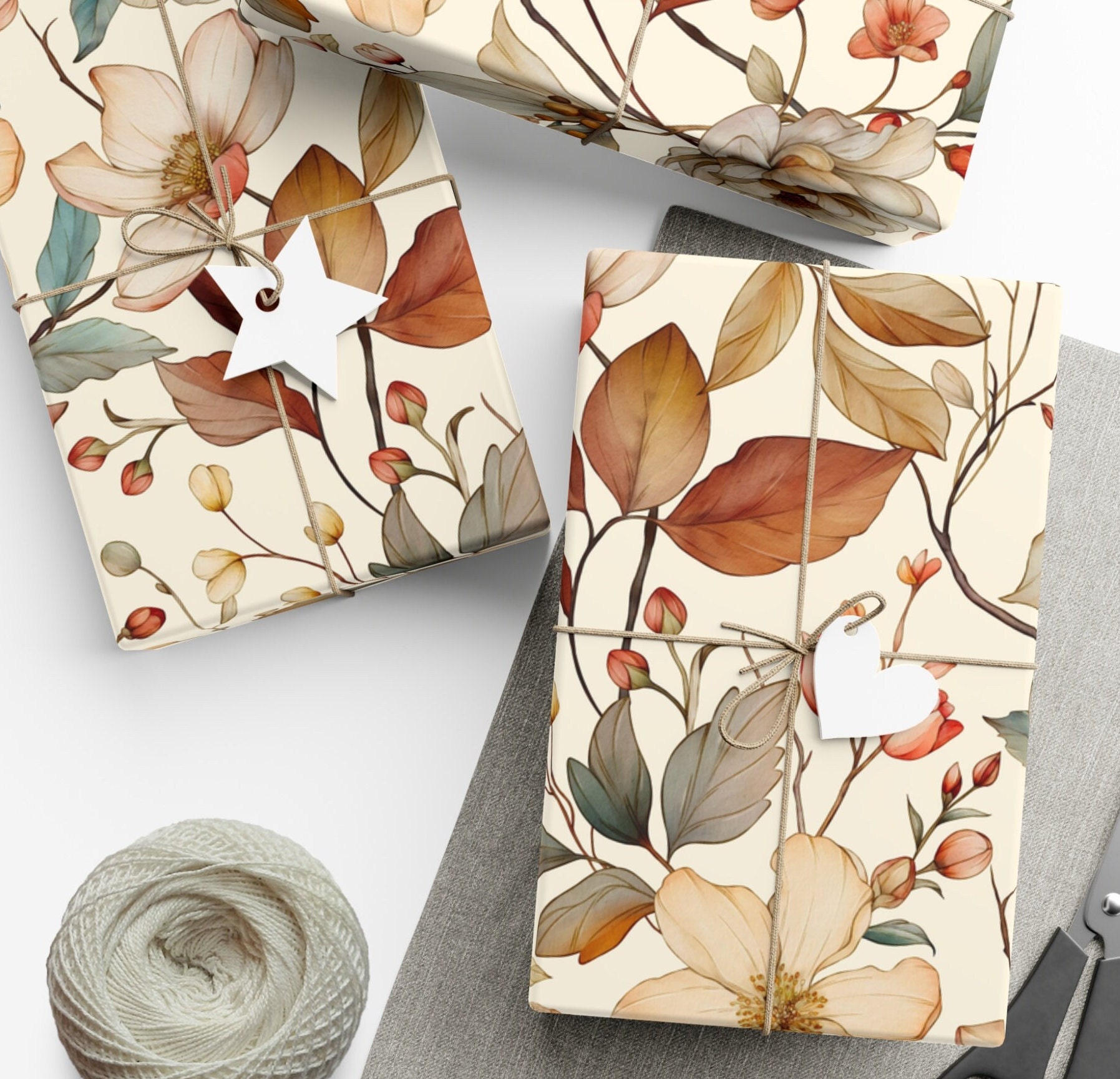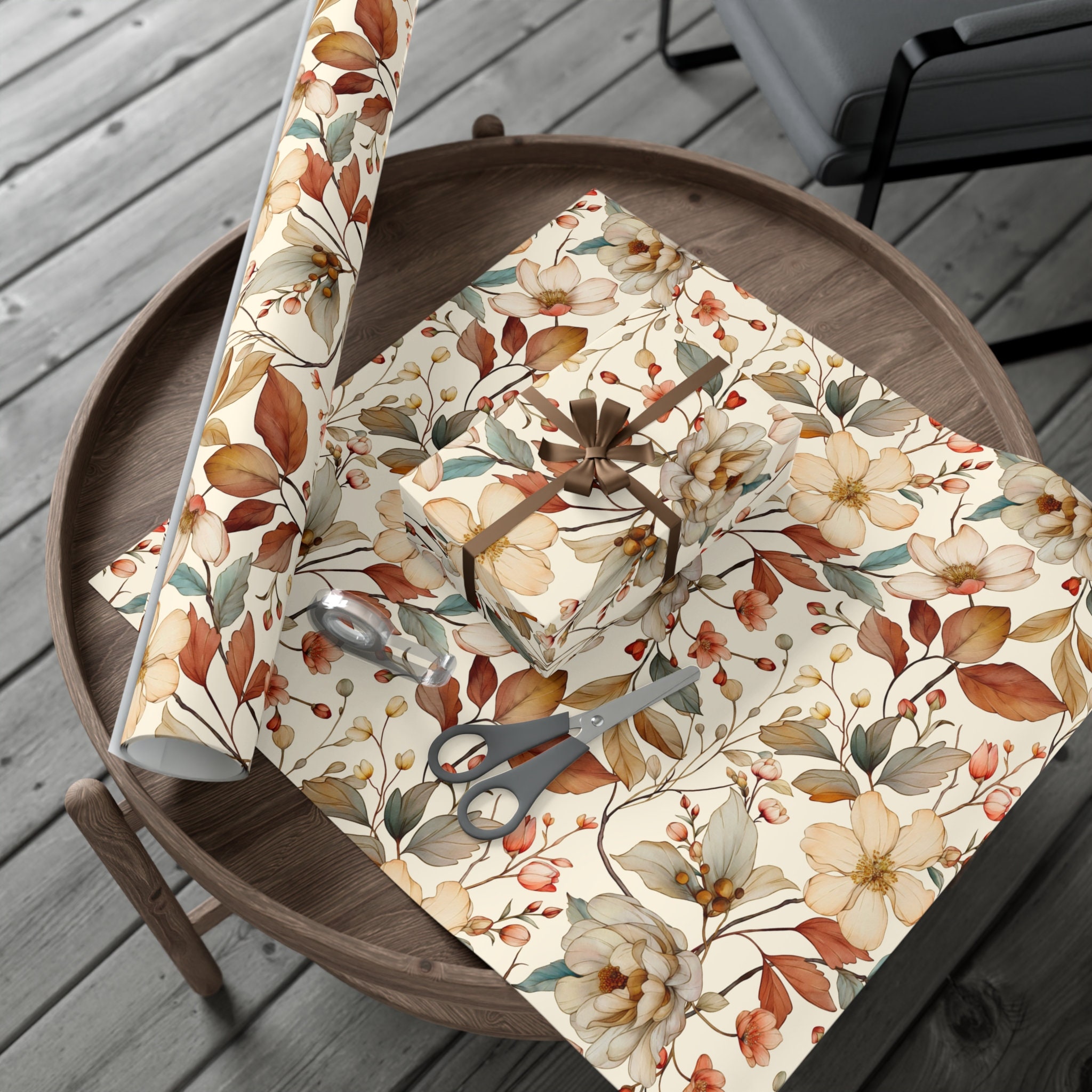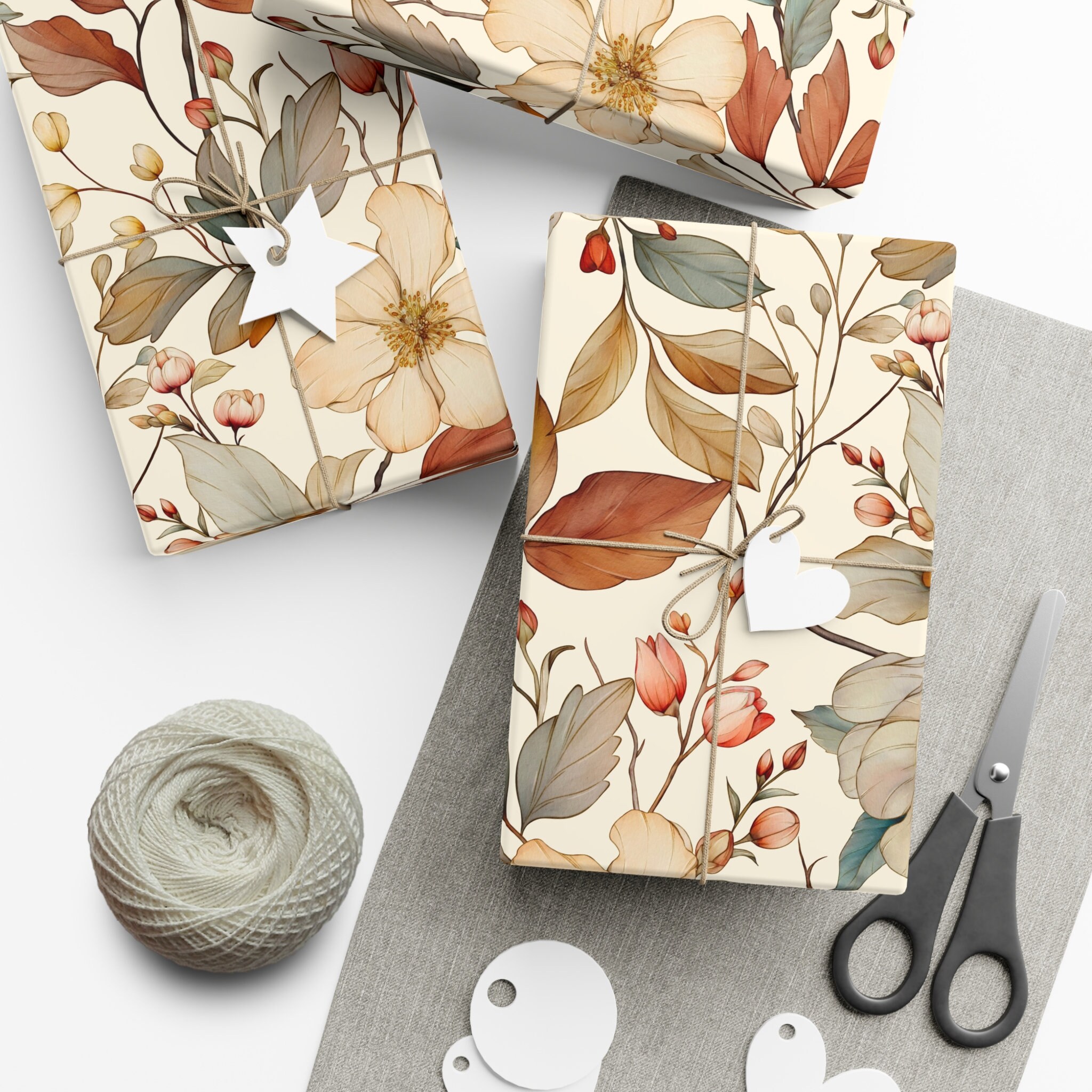 Beautiful Custom Wrapping Paper featuring floral and watercolor illustration and patterns of beautiful wildflowers, leaves and greenery. These cottagecore style flower designs in pink, sage, peach, cream, gold, and aqua.