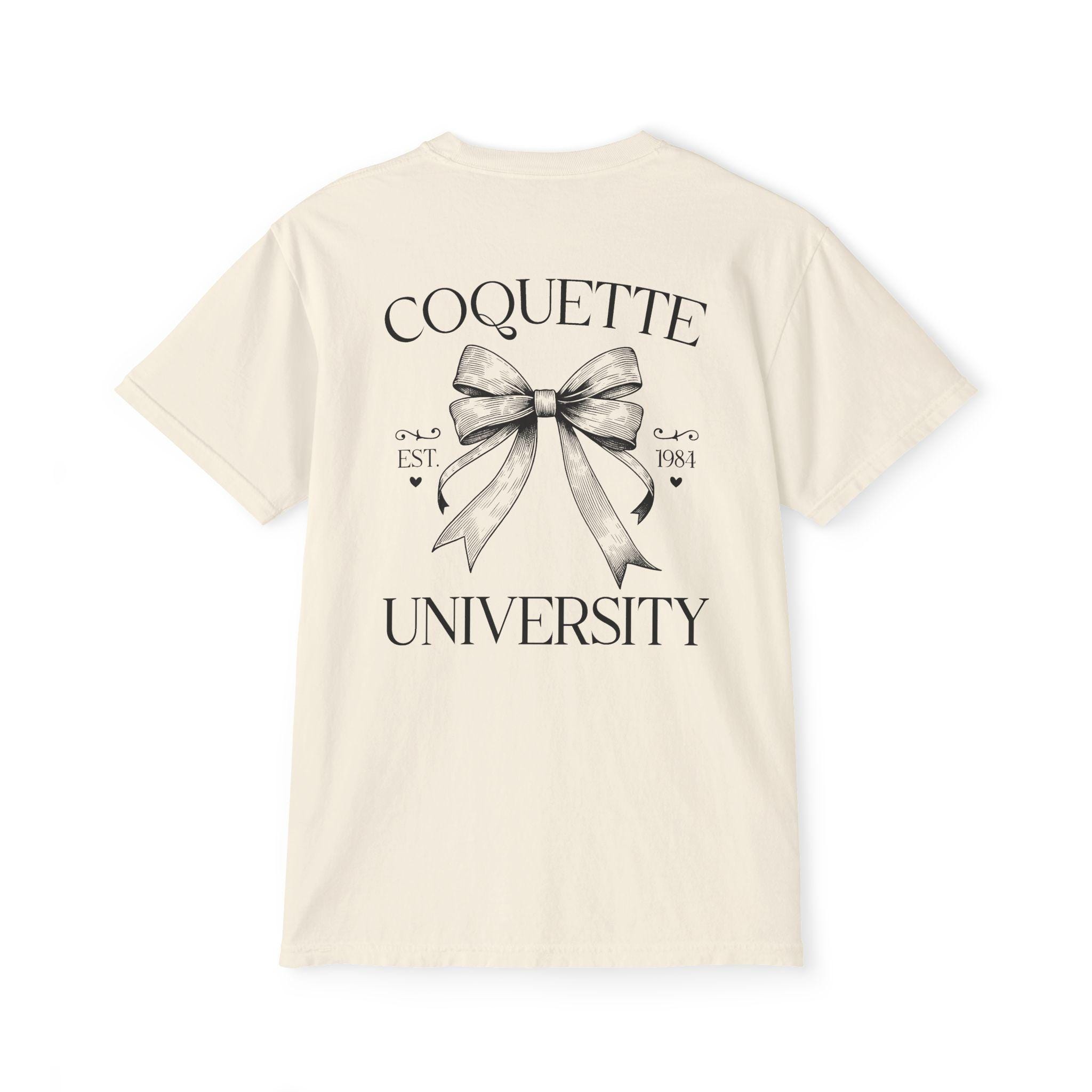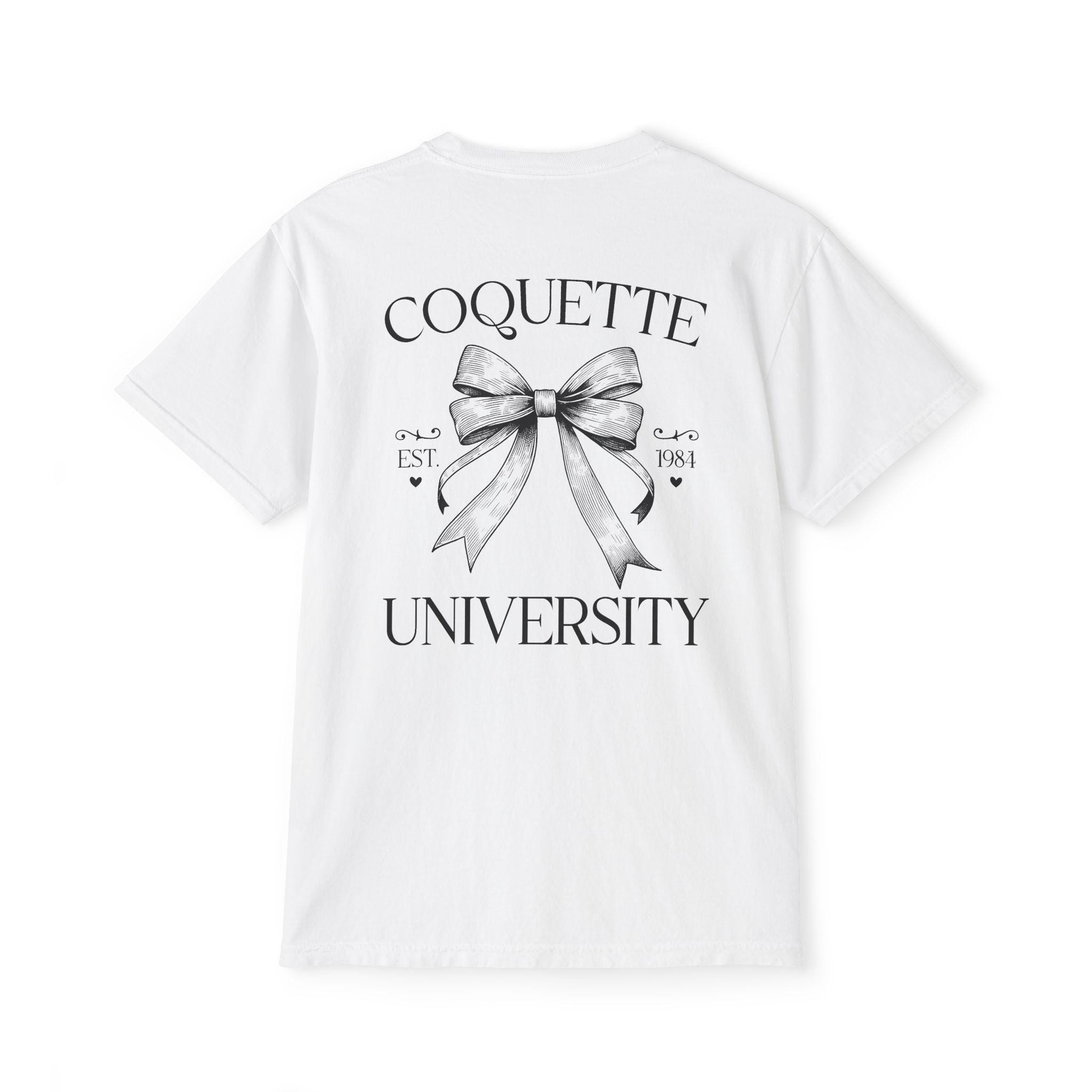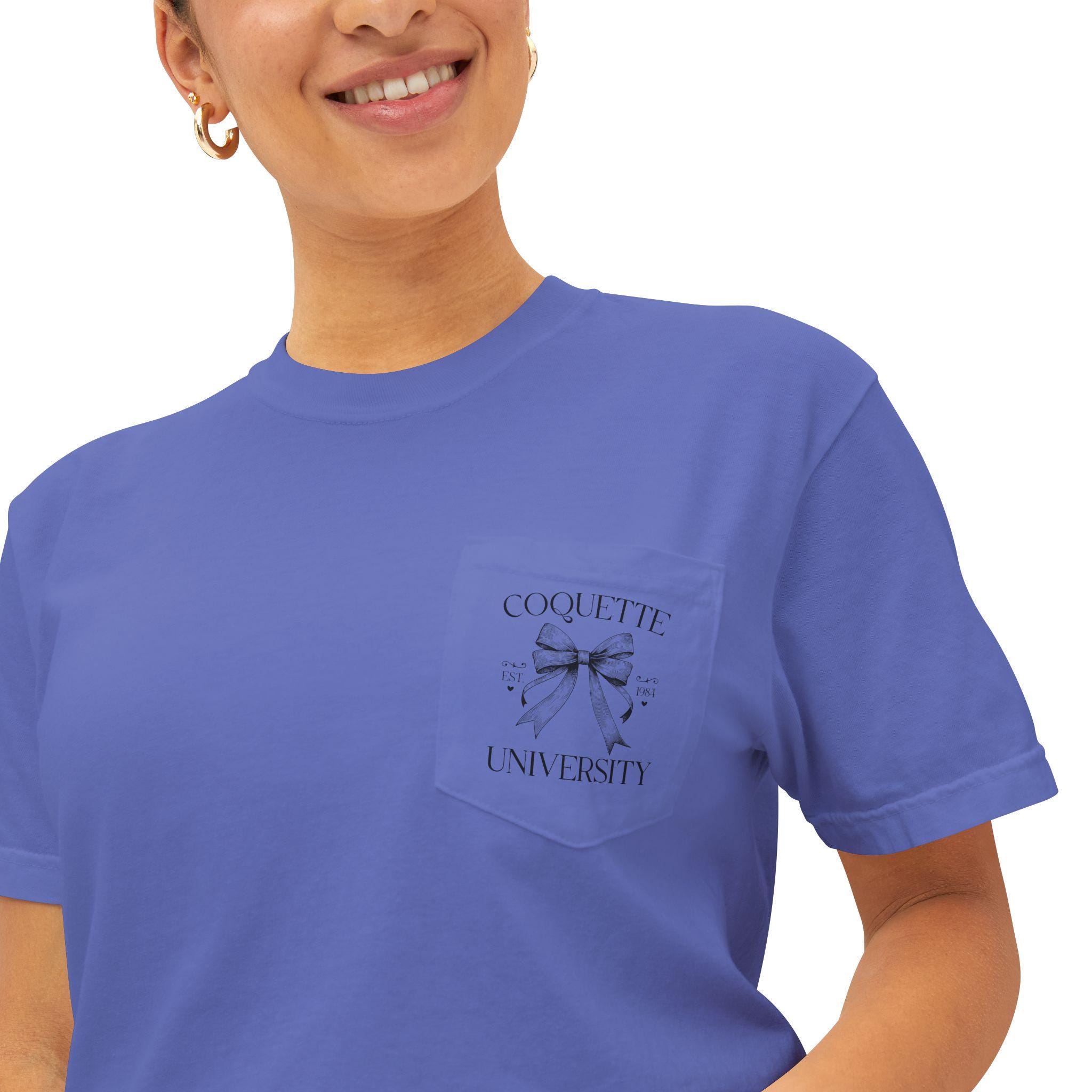 Coquette University Pocket and Back Design on Unisex Garment-Dyed Pocket T-Shirt, Trendy Coquette Bow shirt, Girly Girl Era Shirt