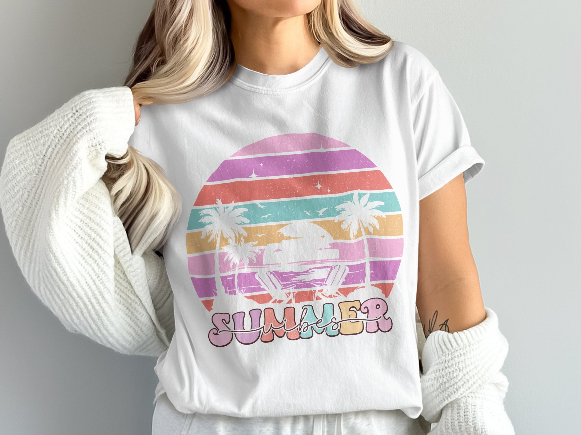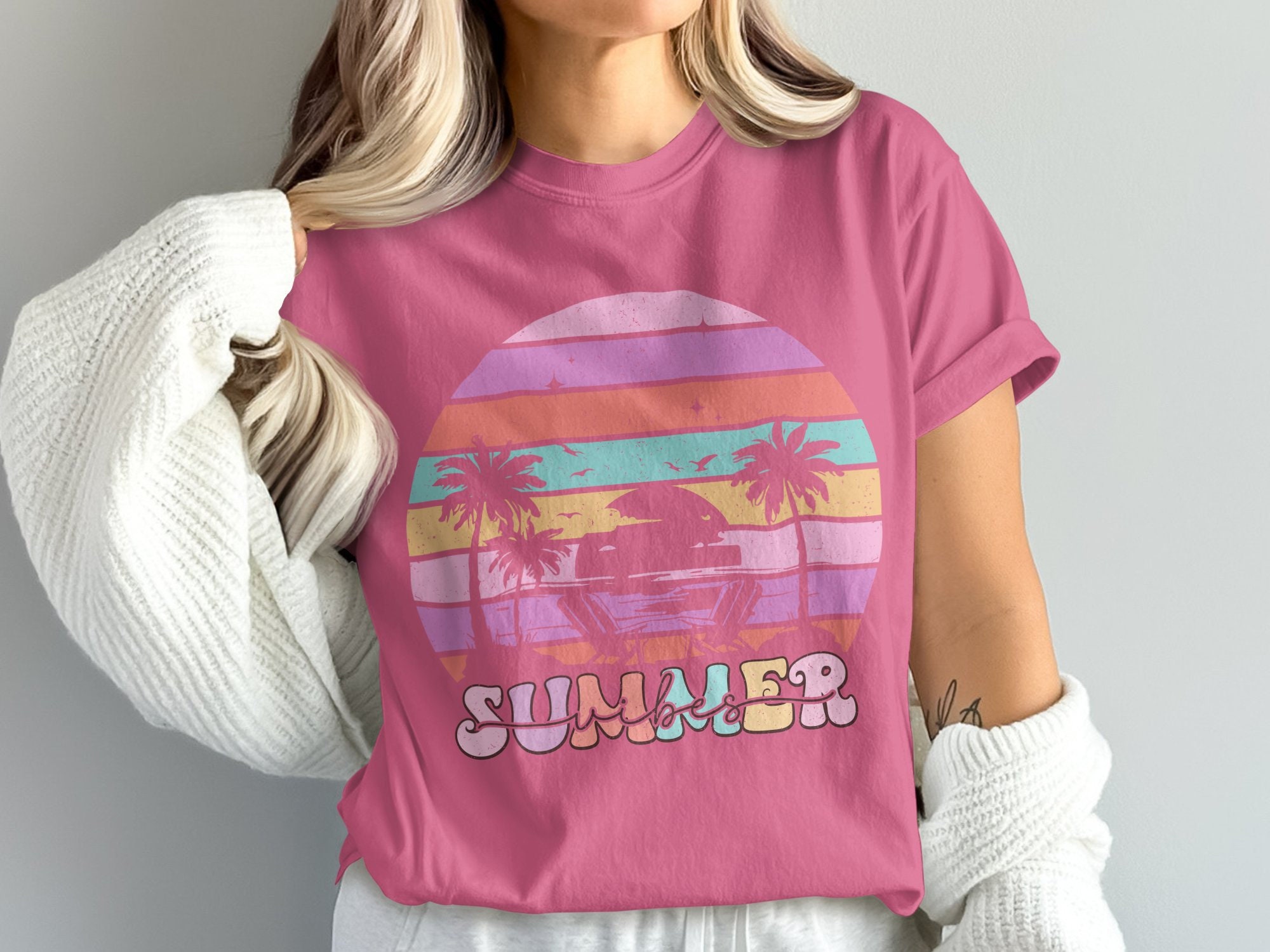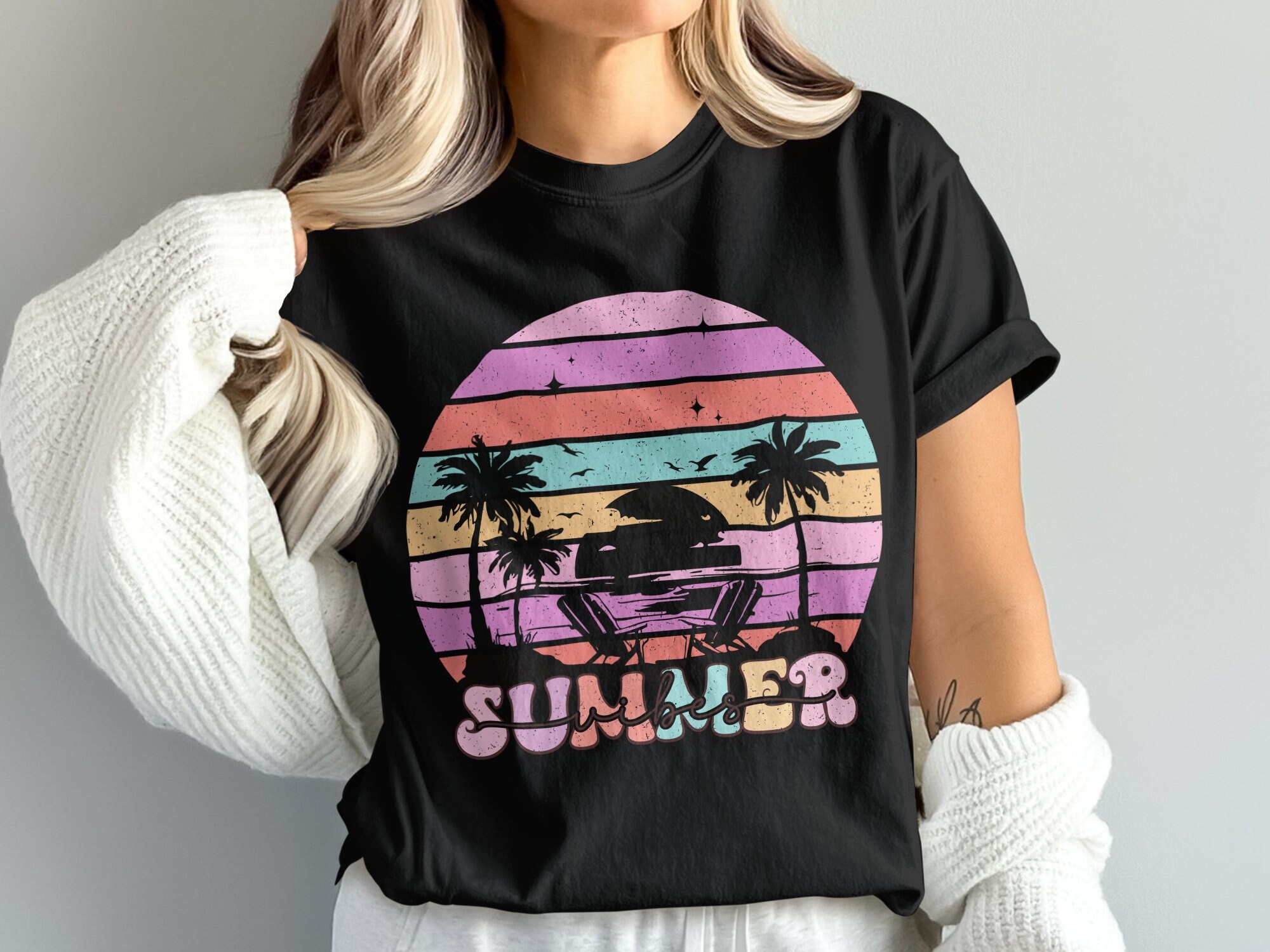 Step into summer with style! This vividly designed t-shirt captures the essence of summer fun with its retro sunset graphic featuring a beach chair and palm trees against a pastel backdrop. Made with high-quality materials, it's perfect for long days at the beach or casual outings. Embrace the season with a touch of nostalgia and vibrant colors that are sure to make you stand out.