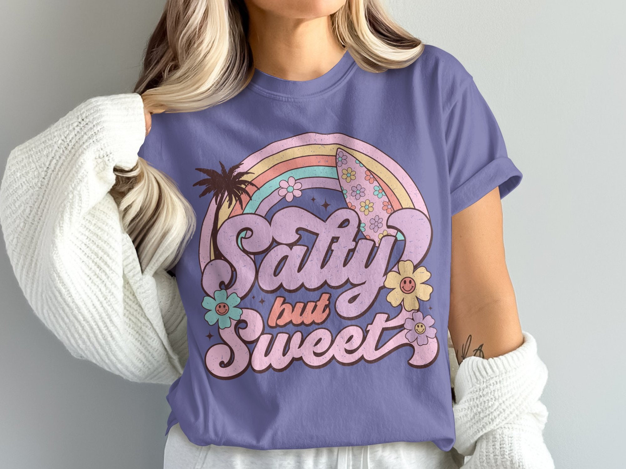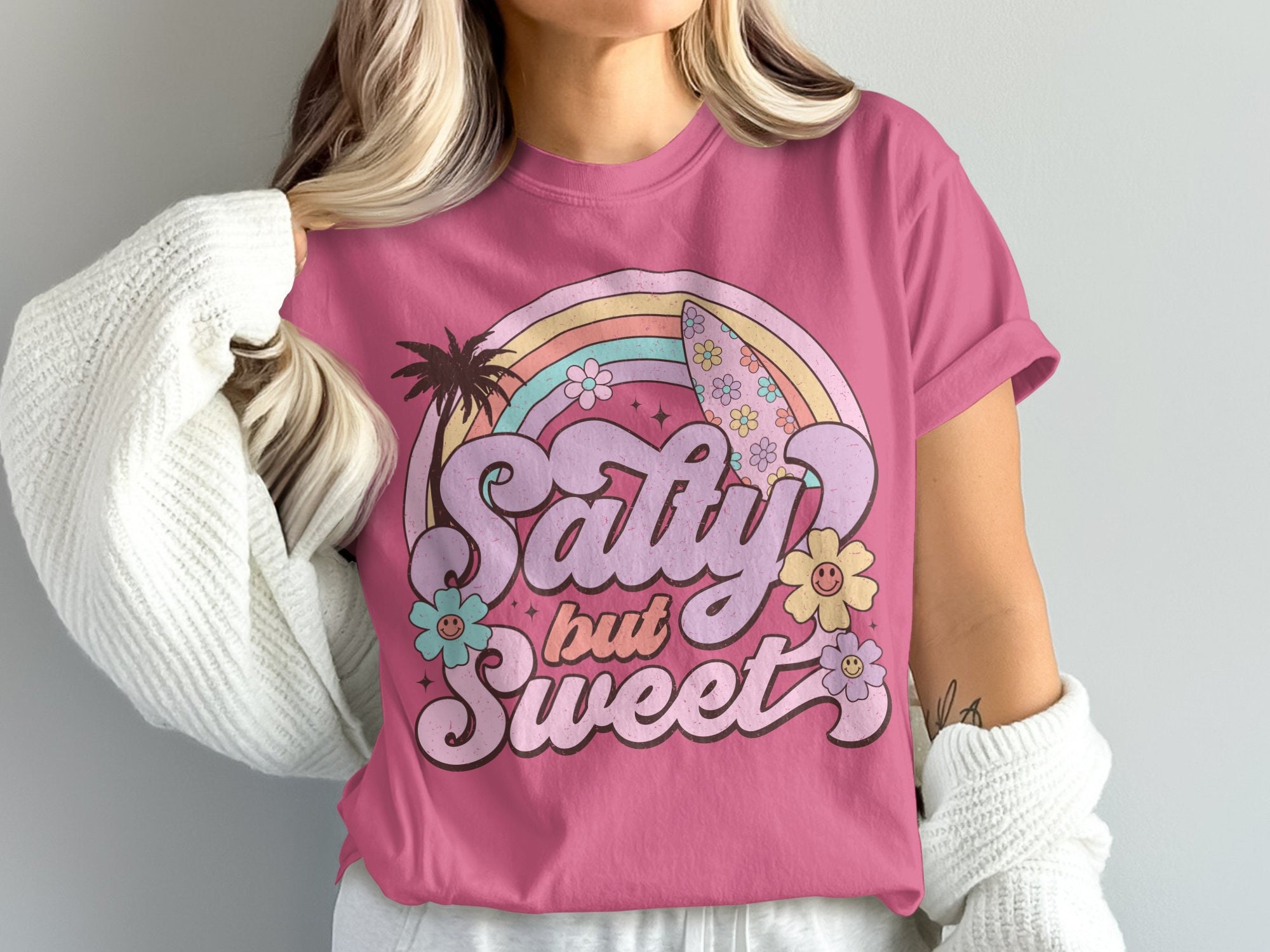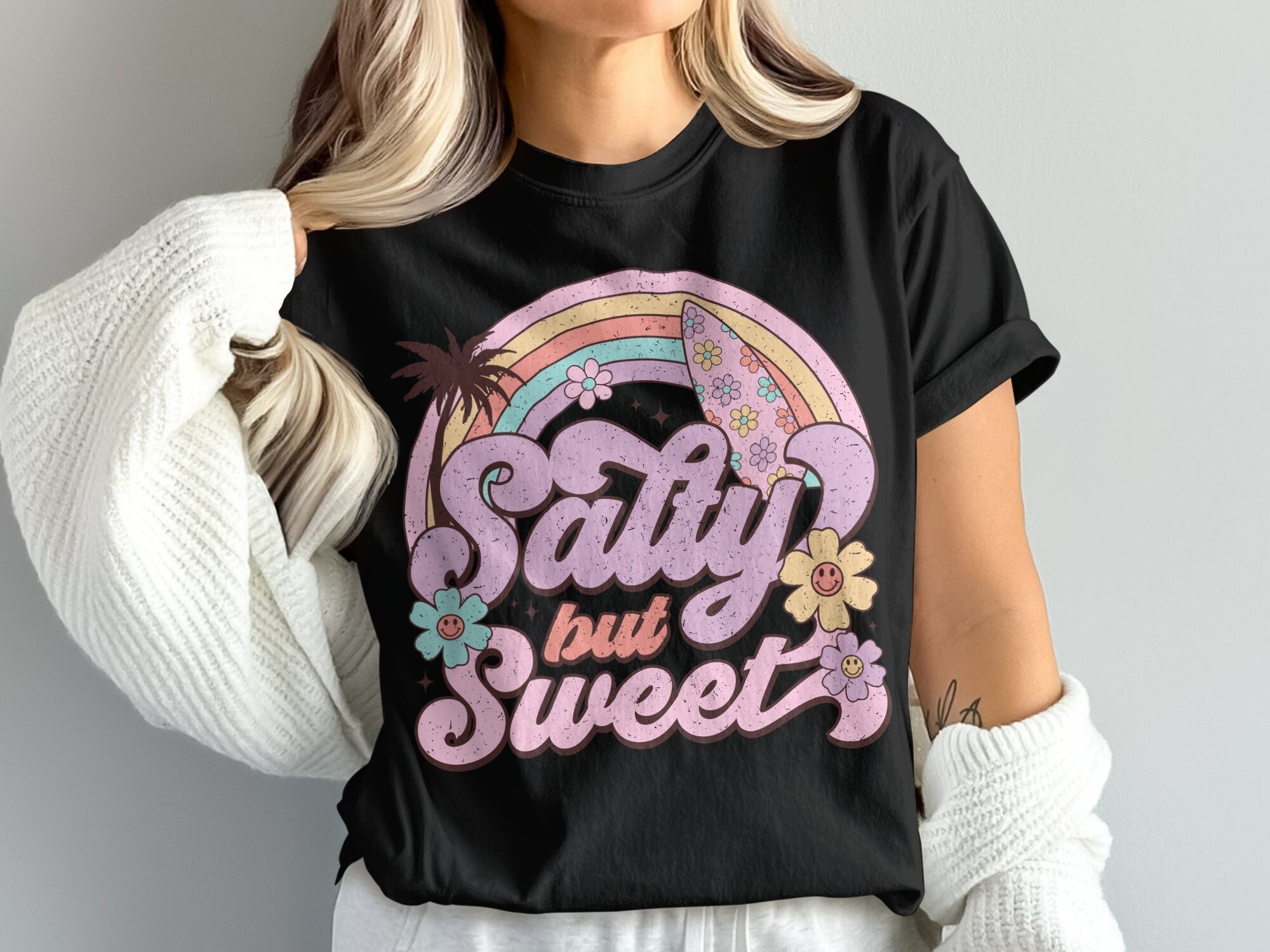 Embrace the summer vibes with our "Salty But Sweet" graphic T-shirt! Featuring a vintage-inspired rainbow with palm trees and cheerful florals, this top brings a touch of retro style to your wardrobe. Perfect for beach outings or casual days out, the soft material and vibrant print make it a comfortable and stylish choice. Available in various sizes to ensure a great fit for everyone.