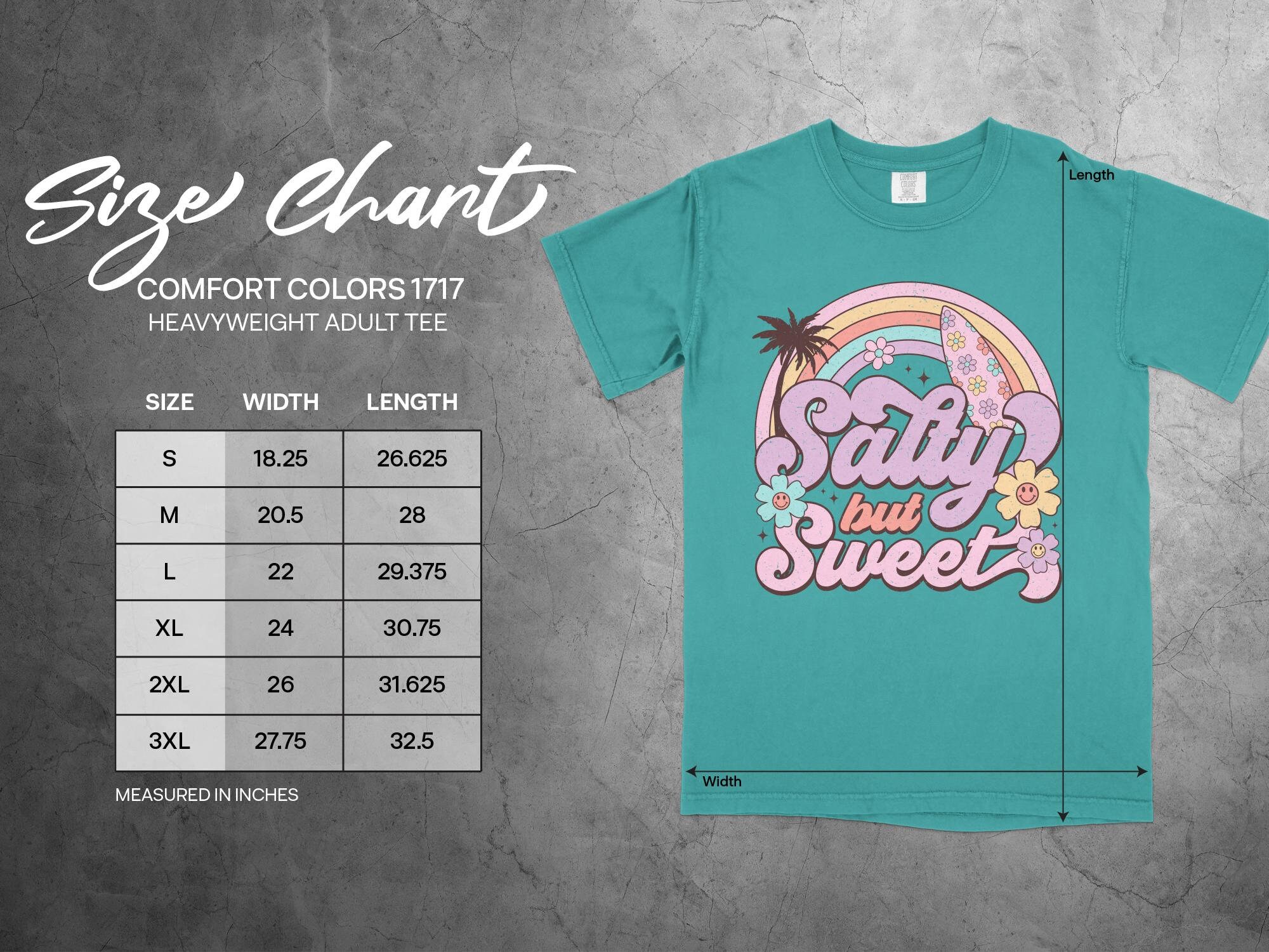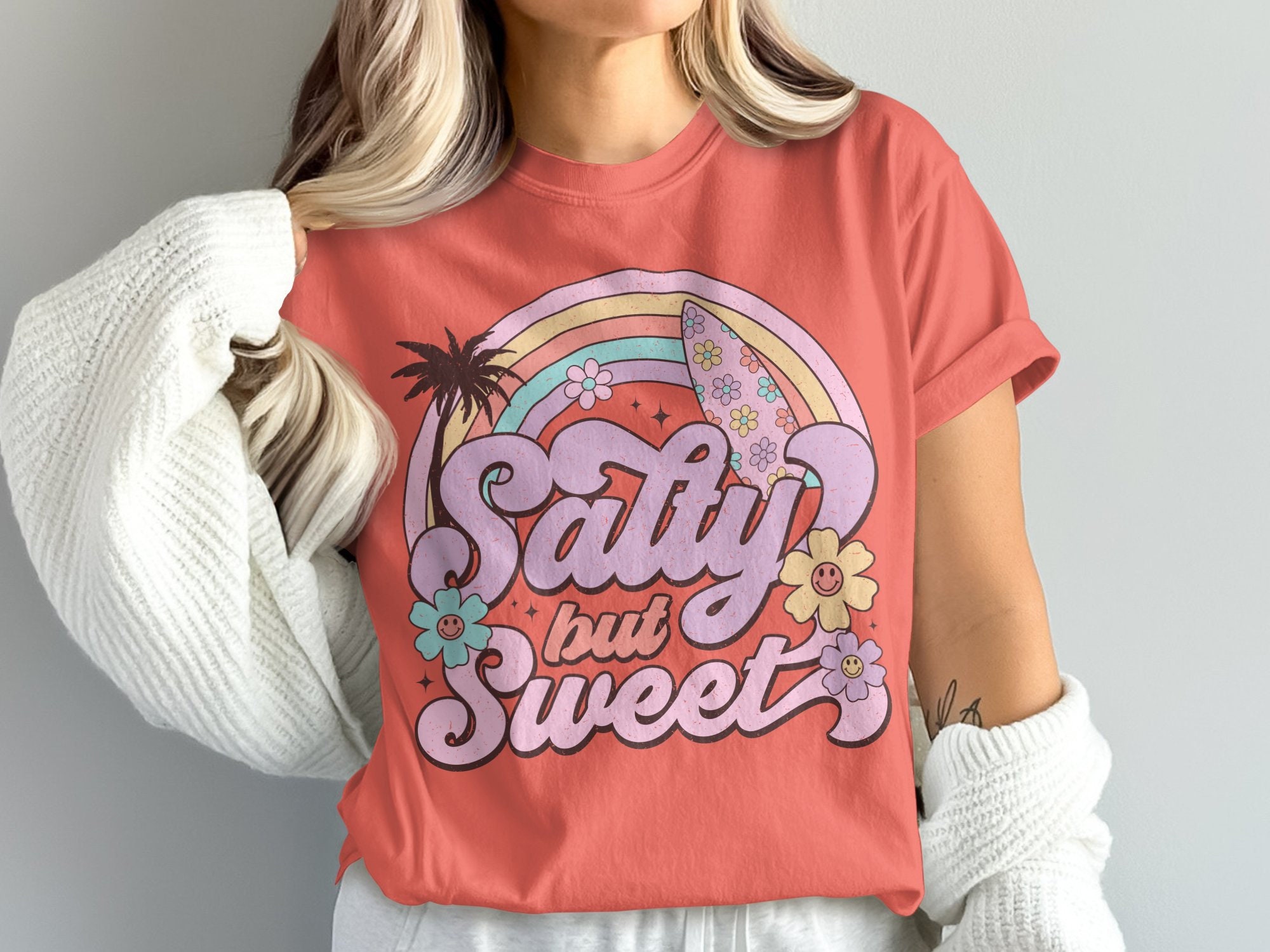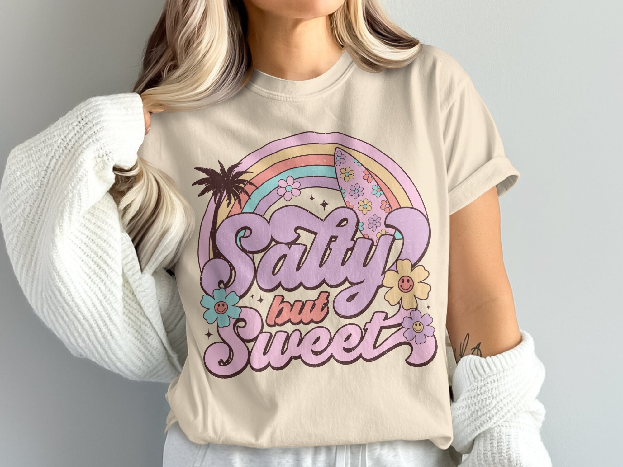 Embrace the summer vibes with our "Salty But Sweet" graphic T-shirt! Featuring a vintage-inspired rainbow with palm trees and cheerful florals, this top brings a touch of retro style to your wardrobe. Perfect for beach outings or casual days out, the soft material and vibrant print make it a comfortable and stylish choice. Available in various sizes to ensure a great fit for everyone.