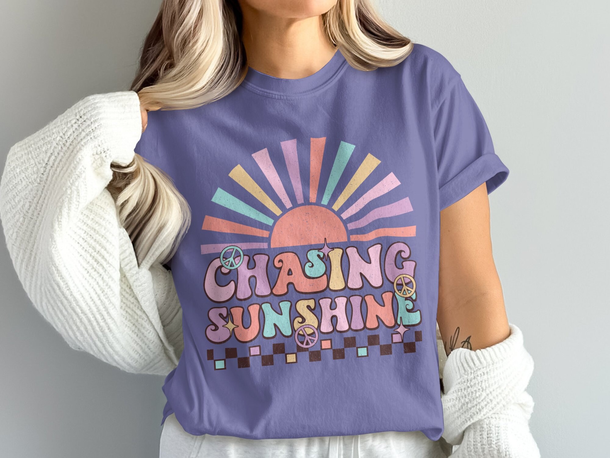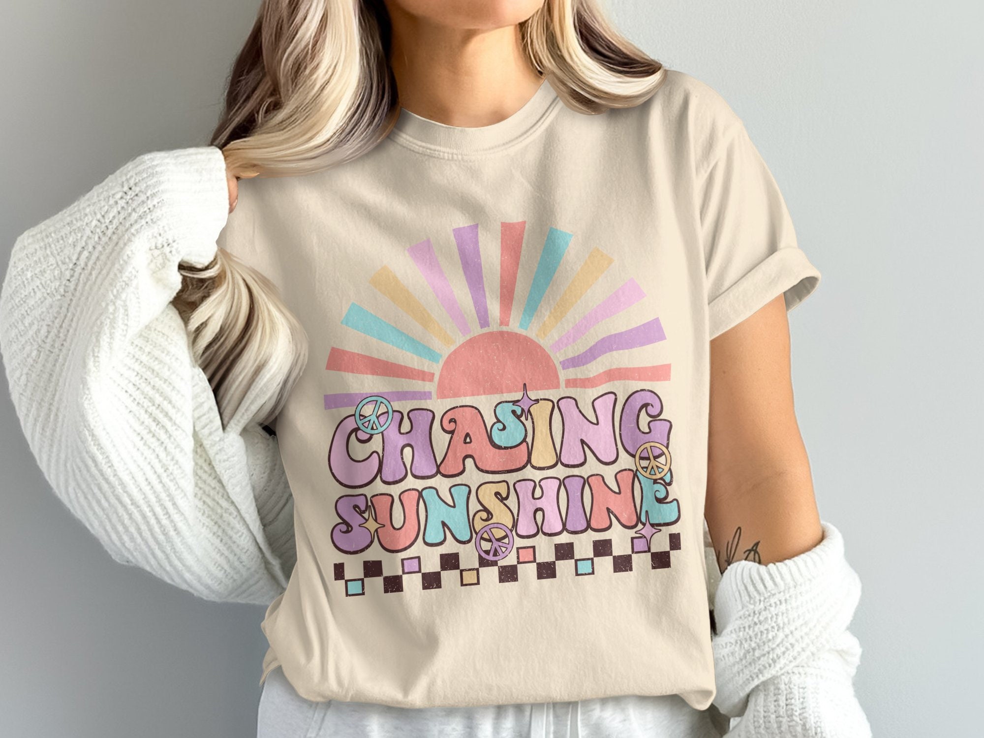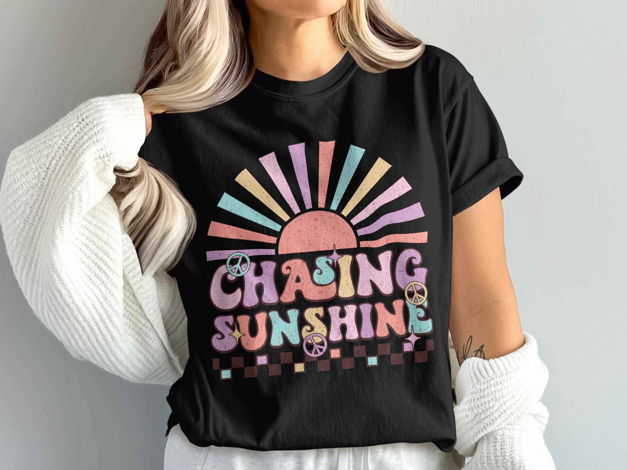 Embrace the vibes of summer with this vibrant "Chasing Sunshine" graphic tee! Featuring a retro-inspired design with a colorful sunburst and playful typography, this t-shirt perfectly captures the essence of lazy summer days. Crafted from soft, breathable material, it offers both comfort and style. Ideal for casual outings or as a funky gift for friends who love unique vintage-style clothing.