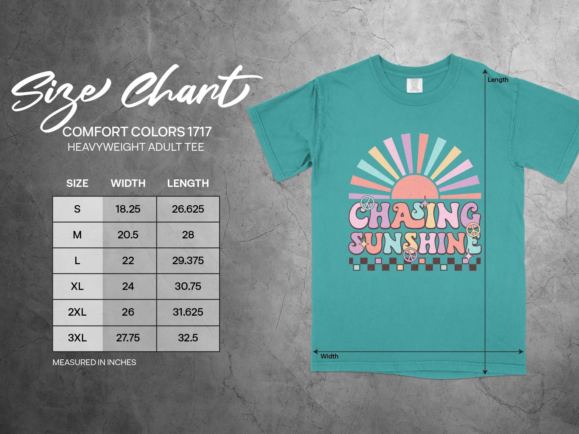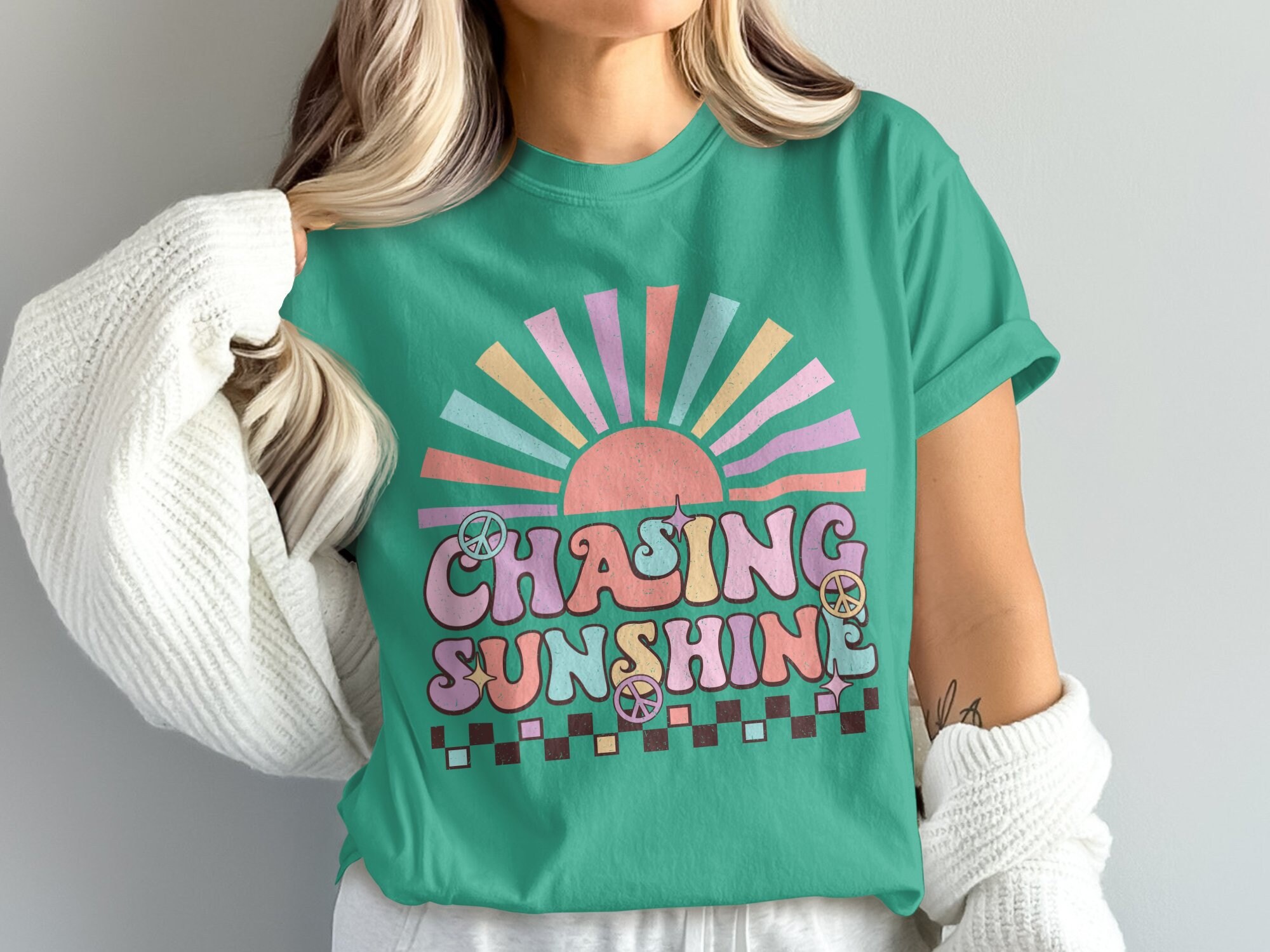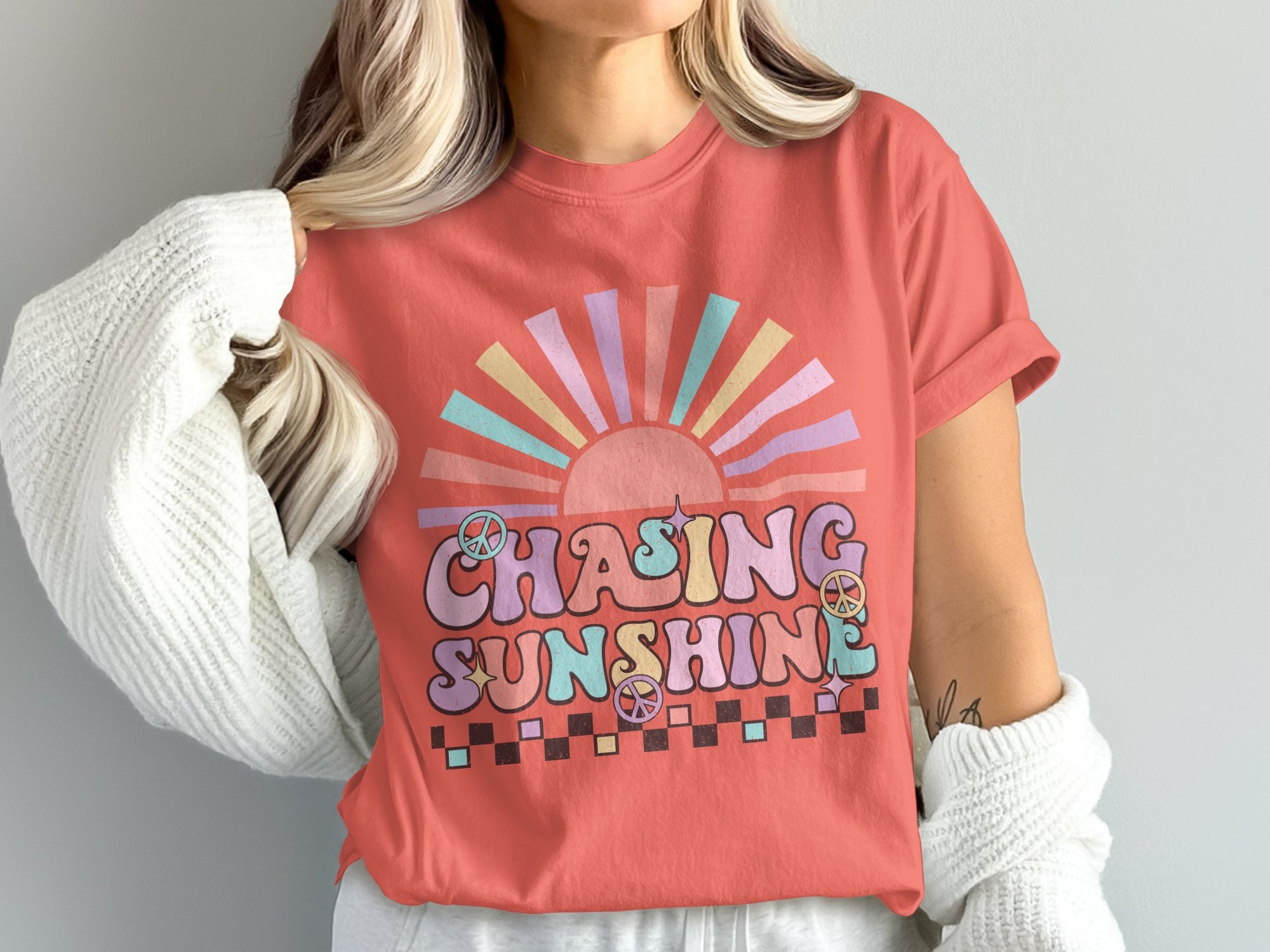 Embrace the vibes of summer with this vibrant "Chasing Sunshine" graphic tee! Featuring a retro-inspired design with a colorful sunburst and playful typography, this t-shirt perfectly captures the essence of lazy summer days. Crafted from soft, breathable material, it offers both comfort and style. Ideal for casual outings or as a funky gift for friends who love unique vintage-style clothing.