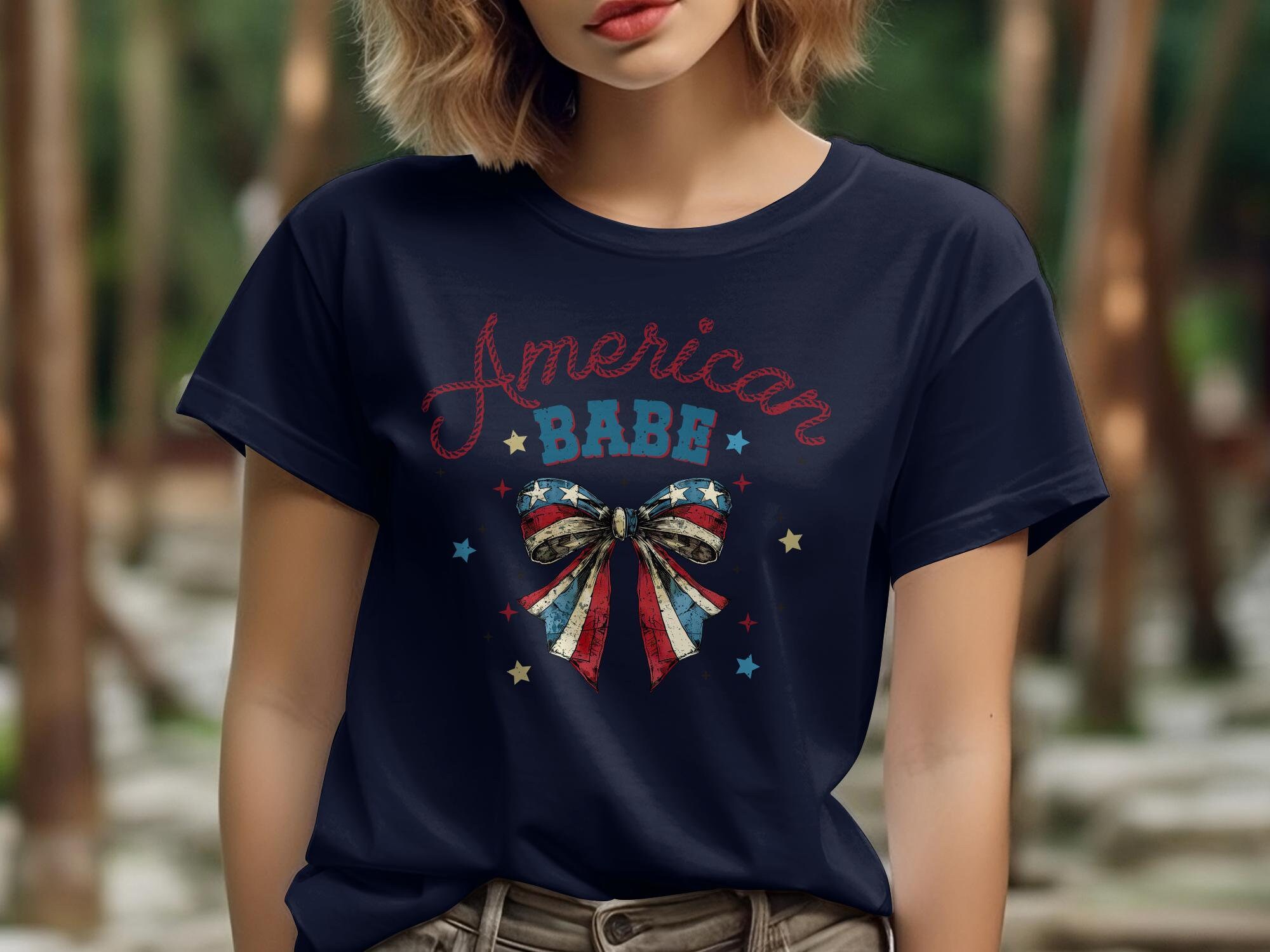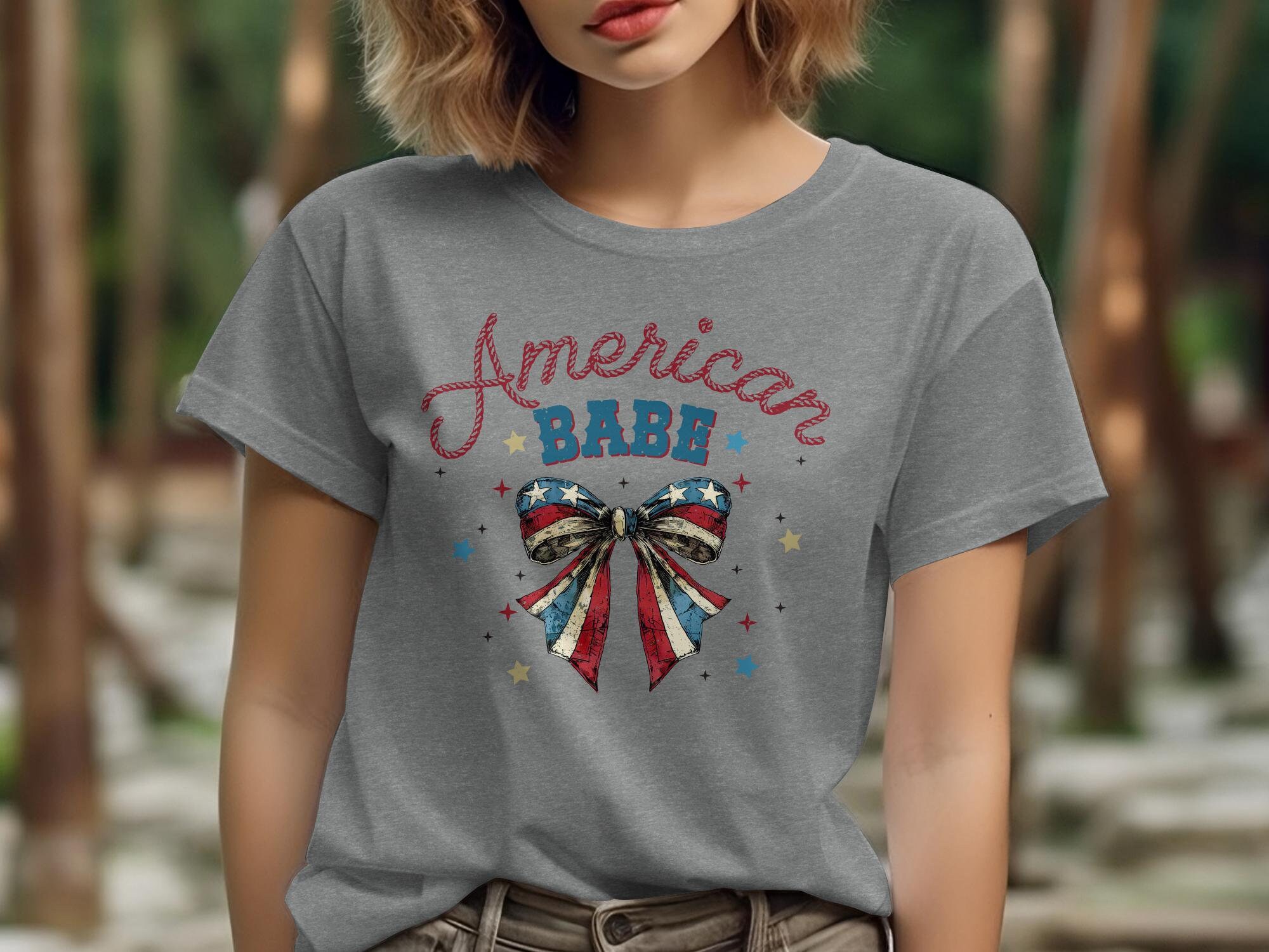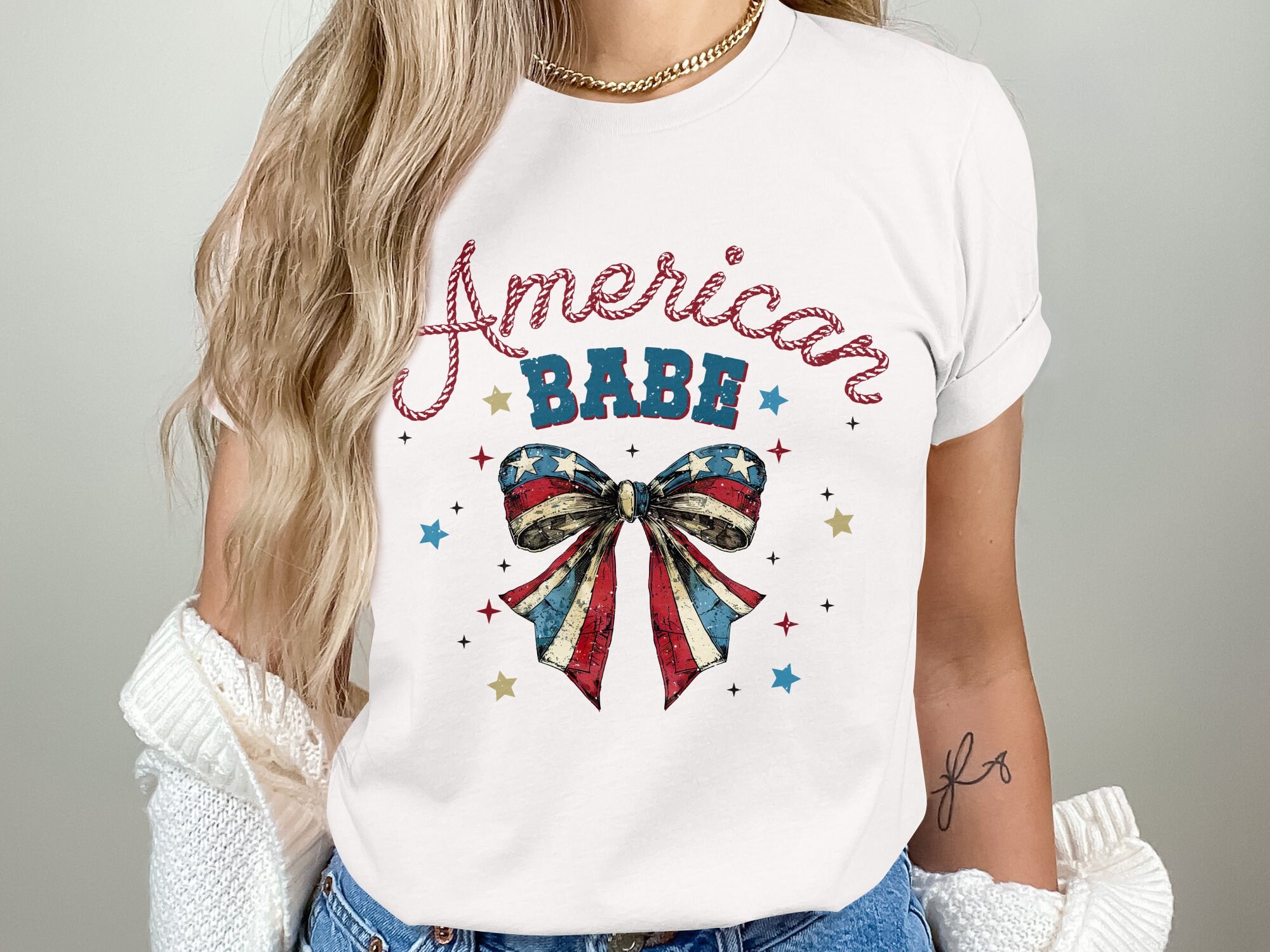 Celebrate your patriotic spirit with this eye-catching "American Babe" T-shirt! Featuring a distressed American flag bow design, this vintage-inspired tee is perfect for 4th of July celebrations or any casual outing. Made from soft, breathable fabric, it offers superb comfort and longevity. Show off your USA pride stylishly with this must-have addition to your wardrobe!