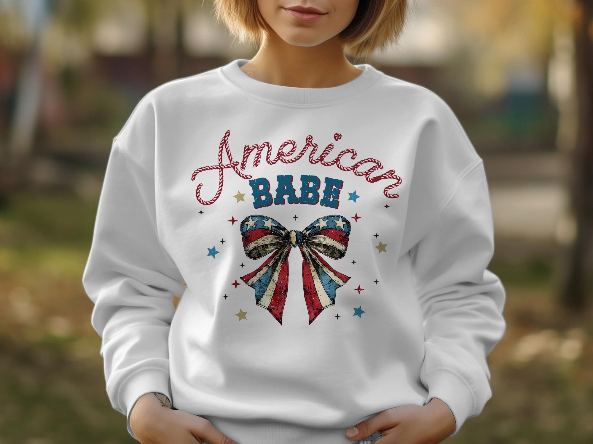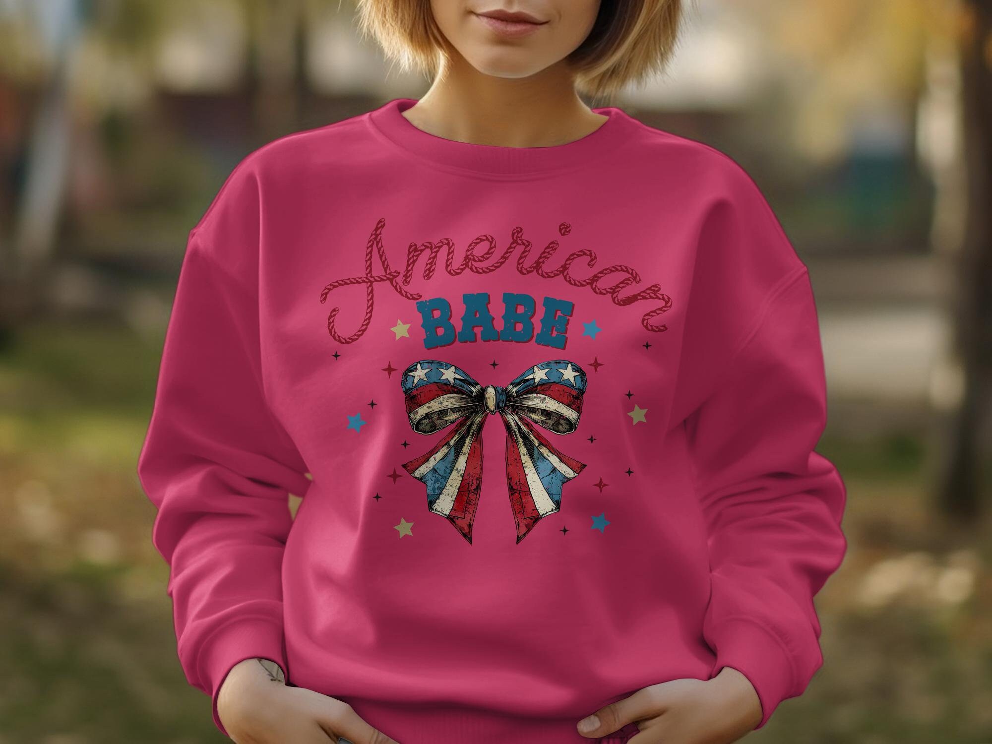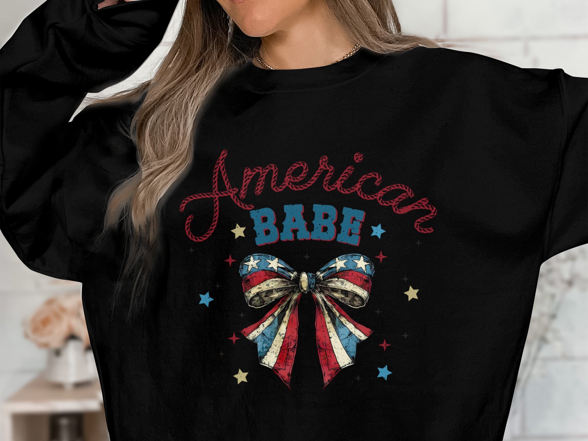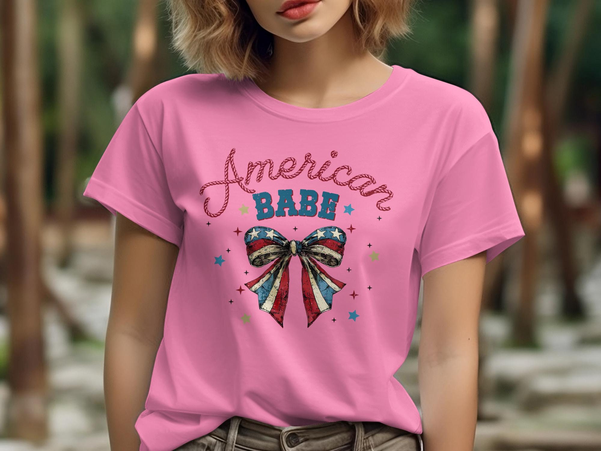 Celebrate your patriotic spirit with this eye-catching "American Babe" T-shirt! Featuring a distressed American flag bow design, this vintage-inspired tee is perfect for 4th of July celebrations or any casual outing. Made from soft, breathable fabric, it offers superb comfort and longevity. Show off your USA pride stylishly with this must-have addition to your wardrobe!