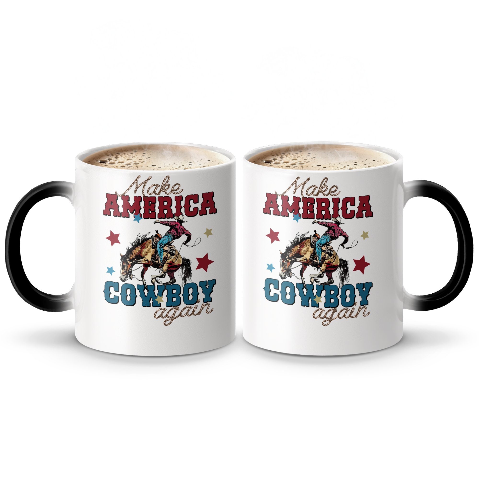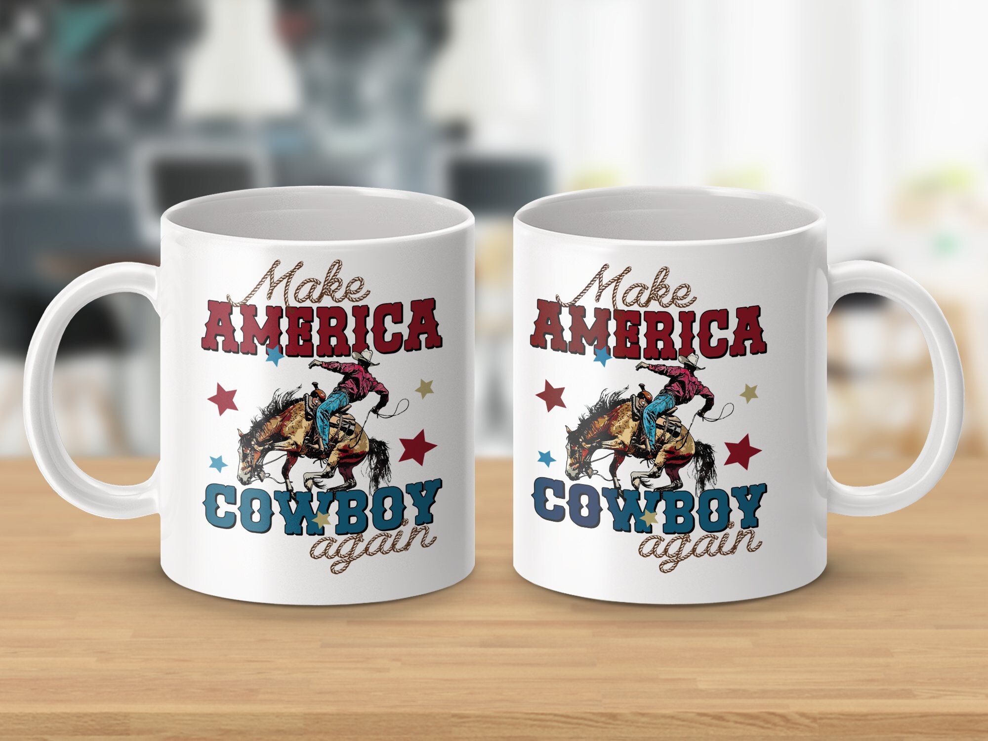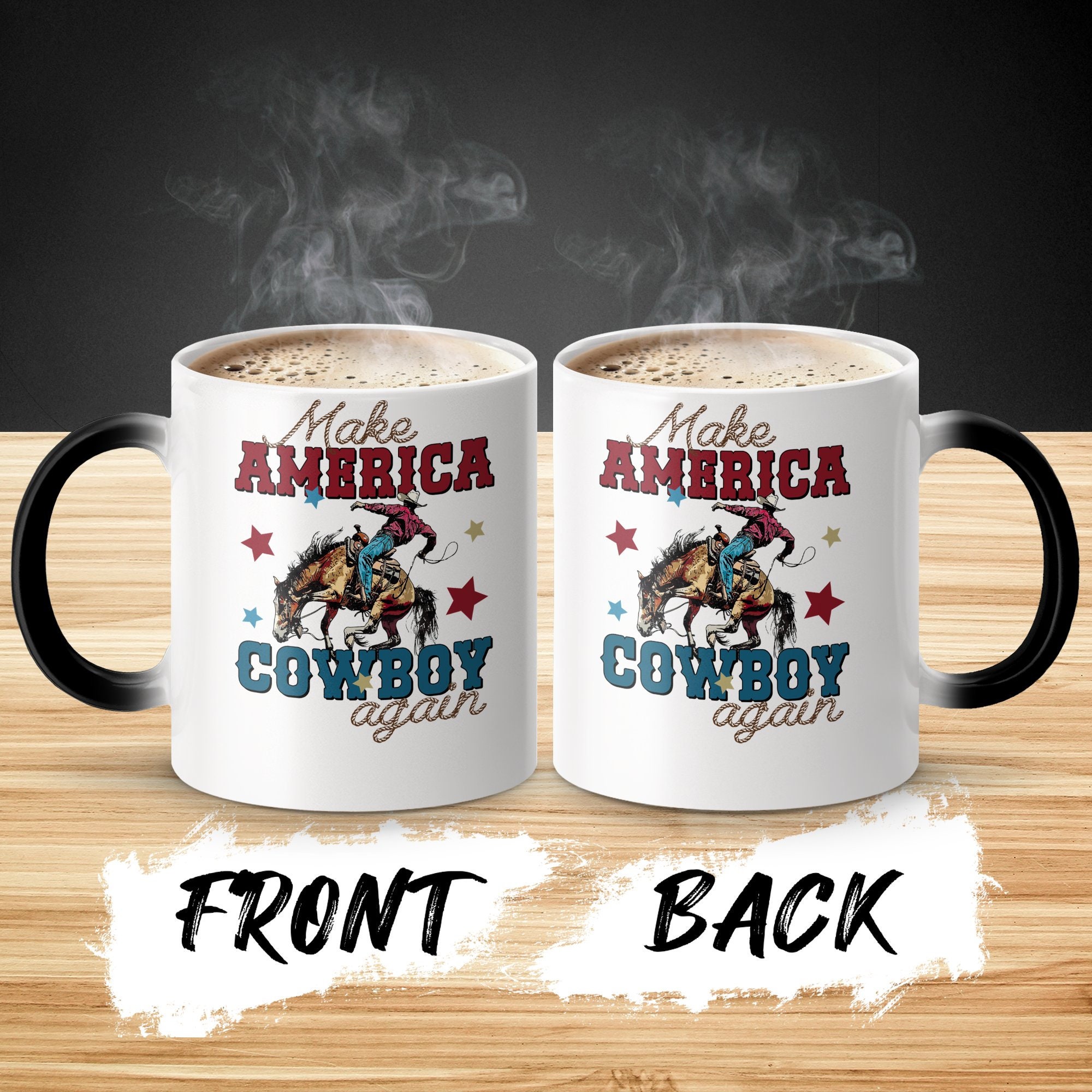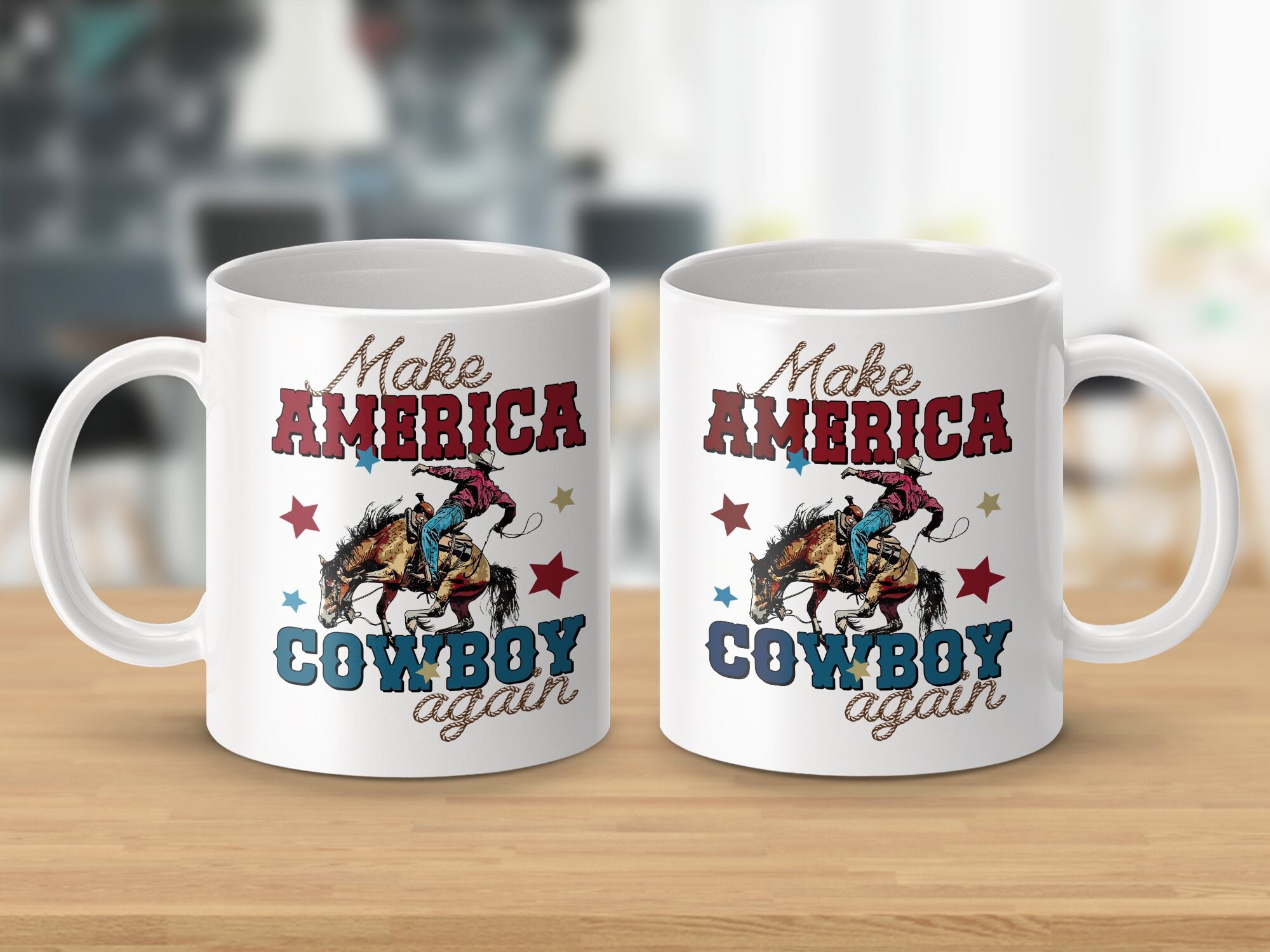 Embrace your love for the wild west and show off your patriotic spirit with our unique "Make America Cowboy Again" coffee mug. This high-quality mug features a vibrant and detailed graphic of a cowboy riding a horse, adorned with stars and a bold, eye-catching slogan. Perfect for your morning coffee, this mug is both microwave and dishwasher safe, making it as functional as it is stylish. Whether you're gearing up for a day at the rodeo or just relaxing at home, this mug is sure to add a touch of cowboy charm to your day.