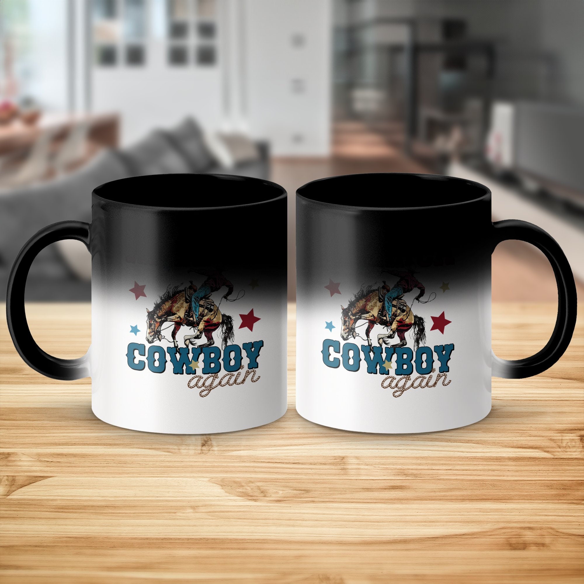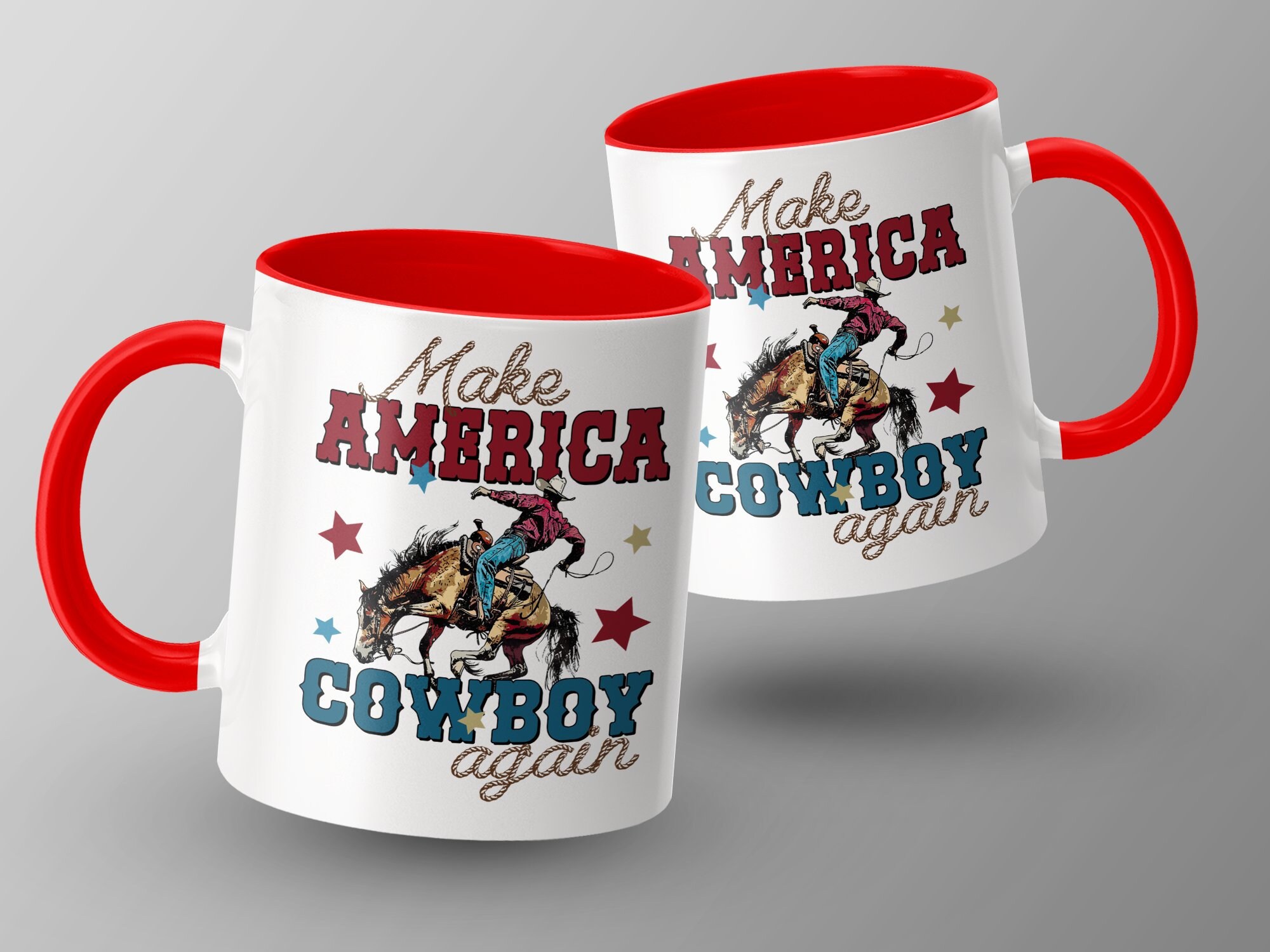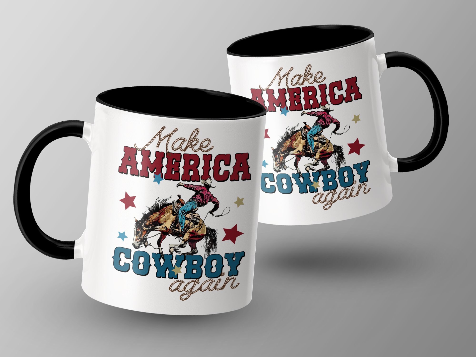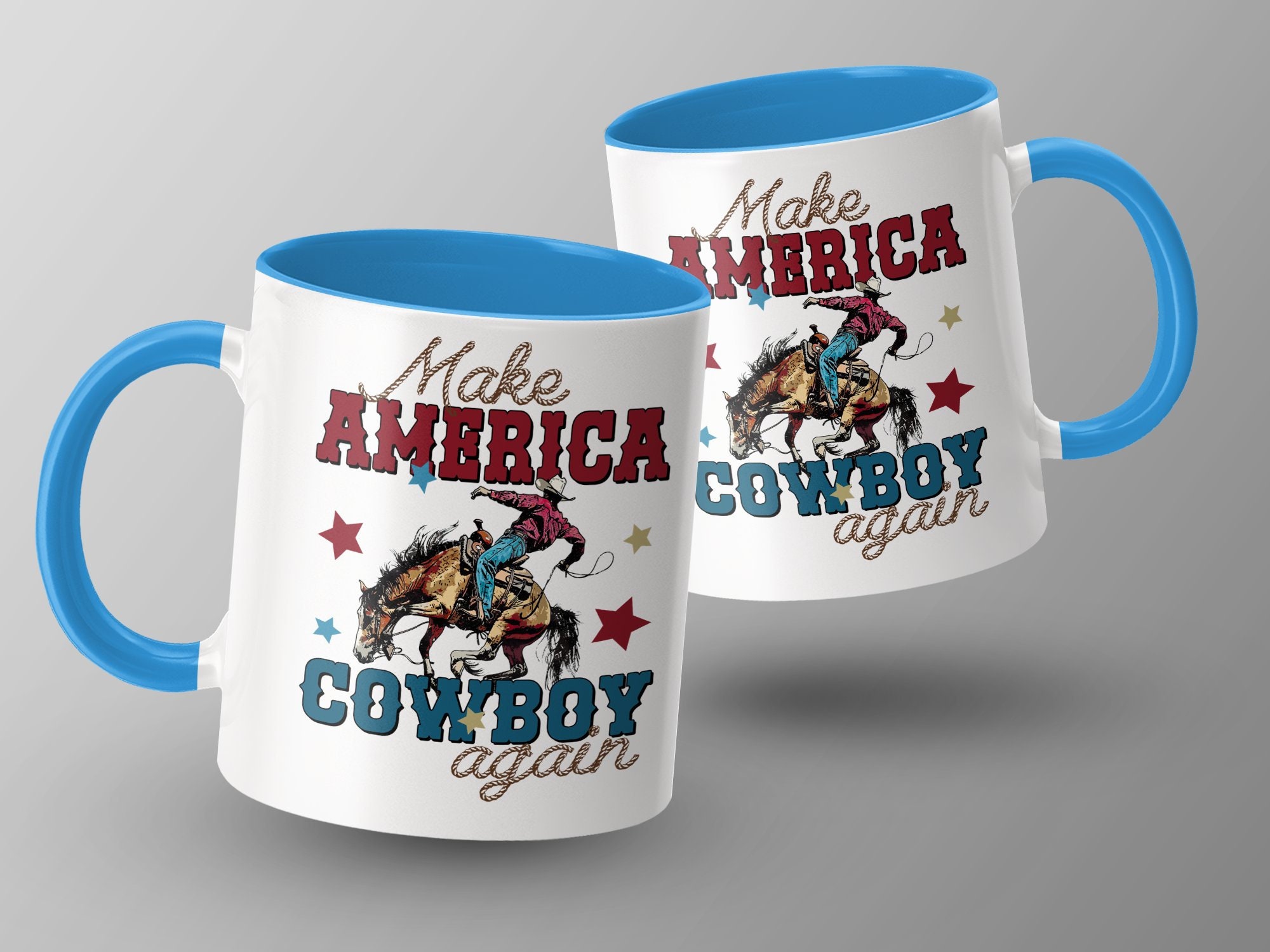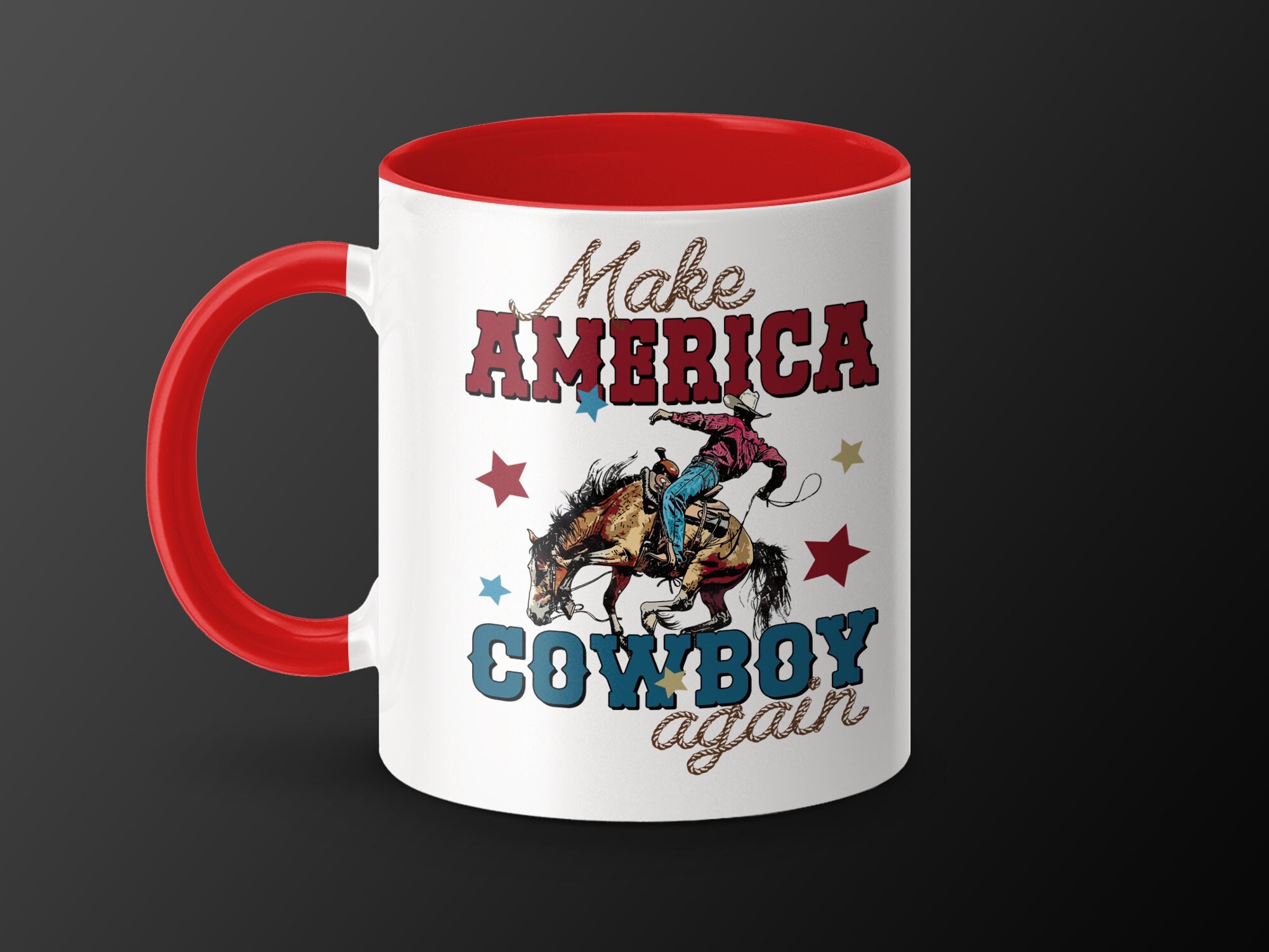 Embrace your love for the wild west and show off your patriotic spirit with our unique "Make America Cowboy Again" coffee mug. This high-quality mug features a vibrant and detailed graphic of a cowboy riding a horse, adorned with stars and a bold, eye-catching slogan. Perfect for your morning coffee, this mug is both microwave and dishwasher safe, making it as functional as it is stylish. Whether you're gearing up for a day at the rodeo or just relaxing at home, this mug is sure to add a touch of cowboy charm to your day.