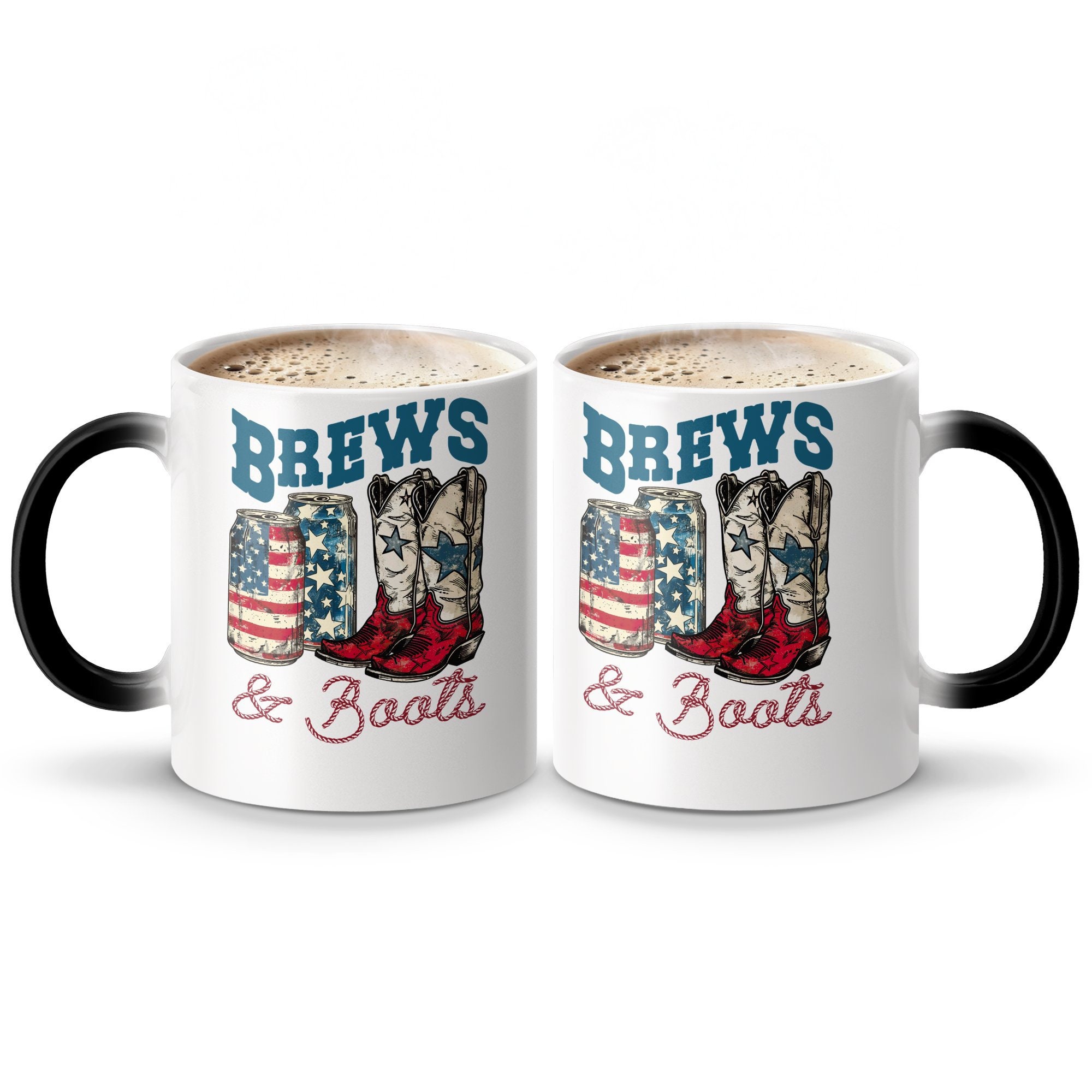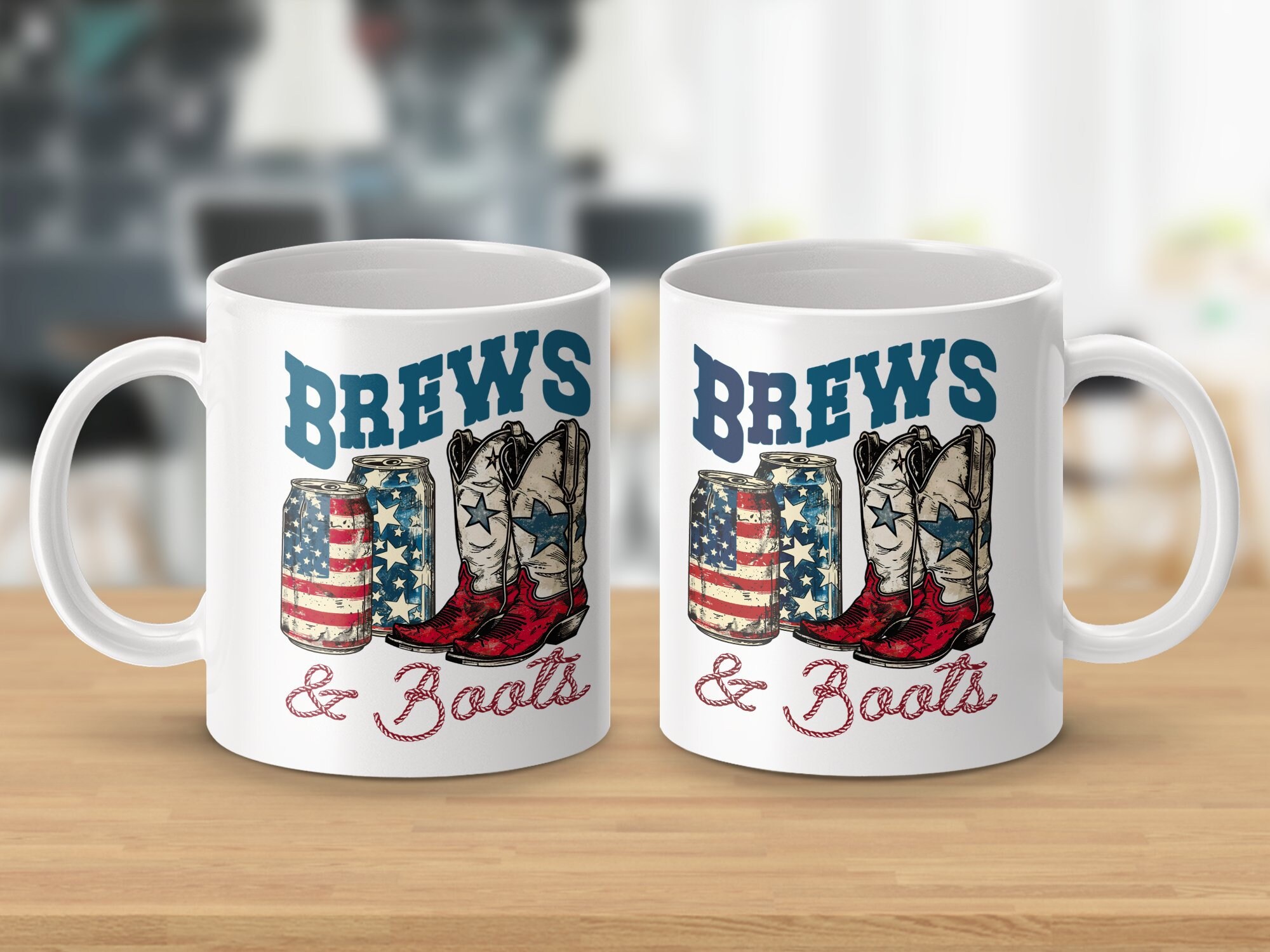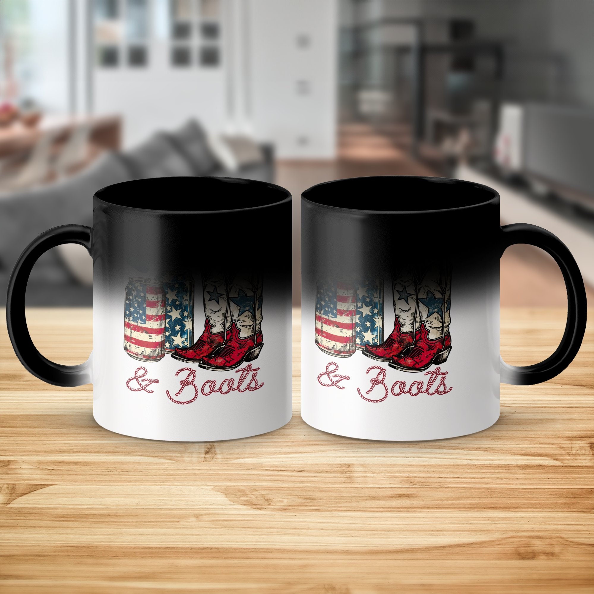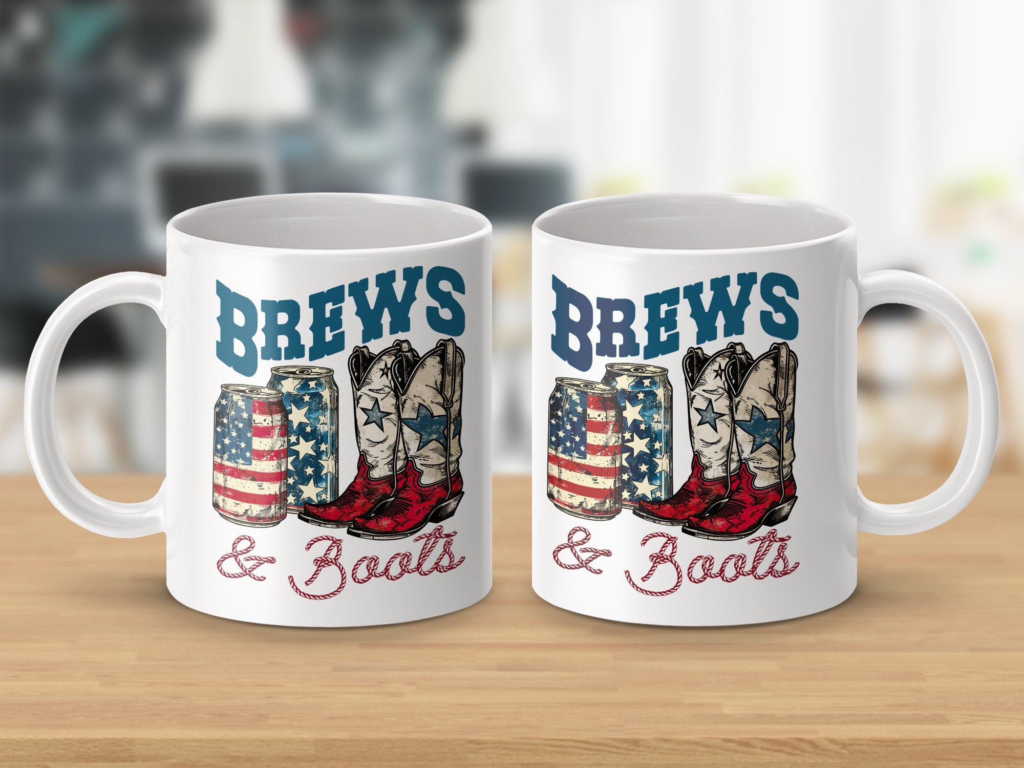 Enjoy your morning coffee with a touch of American spirit! This mug features a distinctive design with cowboy boots and beer cans, both adorned with the American flag colors and vintage flair. Perfect for Independence Day or as a special gift for the patriot in your life. Made from high-quality ceramic, it's dishwasher and microwave safe, ensuring durability and easy use.