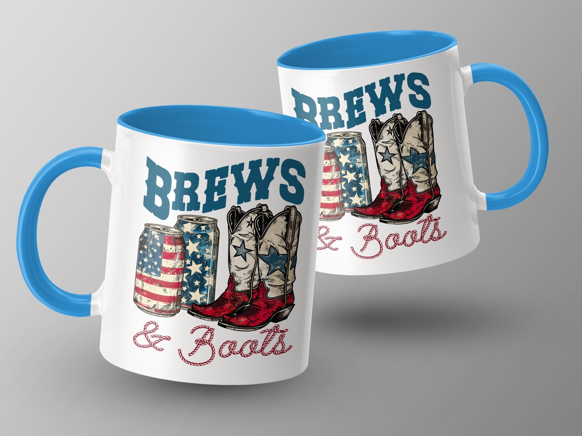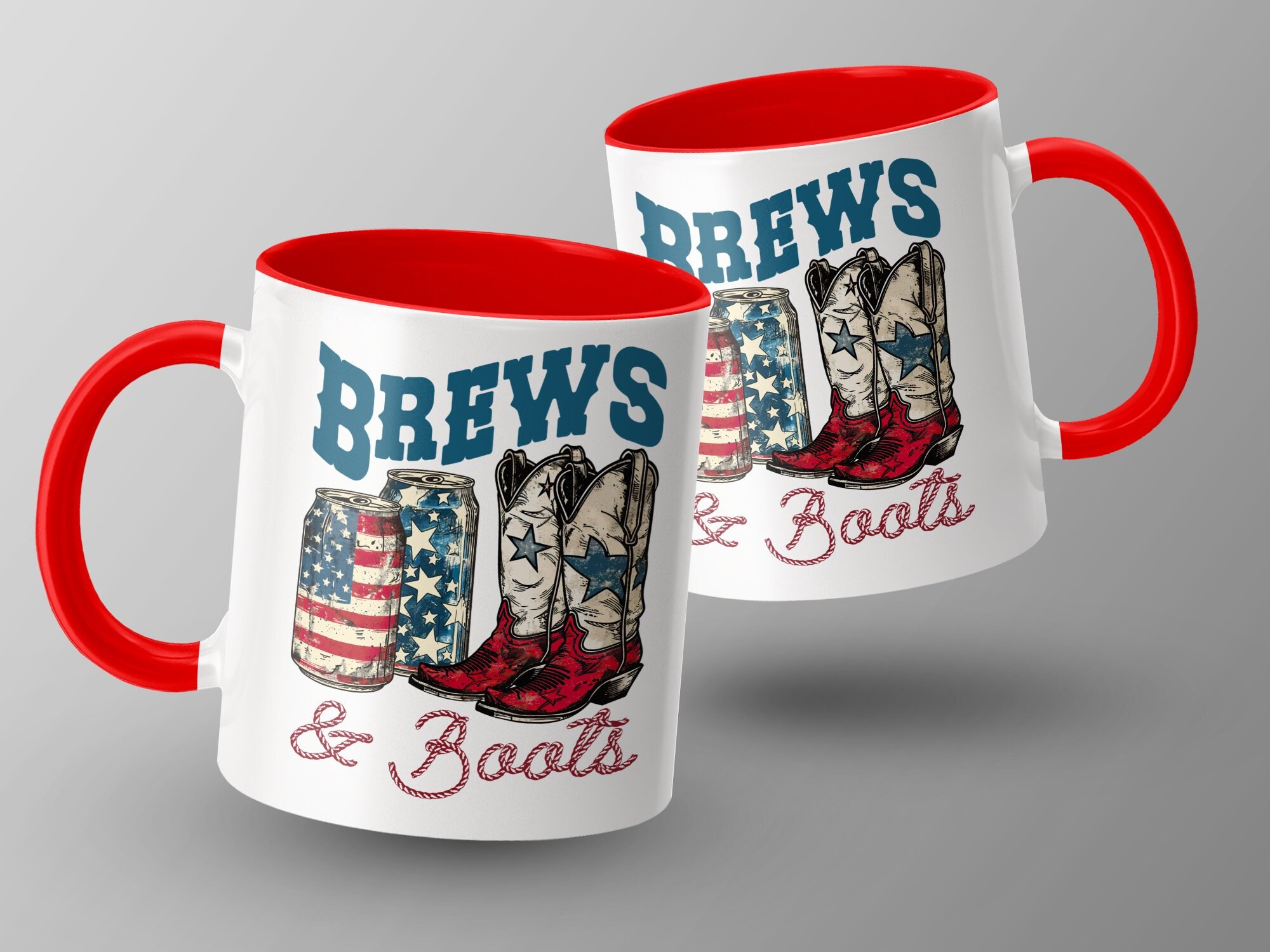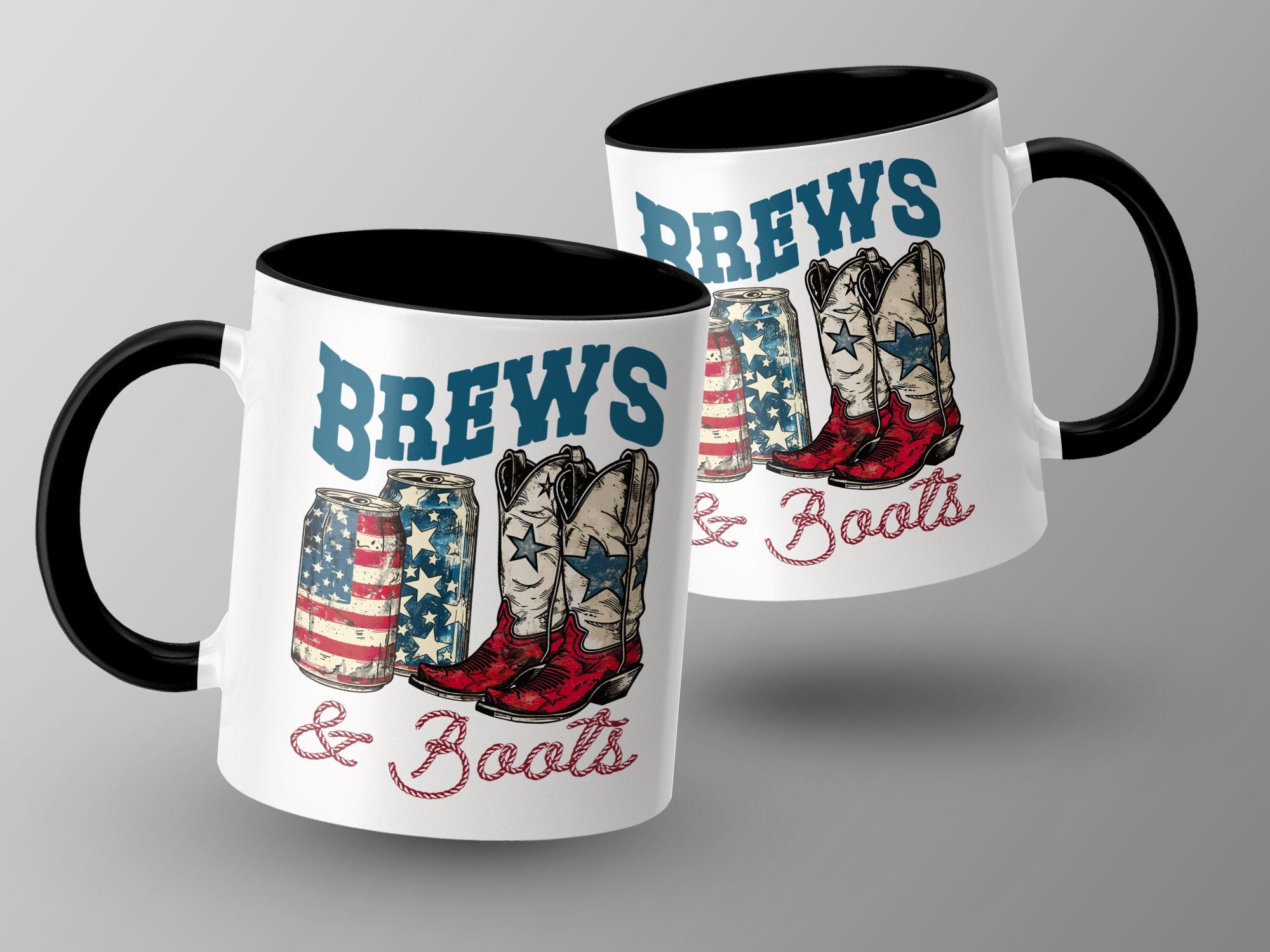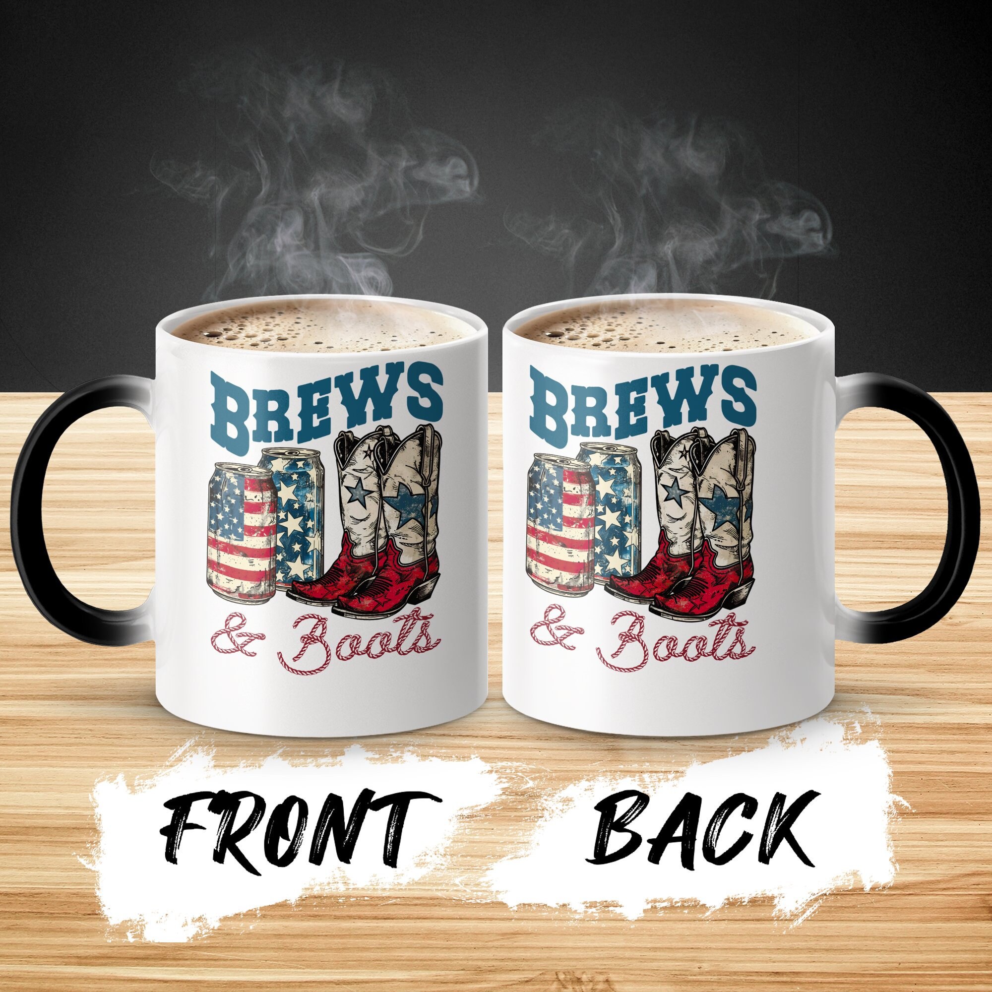 Enjoy your morning coffee with a touch of American spirit! This mug features a distinctive design with cowboy boots and beer cans, both adorned with the American flag colors and vintage flair. Perfect for Independence Day or as a special gift for the patriot in your life. Made from high-quality ceramic, it's dishwasher and microwave safe, ensuring durability and easy use.