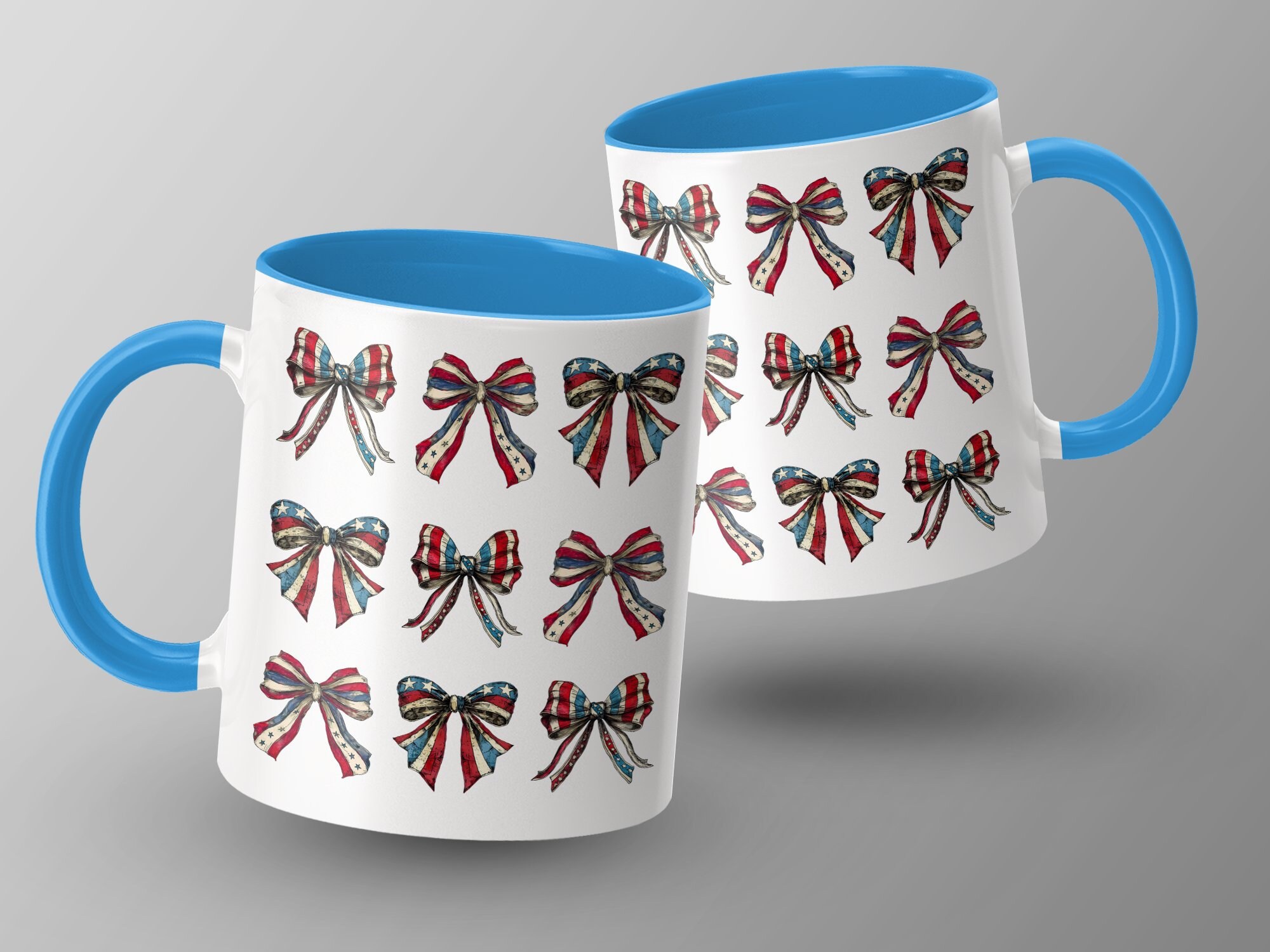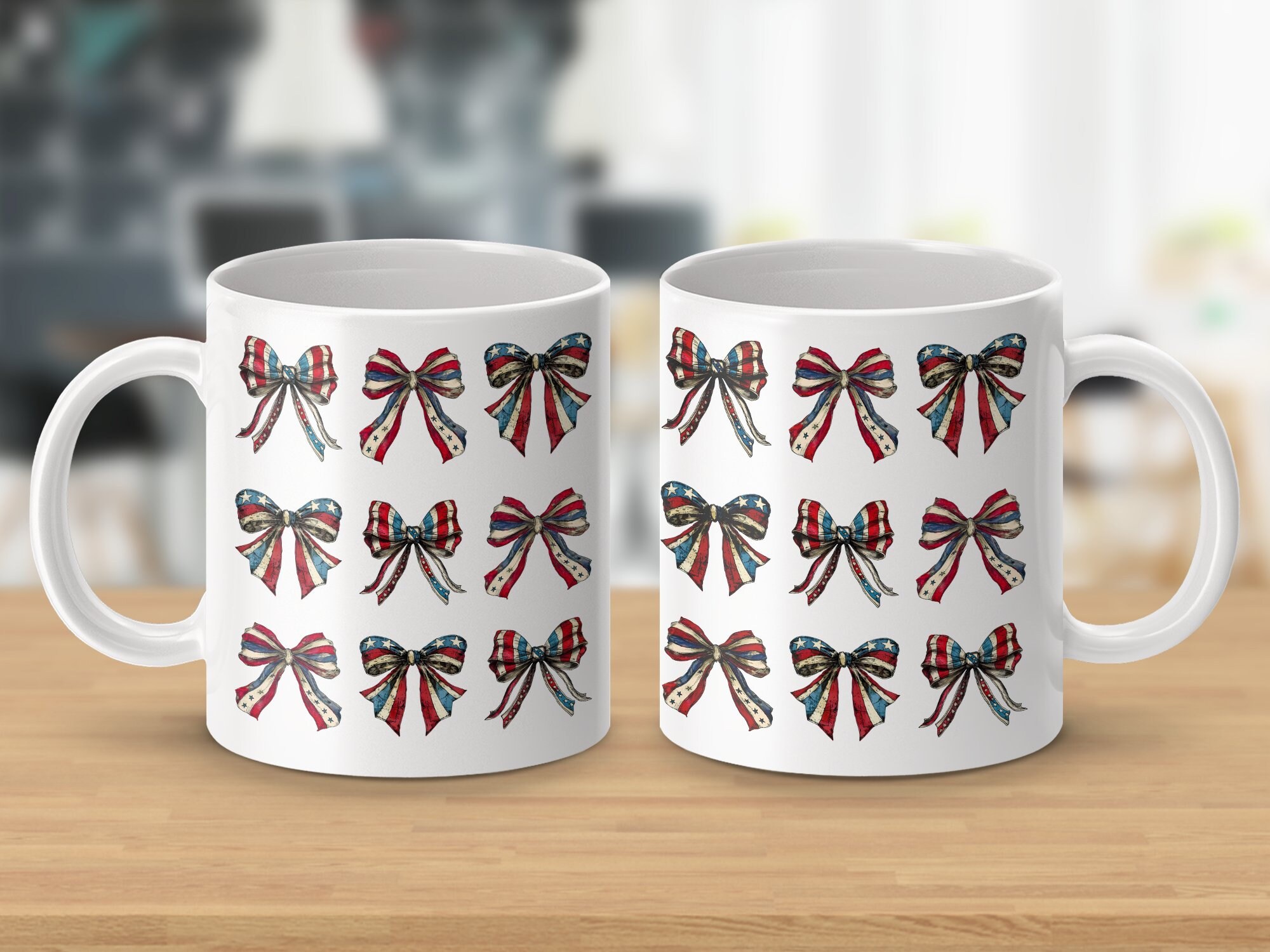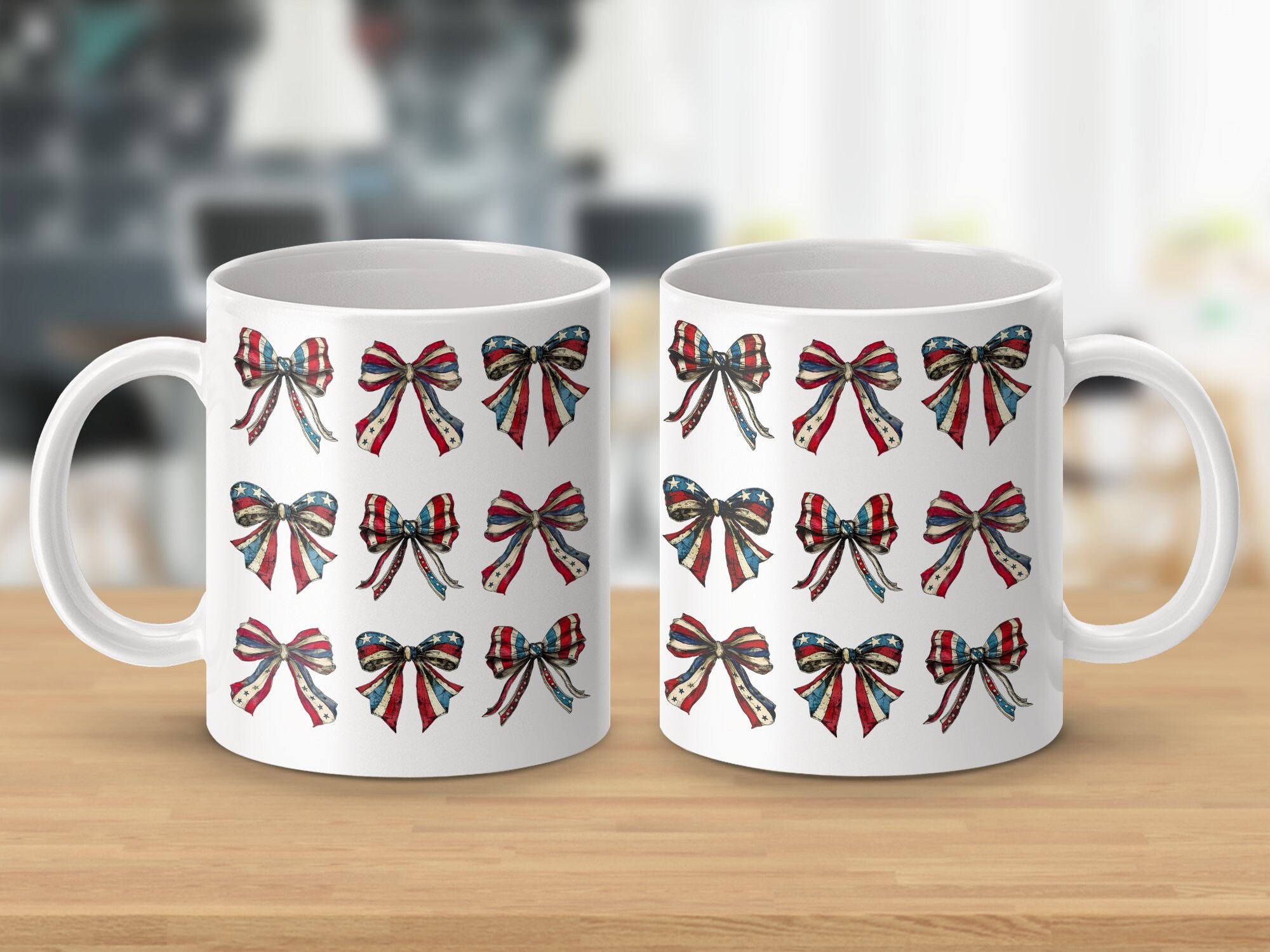 Sip your morning coffee with a touch of patriotism! This beautifully designed mug features an array of vintage-style American flag ribbon bows, perfect for celebrating the Fourth of July or showing your USA pride every day. The intricate detailing and vibrant colors make this mug a wonderful gift or a special treat for yourself. Ideal for hot and cold beverages, it's both microwave and dishwasher safe.
