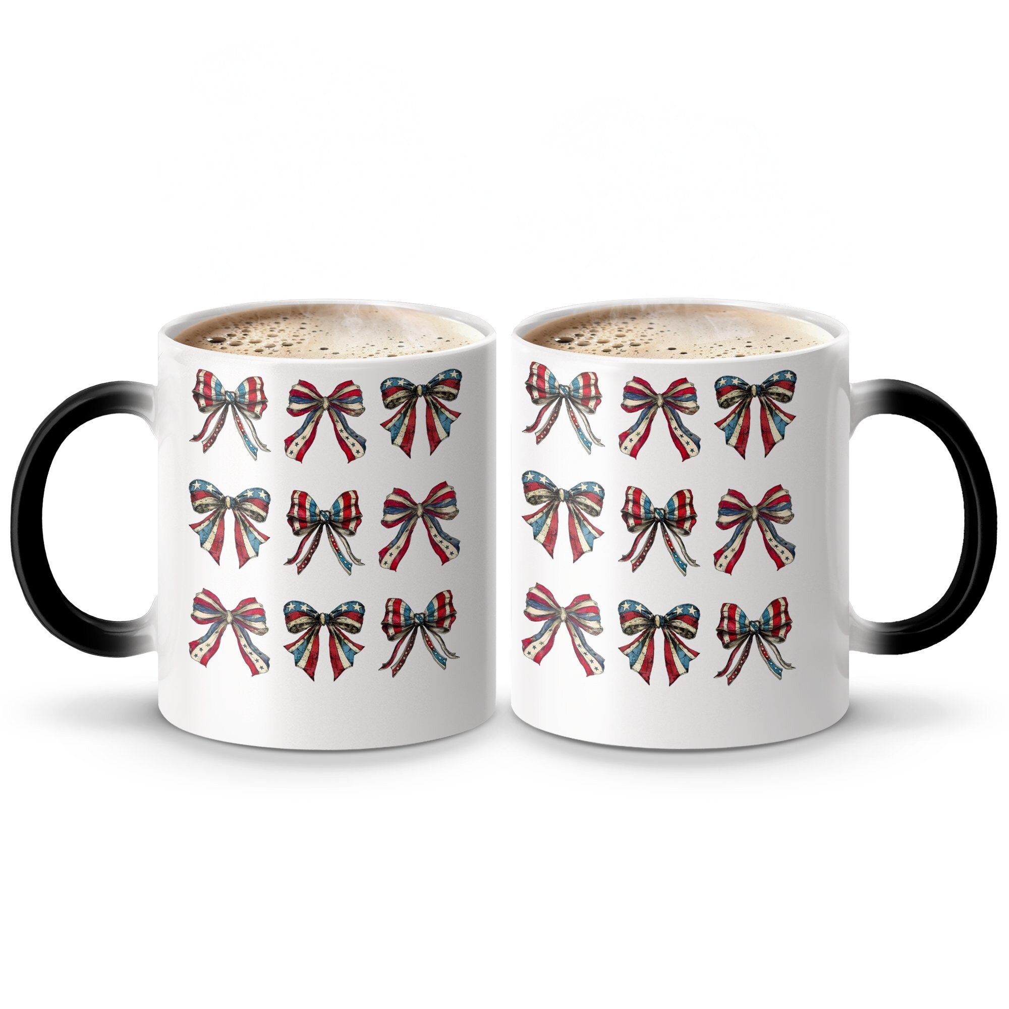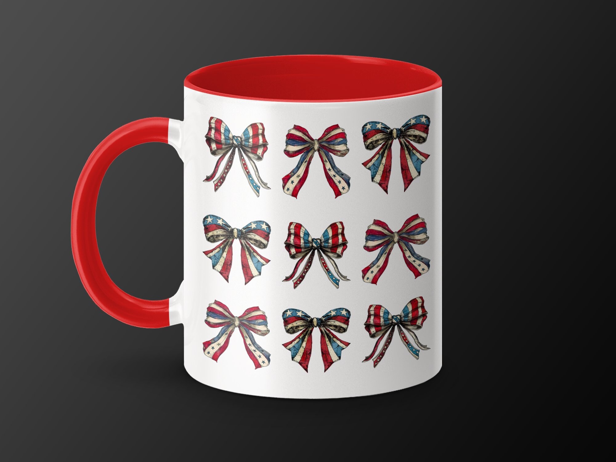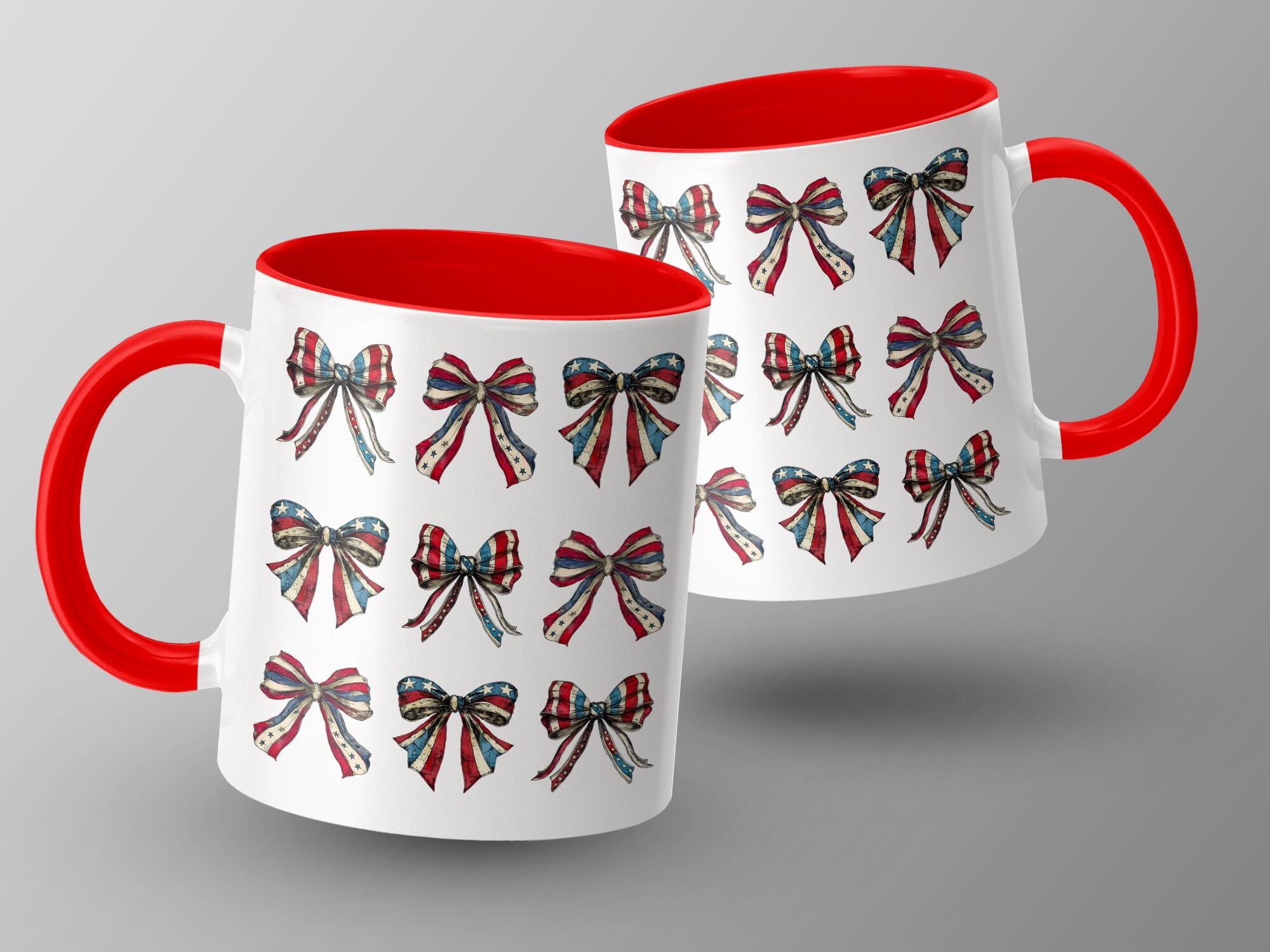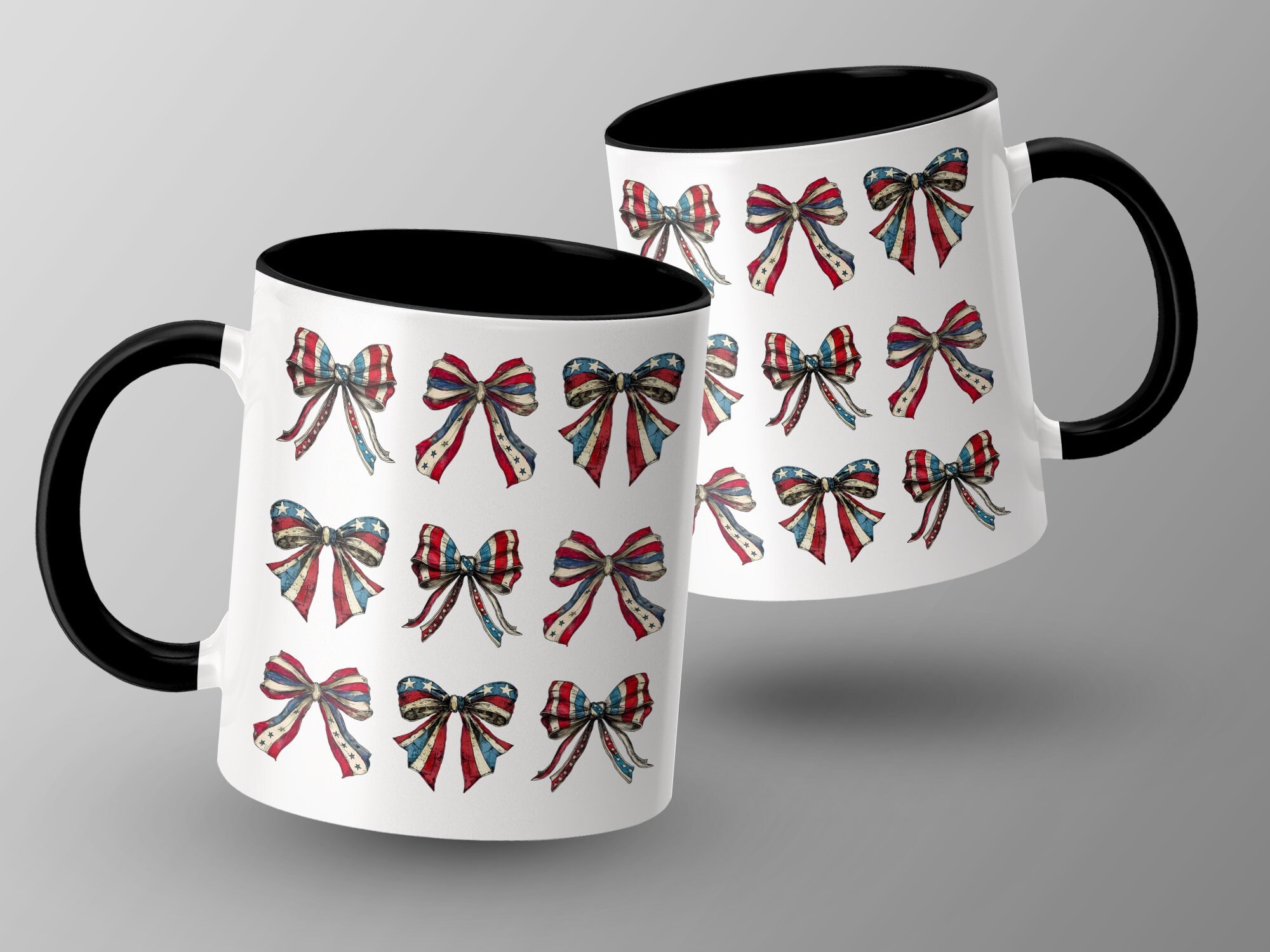 Sip your morning coffee with a touch of patriotism! This beautifully designed mug features an array of vintage-style American flag ribbon bows, perfect for celebrating the Fourth of July or showing your USA pride every day. The intricate detailing and vibrant colors make this mug a wonderful gift or a special treat for yourself. Ideal for hot and cold beverages, it's both microwave and dishwasher safe.