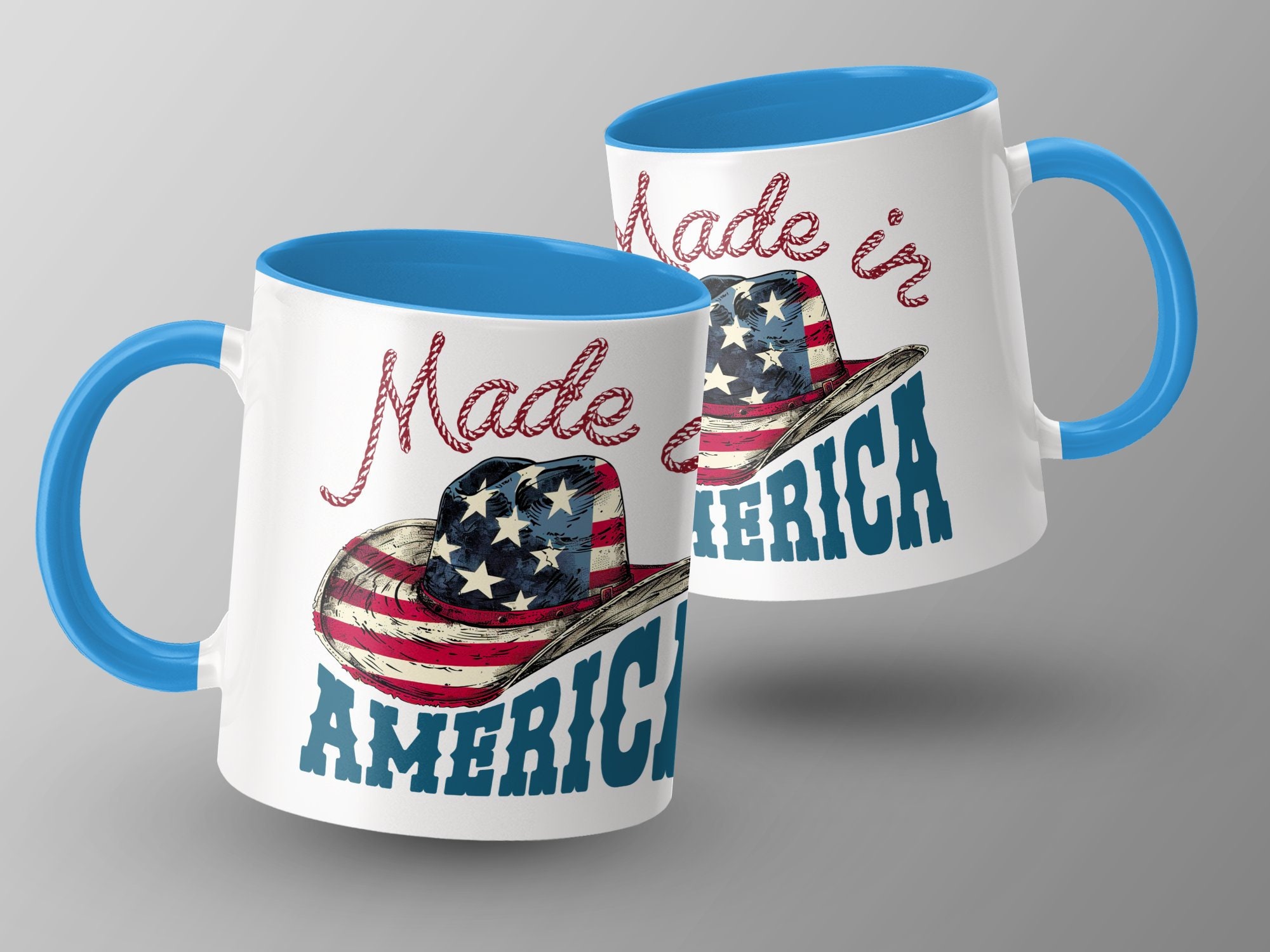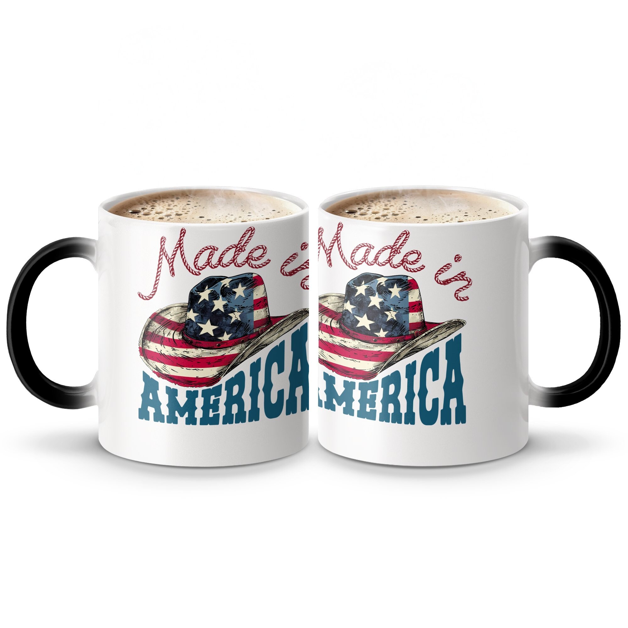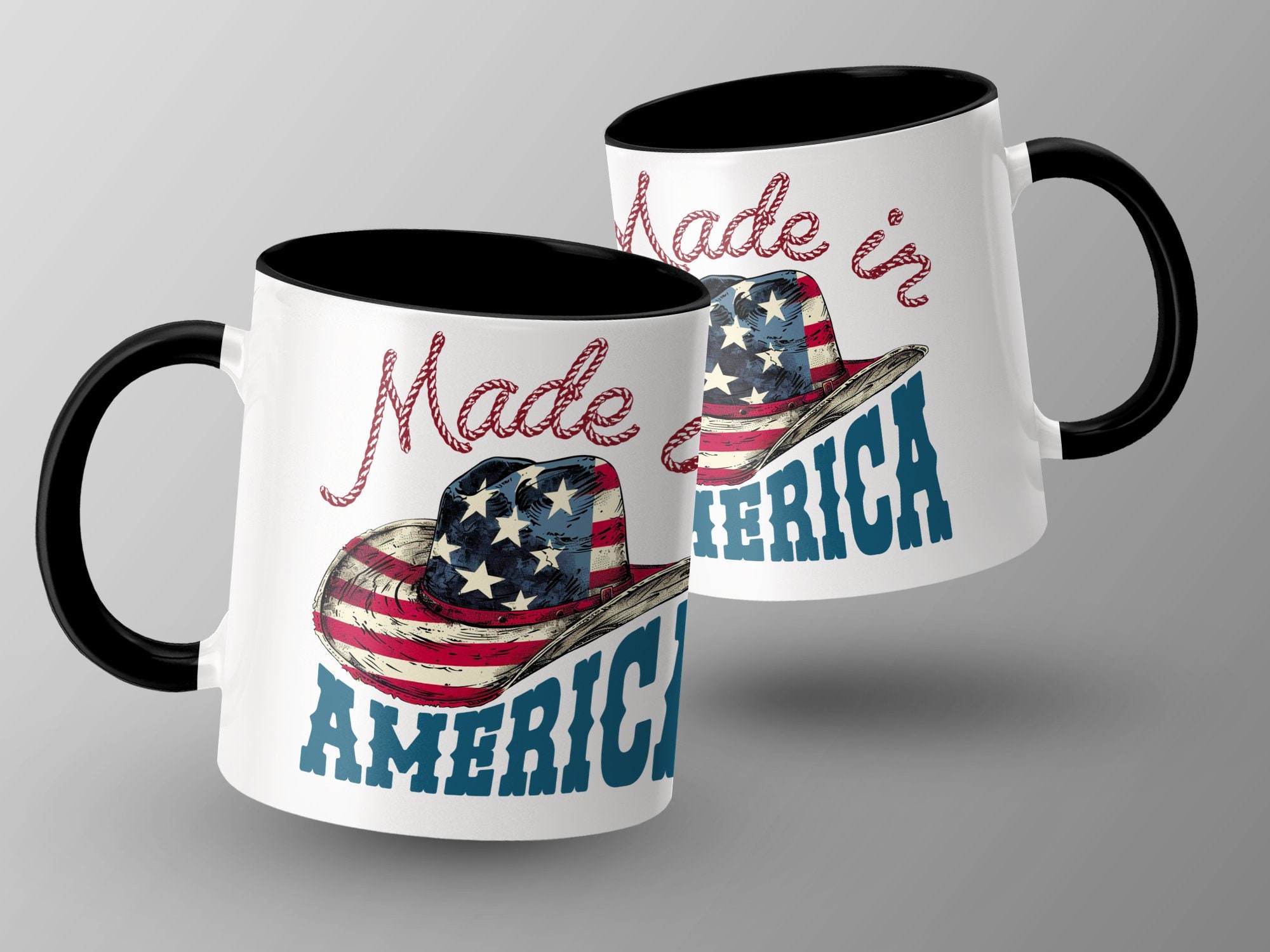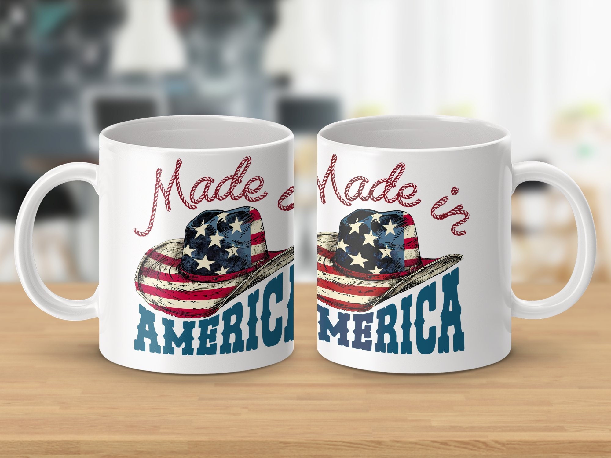 Start your day with a sip of patriotism with this beautifully designed coffee mug featuring a cowboy hat adorned with the American flag. The phrase "Made in America" proudly emphasizes national pride, making this mug a perfect gift for any patriot. Ideal for enjoying coffee or tea, this robust ceramic mug adds a touch of Americana to any morning routine. Its durable construction ensures it can be a part of daily life, celebrating American spirit one cup at a time.