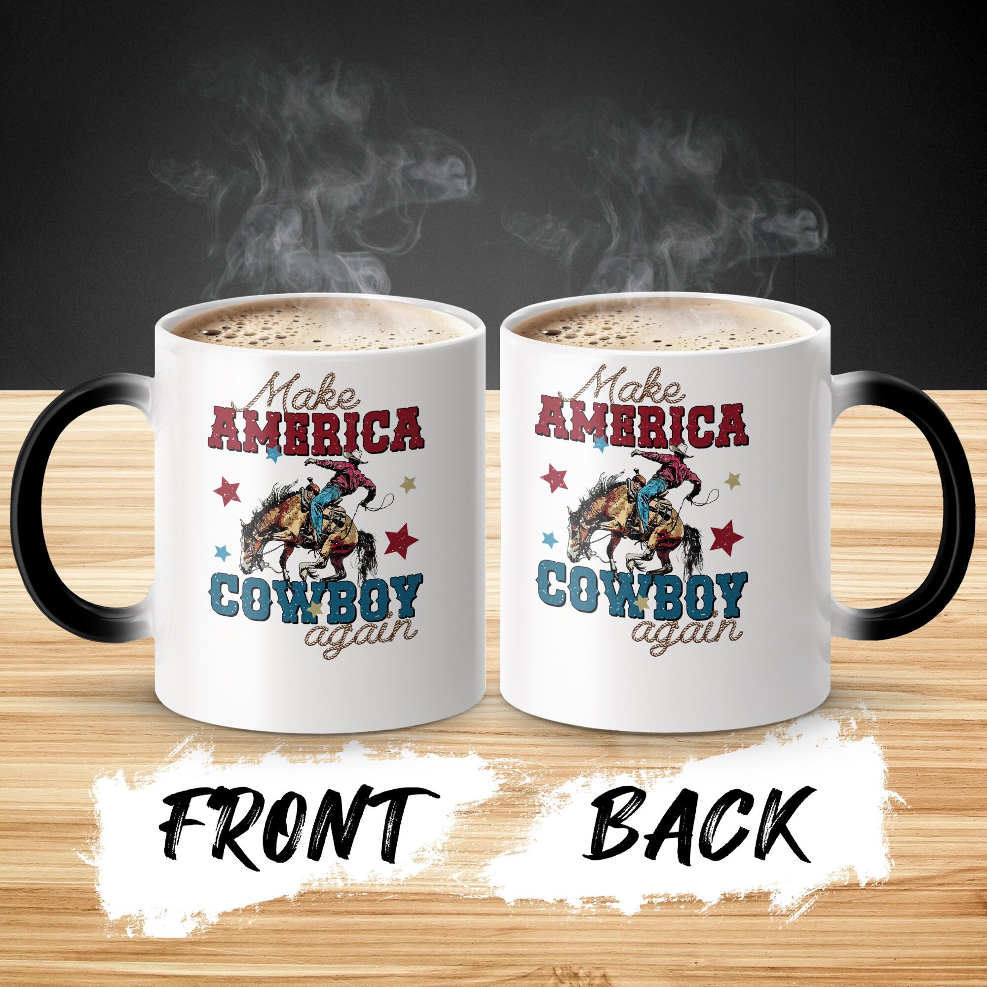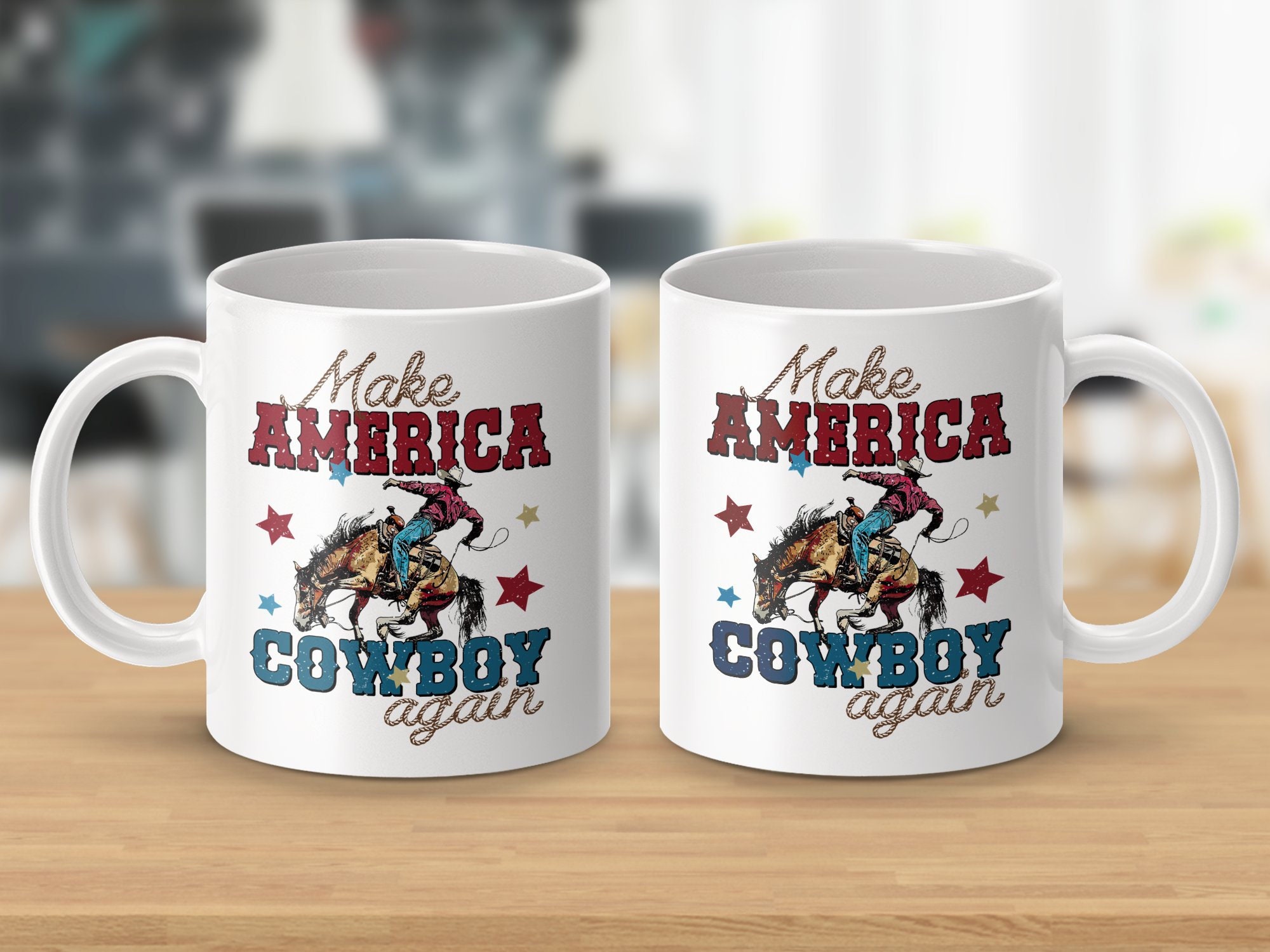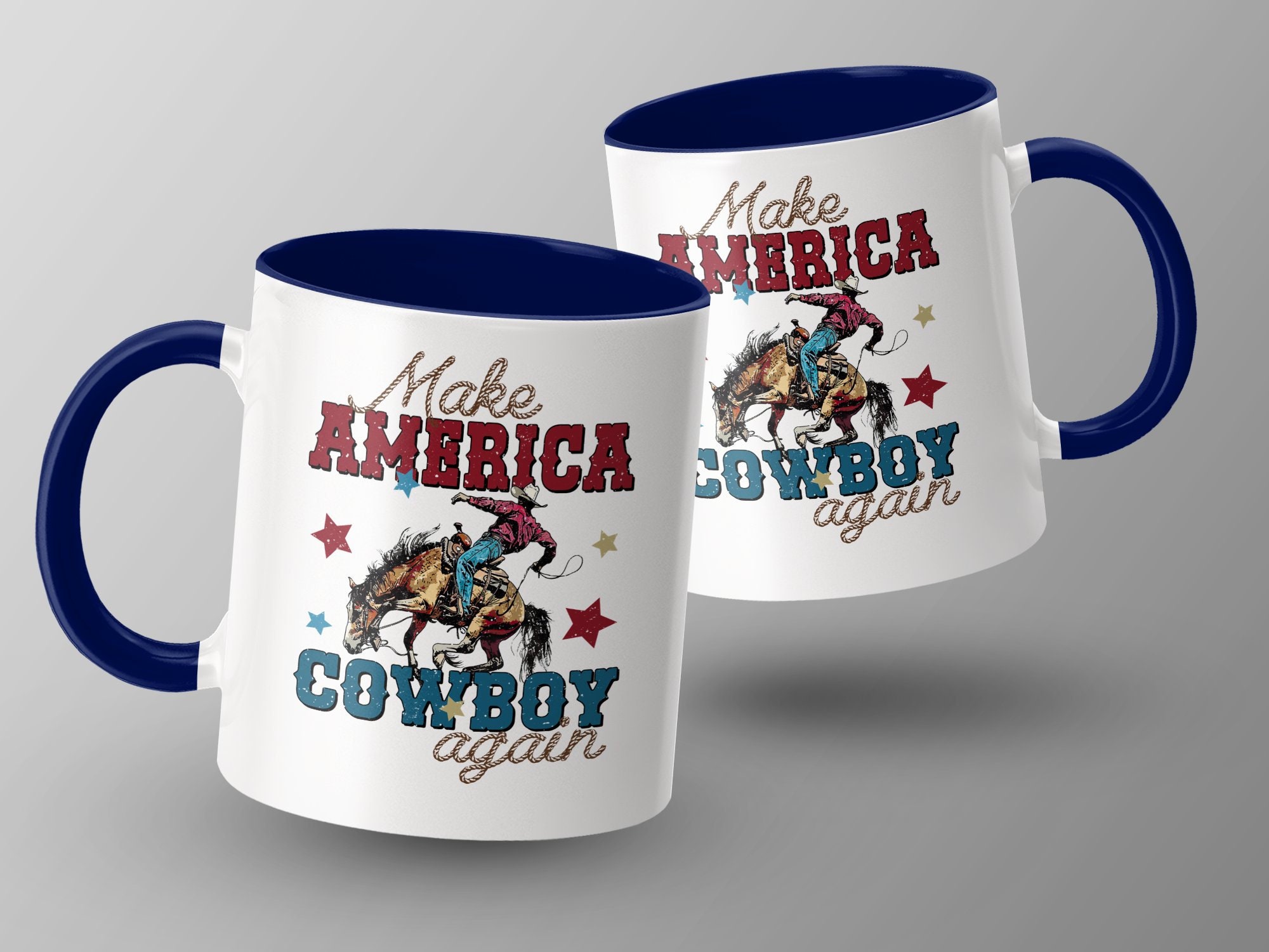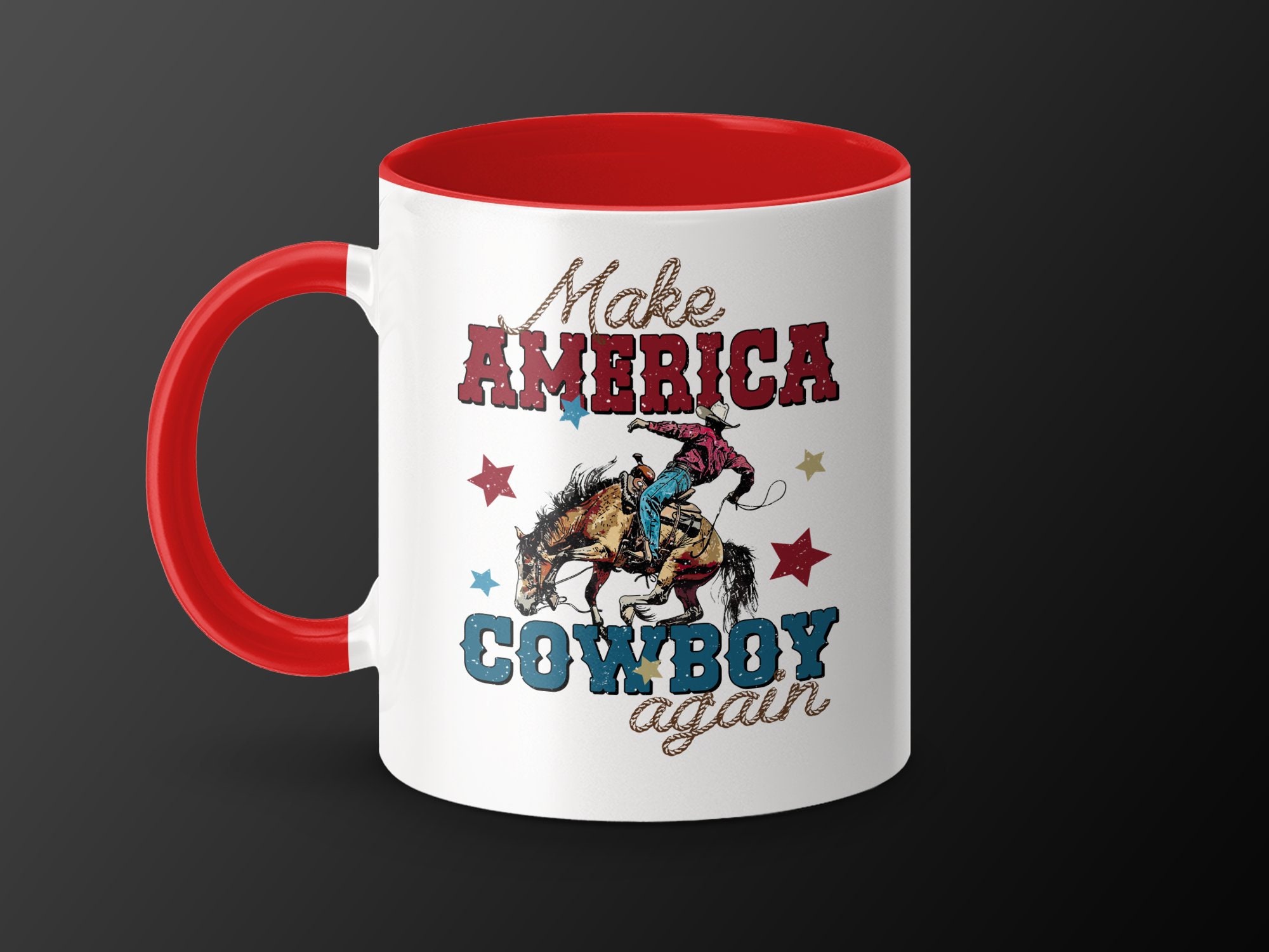 Celebrate American spirit and heritage with this bold "Make America Cowboy Again" mug. Perfect for coffee lovers and Western enthusiasts alike, this mug showcases a vivid design of a cowboy on a bucking horse, surrounded by stars. The distressed vintage look adds a touch of rustic charm to your morning routine or office desk. Made from high-quality ceramic, it’s ideal for daily use, ensuring durability and easy cleaning. Show your pride or gift it to someone special who cherishes cowboy culture and Americana.
