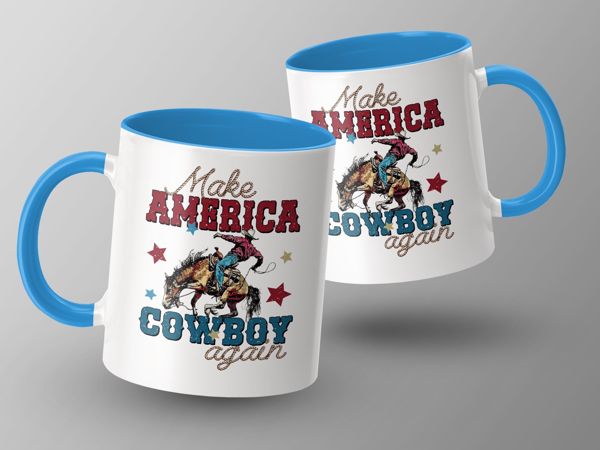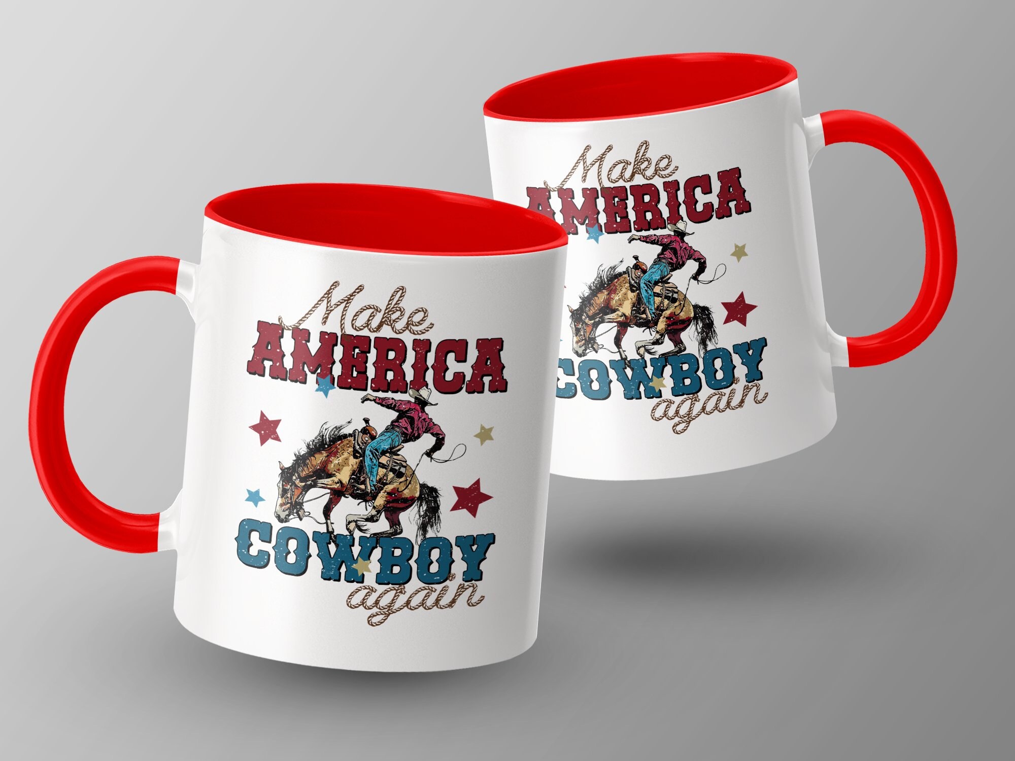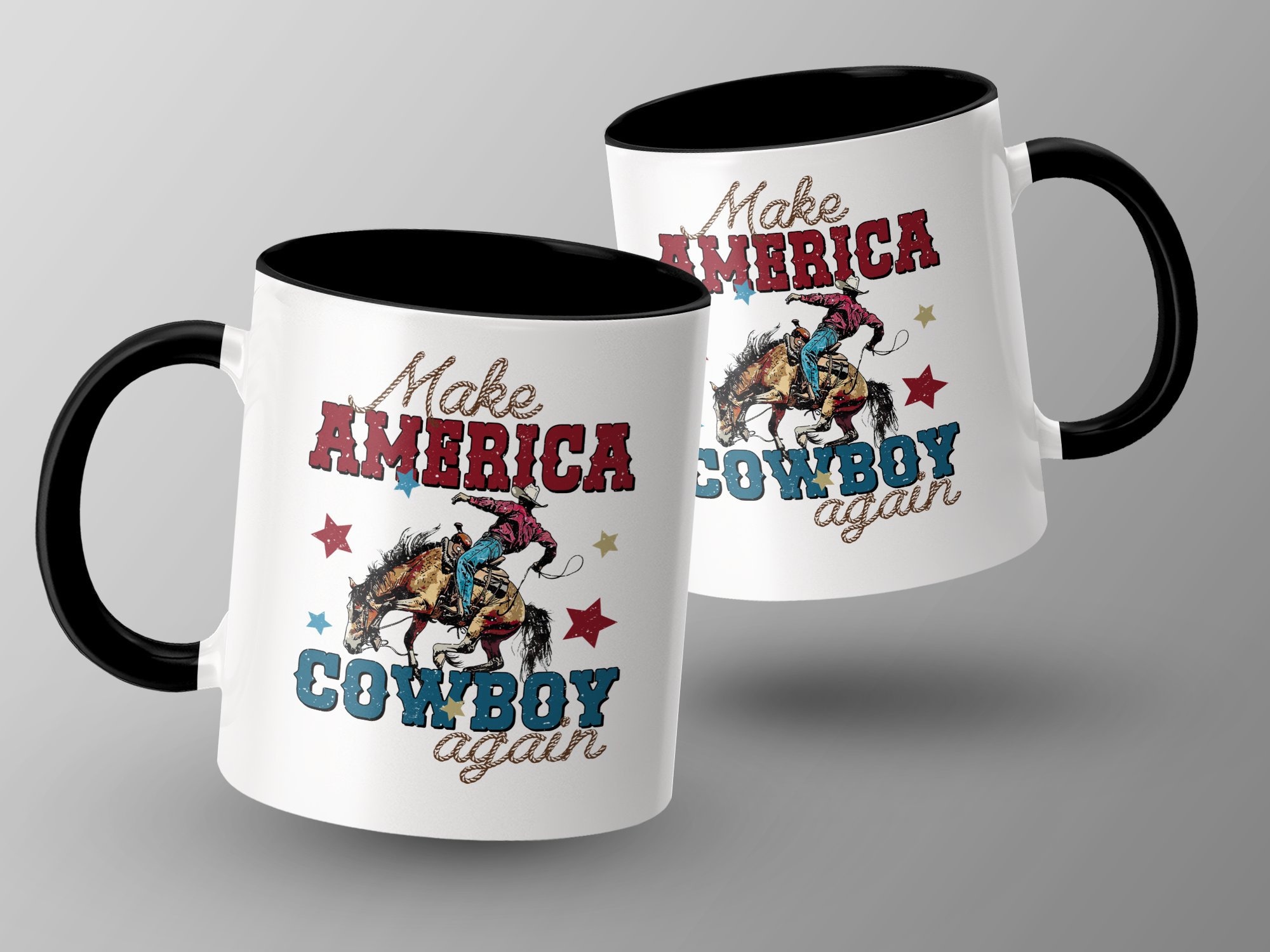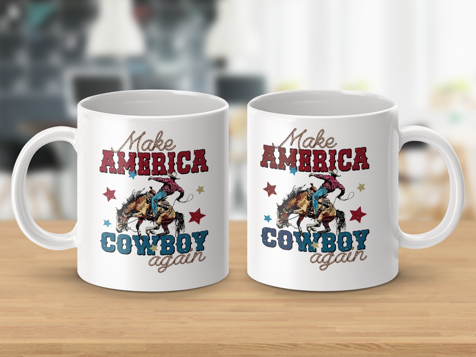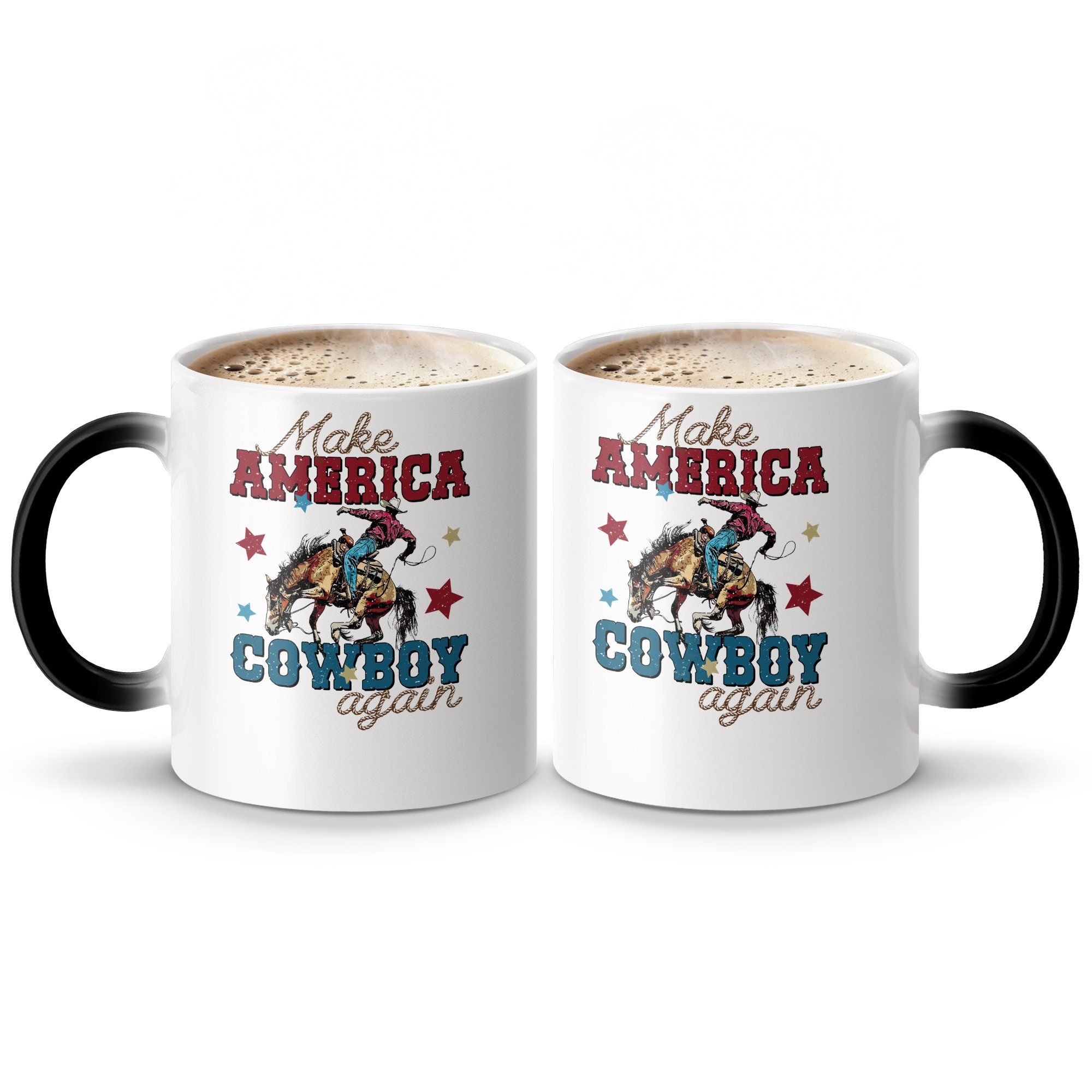 Celebrate American spirit and heritage with this bold "Make America Cowboy Again" mug. Perfect for coffee lovers and Western enthusiasts alike, this mug showcases a vivid design of a cowboy on a bucking horse, surrounded by stars. The distressed vintage look adds a touch of rustic charm to your morning routine or office desk. Made from high-quality ceramic, it’s ideal for daily use, ensuring durability and easy cleaning. Show your pride or gift it to someone special who cherishes cowboy culture and Americana.
