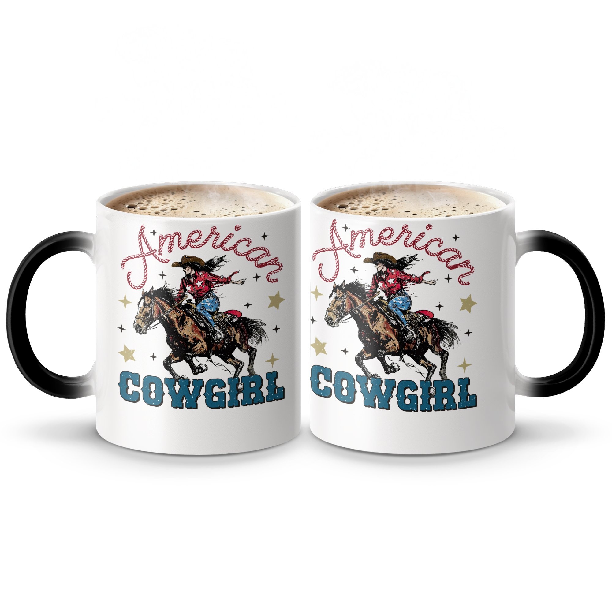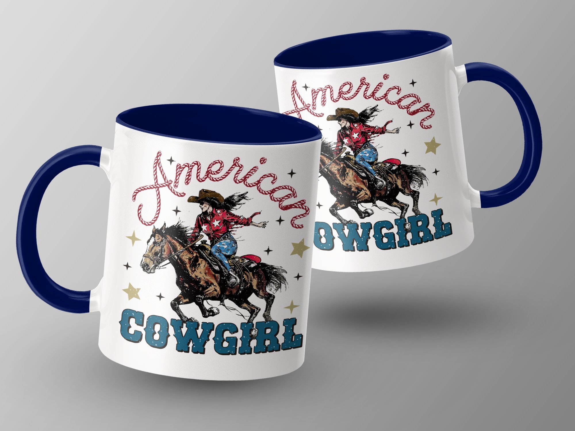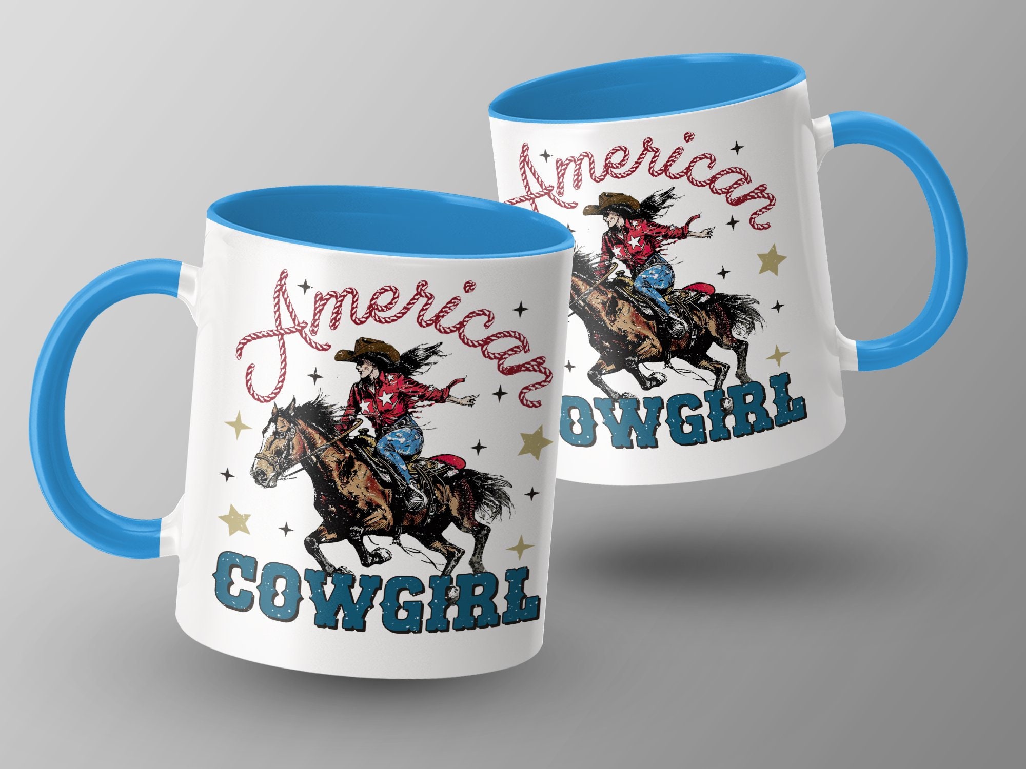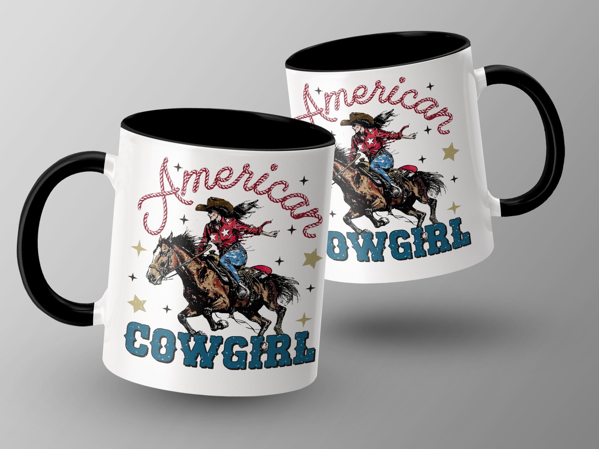 Experience the Wild West with our American Cowgirl Riding Horse mug! This vintage-style coffee cup features a vibrant and spirited cowgirl on a galloping horse, adorned with patriotic stars and the text "American Cowgirl". Perfect for those who love unique and nostalgic Western-themed items, it's great for your morning coffee or as a thoughtful gift for the cowboy or cowgirl in your life.
