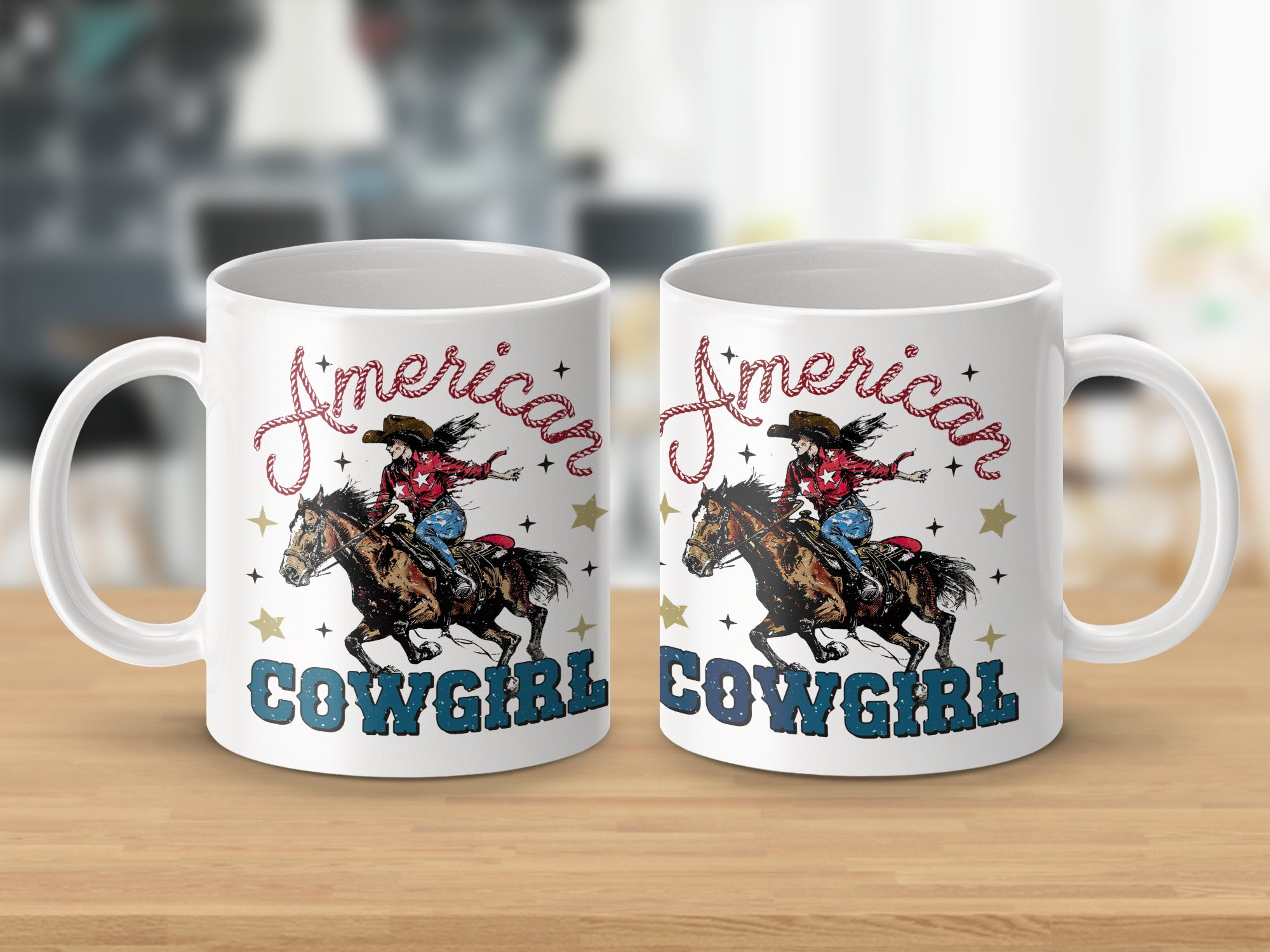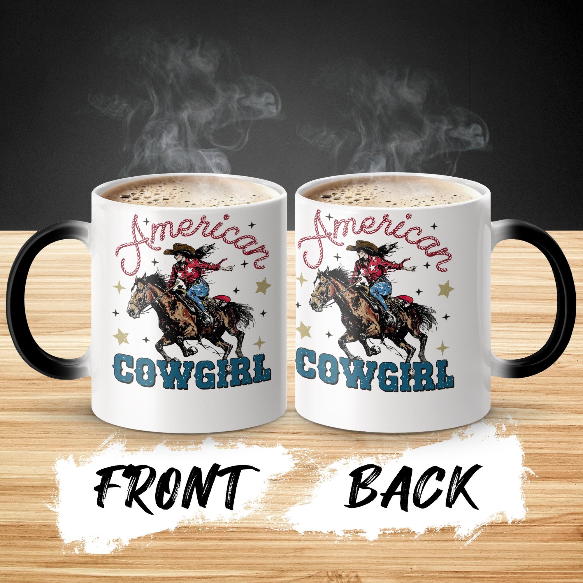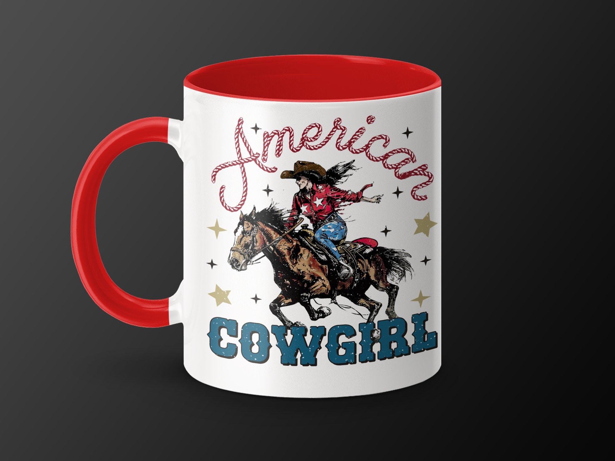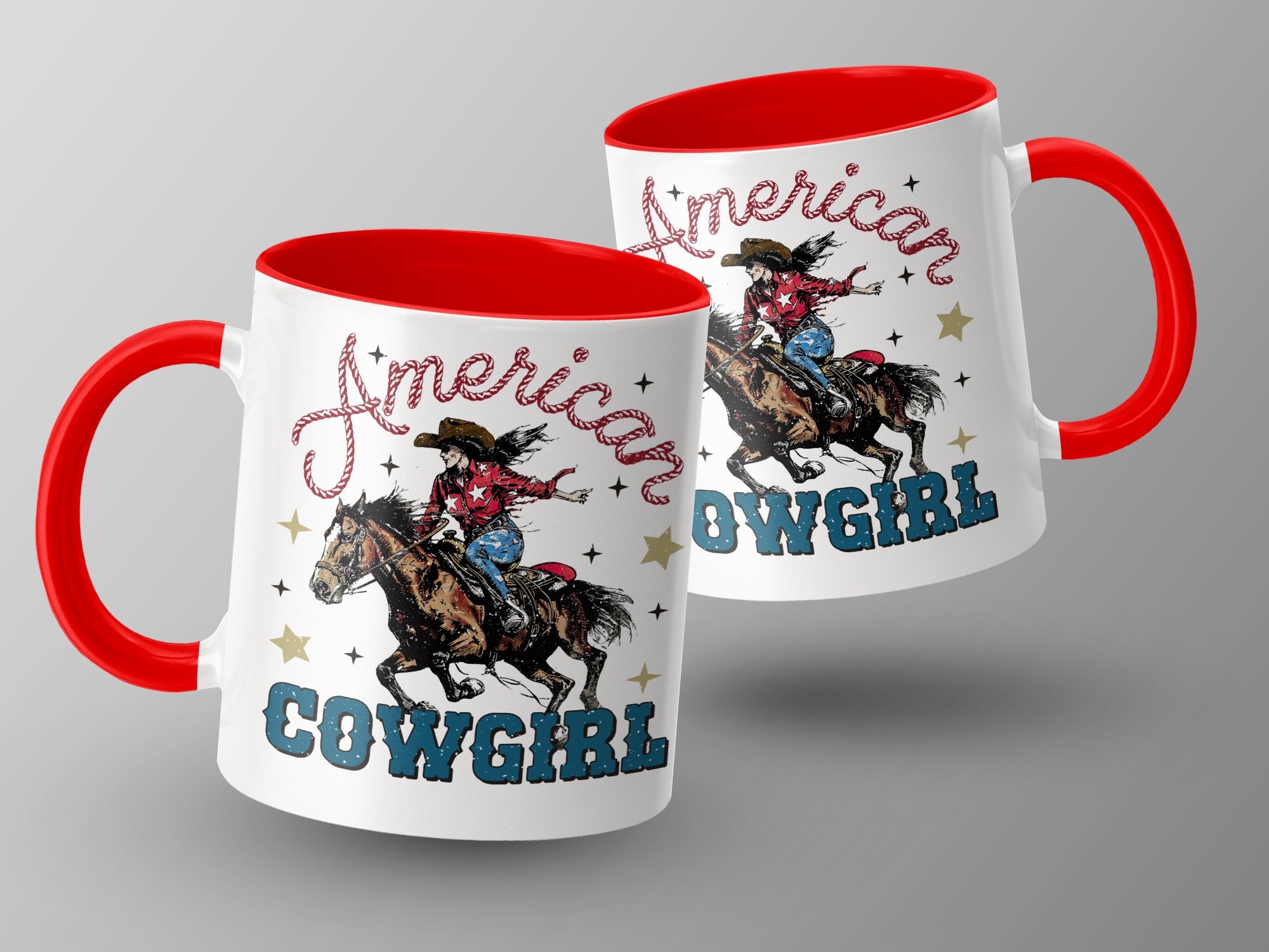 Experience the Wild West with our American Cowgirl Riding Horse mug! This vintage-style coffee cup features a vibrant and spirited cowgirl on a galloping horse, adorned with patriotic stars and the text "American Cowgirl". Perfect for those who love unique and nostalgic Western-themed items, it's great for your morning coffee or as a thoughtful gift for the cowboy or cowgirl in your life.