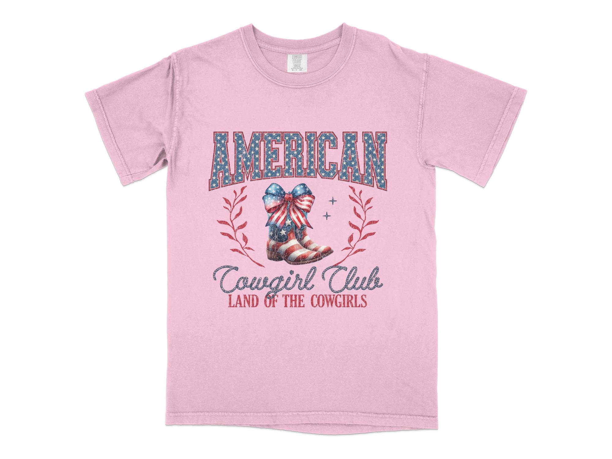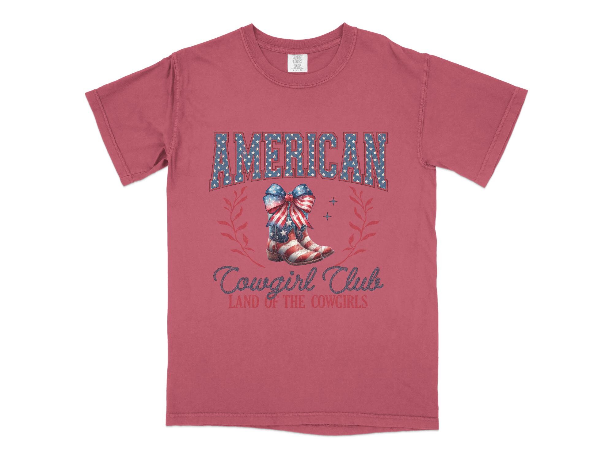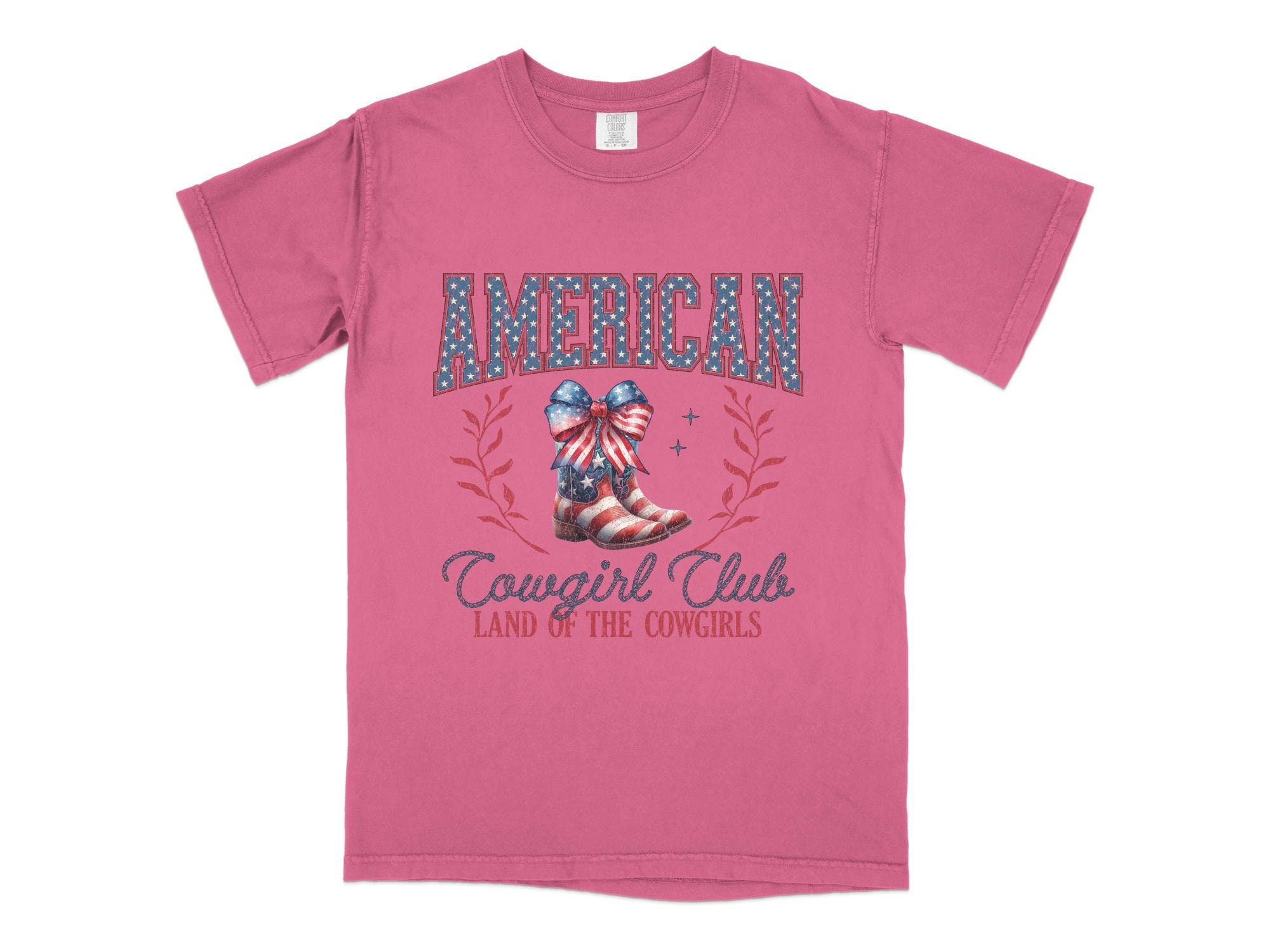 Show your cowgirl spirit with this vintage-inspired "American Cowgirl Club" t-shirt. Featuring a distressed graphic of boots wrapped in an American flag ribbon and star-studded detailing, this top combines rustic charm with patriotic flair. Perfect for country music festivals, Independence Day celebrations, or everyday wear. The soft, comfortable fabric and classic fit make it a wardrobe staple for those who love the Western lifestyle.