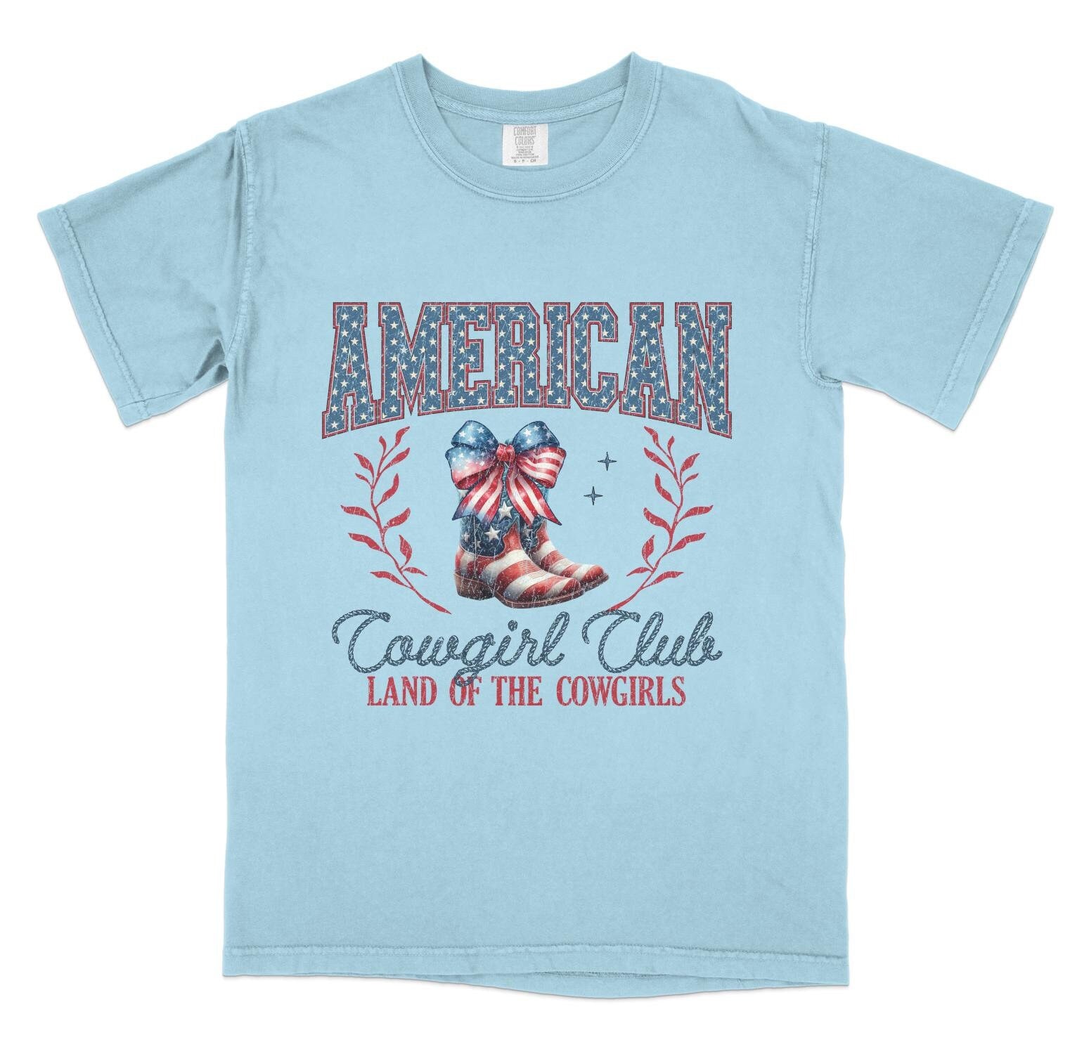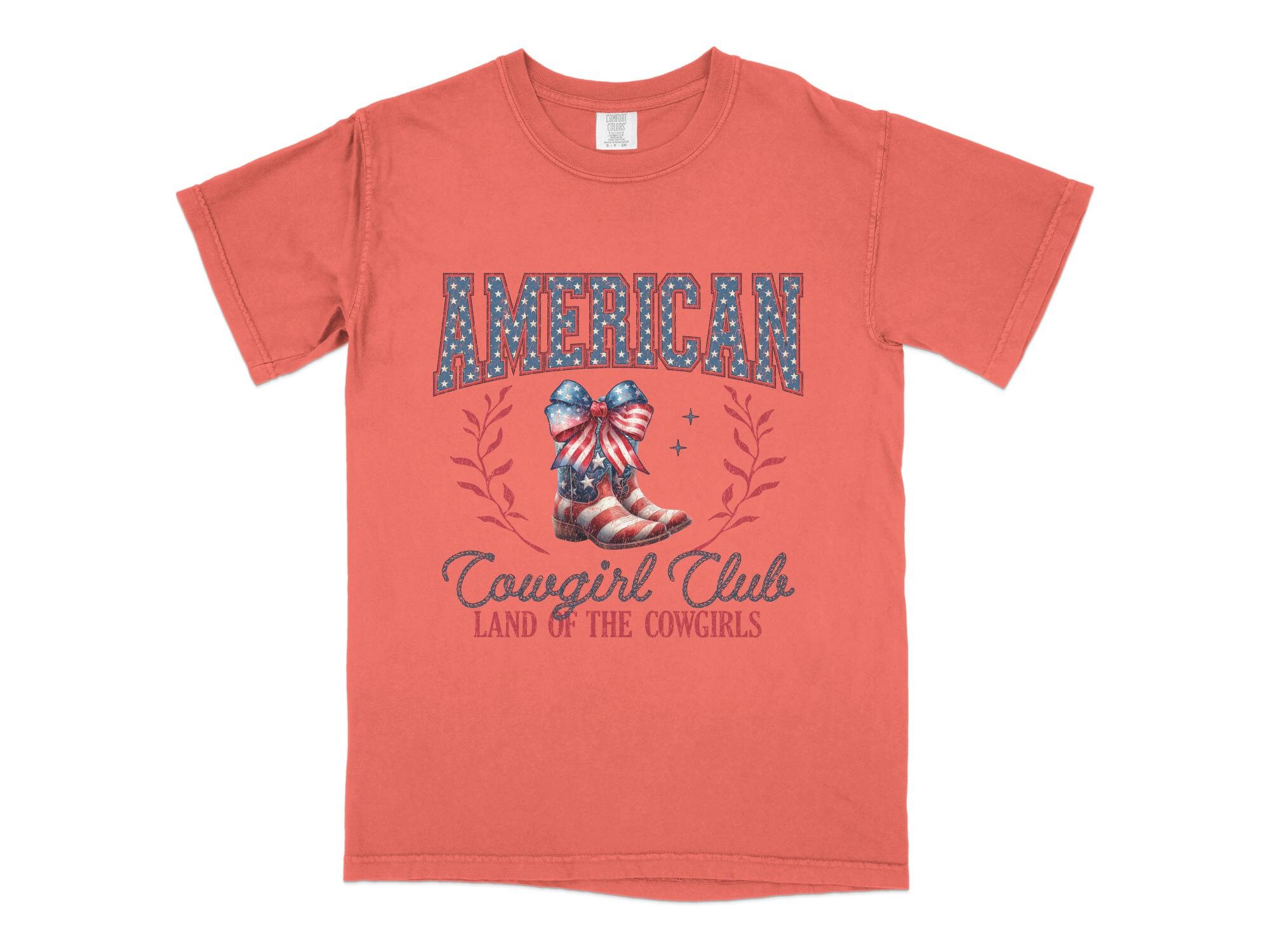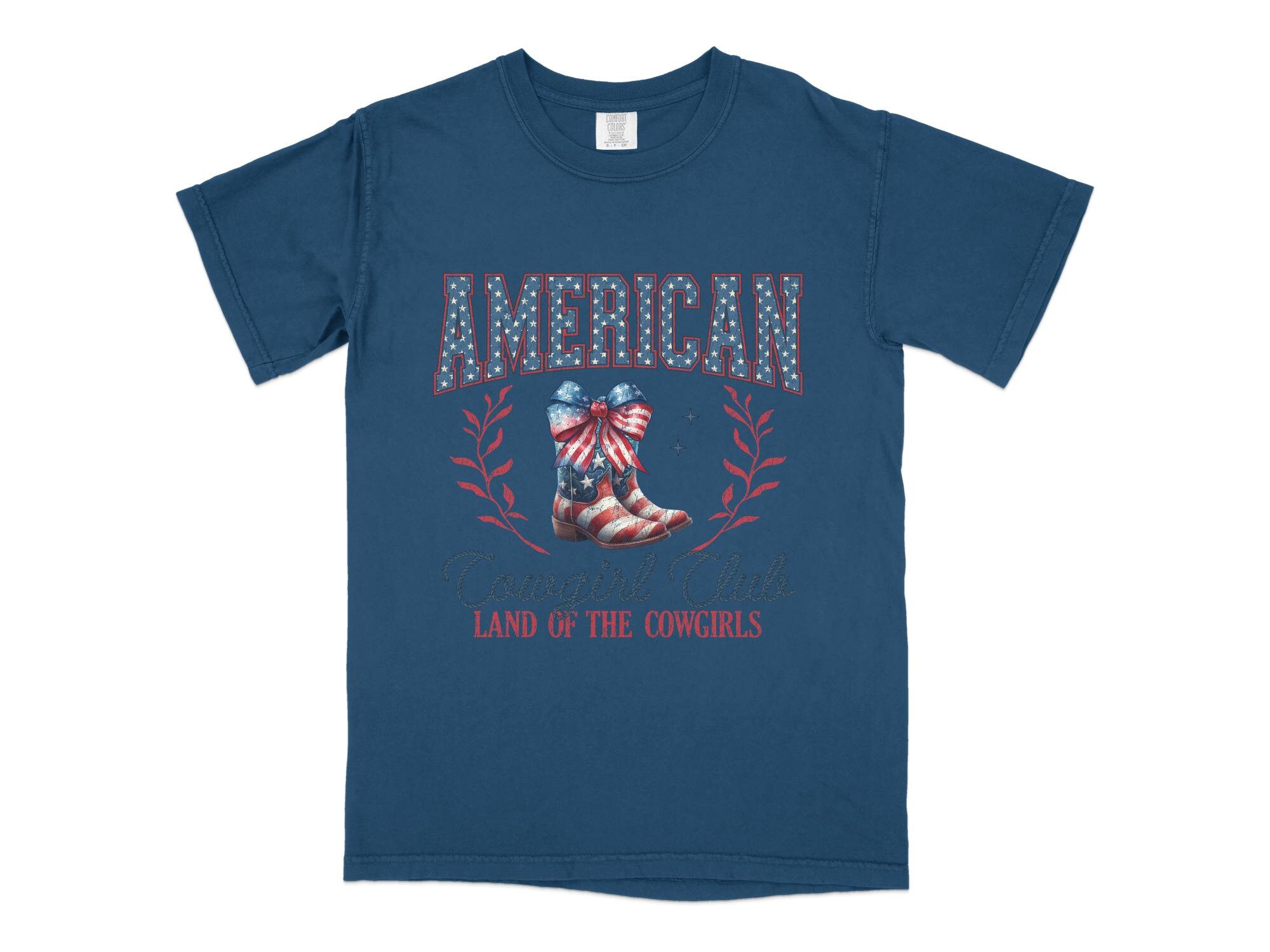 Show your cowgirl spirit with this vintage-inspired "American Cowgirl Club" t-shirt. Featuring a distressed graphic of boots wrapped in an American flag ribbon and star-studded detailing, this top combines rustic charm with patriotic flair. Perfect for country music festivals, Independence Day celebrations, or everyday wear. The soft, comfortable fabric and classic fit make it a wardrobe staple for those who love the Western lifestyle.