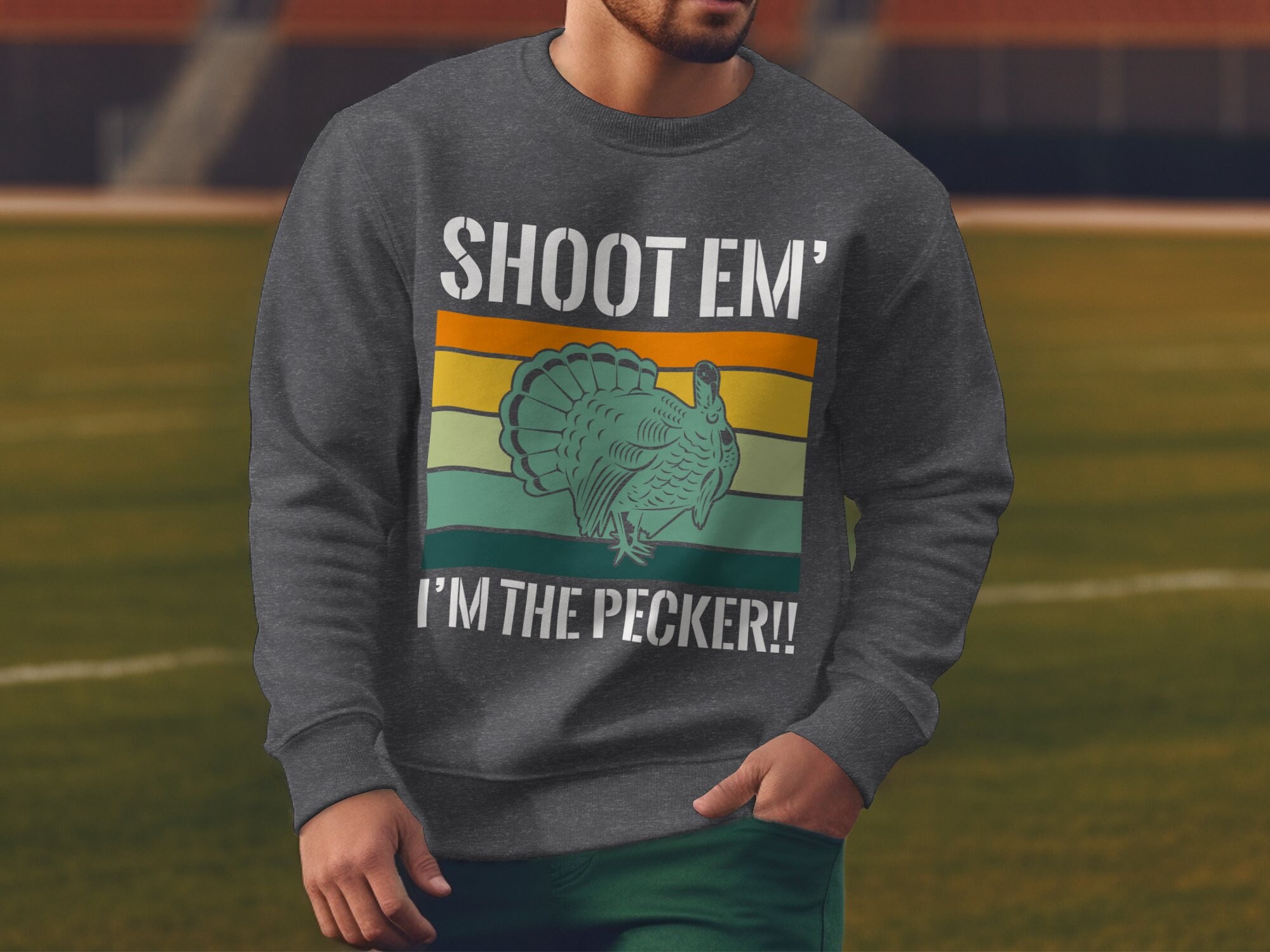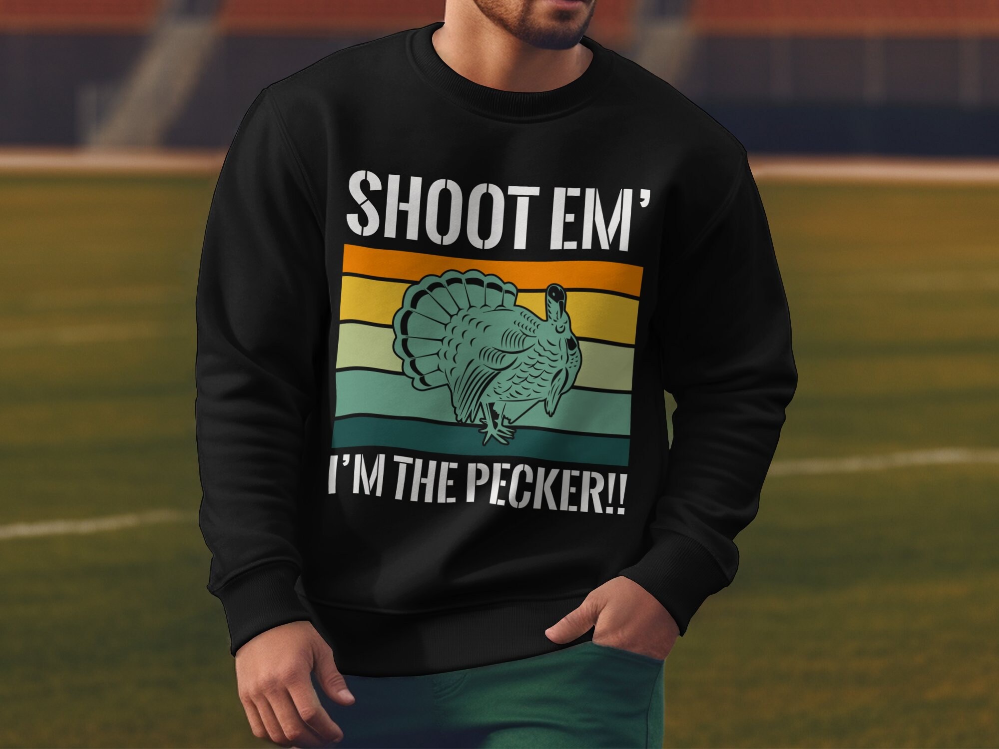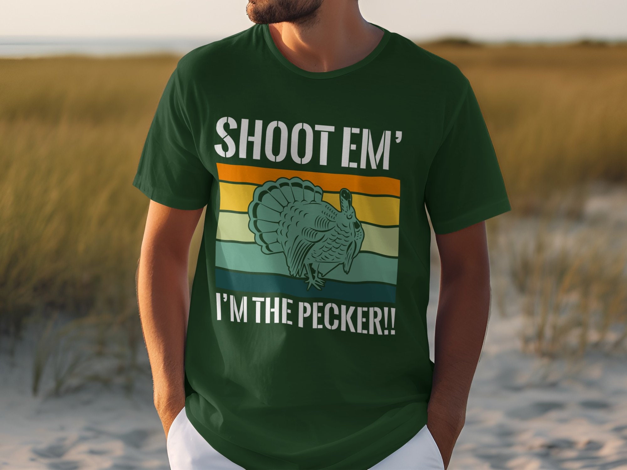 This Retro Turkey Graphic T-Shirt features a funny "Shoot Em I'm The Pecker" design perfect for Thanksgiving or hunters. The vintage style makes it a unique gift and a great addition to any wardrobe. Item is available in a variety of colors, sizes, and on a variety of apparel options.