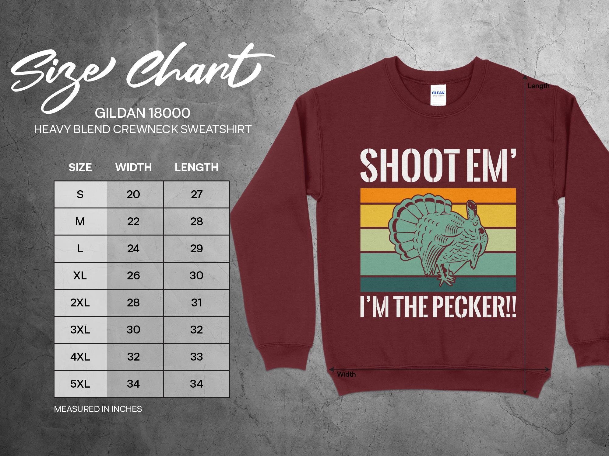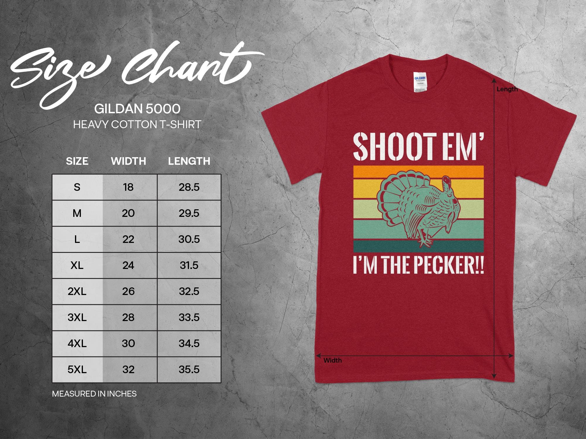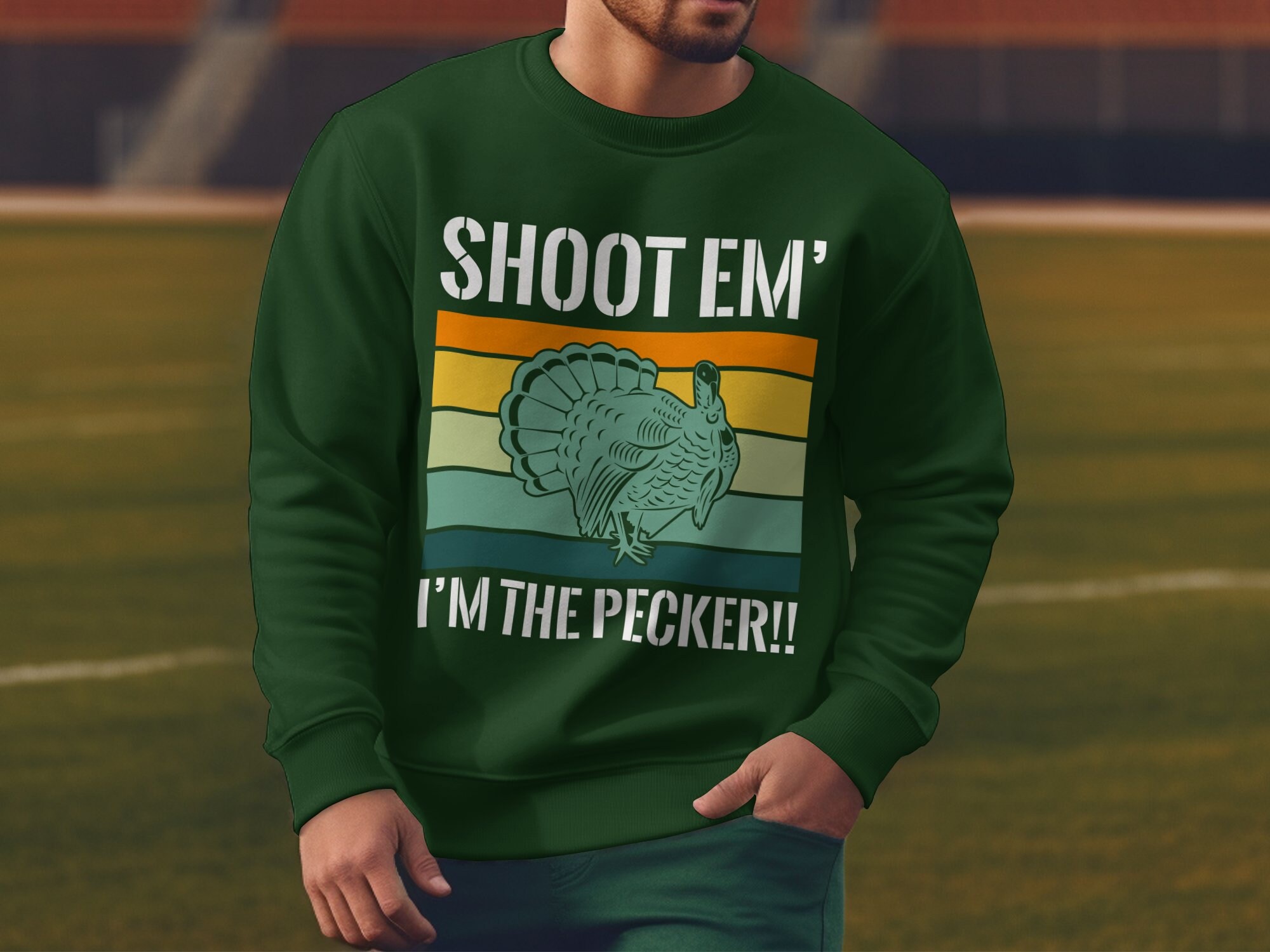 This Retro Turkey Graphic T-Shirt features a funny "Shoot Em I'm The Pecker" design perfect for Thanksgiving or hunters. The vintage style makes it a unique gift and a great addition to any wardrobe. Item is available in a variety of colors, sizes, and on a variety of apparel options.
