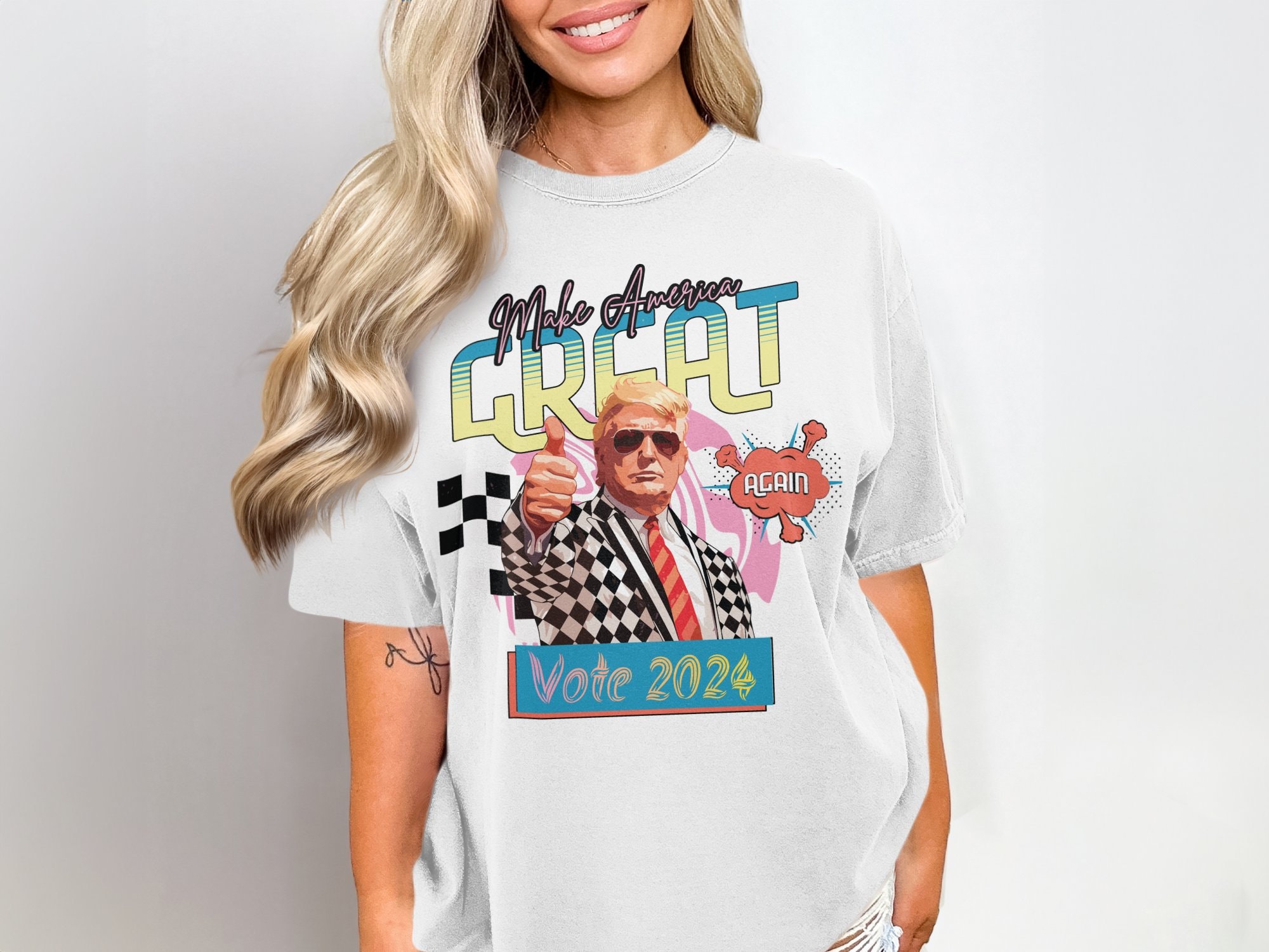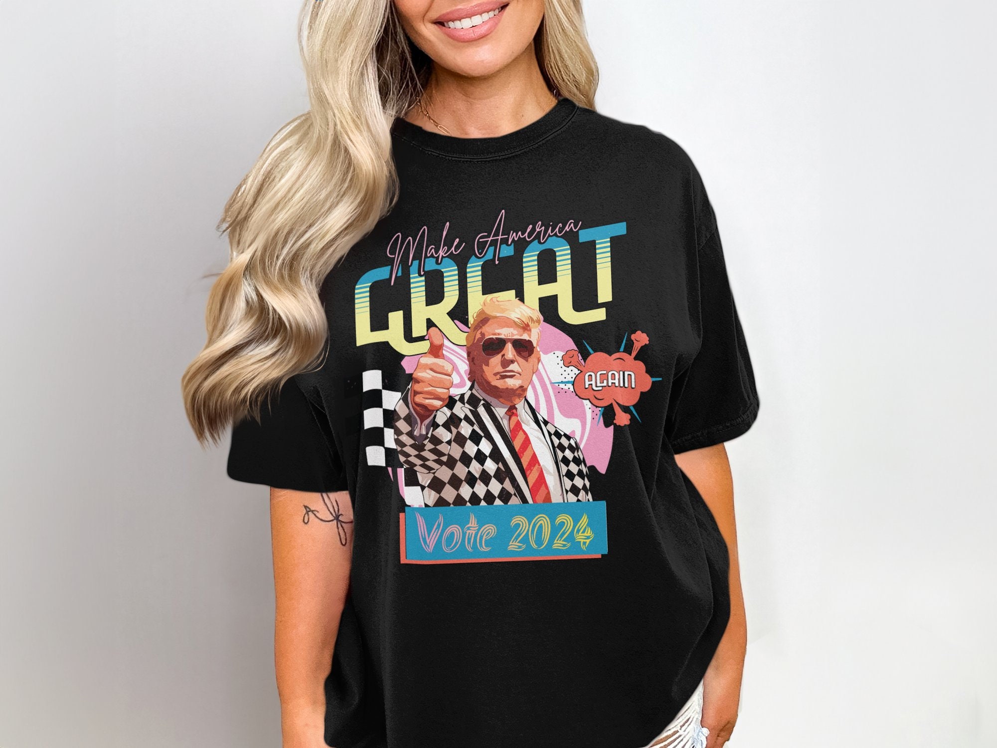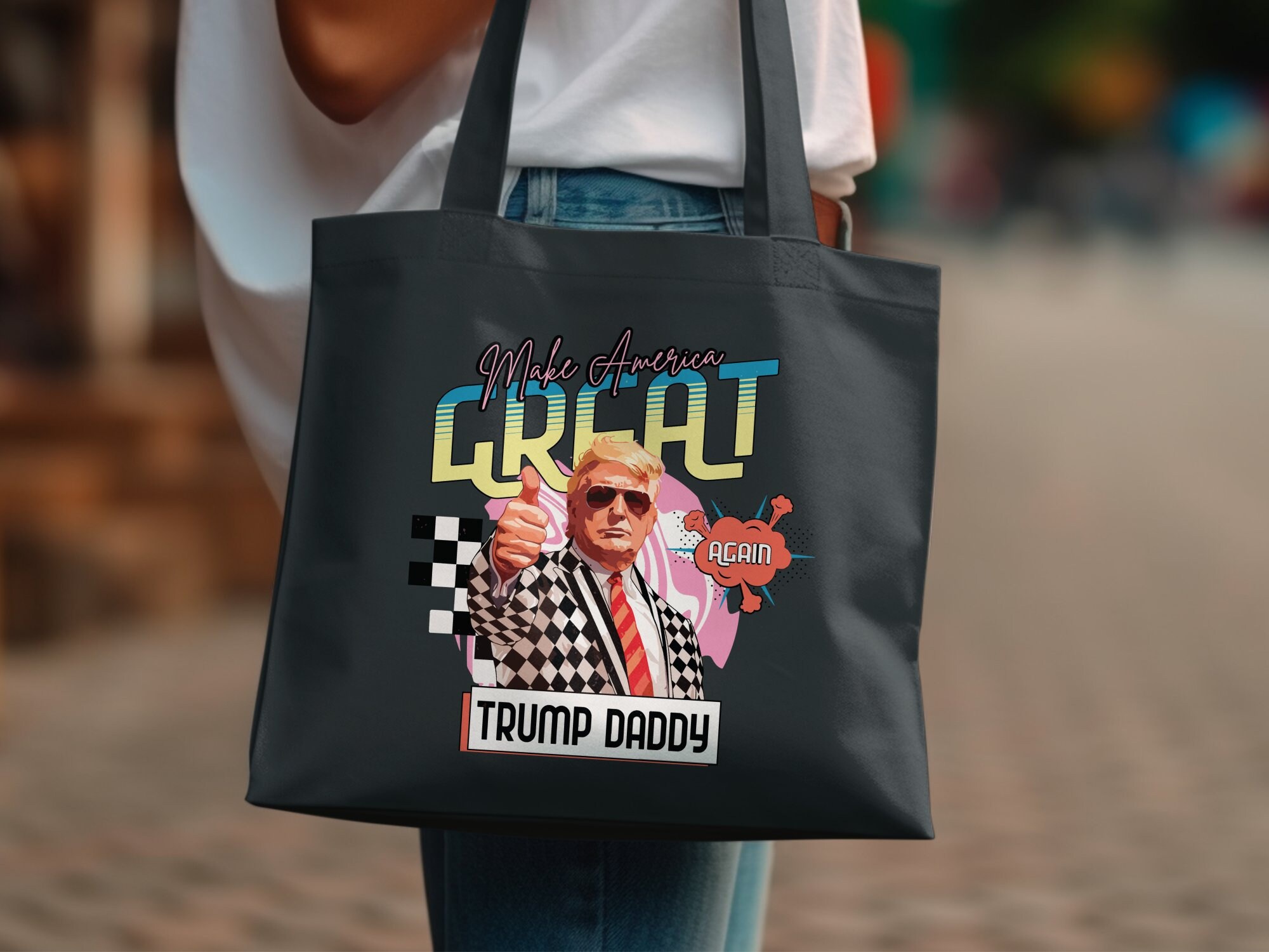 Show your patriotic spirit with the Make America Great Again Trump Daddy T-Shirt. This vintage-style graphic tee features a bold design with retro elements, perfect for any political enthusiast. The shirt showcases a thumbs up and vibrant colors, making it an eye-catching addition to your wardrobe. Great for rallies, casual wear, or as a statement piece, this t-shirt is a must-have for those who want to express their support in a stylish way.
