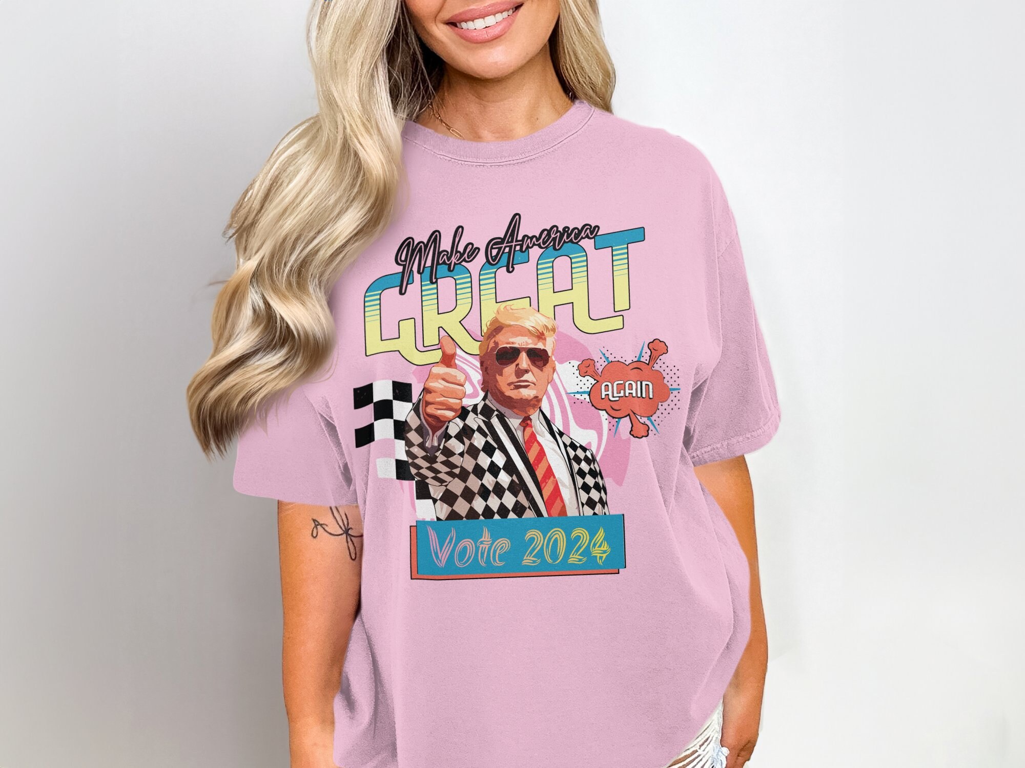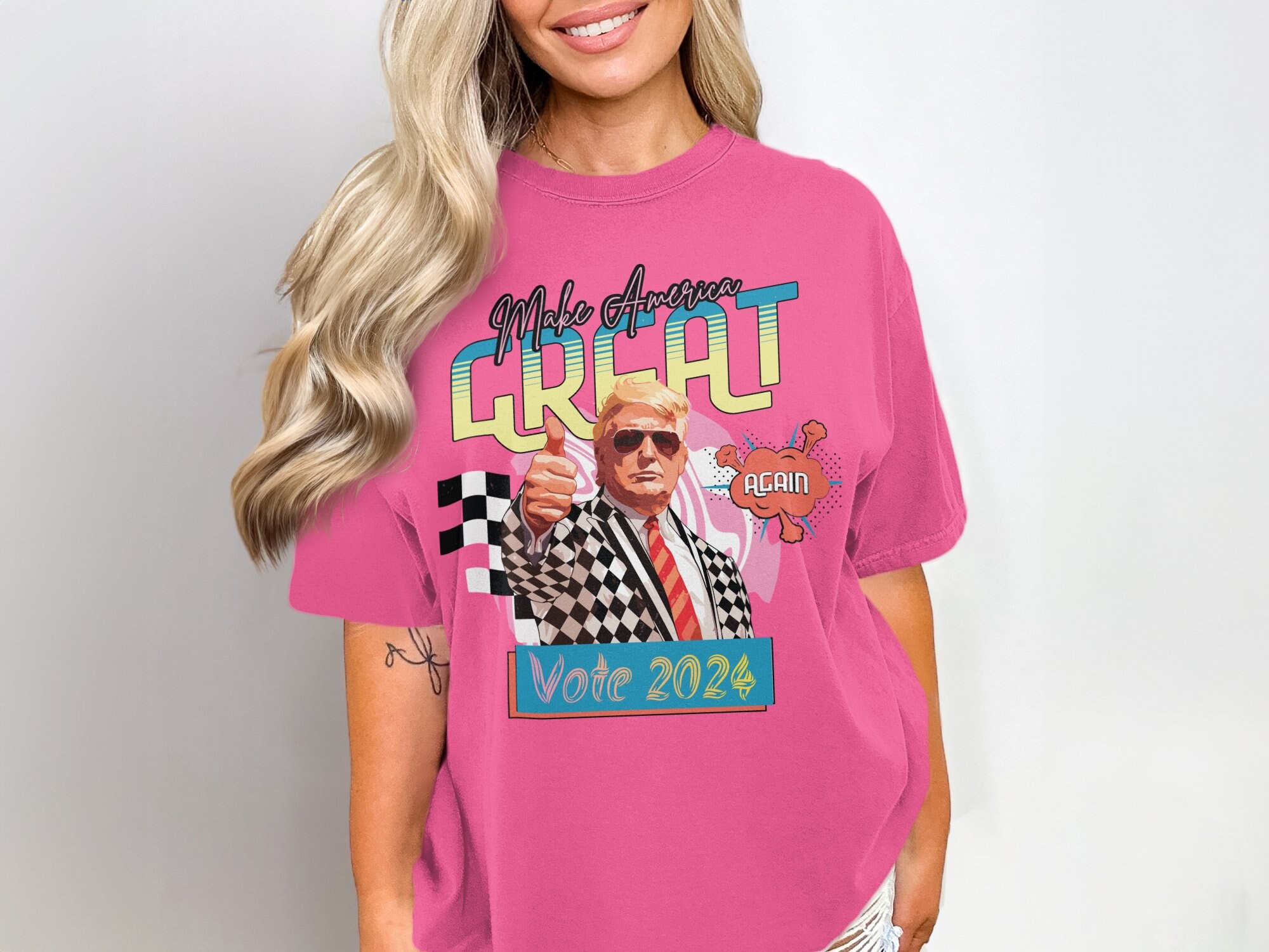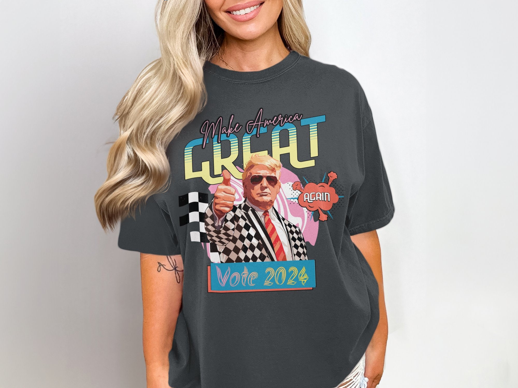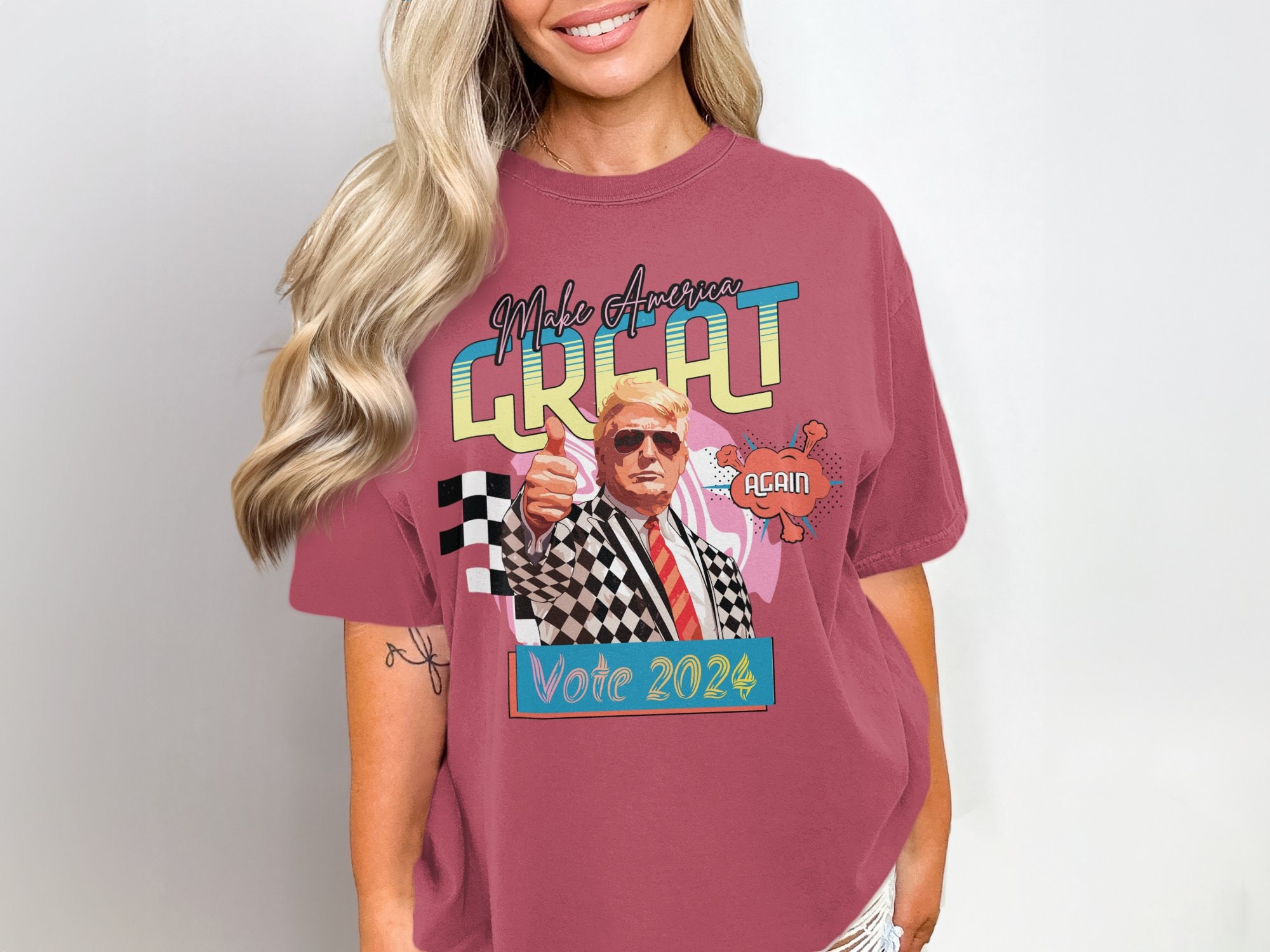 Show your patriotic spirit with the Make America Great Again Trump Daddy T-Shirt. This vintage-style graphic tee features a bold design with retro elements, perfect for any political enthusiast. The shirt showcases a thumbs up and vibrant colors, making it an eye-catching addition to your wardrobe. Great for rallies, casual wear, or as a statement piece, this t-shirt is a must-have for those who want to express their support in a stylish way.