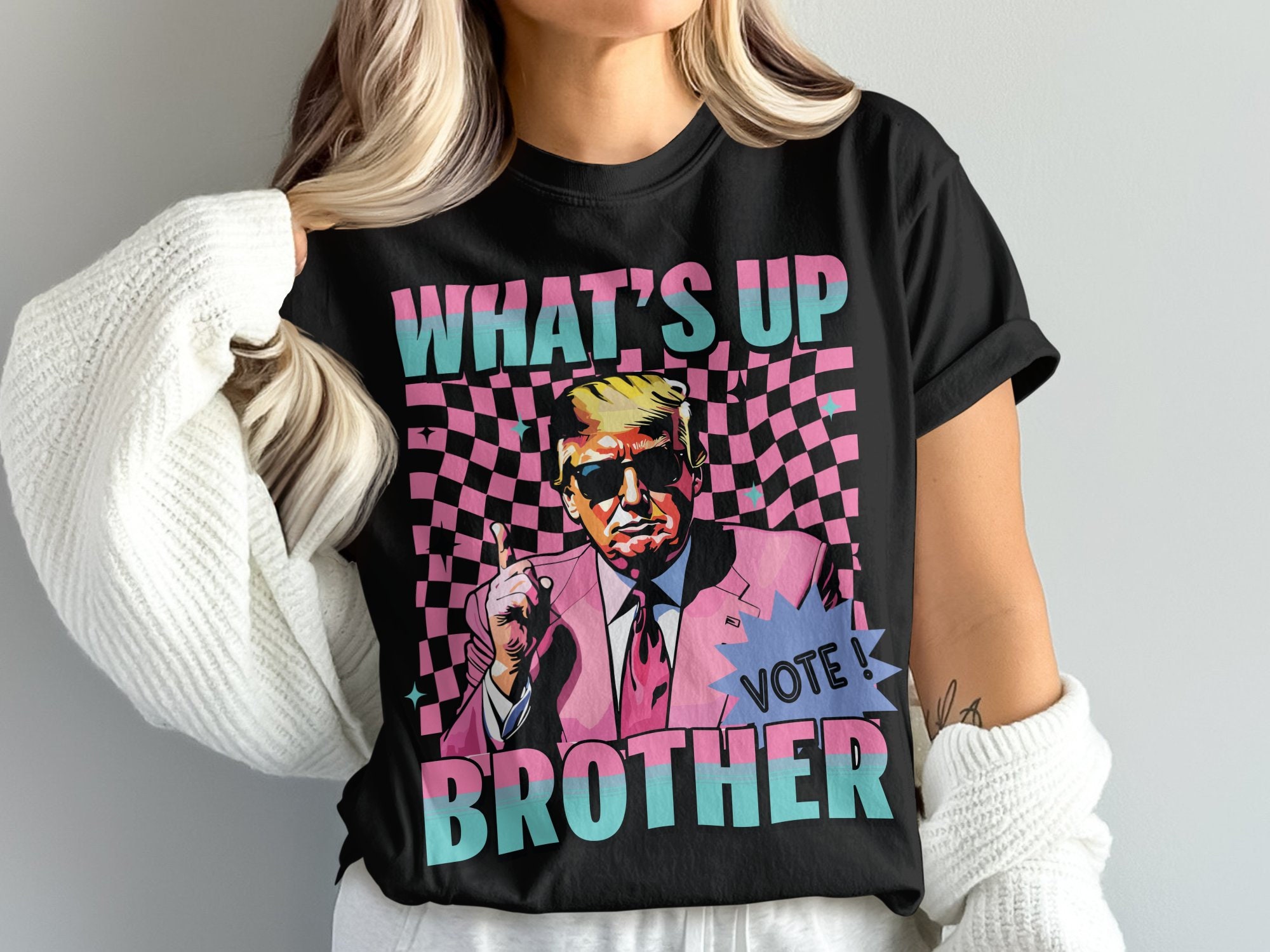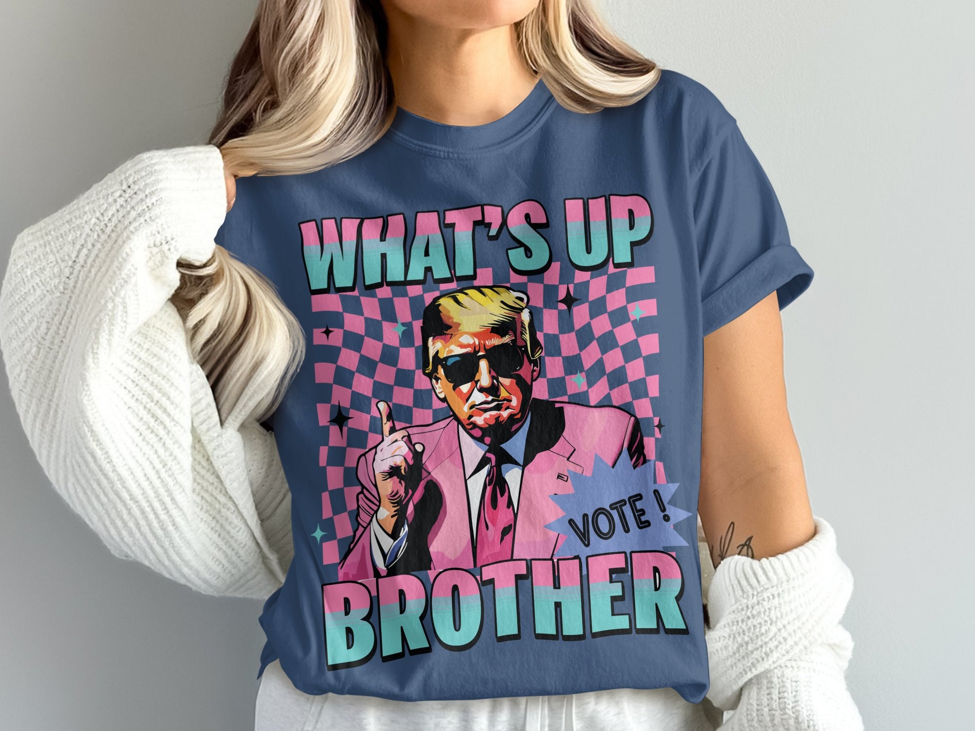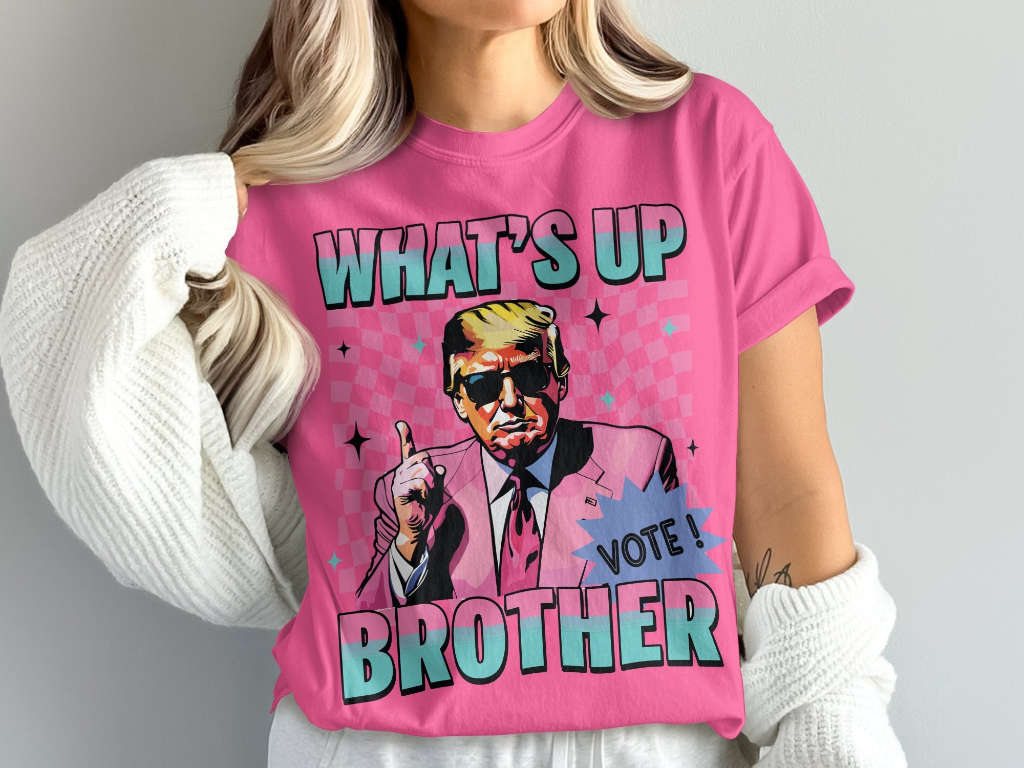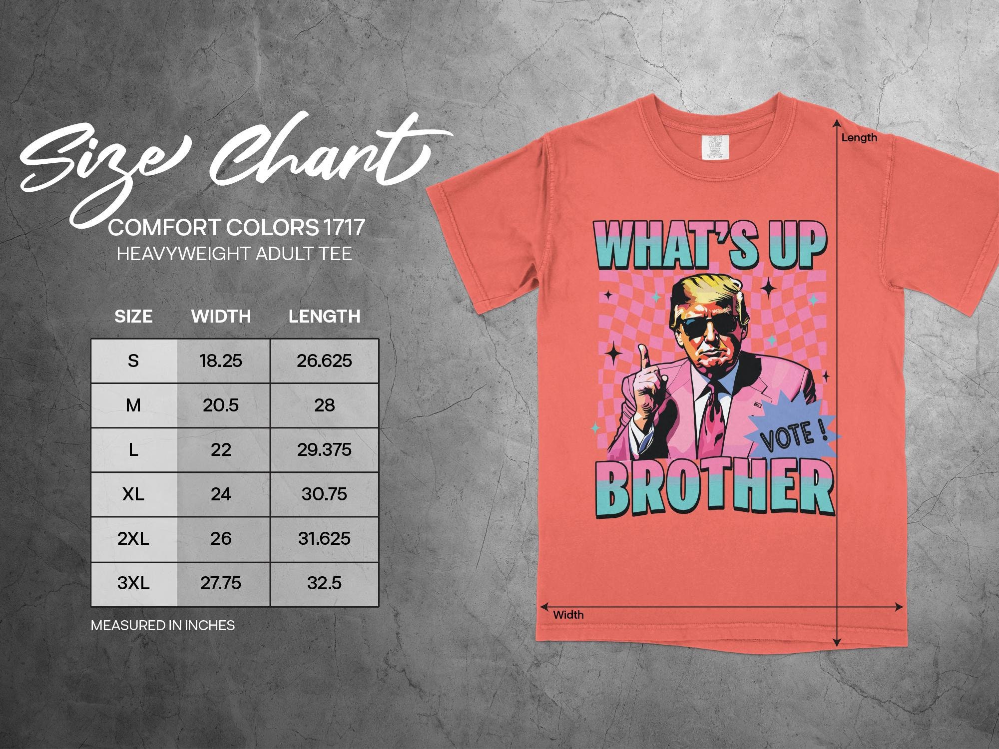 Trump Comfort Colors Shirt, Trump What's Up Brother Tee, Trump Pink Suit Comfort Colors Shirt, Retro Trump Graphic T-Shirt, Cool Vintage Style Trump Shirt, Pink Suit Trump Retro Tee,Trump Comfort Colors Shirt:This What's Up Brother Graphic T-Shirt features a cool vintage style design that is perfect for anyone who loves retro inspired tees. With its funny political theme, this shirt makes a unique gift for friends and family. Stand out with this eye-catching and conversation-starting shirt that is sure to get people talking. Great for casual outings, themed parties, or as a thoughtful gift for any occasion.