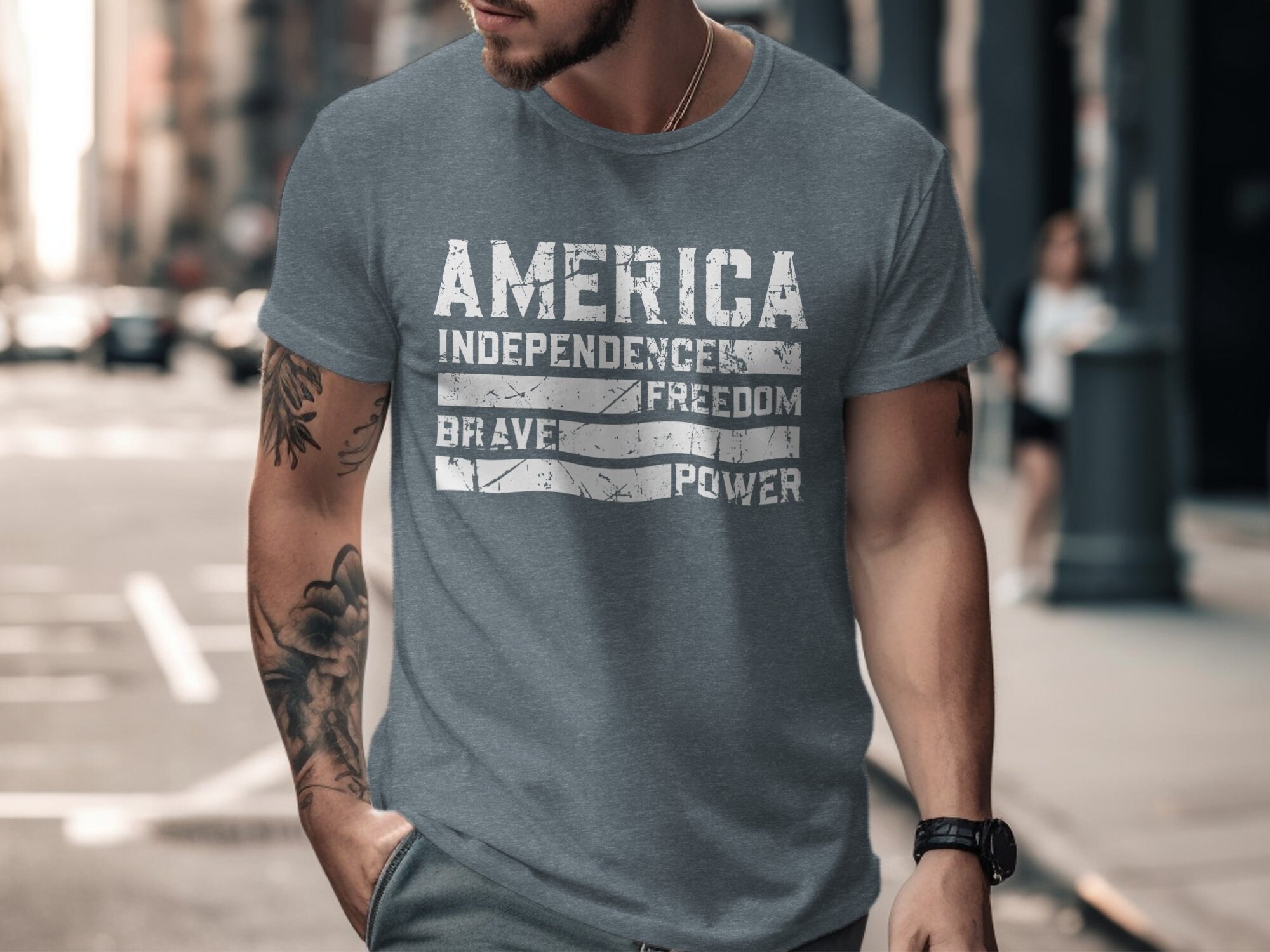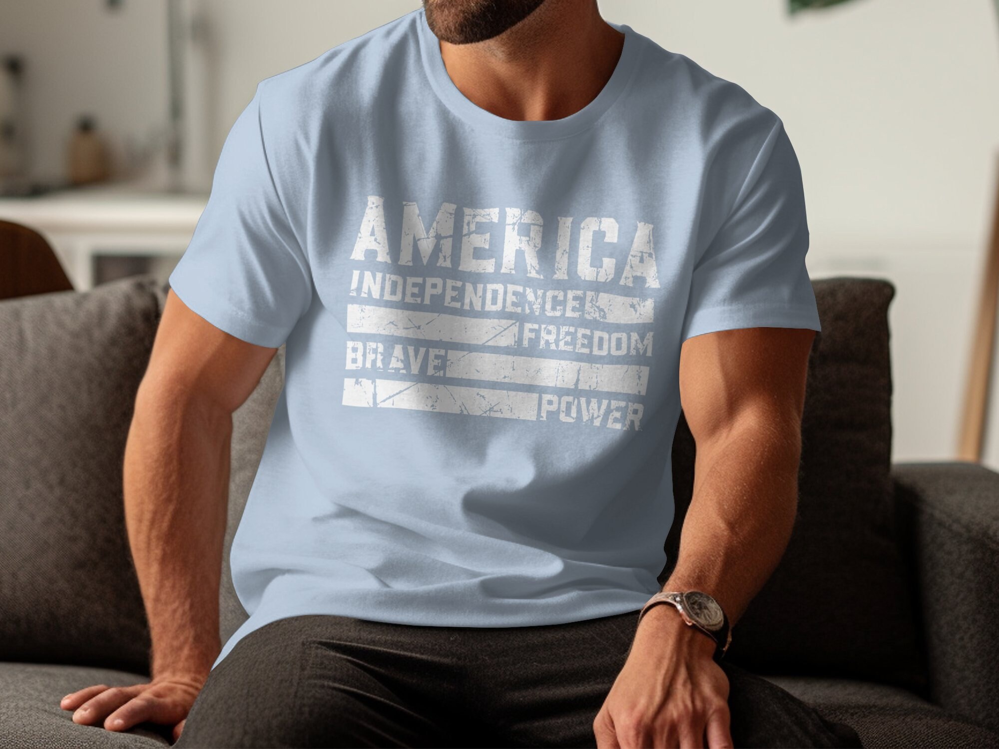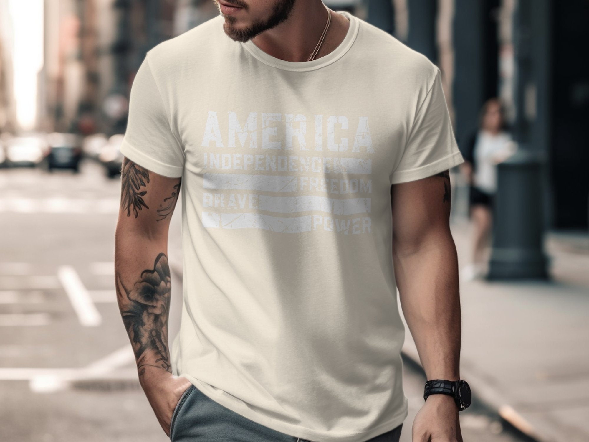 Show your patriotic spirit with this "America Independence Freedom Brave Power" T-Shirt. Featuring a vintage American flag design, this tee represents the core values of the USA, including independence, freedom, bravery, and power. It's perfect for celebrating national holidays, showing off your USA pride, or as a thoughtful gift for veterans and patriots alike. Comfortable and stylish, this tee is a great addition to any wardrobe.