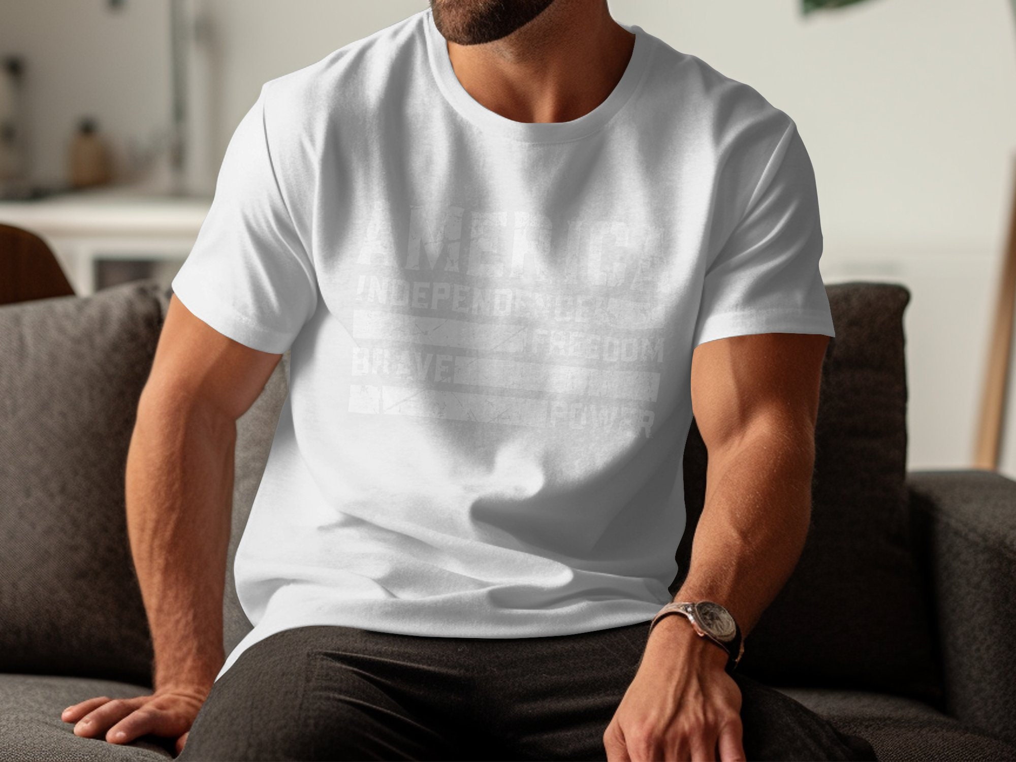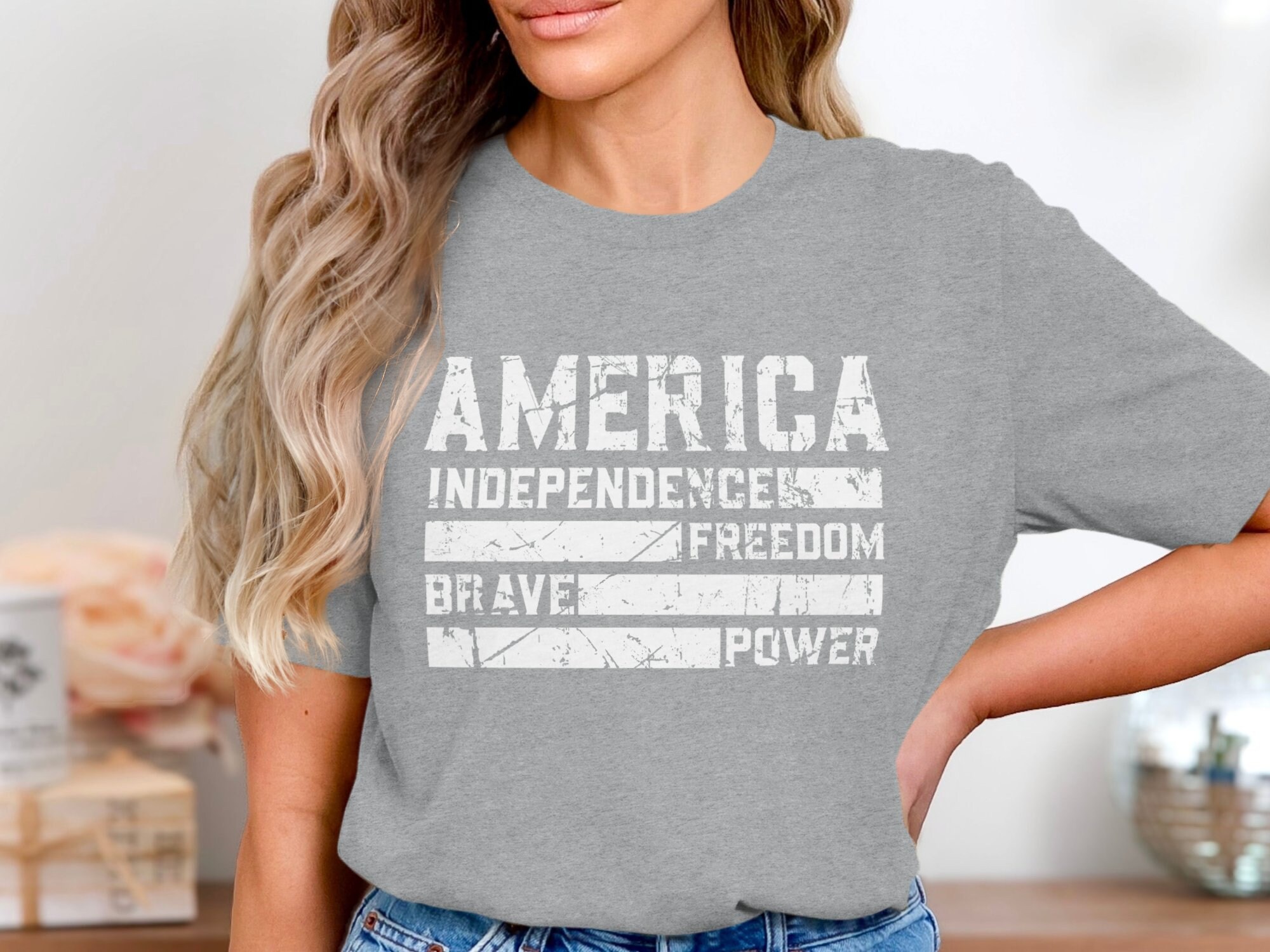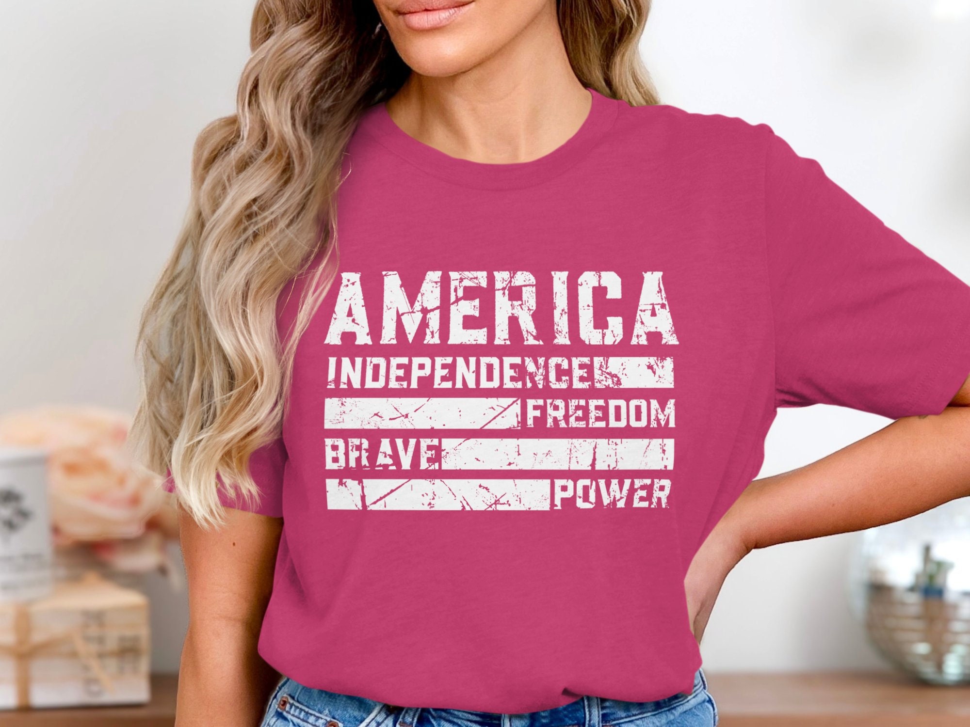Show your patriotic spirit with this "America Independence Freedom Brave Power" T-Shirt. Featuring a vintage American flag design, this tee represents the core values of the USA, including independence, freedom, bravery, and power. It's perfect for celebrating national holidays, showing off your USA pride, or as a thoughtful gift for veterans and patriots alike. Comfortable and stylish, this tee is a great addition to any wardrobe.