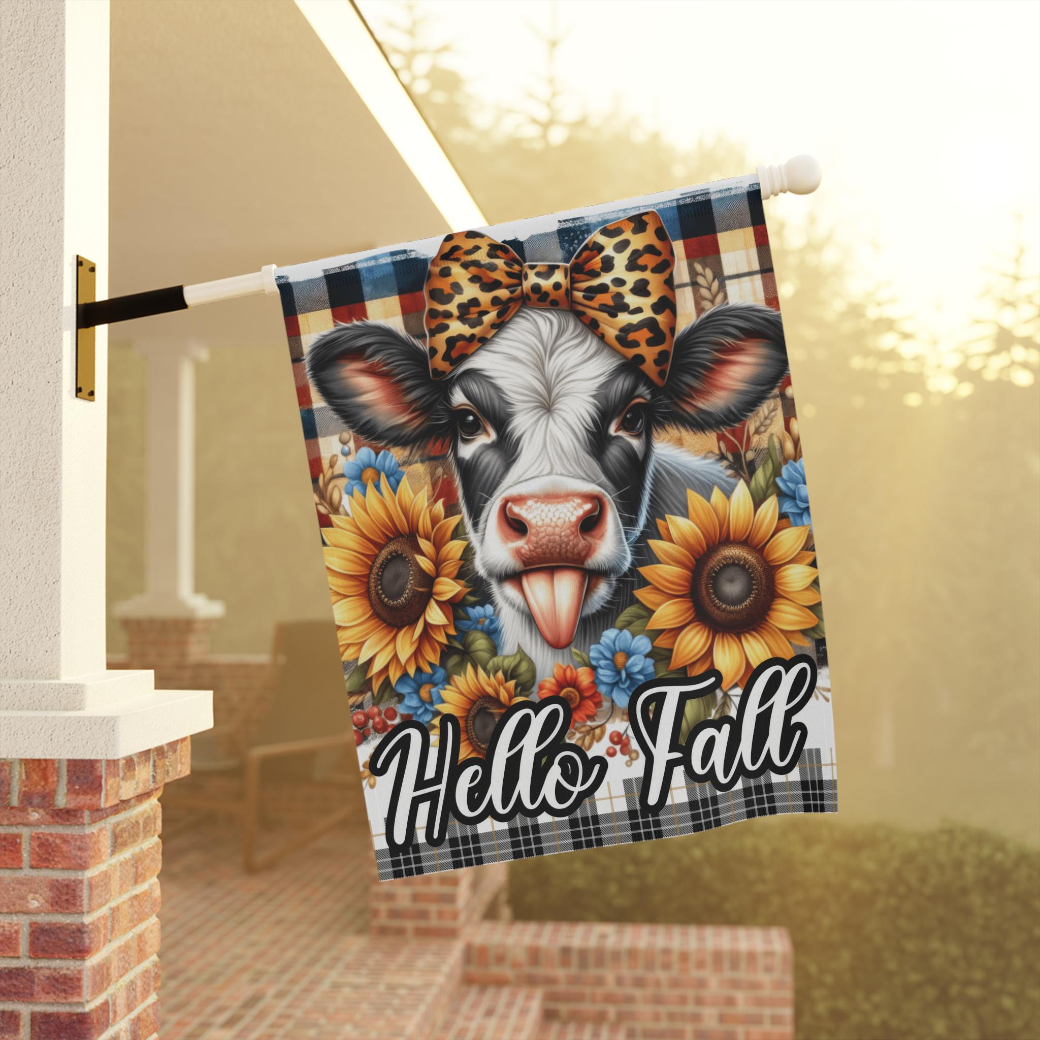 Help anyone transform their garden with this adorable fall cow and sunflower garden flag. Made with lightweight yet highly durable poly poplin-canvas fabric, these banners come in two sizes (12'' × 18'' and 24.5'' × 32'') and feature a top sleeve for easy placement on poles. This design goes in crisp detail and color on both sides of the flag.