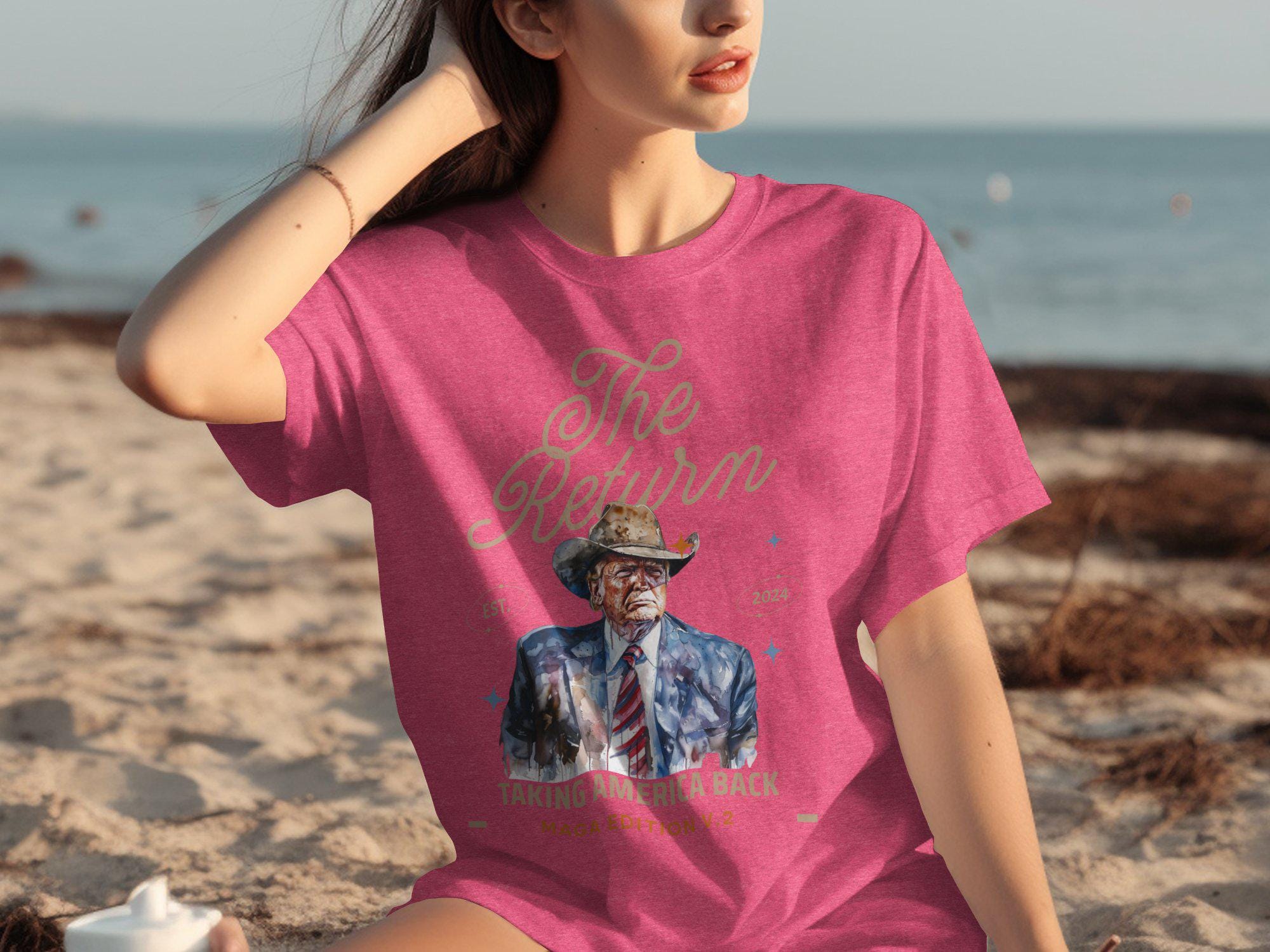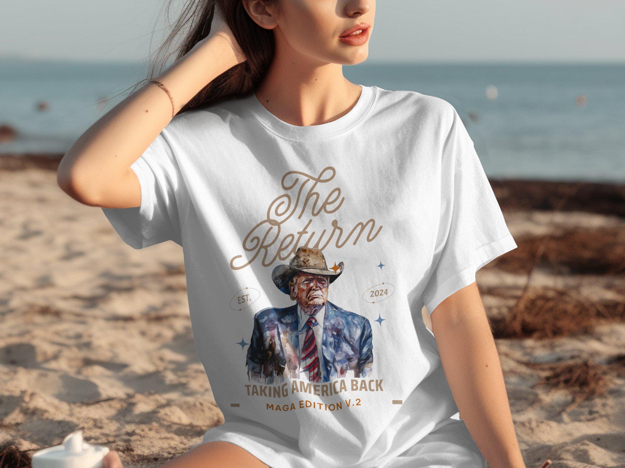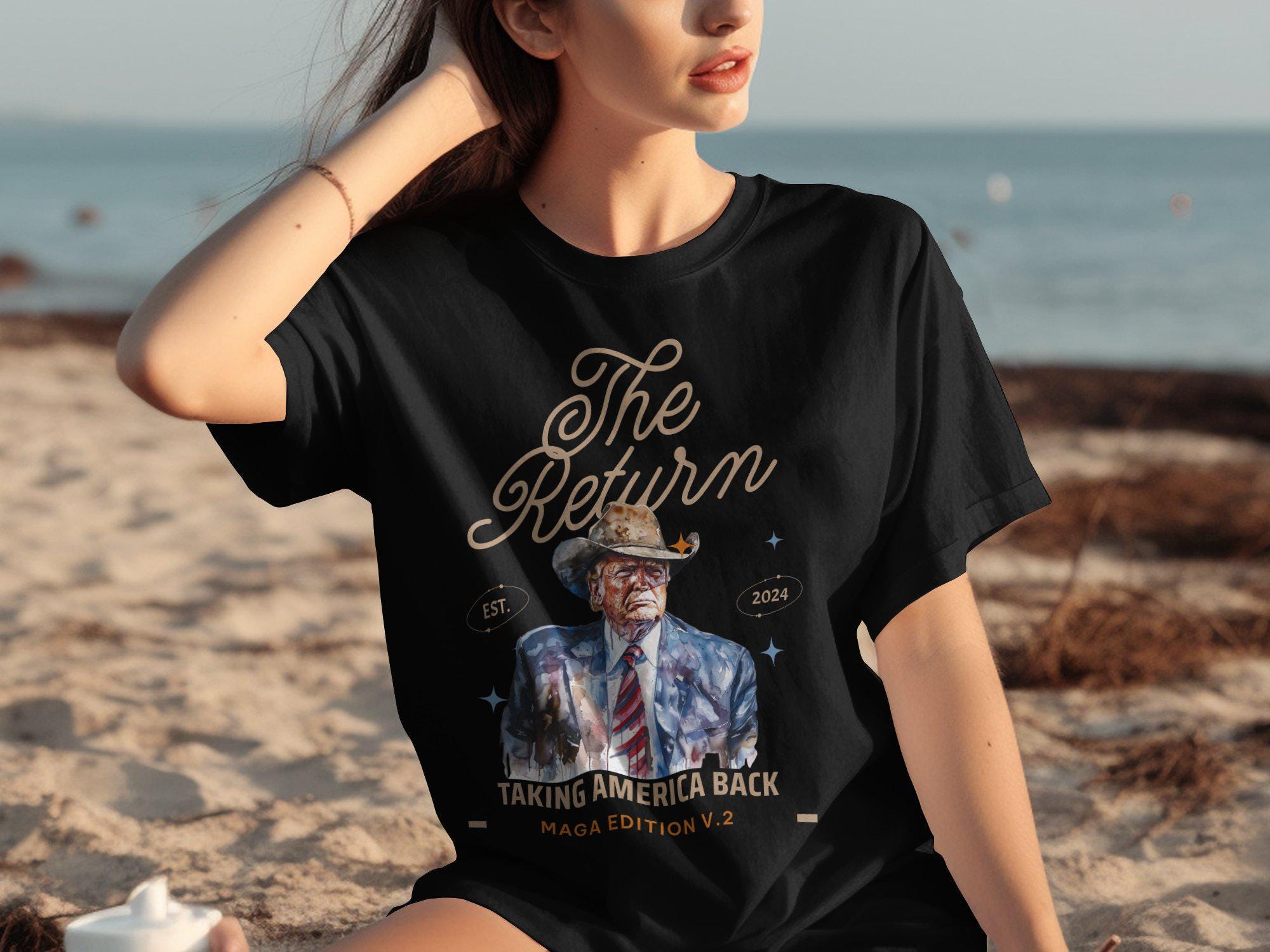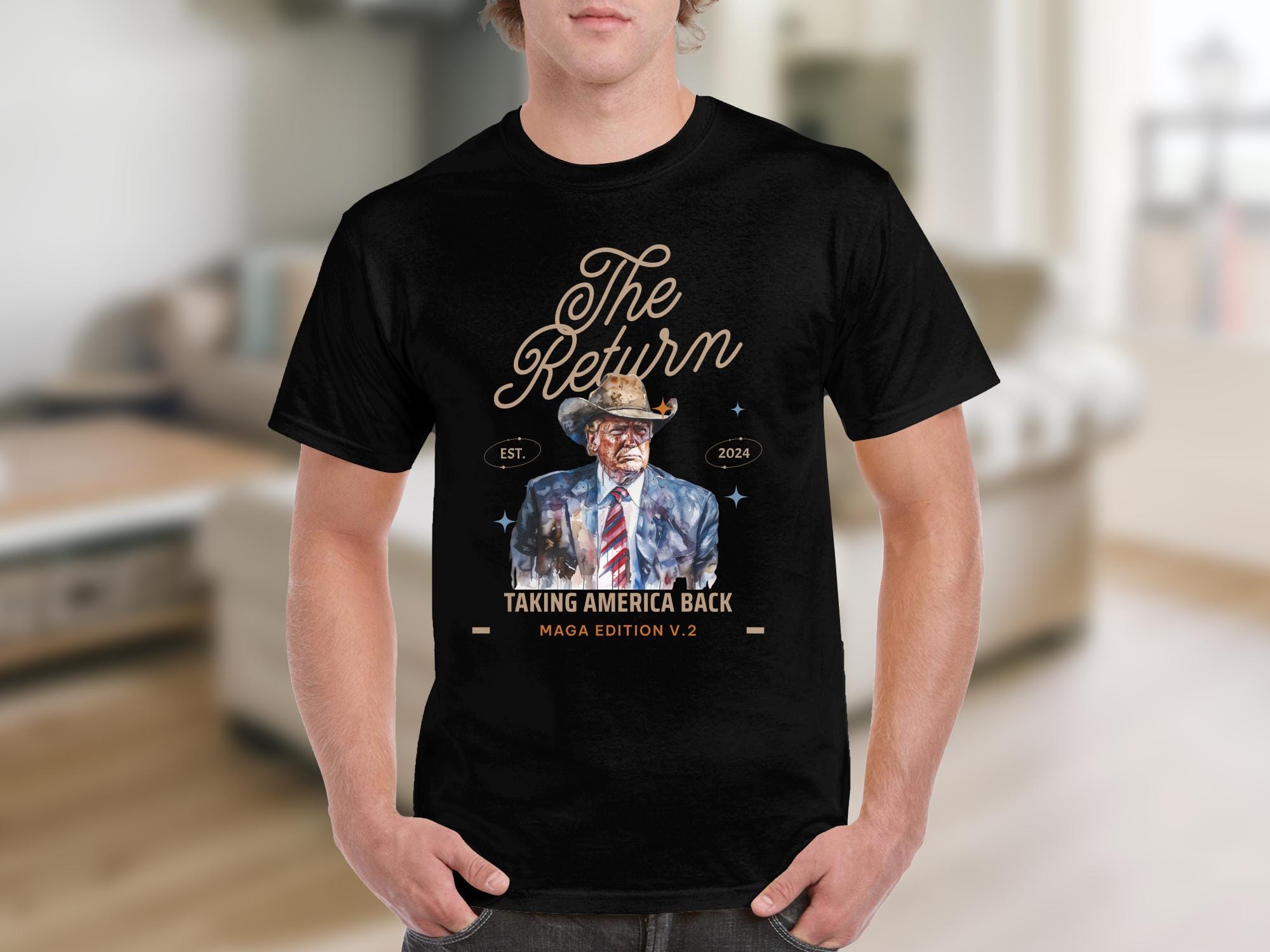 Show your support with this unique Trump 2024 T-shirt featuring a bold design. Perfect for rallies, events, or daily wear. Stand out in the crowd with this eye-catching apparel! Embrace the MAGA spirit with The Return EST 2024 Taking America Back shirt. Ideal for Trump supporters.