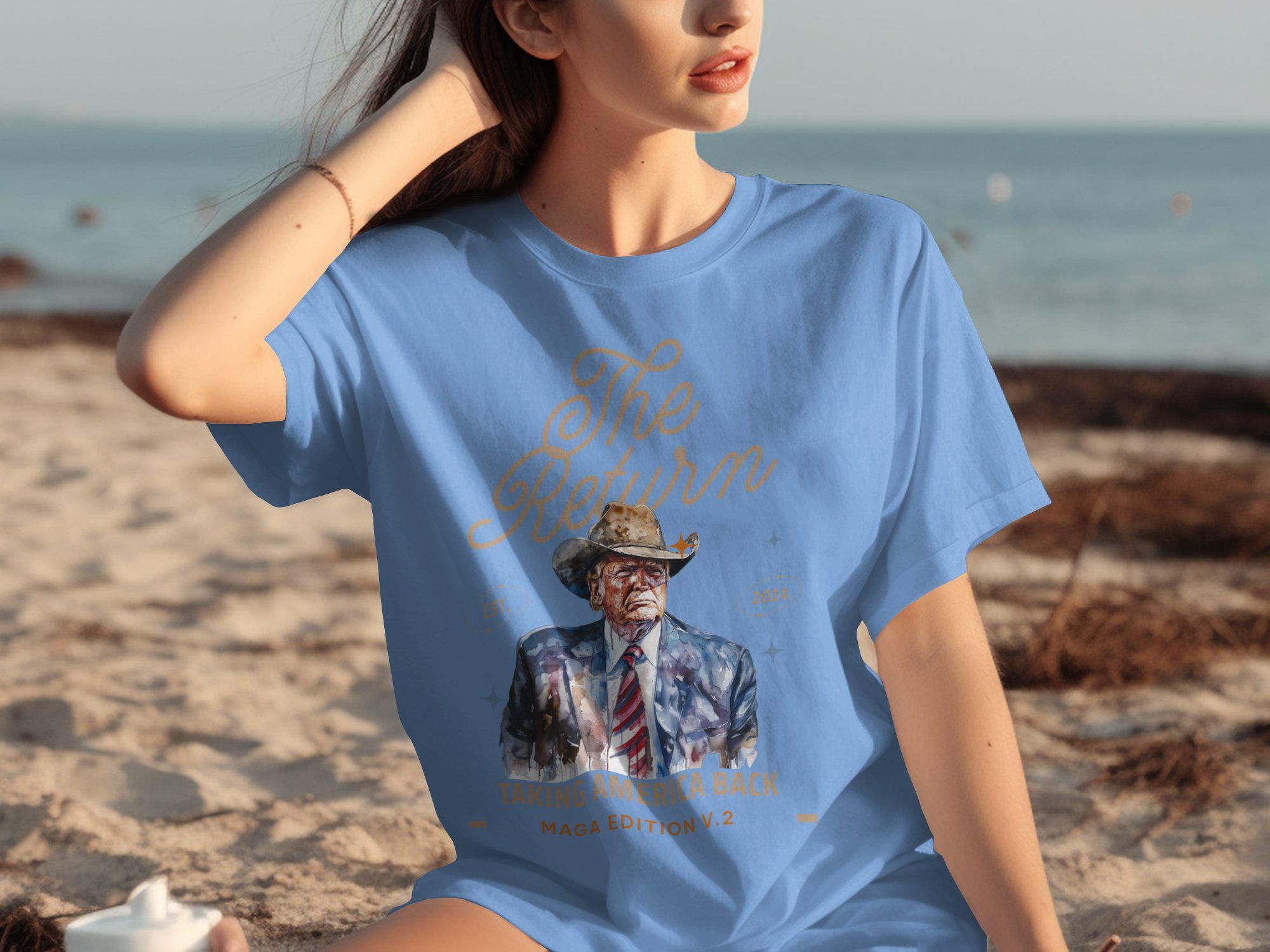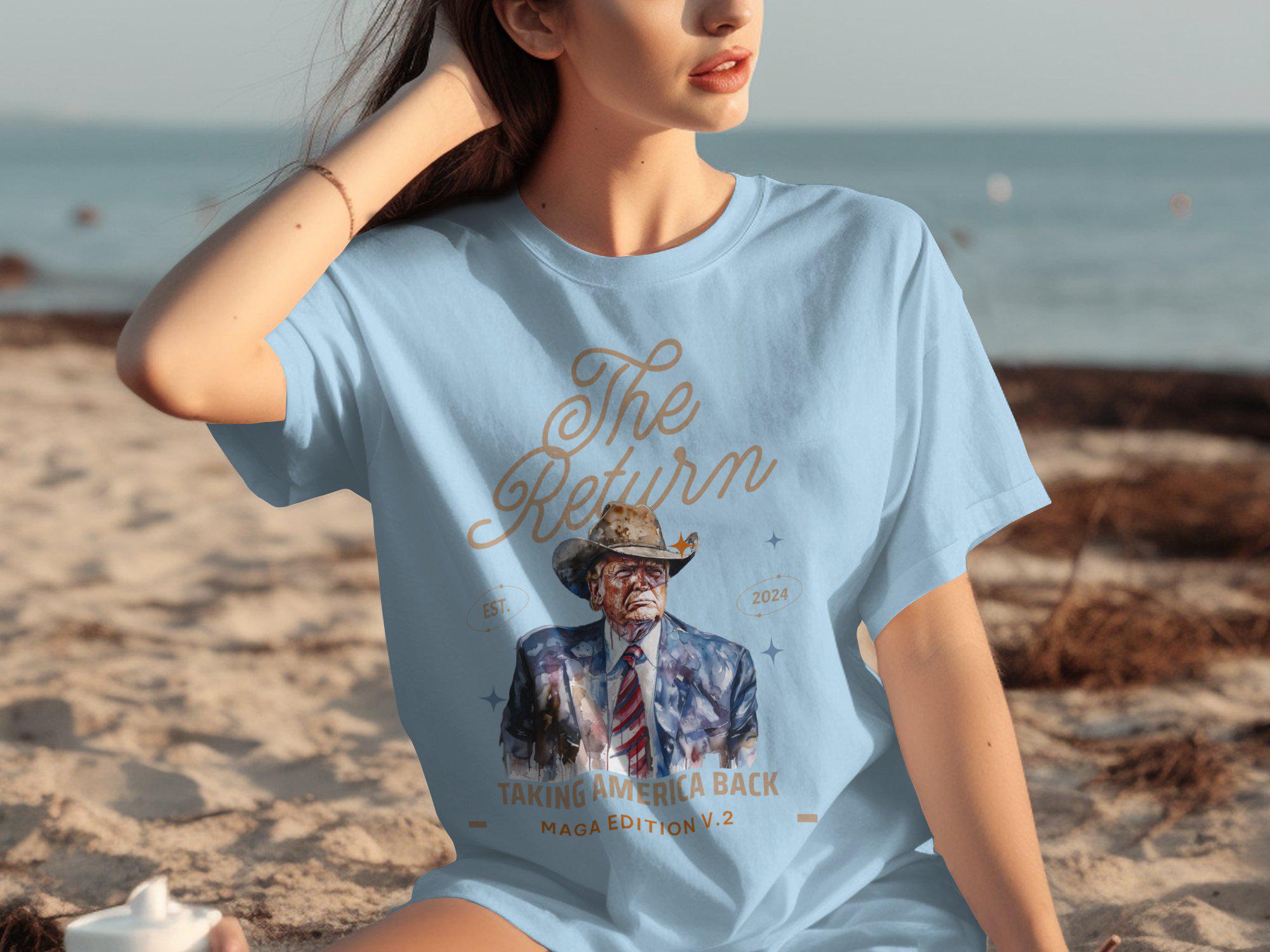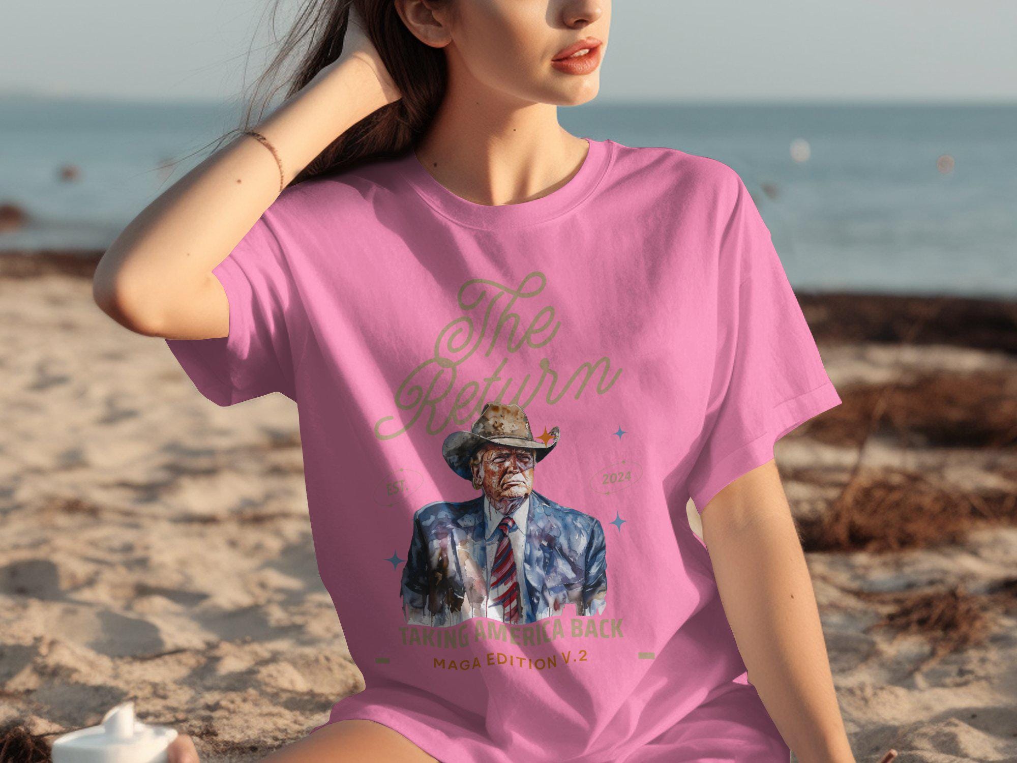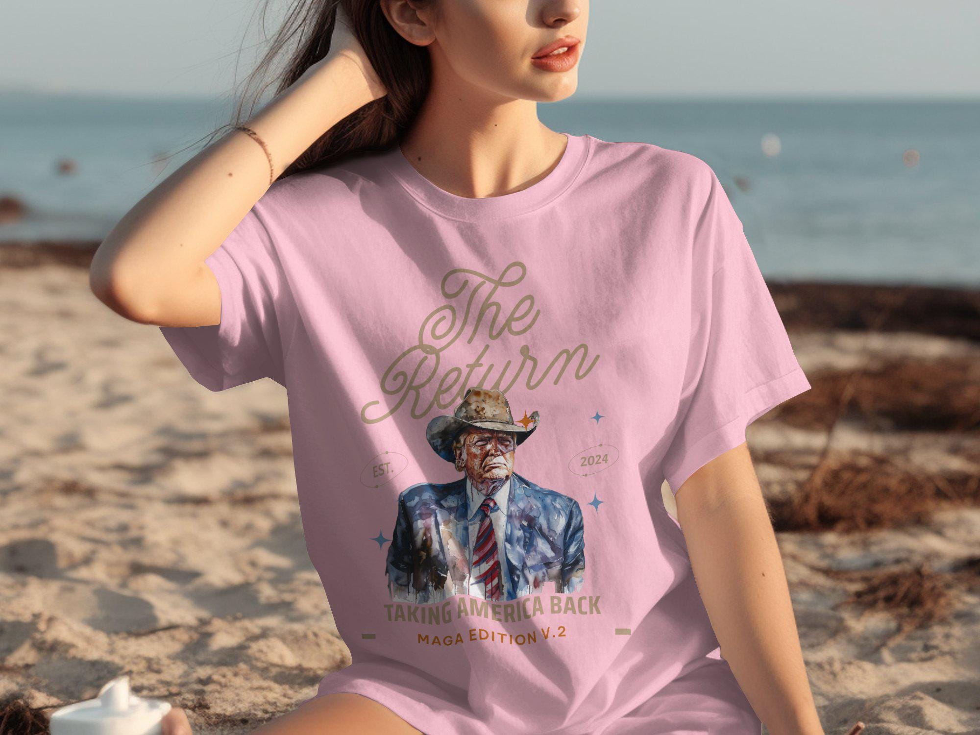 Show your support with this unique Trump 2024 T-shirt featuring a bold design. Perfect for rallies, events, or daily wear. Stand out in the crowd with this eye-catching apparel! Embrace the MAGA spirit with The Return EST 2024 Taking America Back shirt. Ideal for Trump supporters.